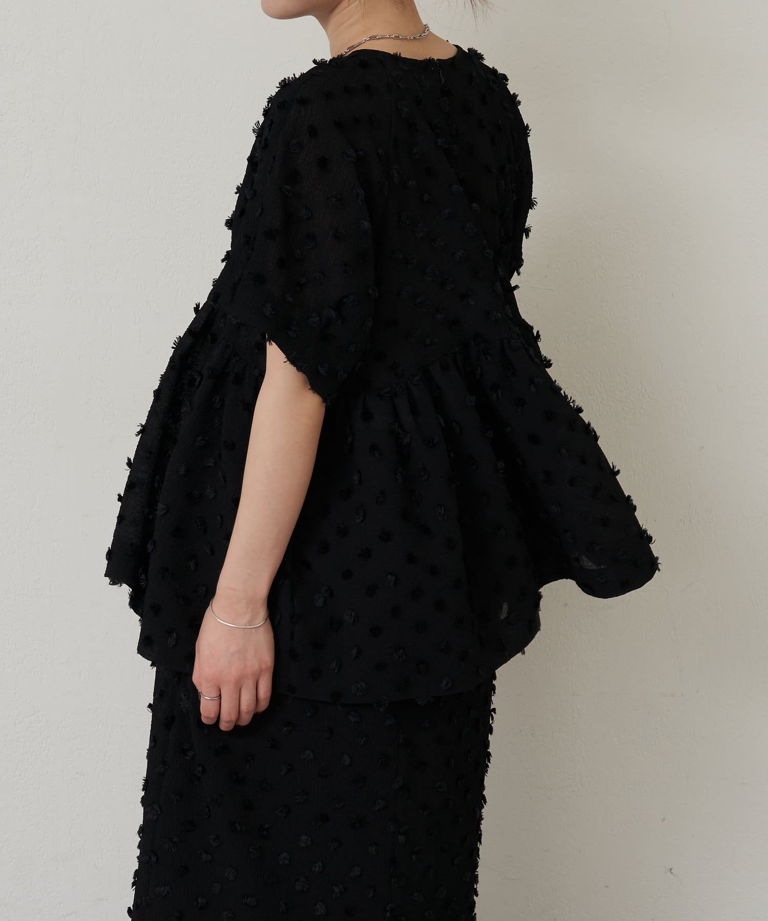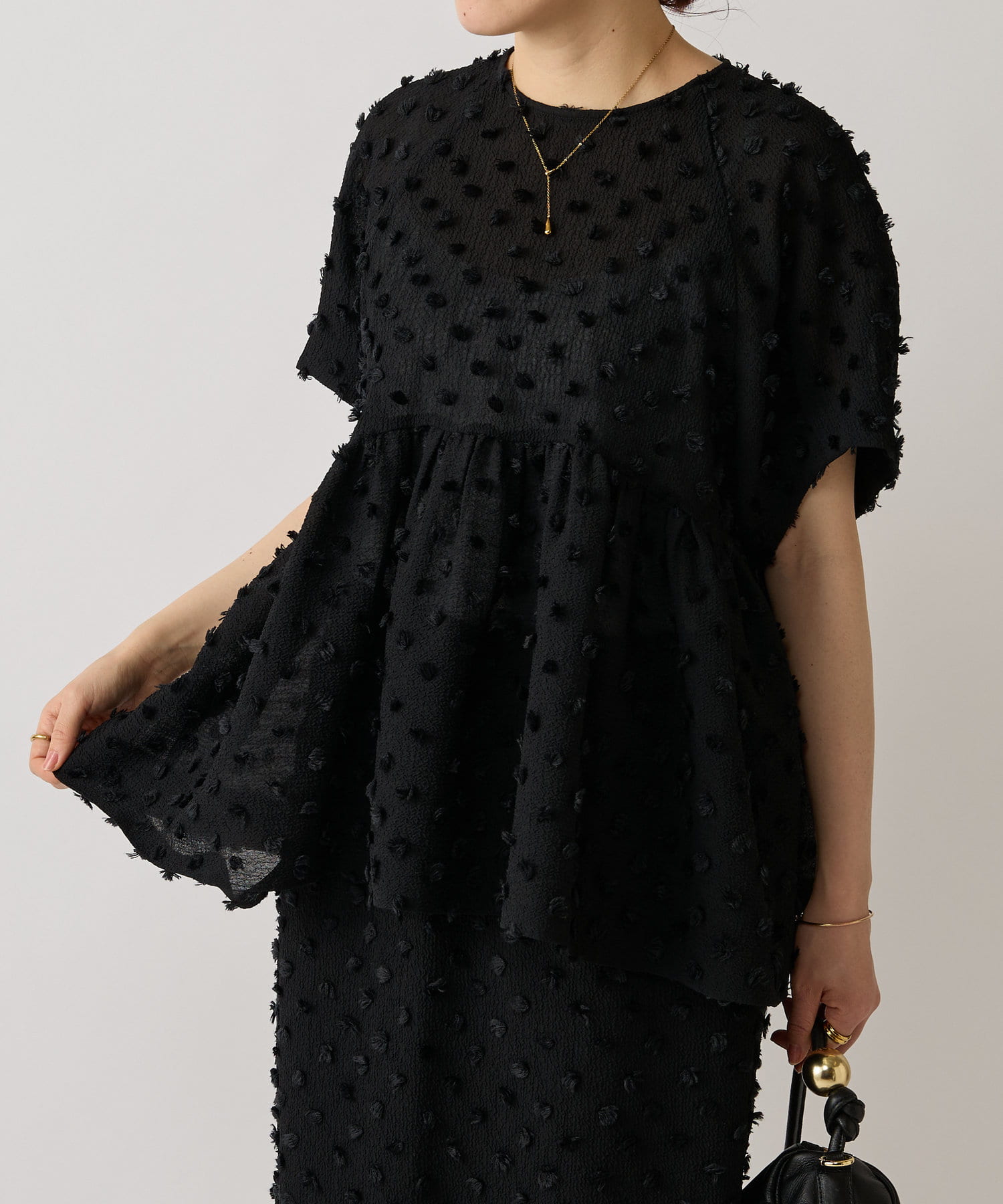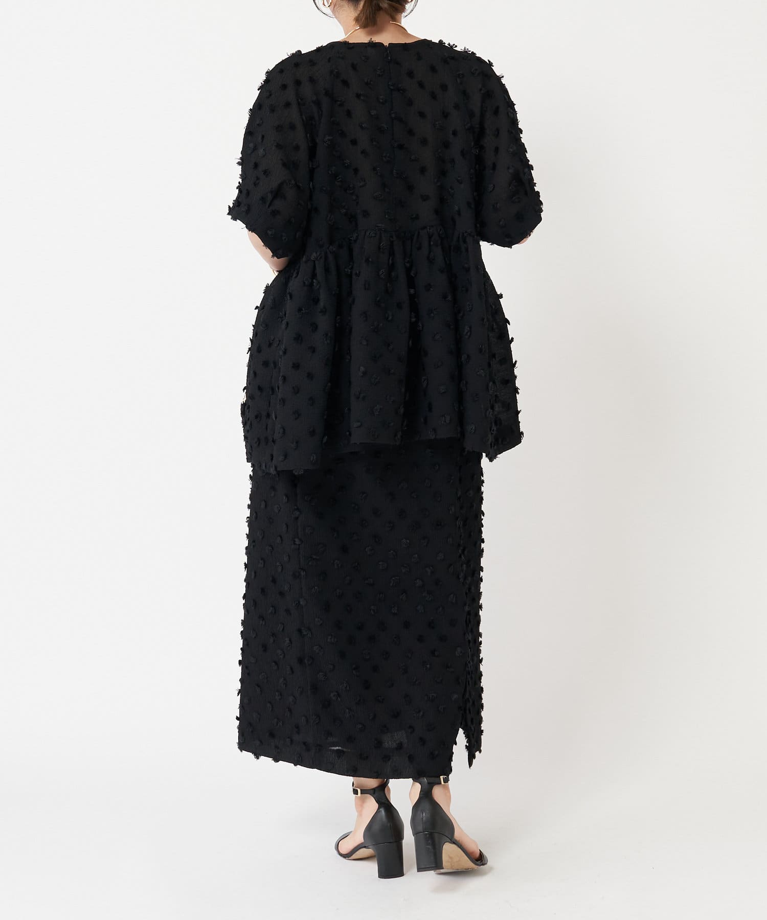 ふんわり広がるペプラムデザインが程よく甘さをプラス。