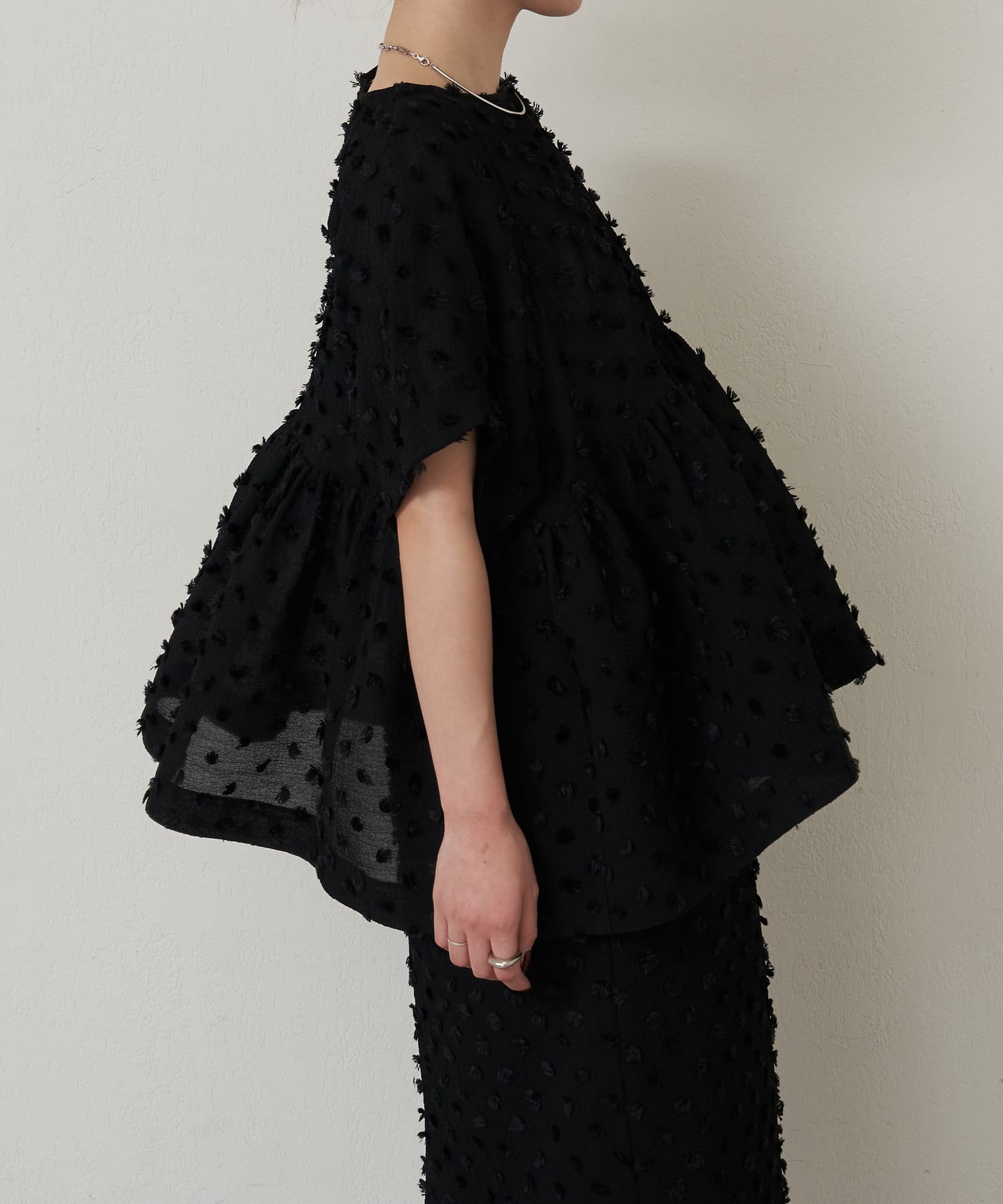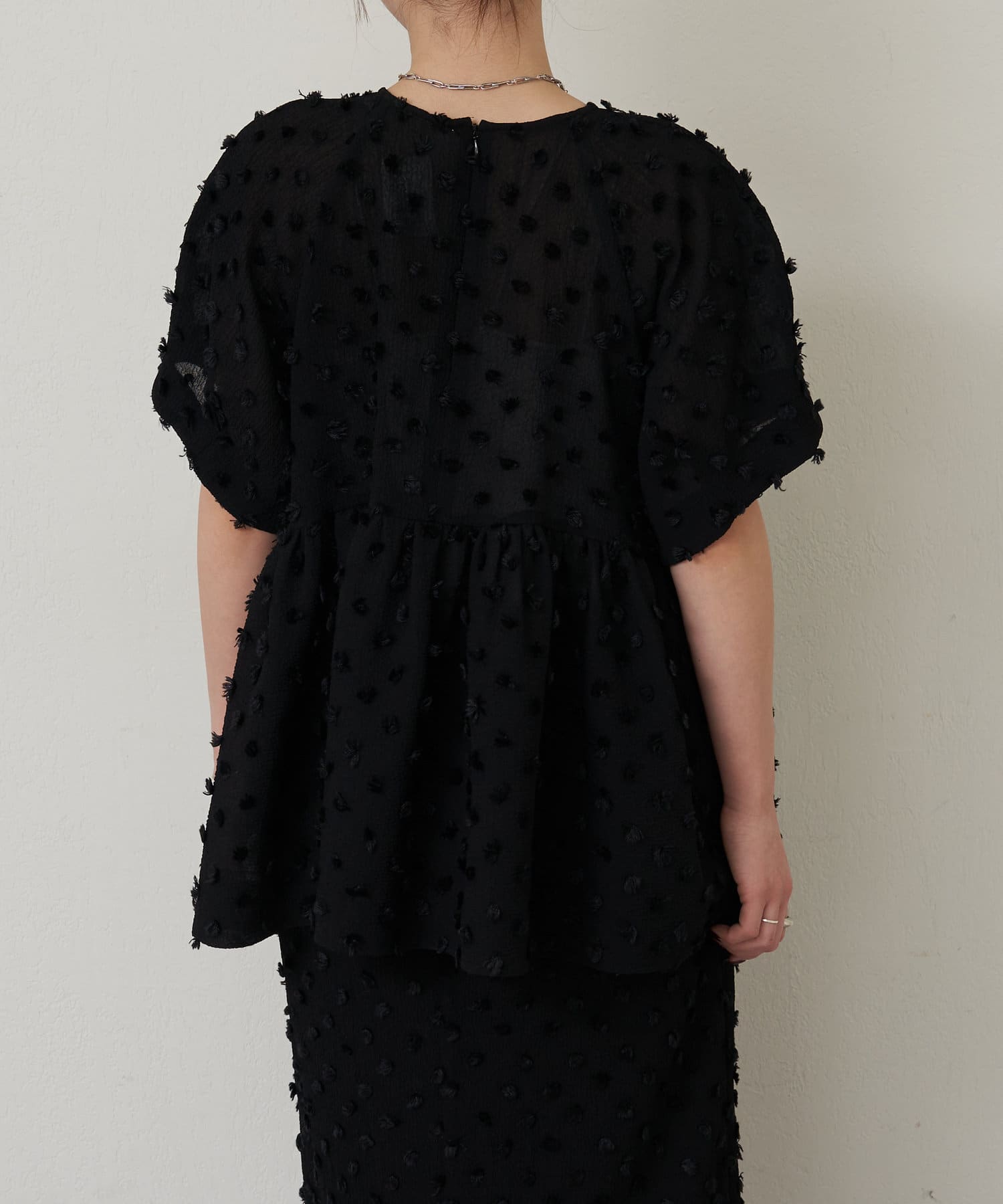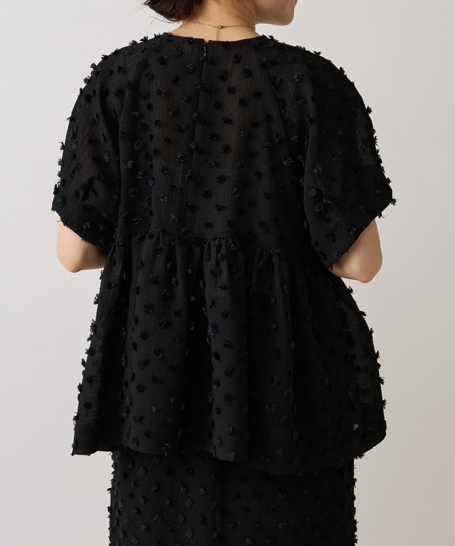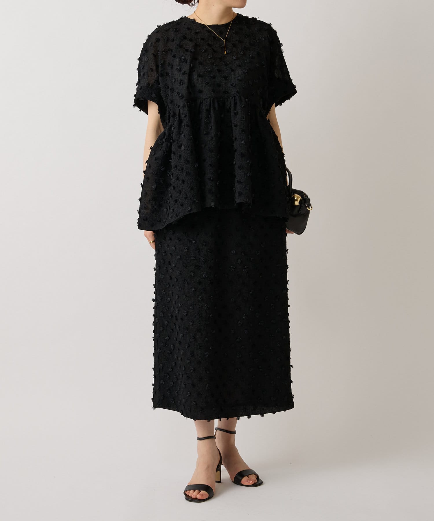 ふんわり広がるペプラムデザインが程よく甘さをプラス。