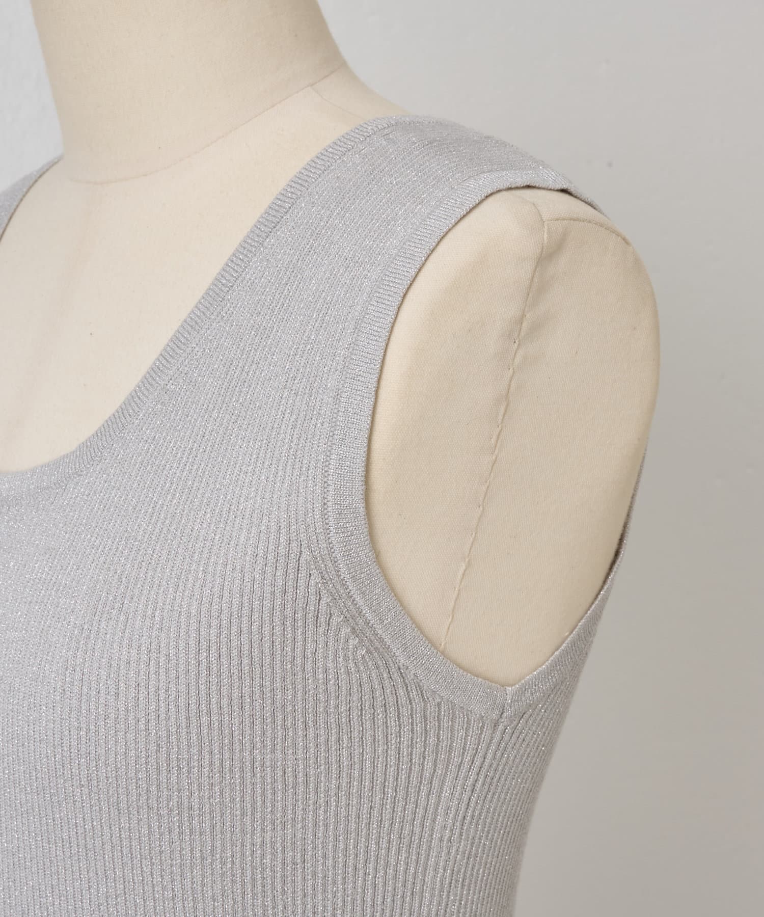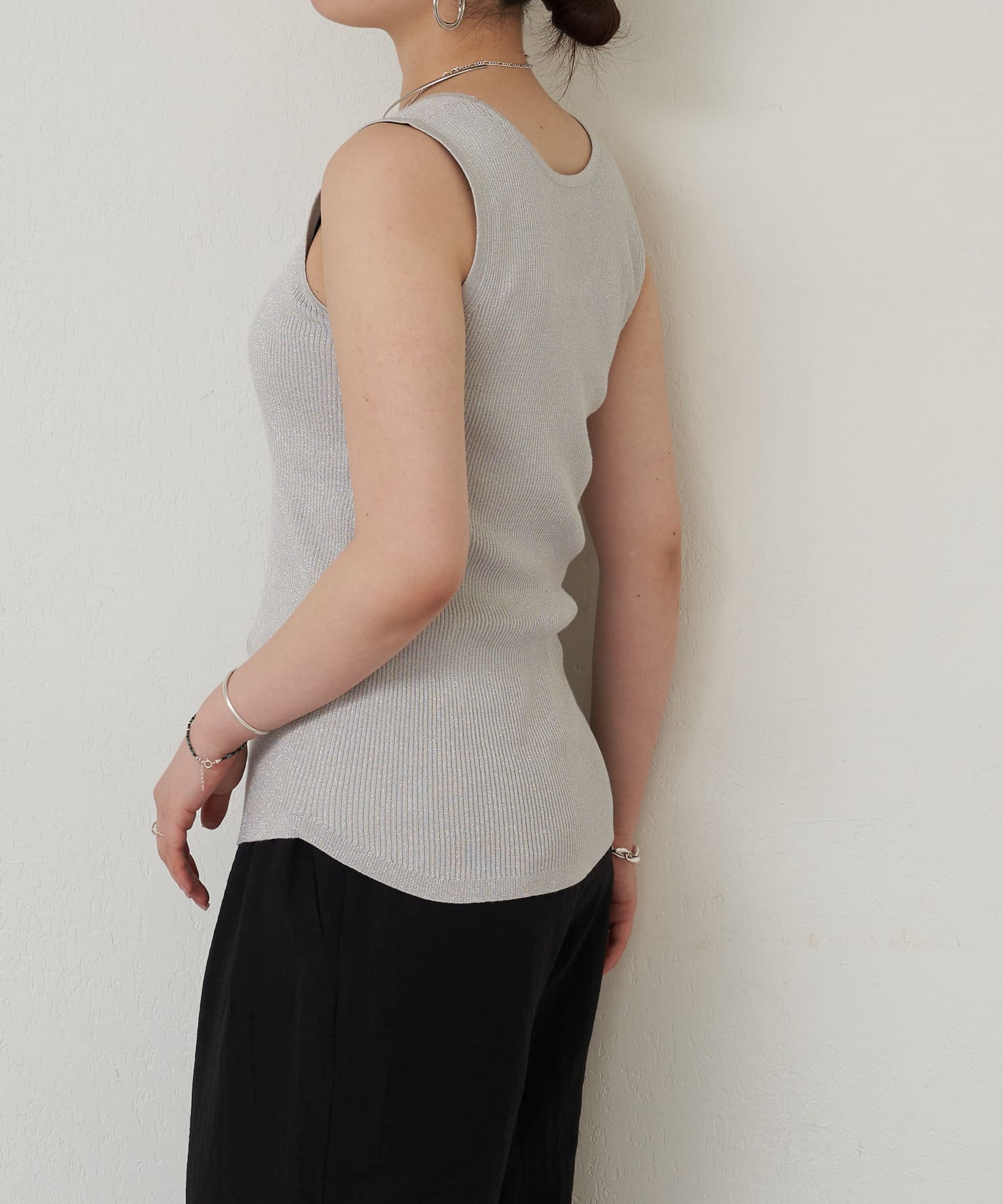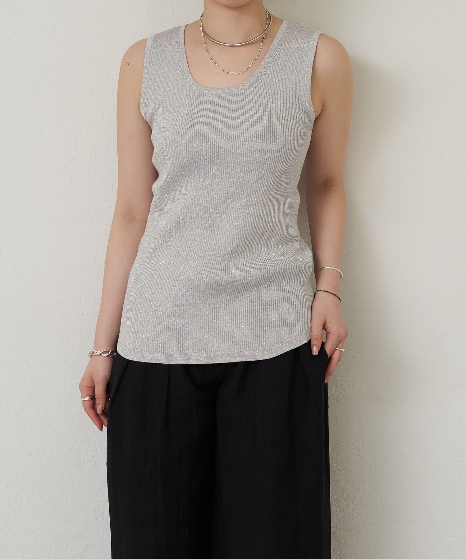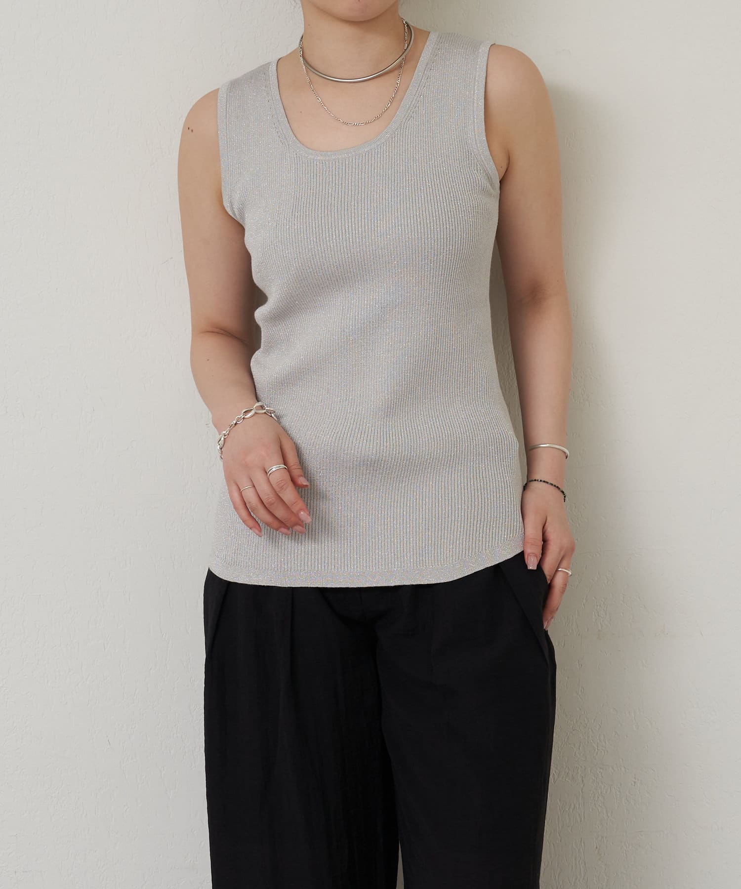 細かなラメ入りの上品なタンクトップ。