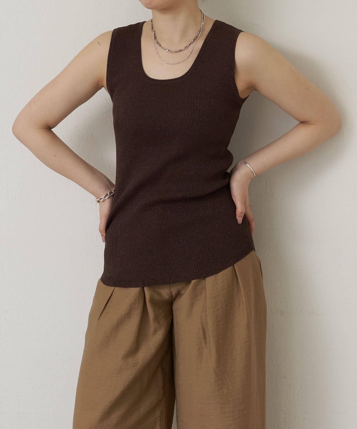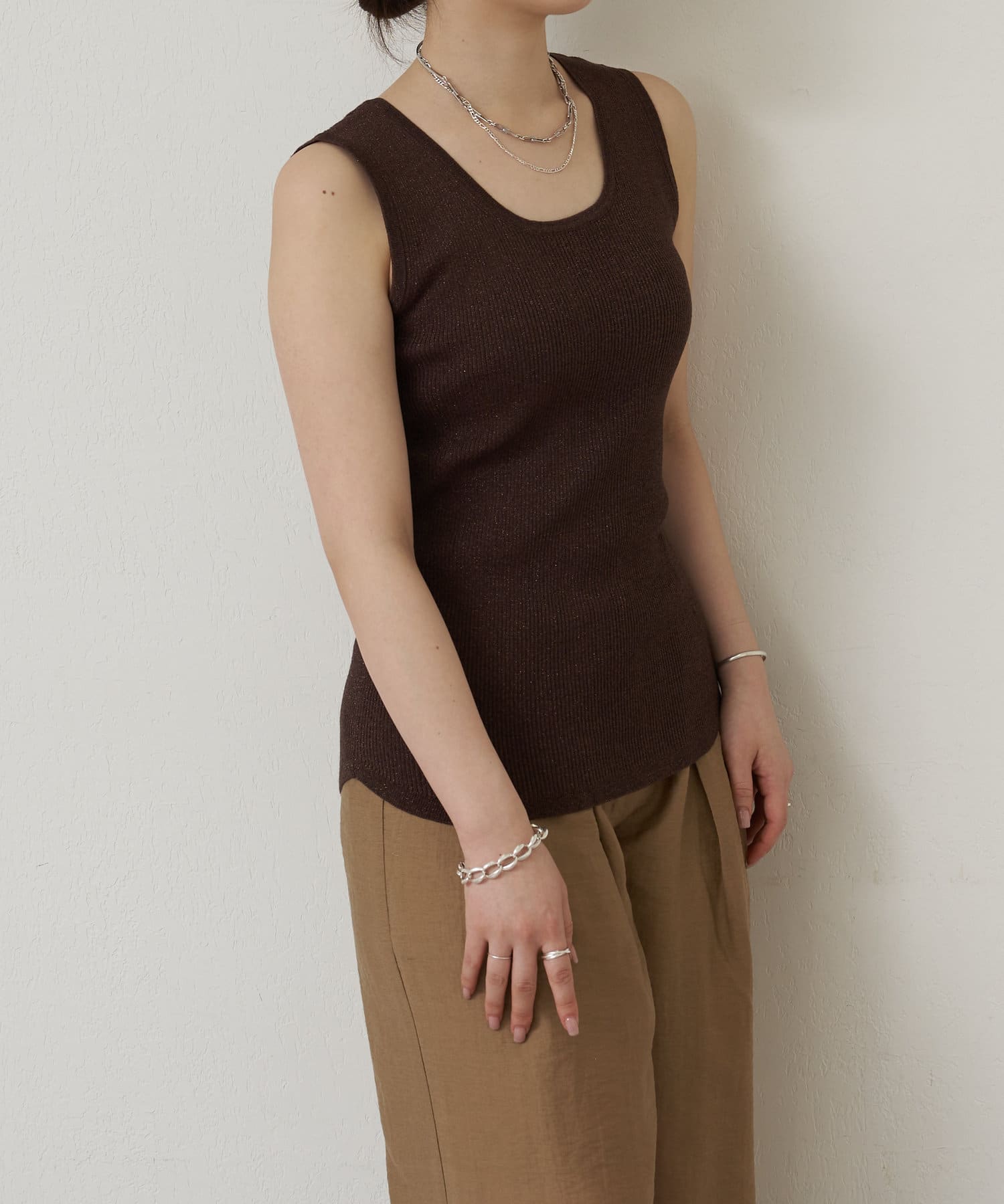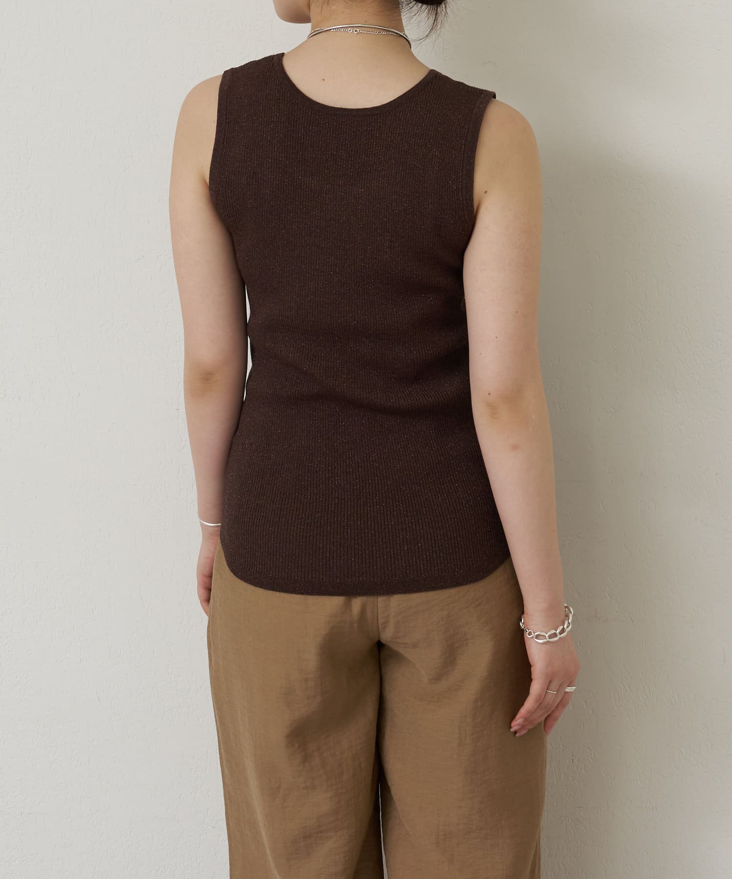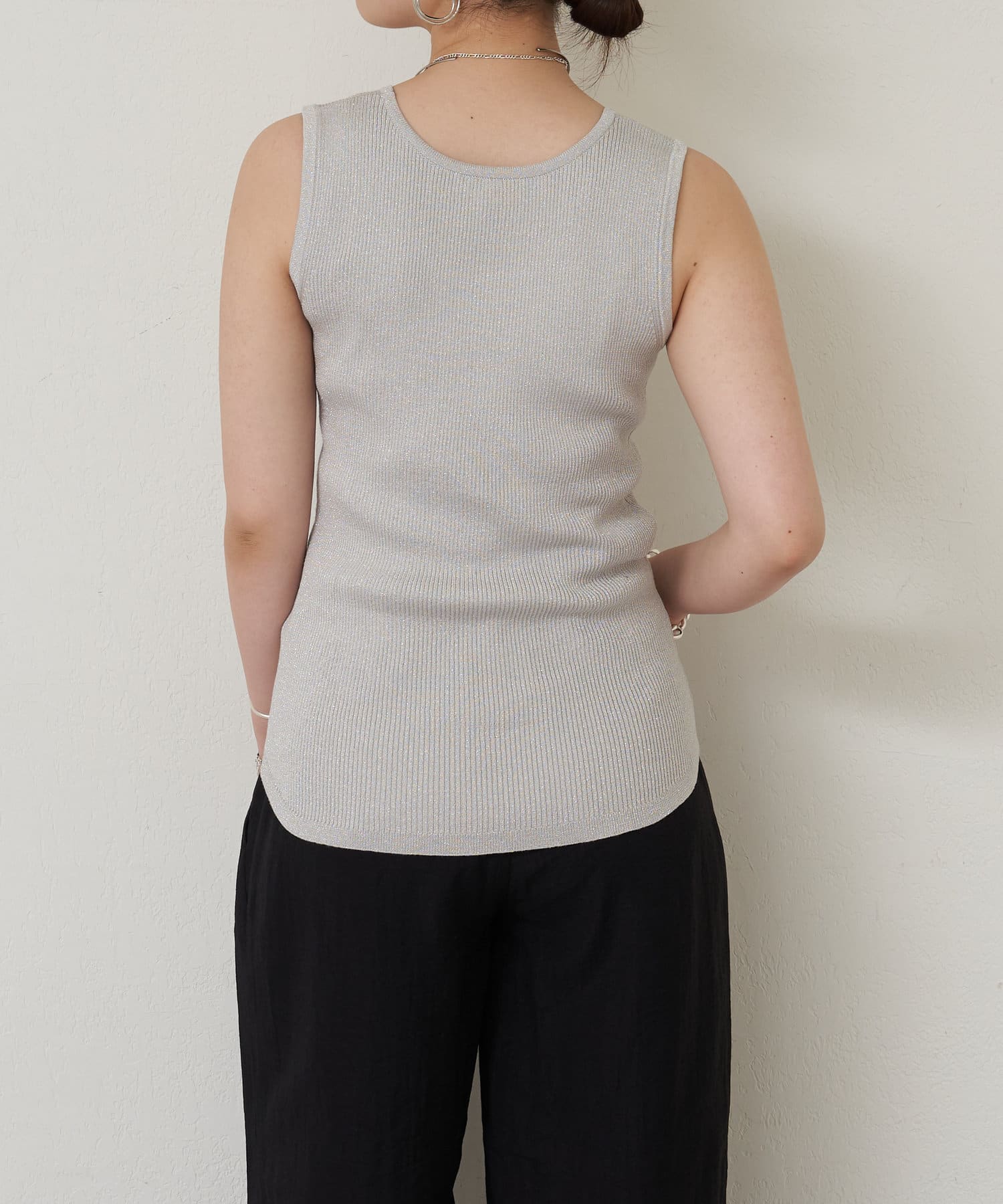 細かなラメ入りの上品なタンクトップ。