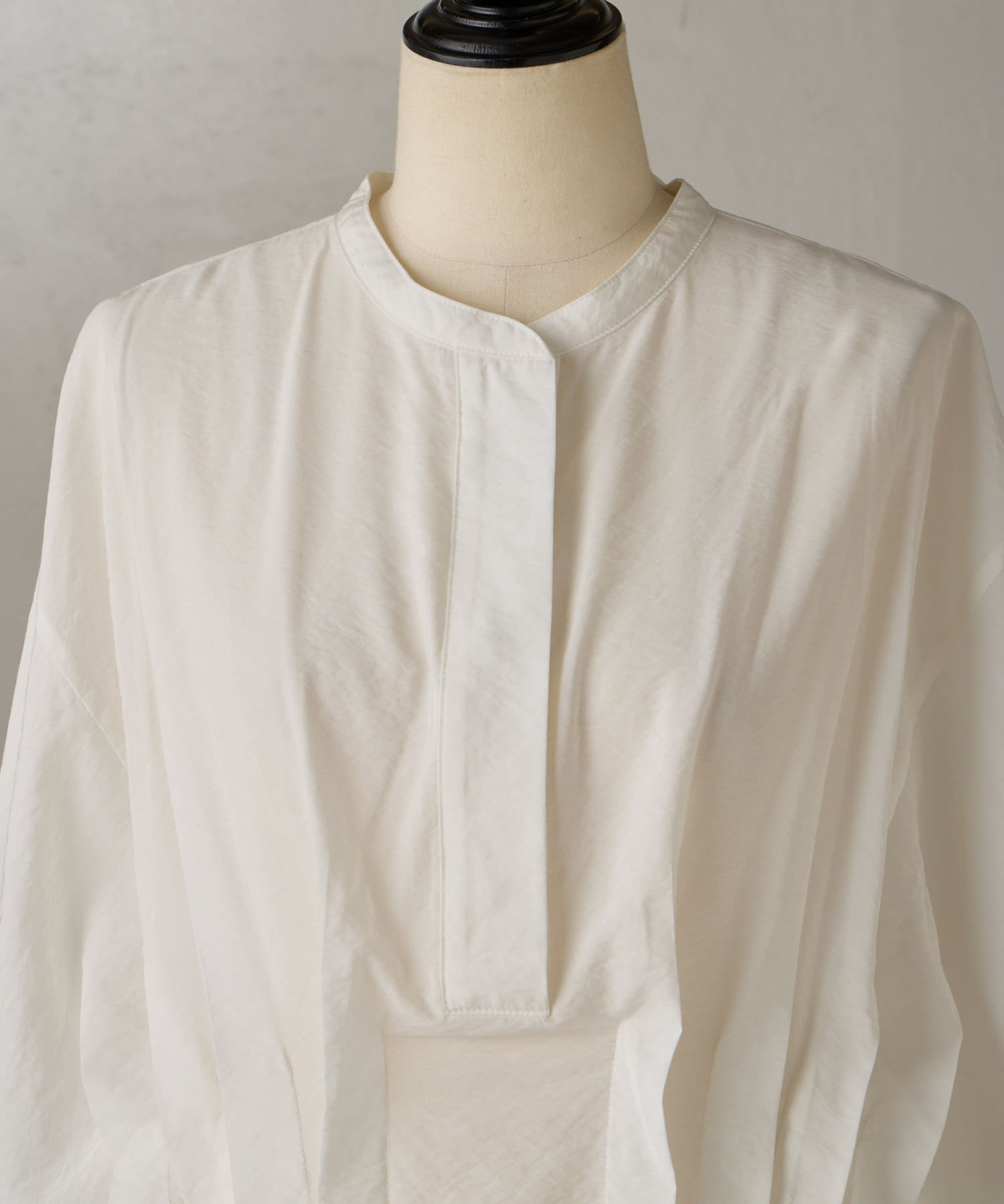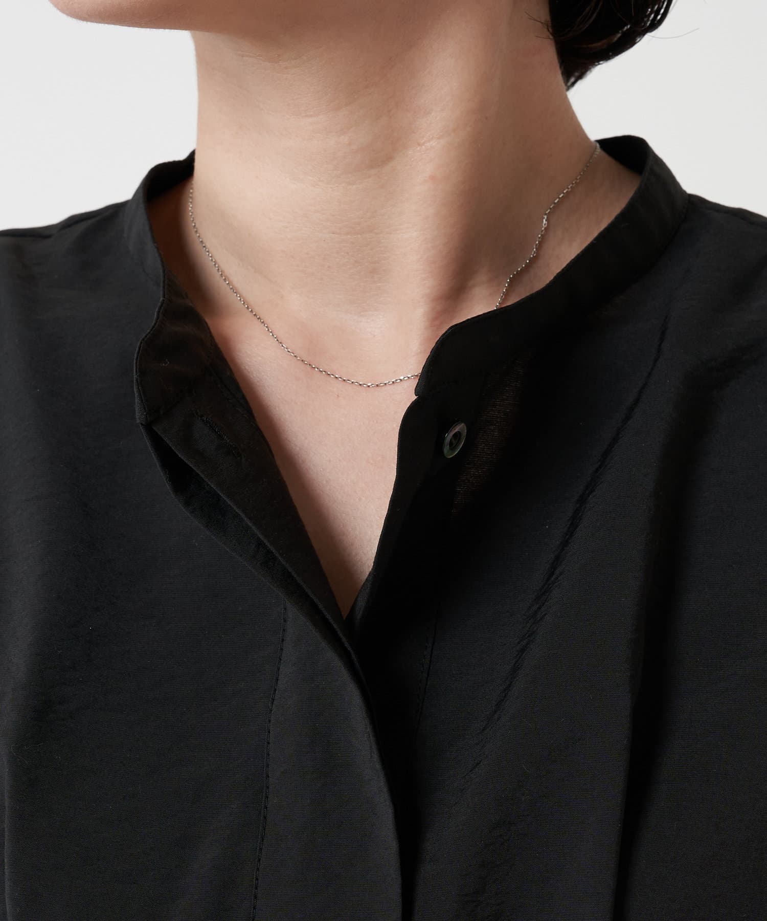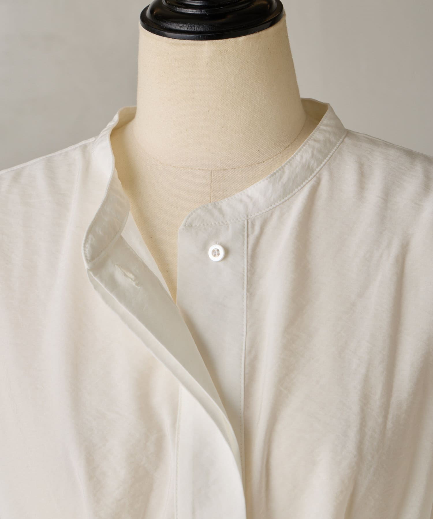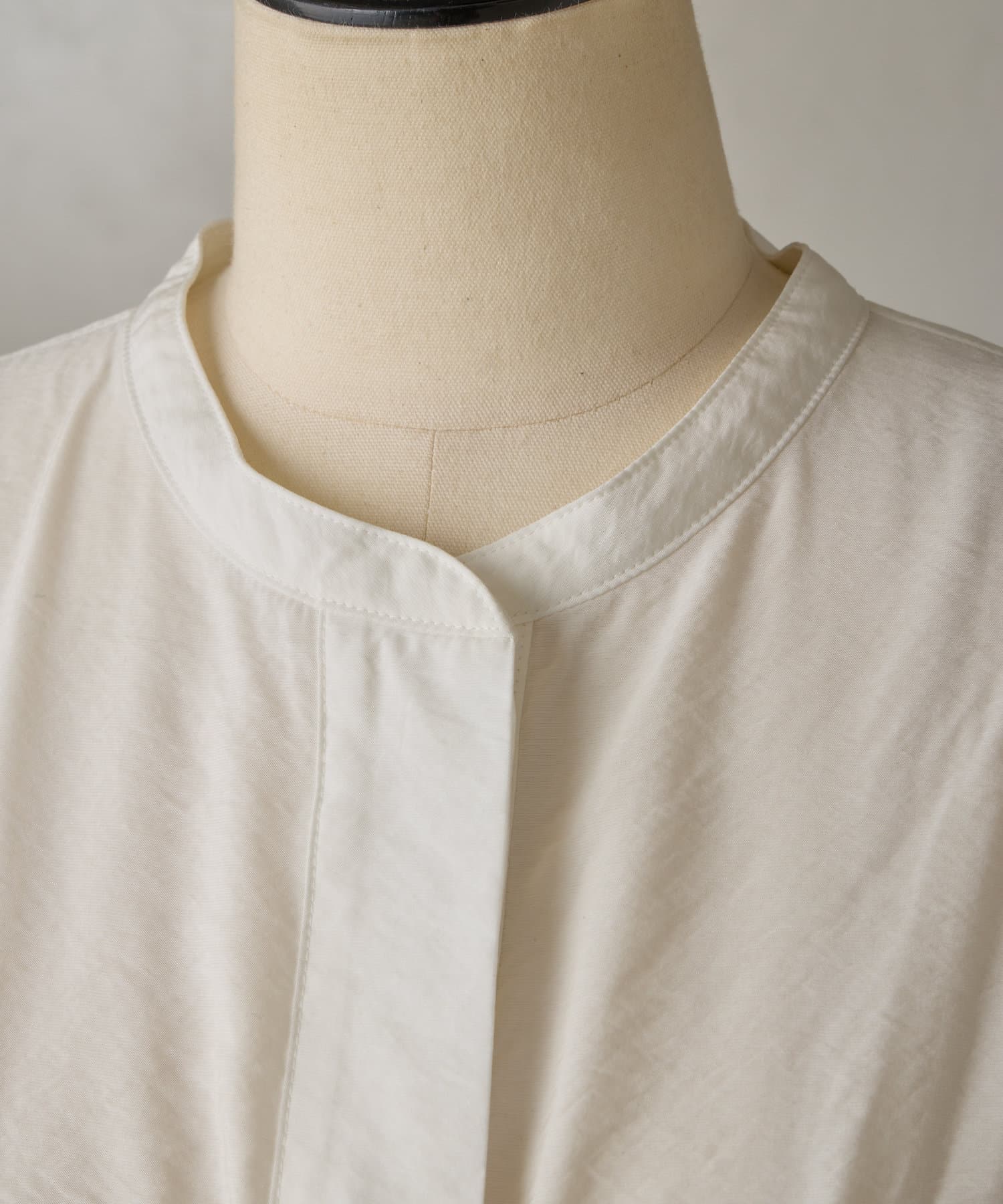 首回りはすっきりとした印象を与えてくれるノーカラーデザイン。