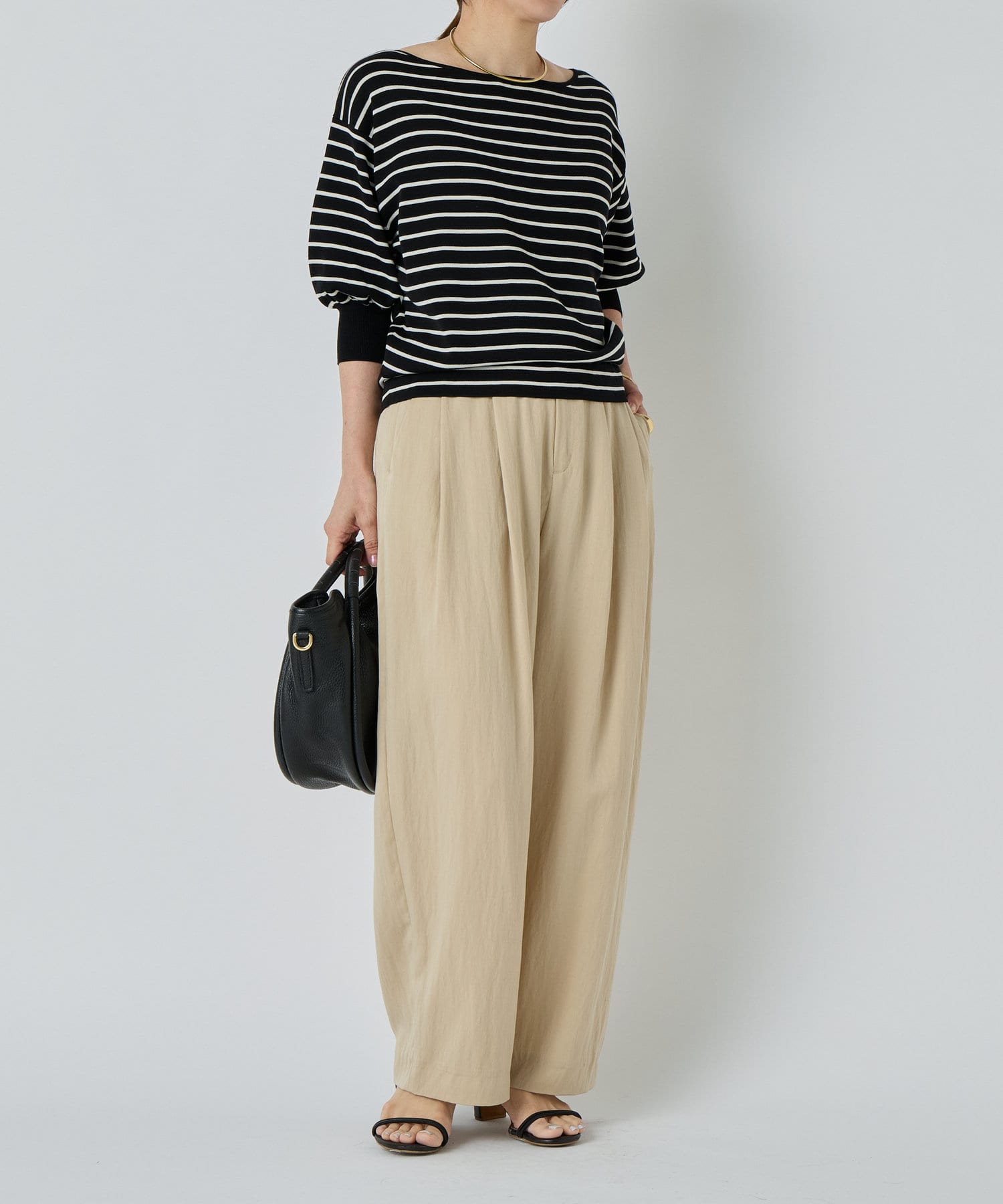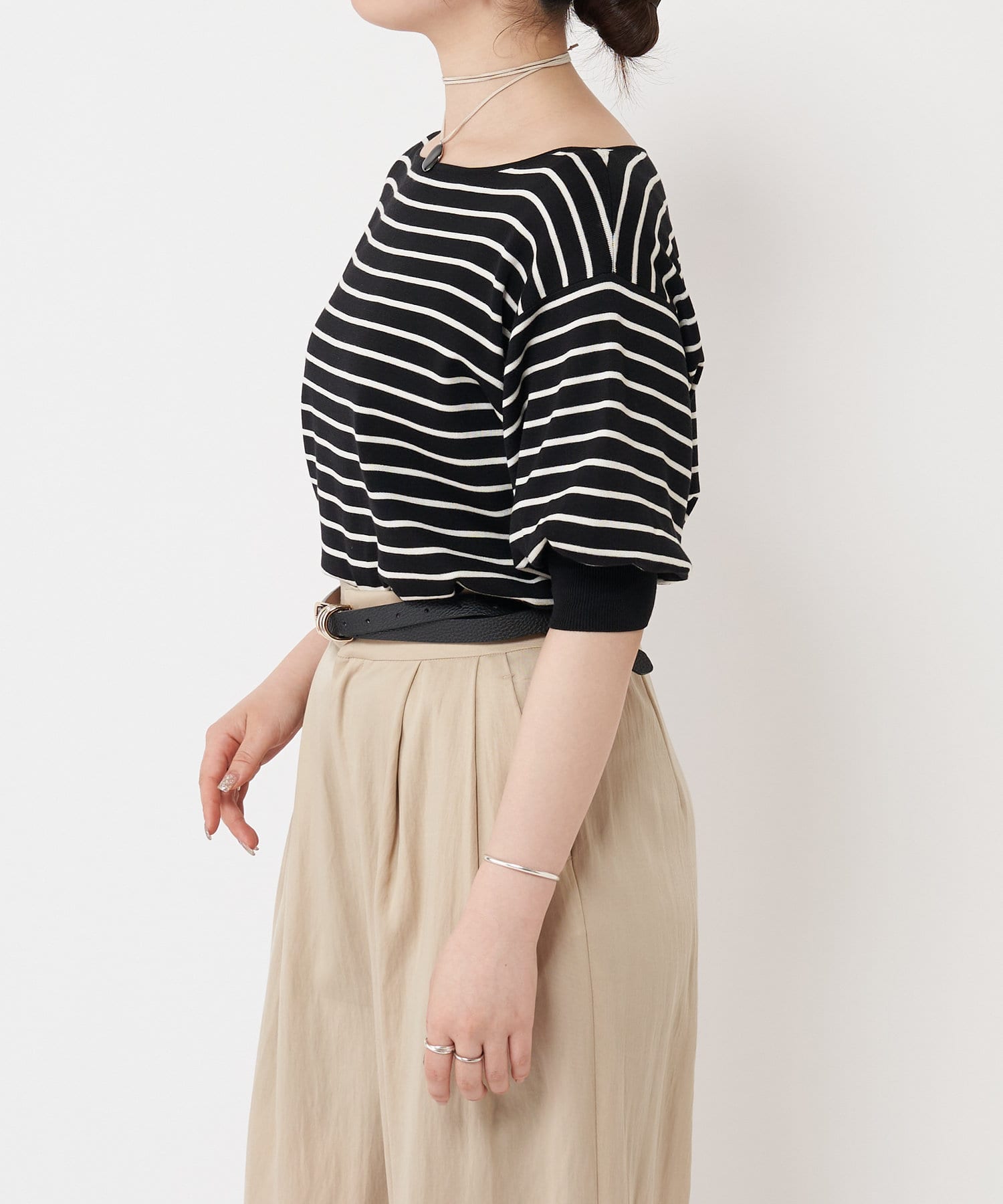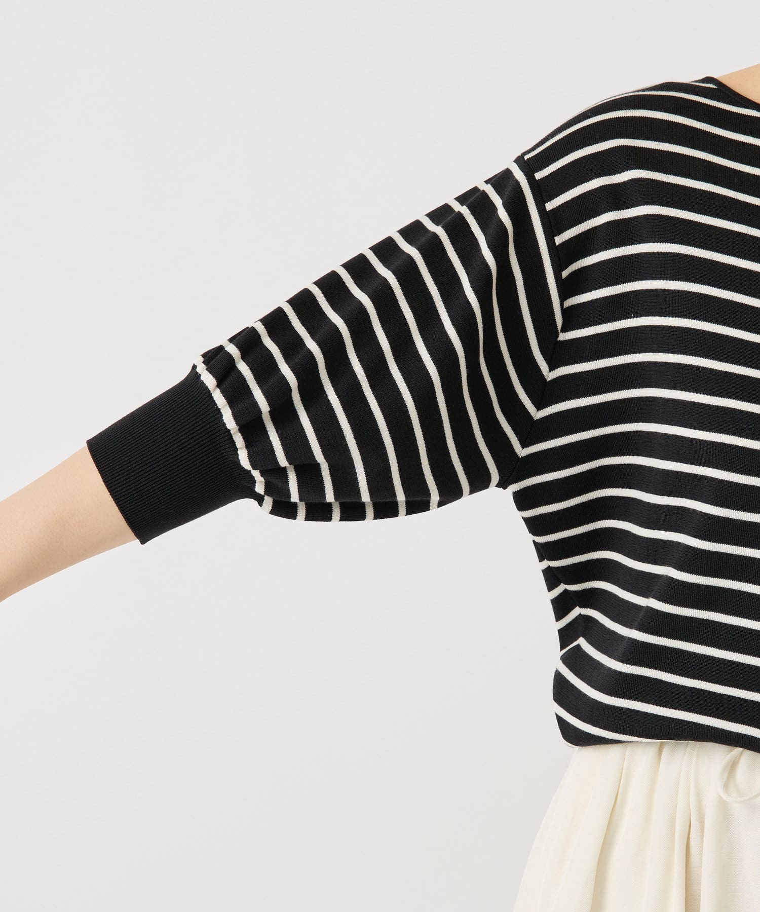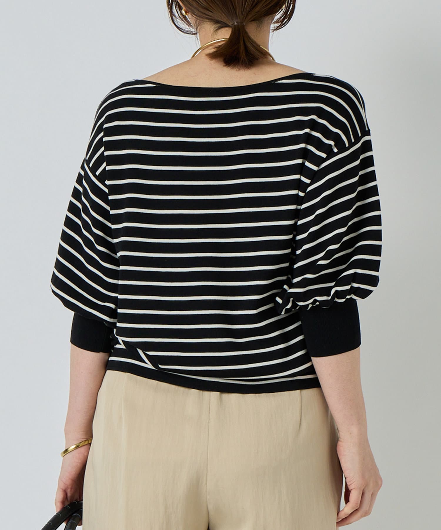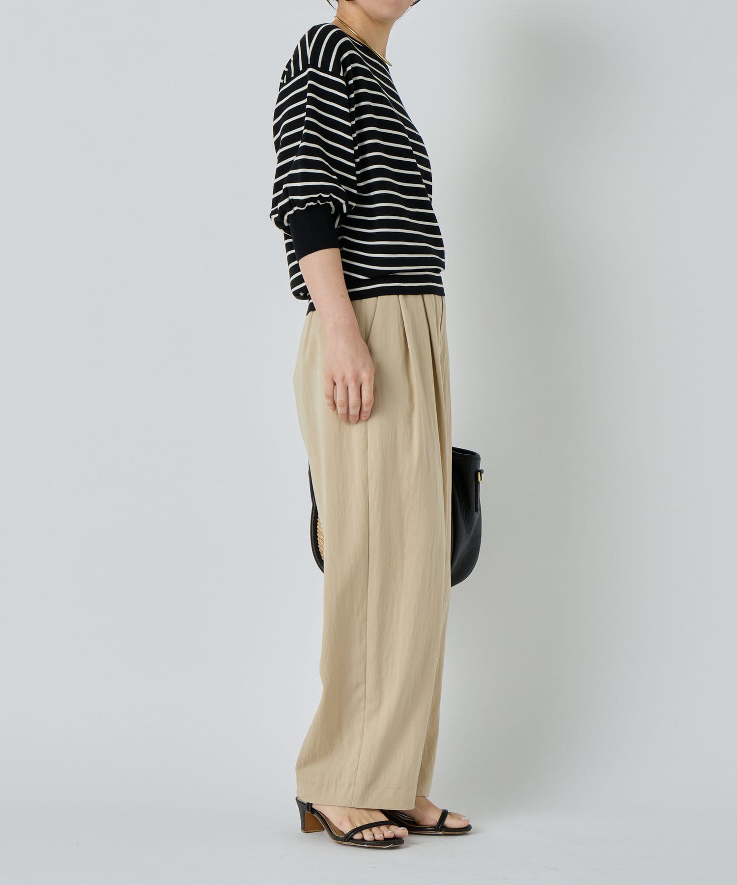 ふんわりとした袖のフォルムと、程よくゆとりのあるシルエットが、体のラインをきれいに見せつつリラックス感も演出。