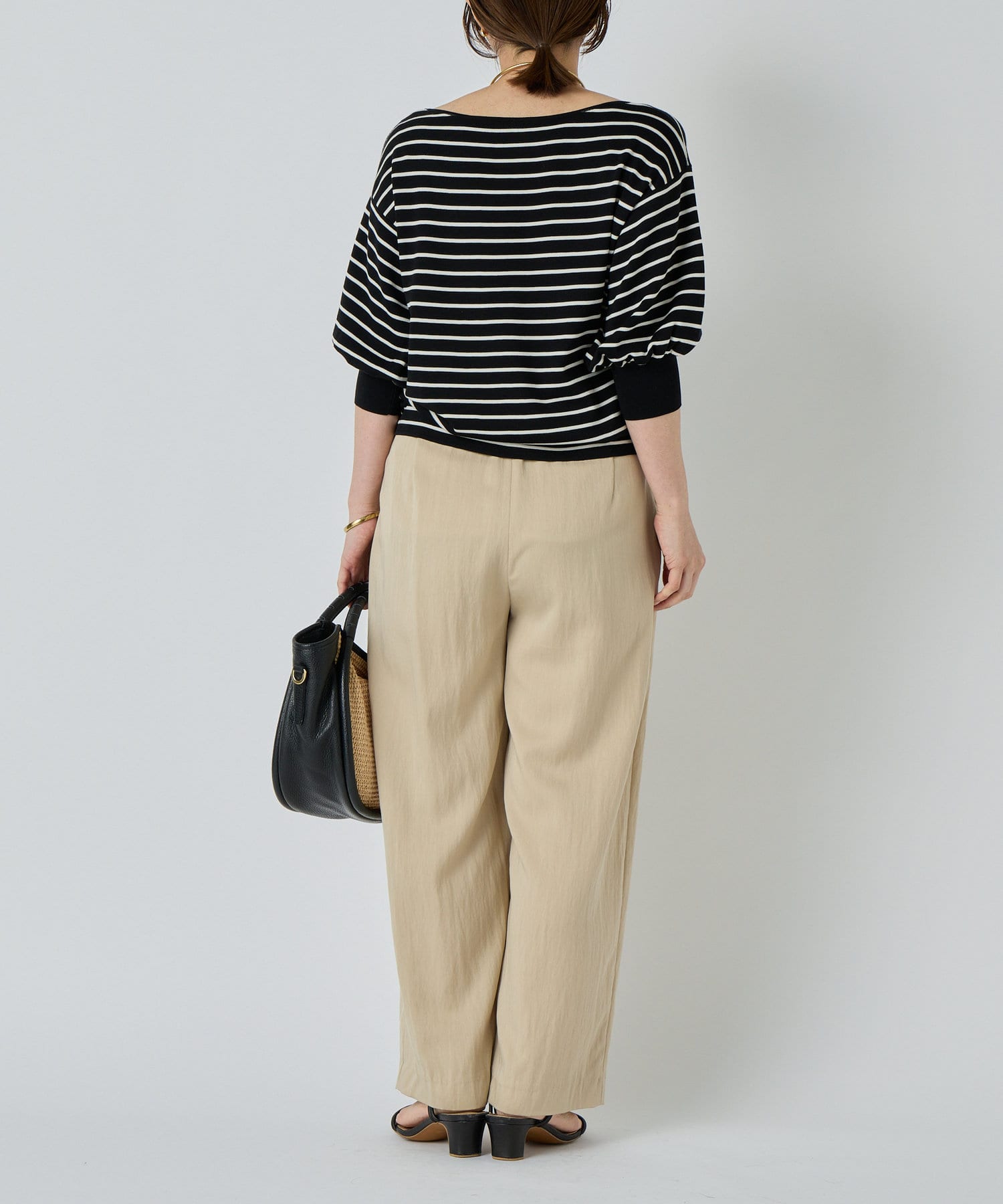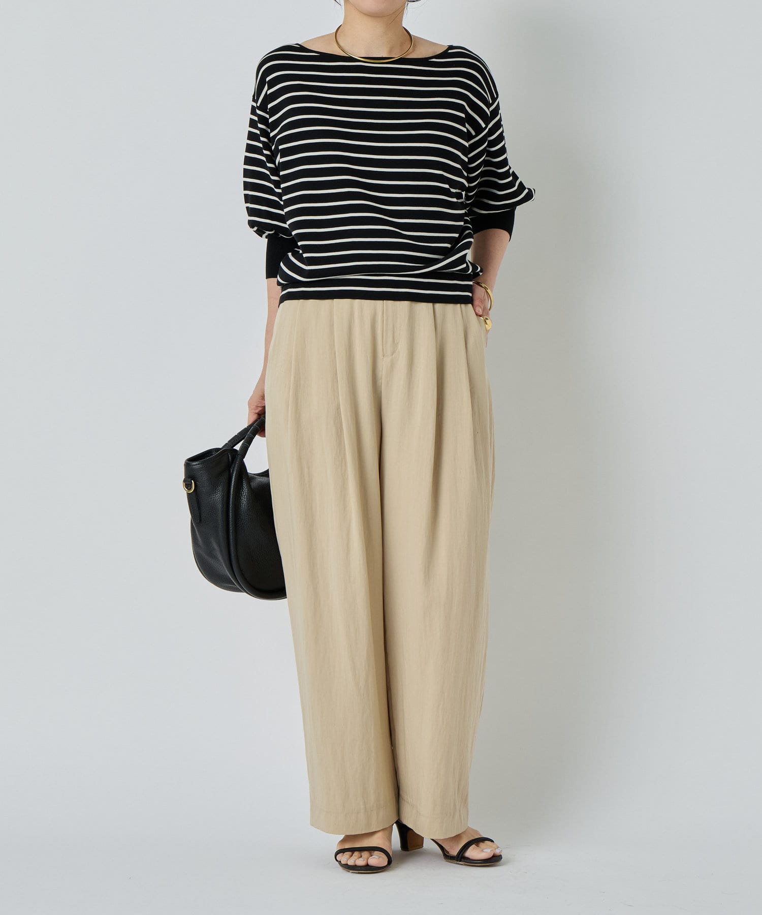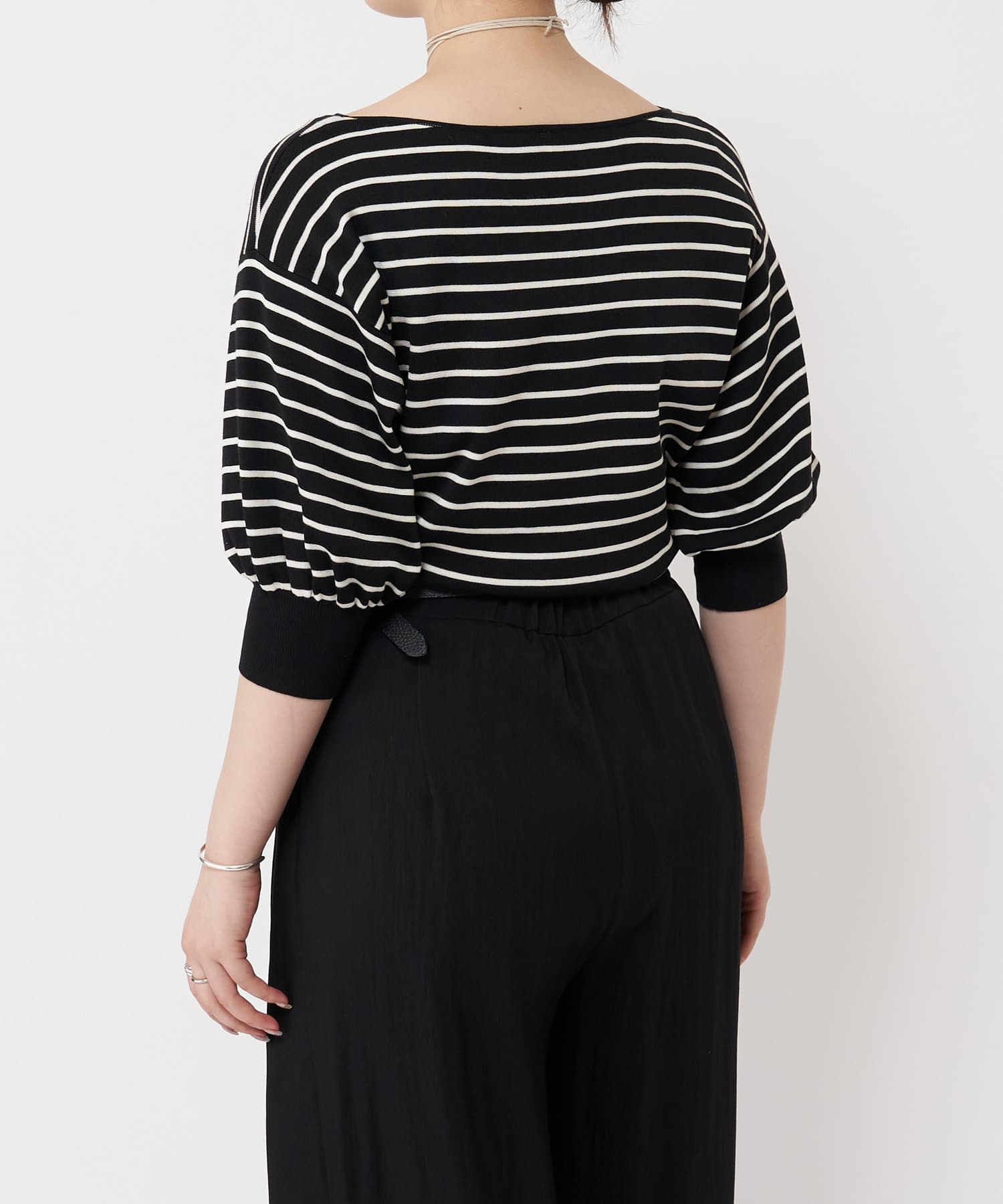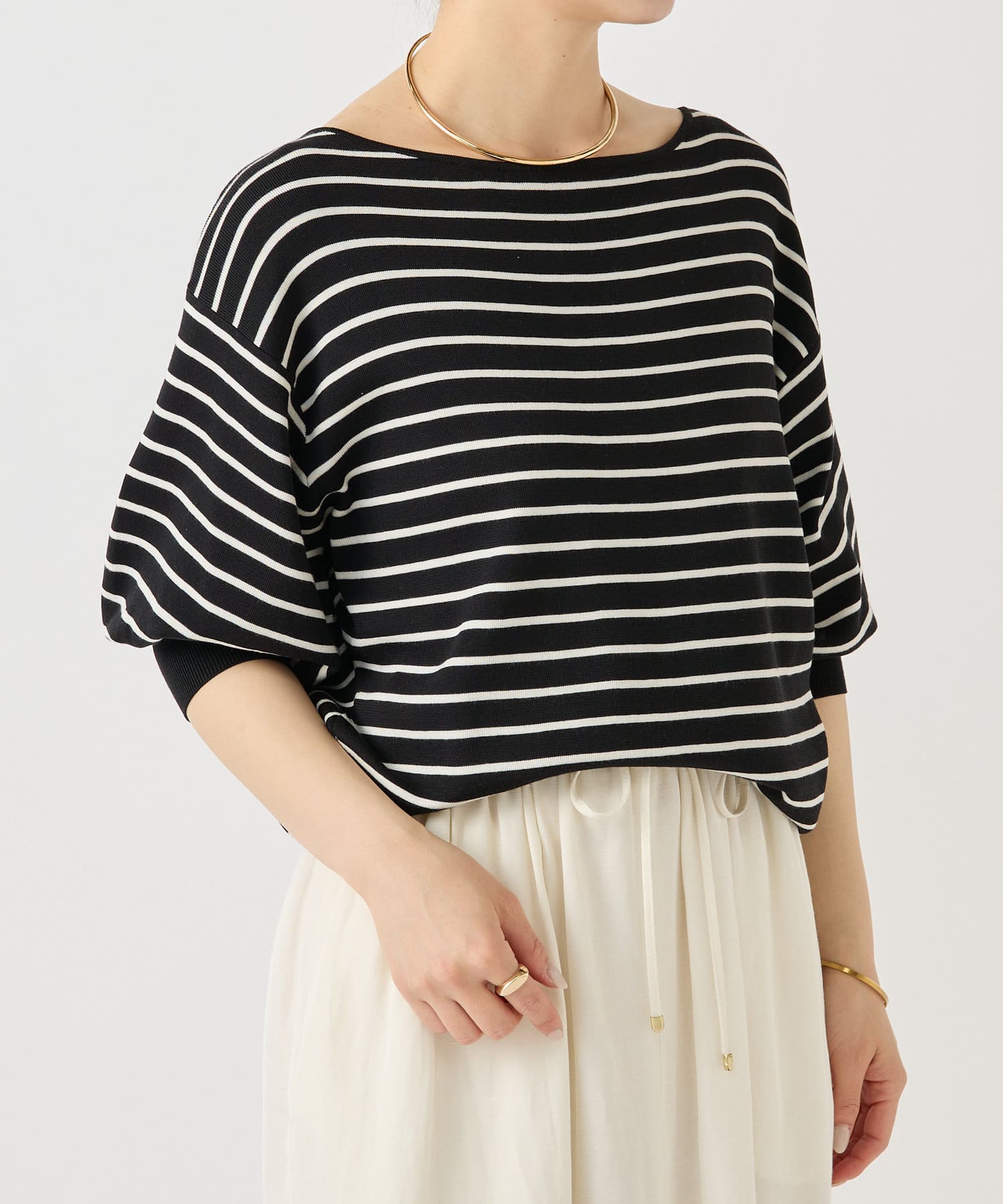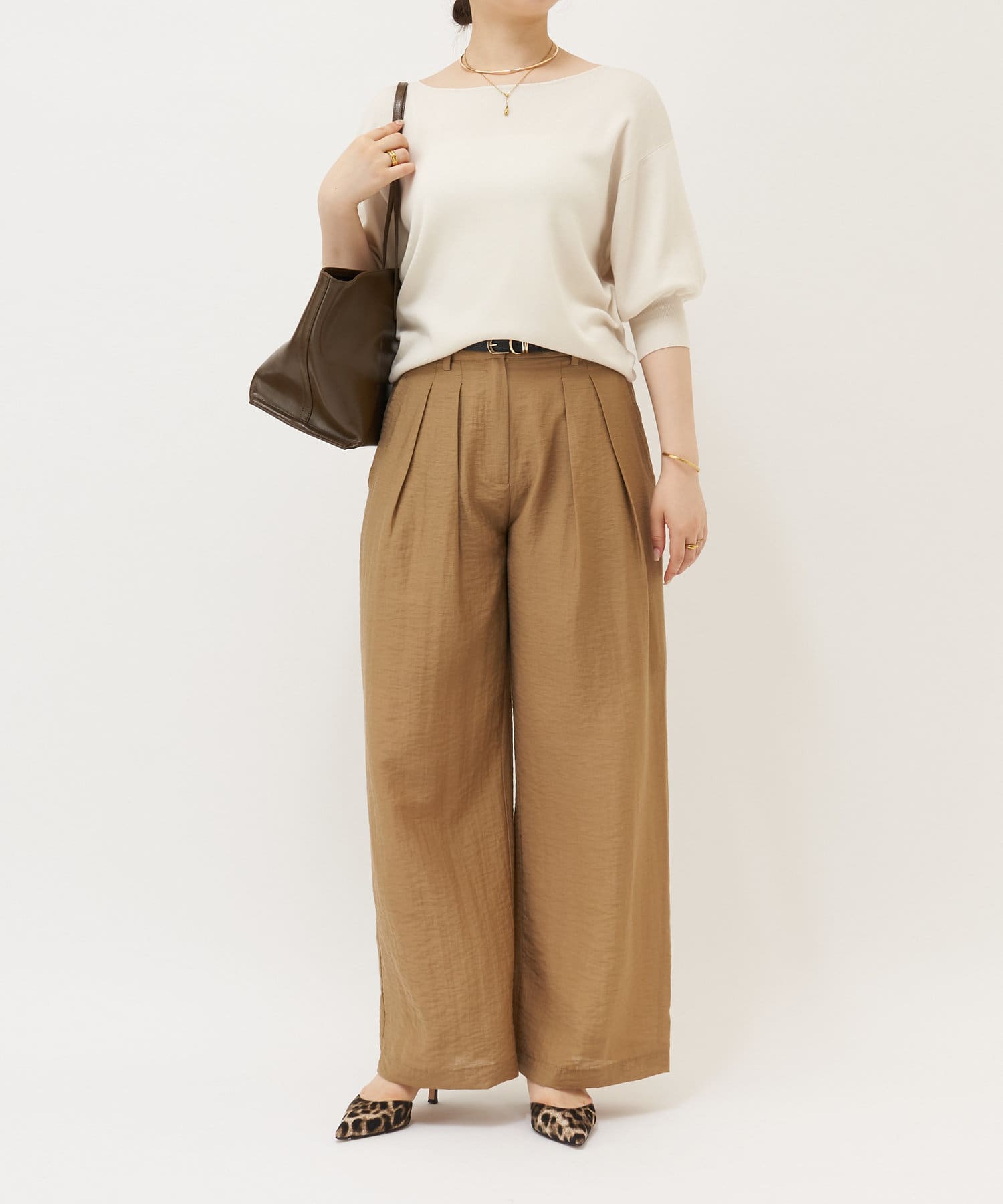 ふんわりとした袖のフォルムと、程よくゆとりのあるシルエットが、体のラインをきれいに見せつつリラックス感も演出。