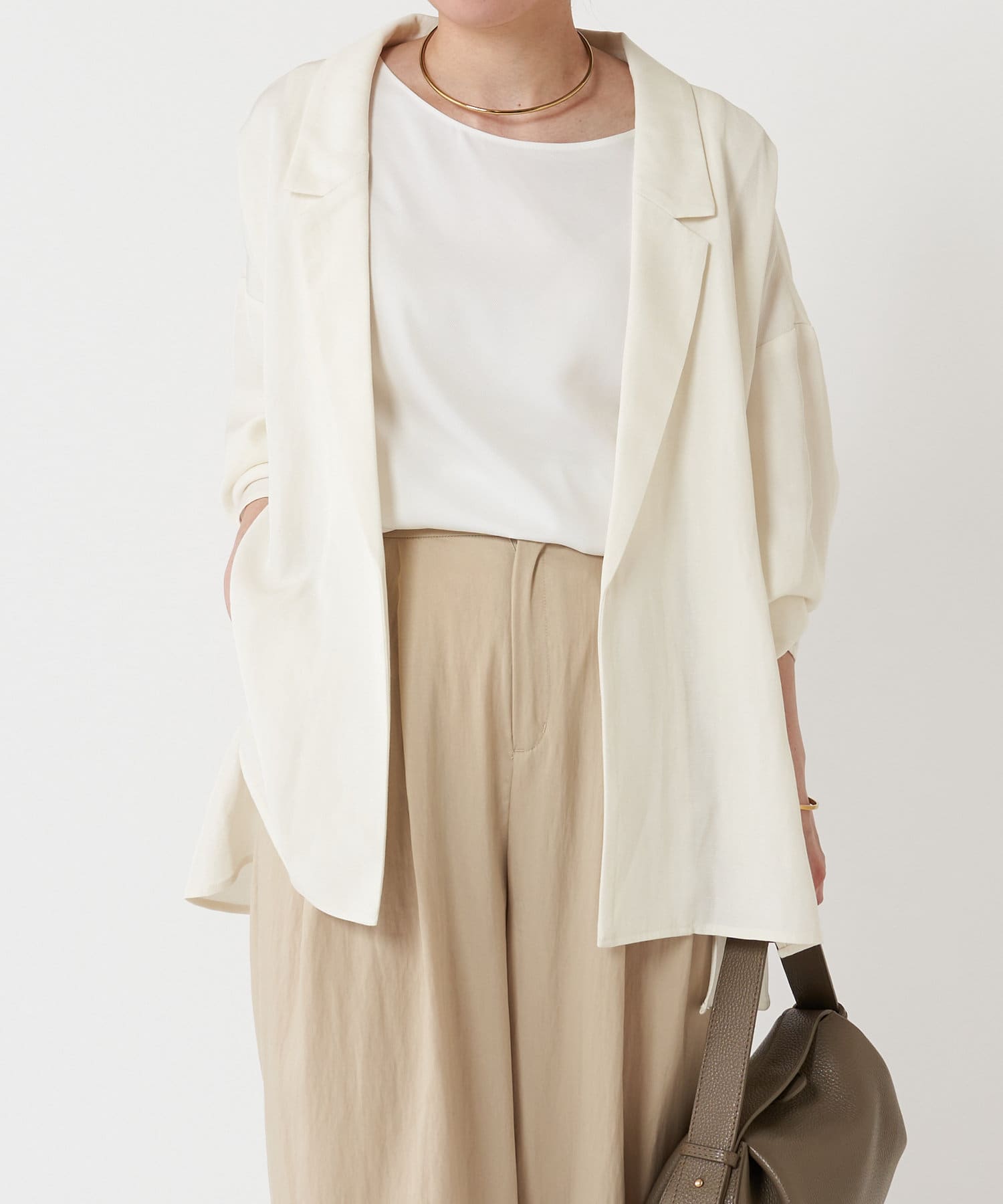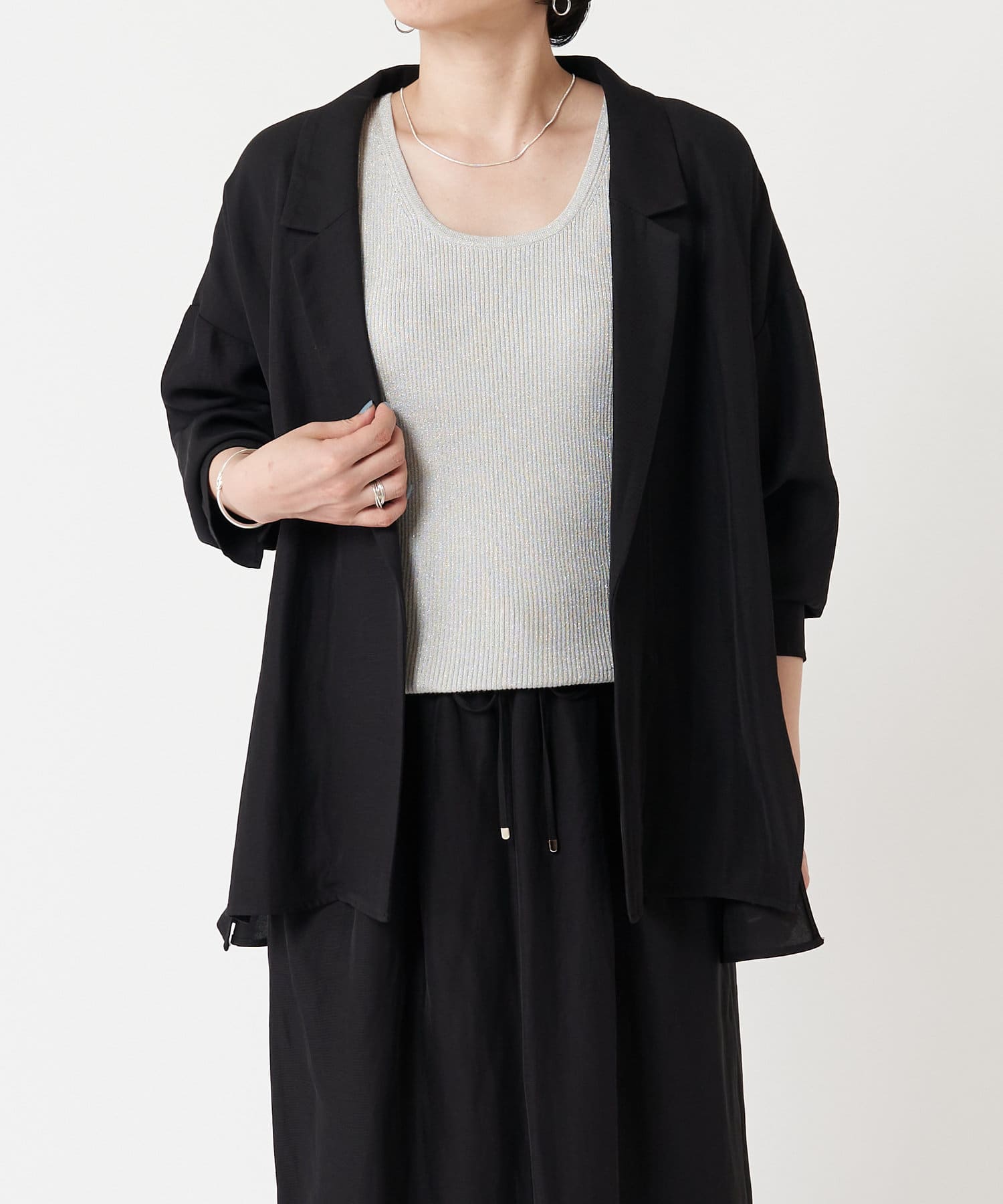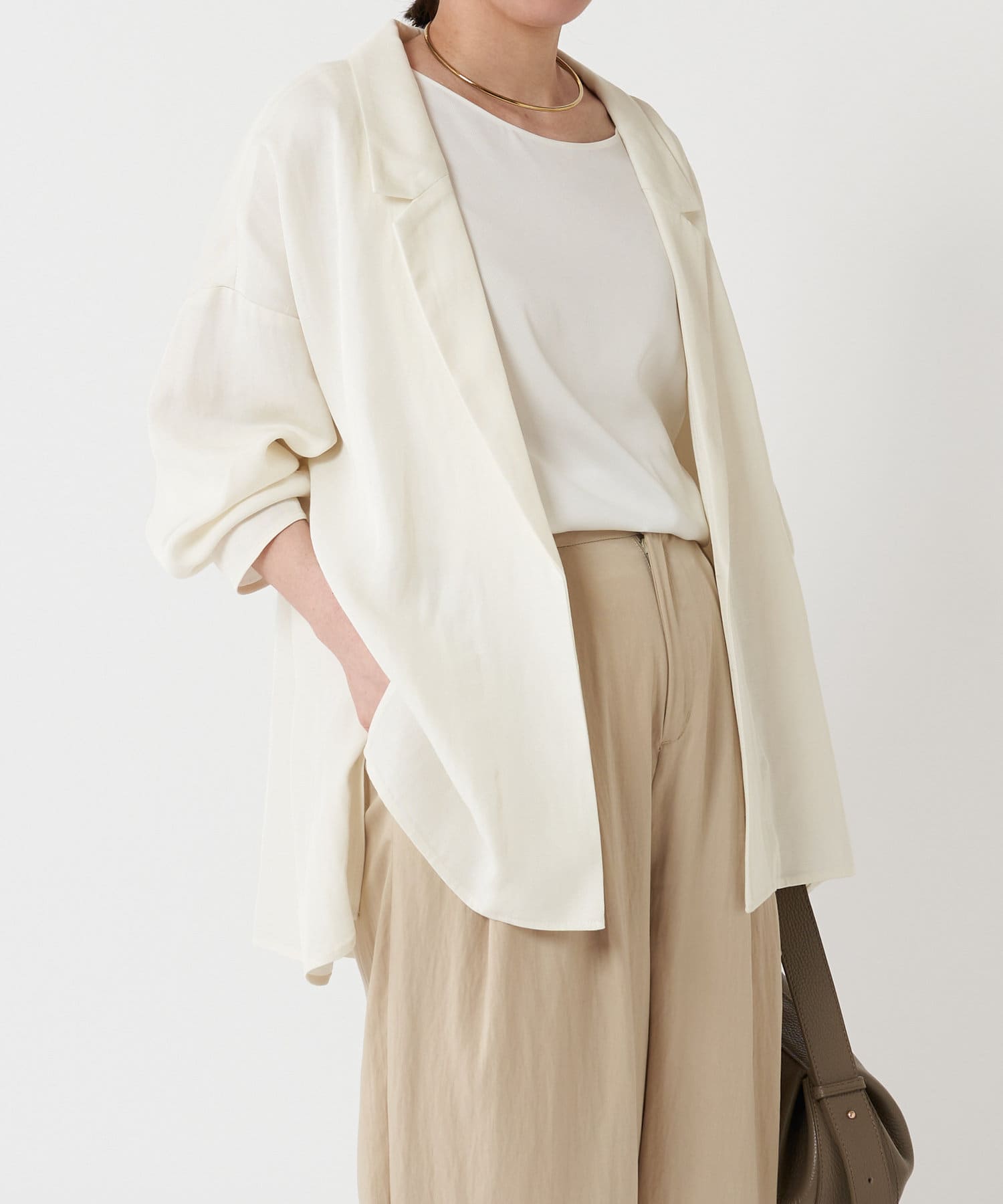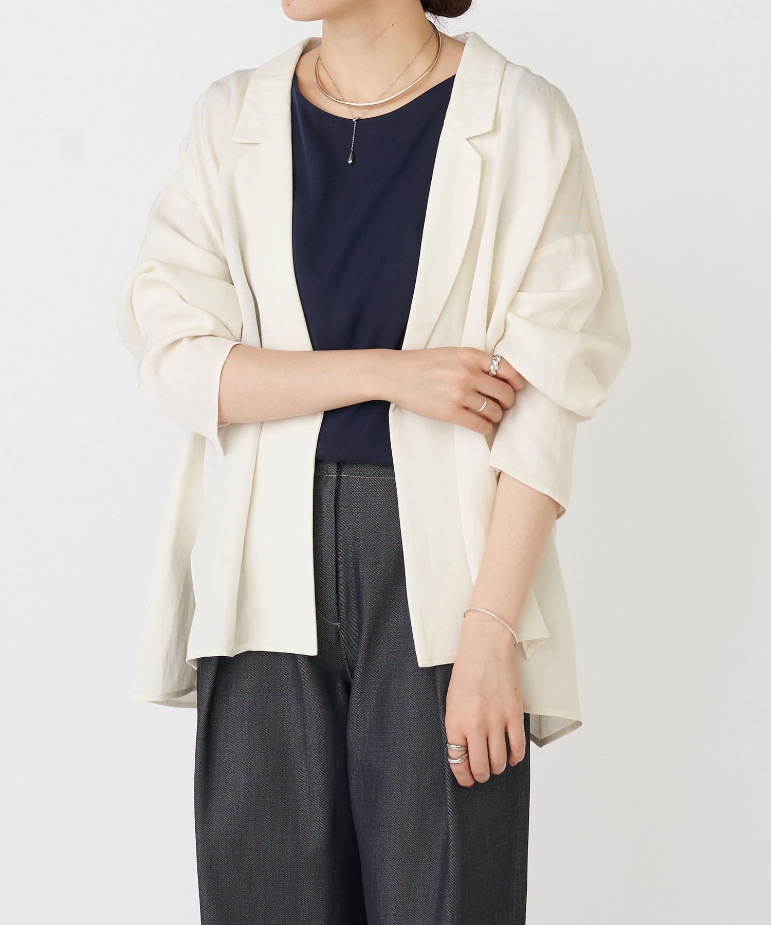 ドロップショルダーでサイドにスリットが入っており楽に着れて、固くなりすぎないのもポイント。