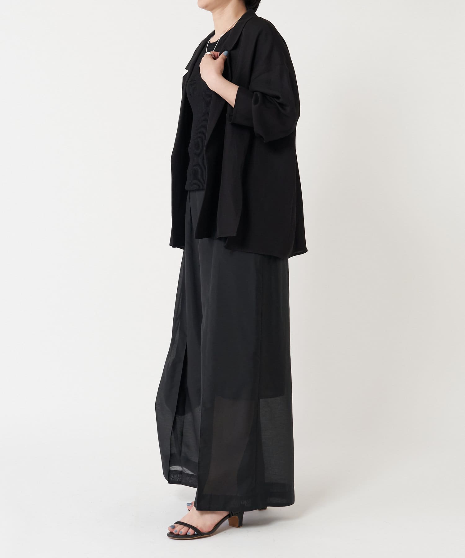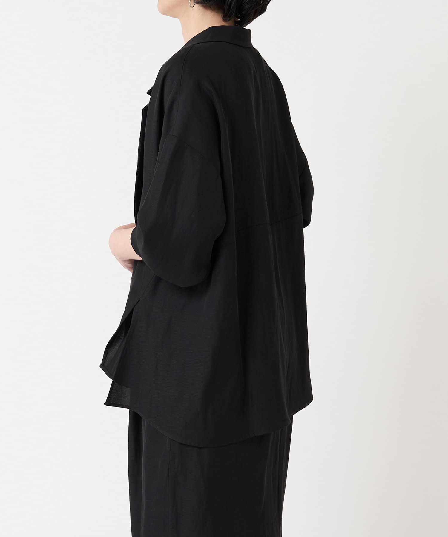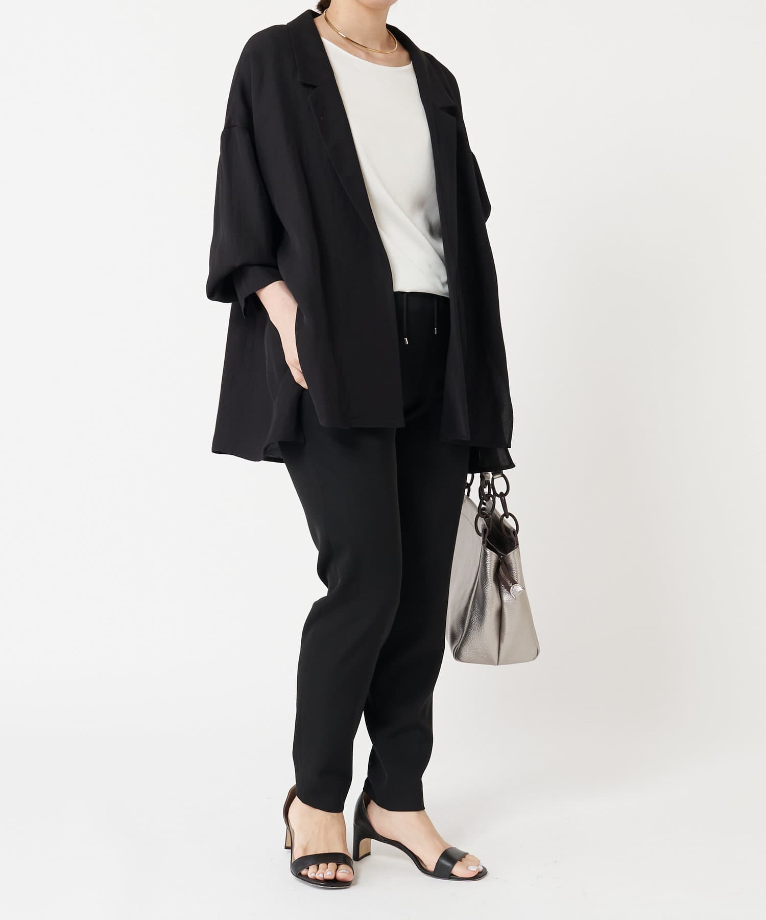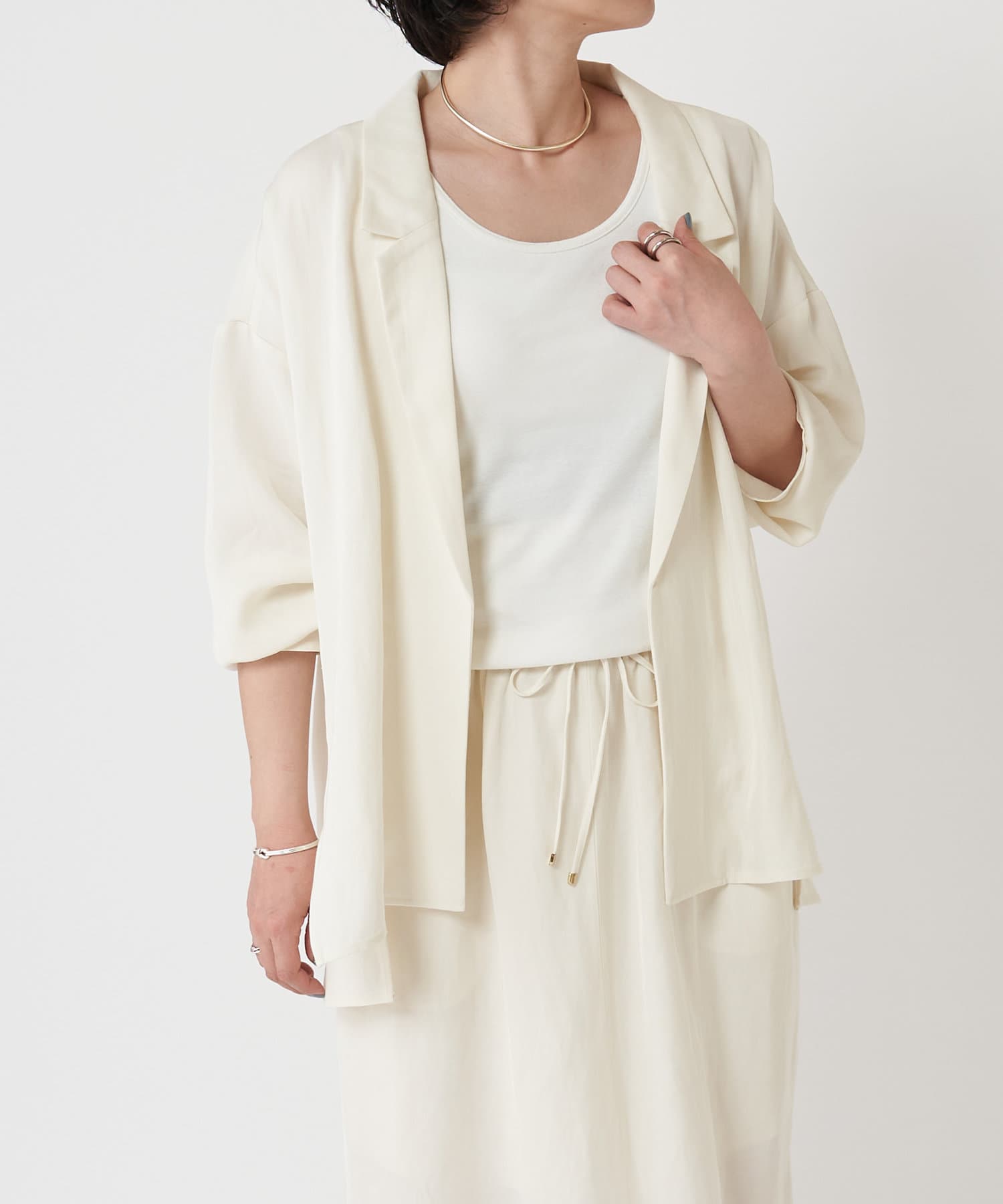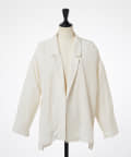 ドロップショルダーでサイドにスリットが入っており楽に着れて、固くなりすぎないのもポイント。