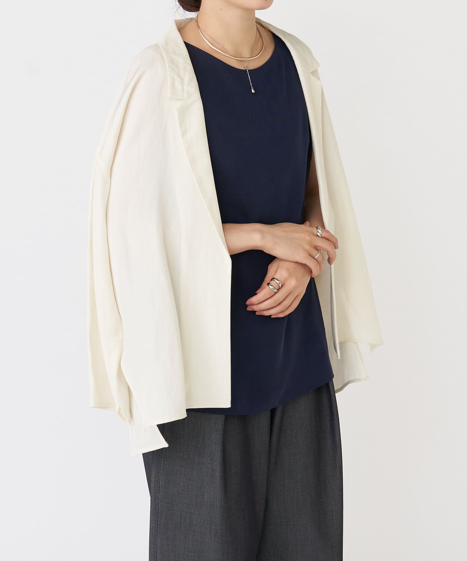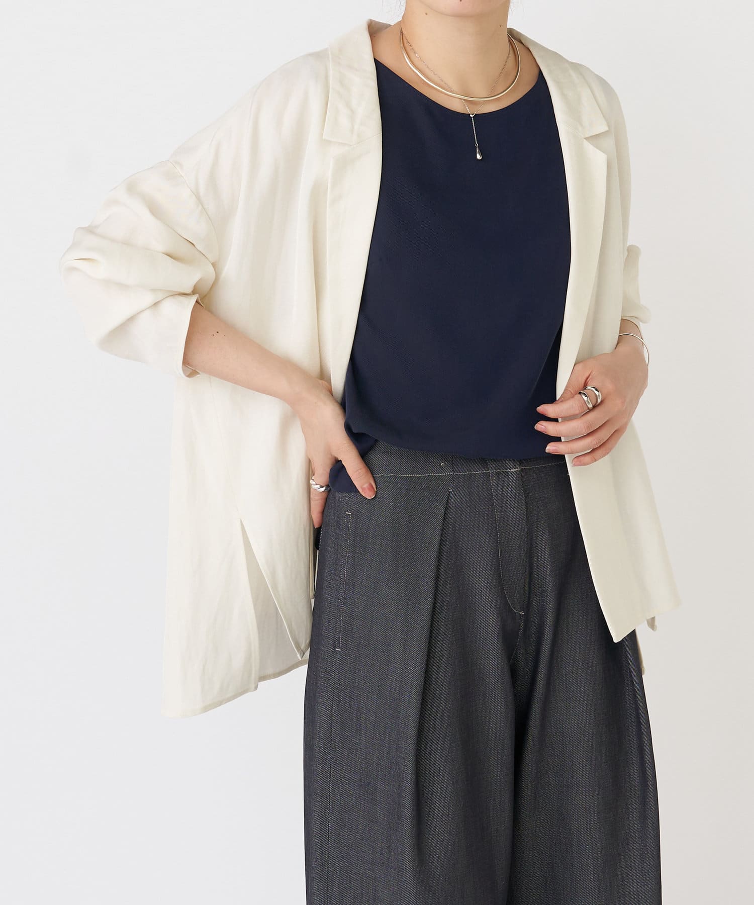 軽やかで清涼感漂うツイル地のリネン混素材なのでシワになりにくく、様々なシュチュエーションに使えるジャケット。