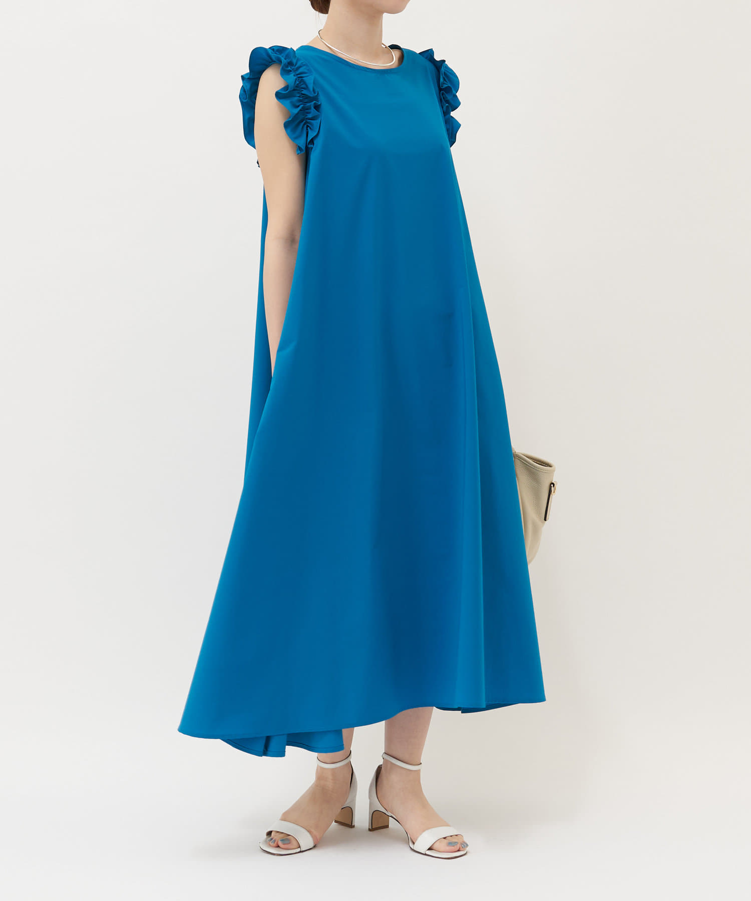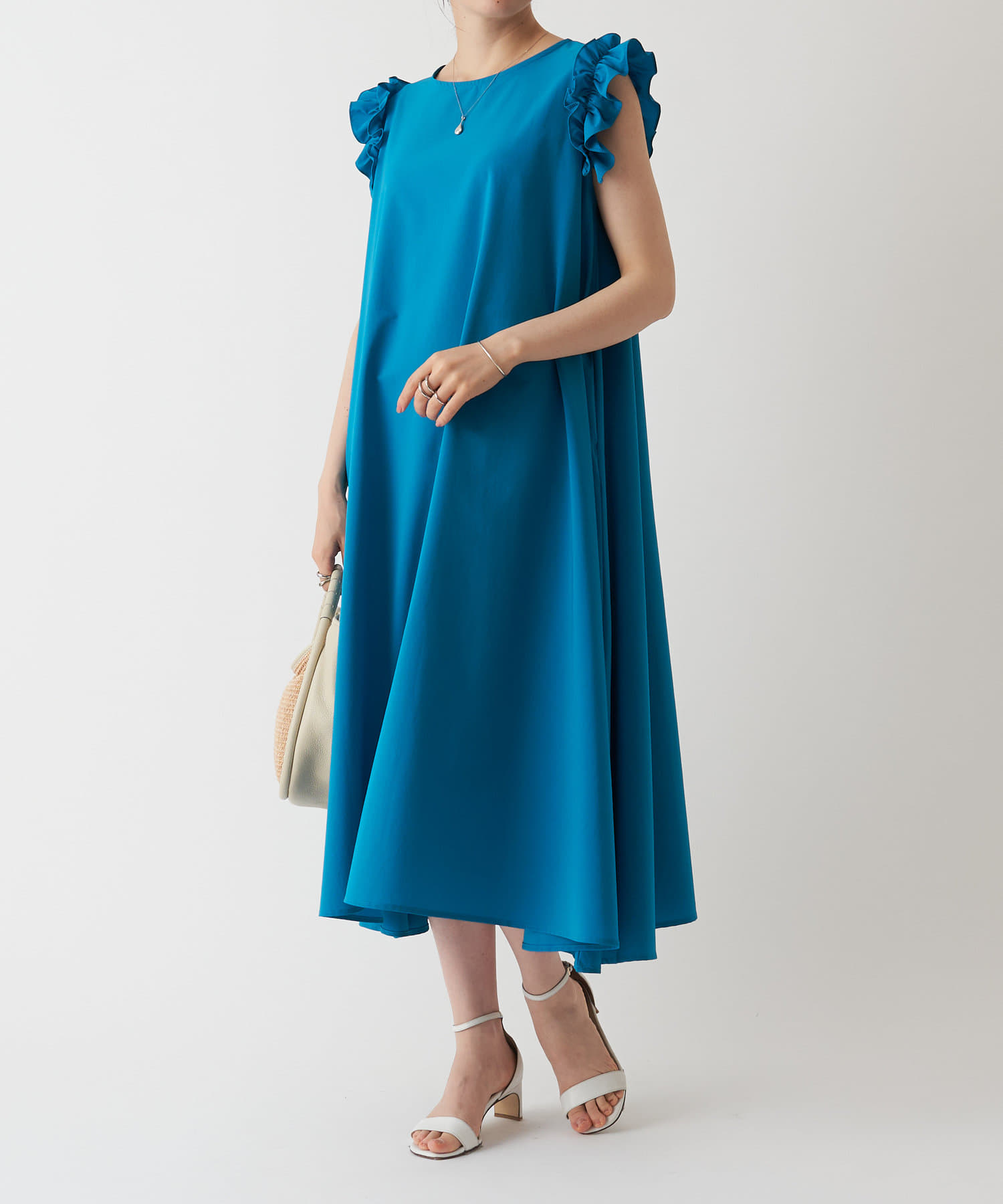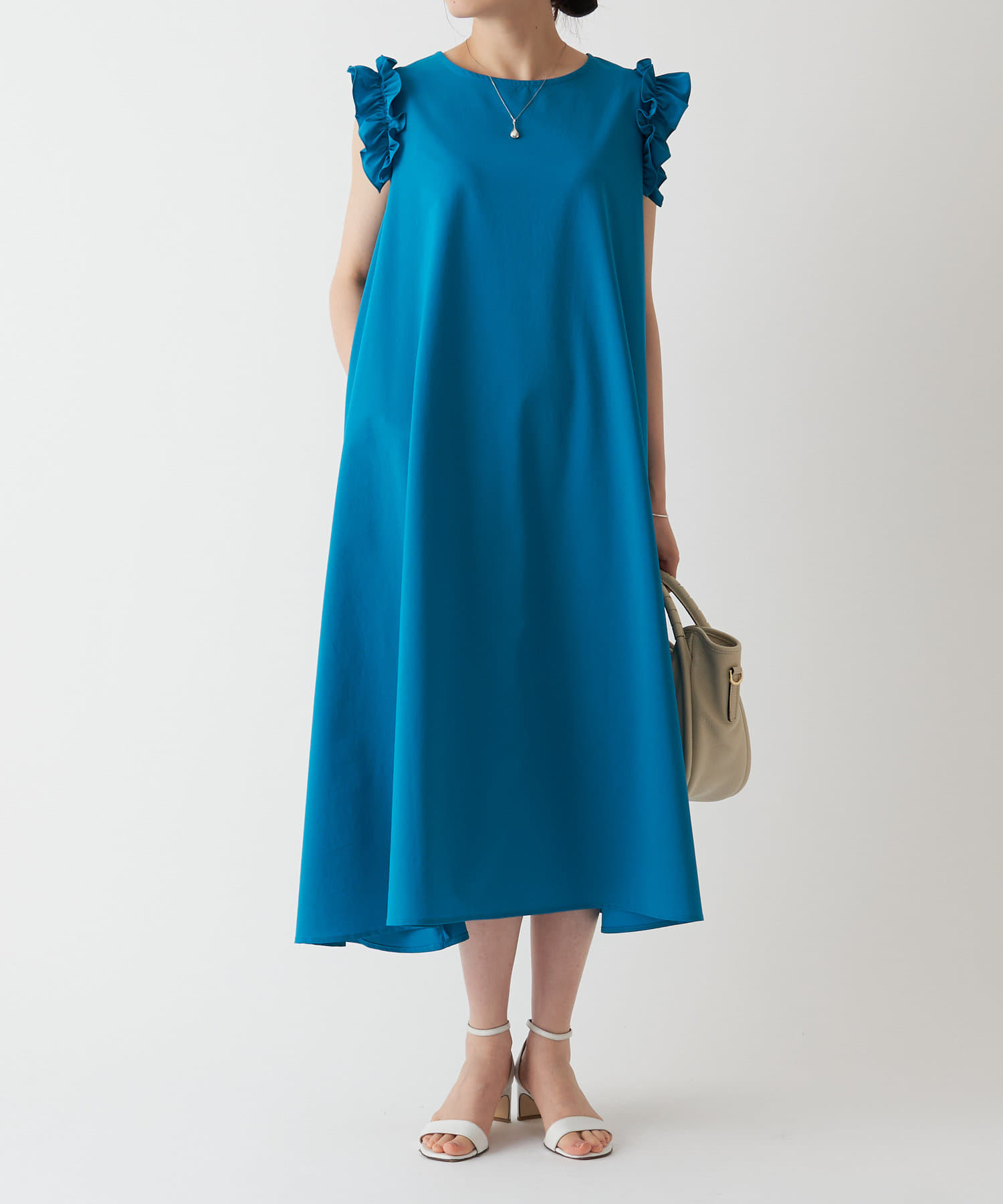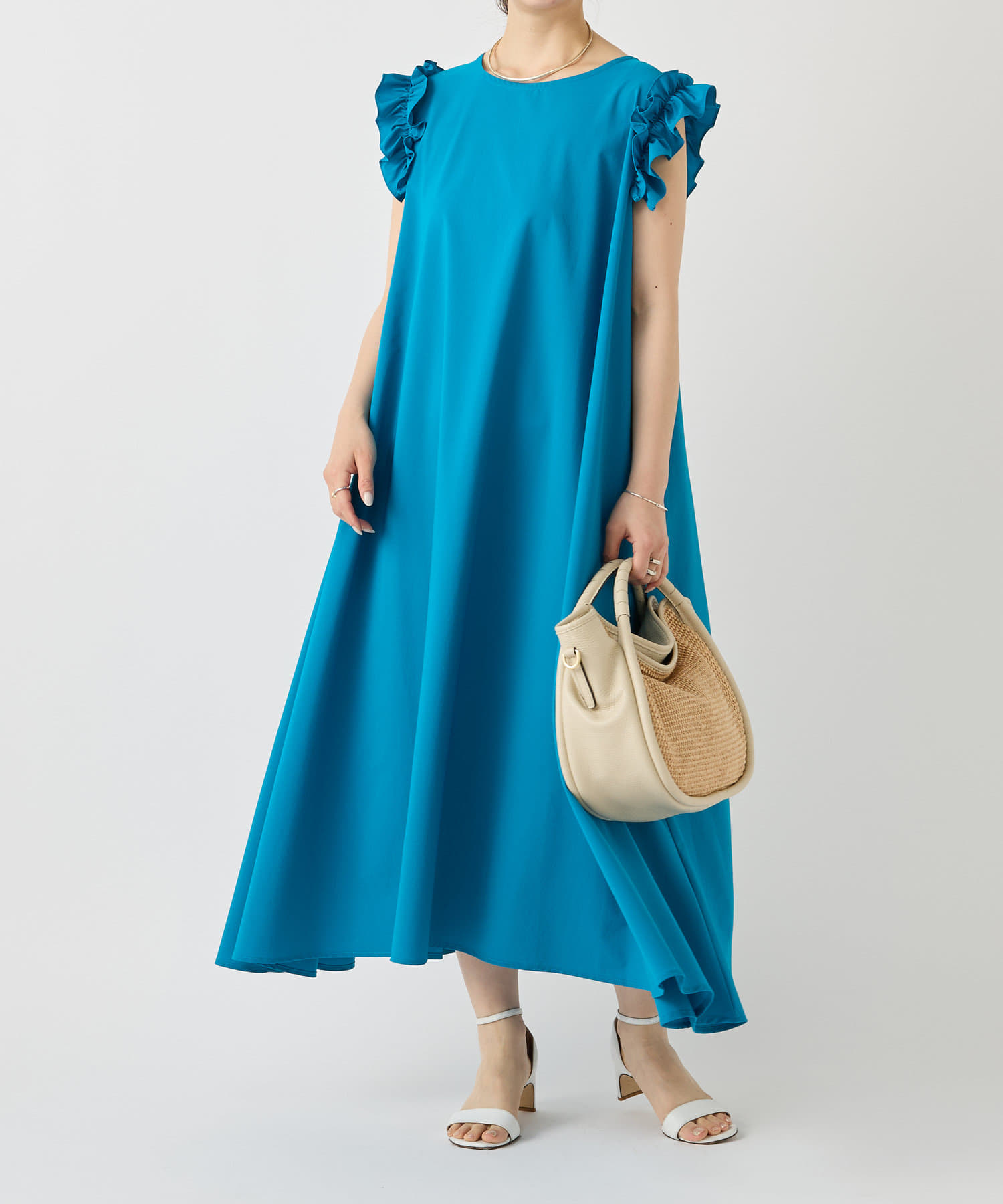 ノースリーブで肩にかかるデザインですが、腕が気になる方はサラッとカーデを肩掛けするのもおすすめ。