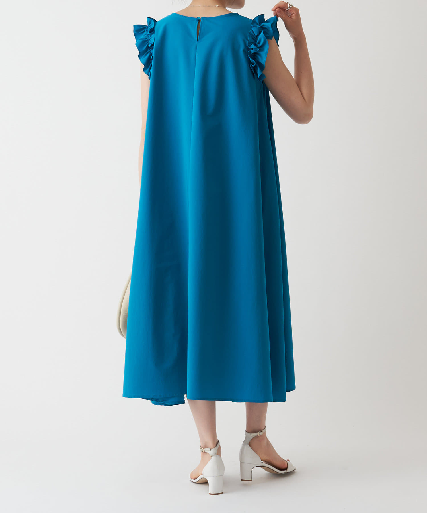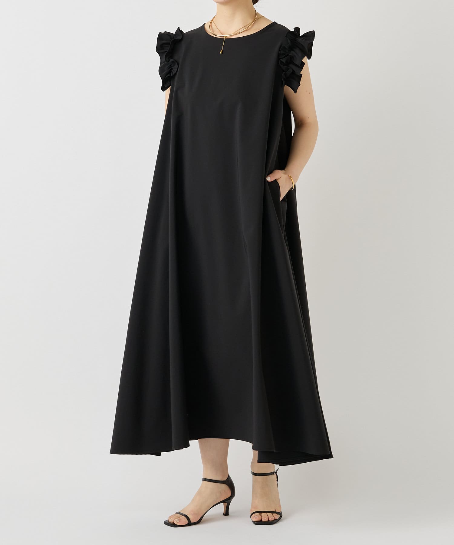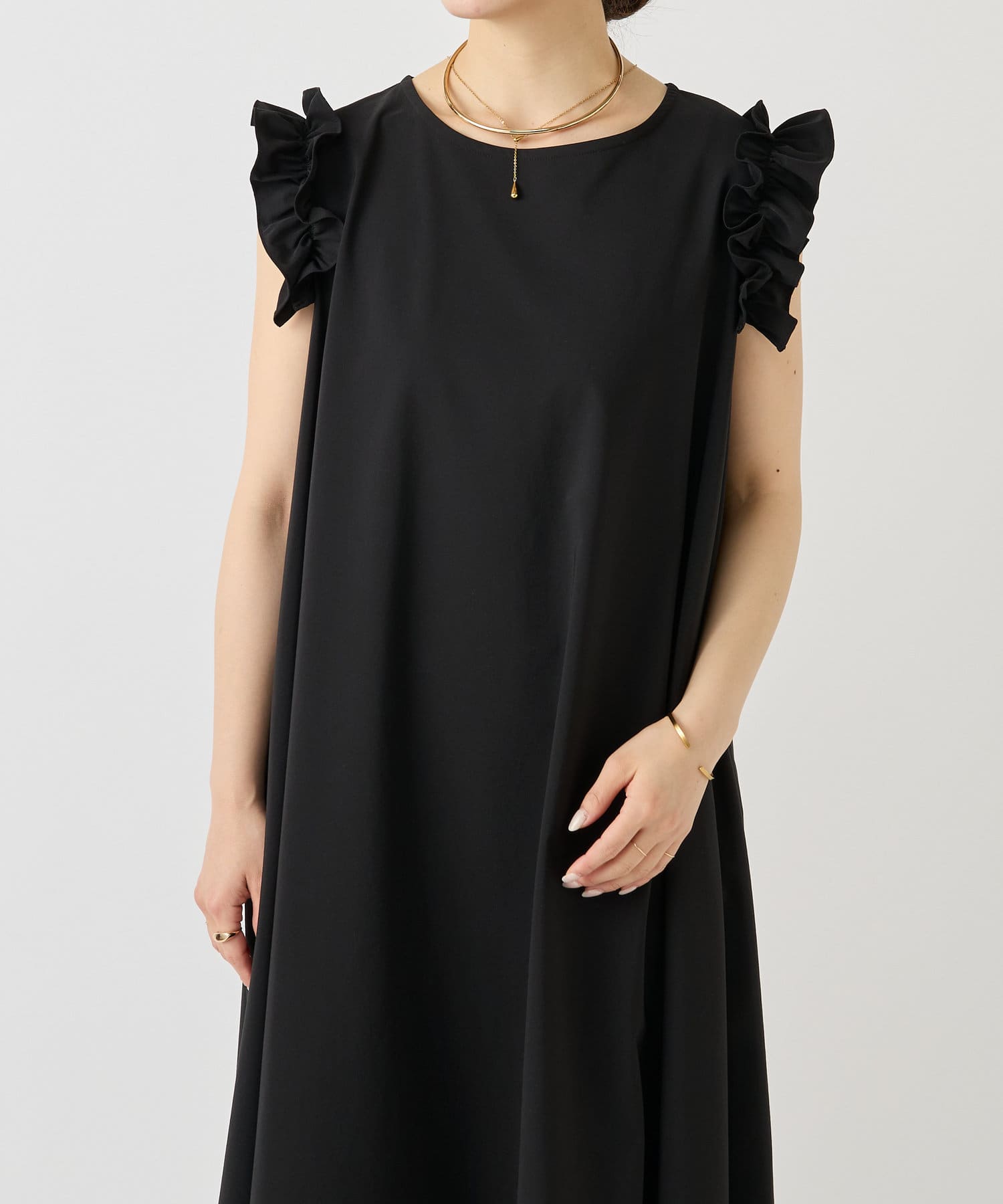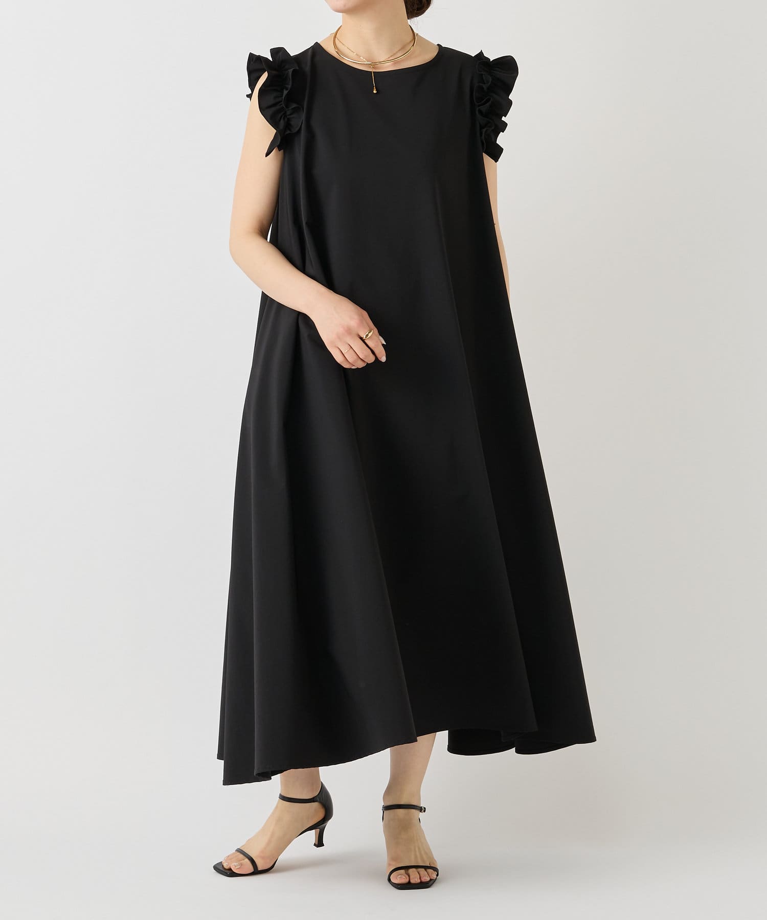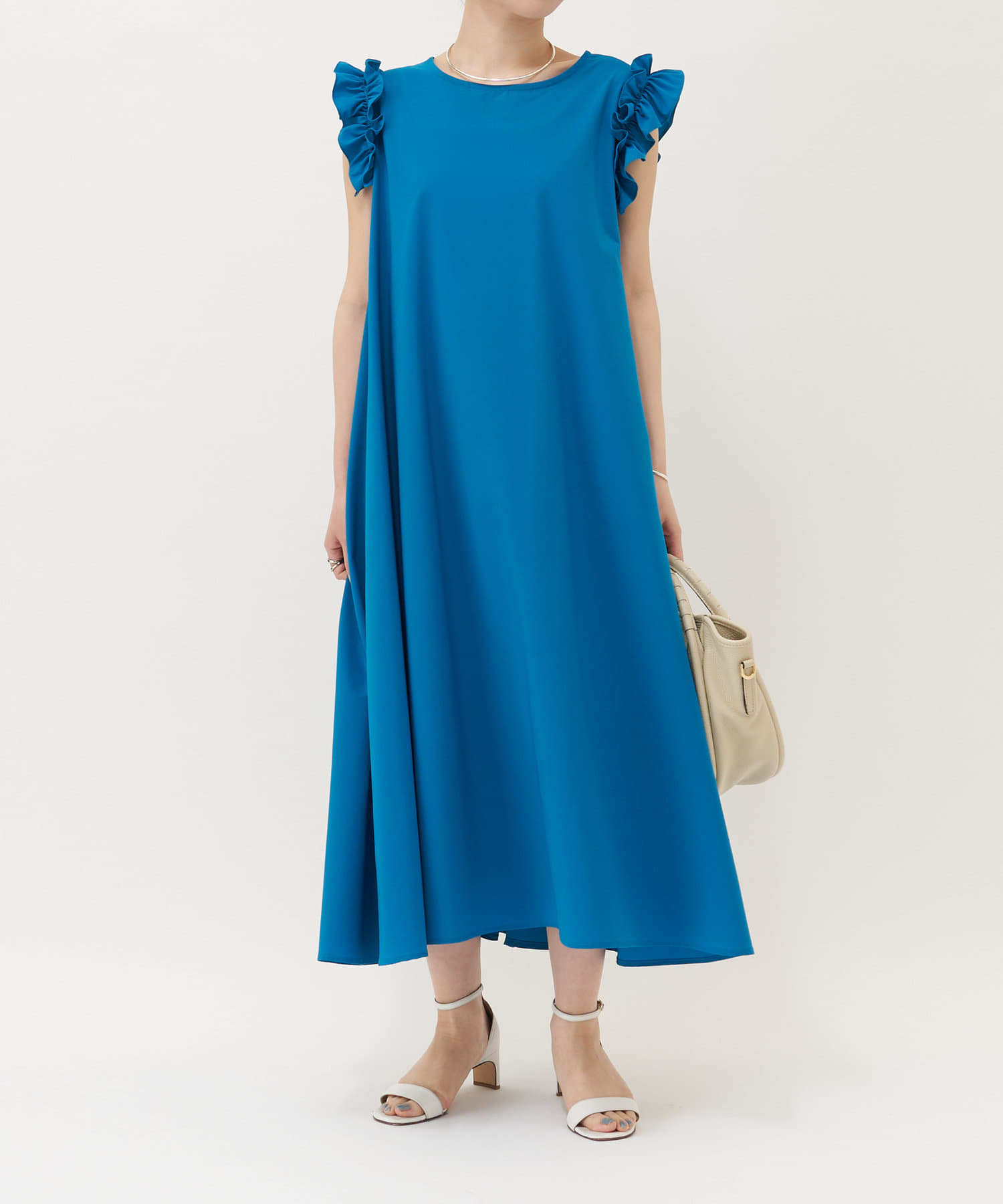 ノースリーブで肩にかかるデザインですが、腕が気になる方はサラッとカーデを肩掛けするのもおすすめ。