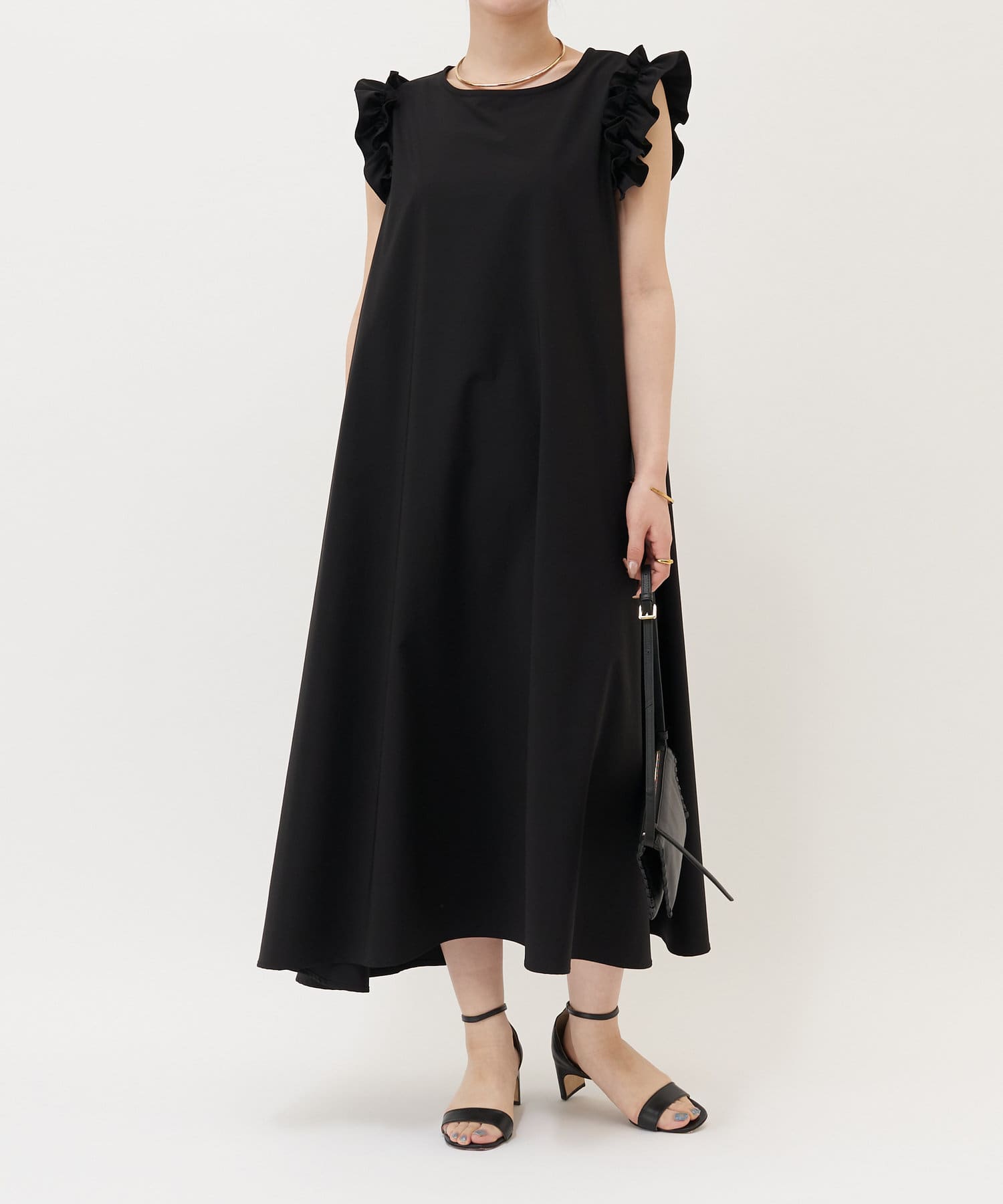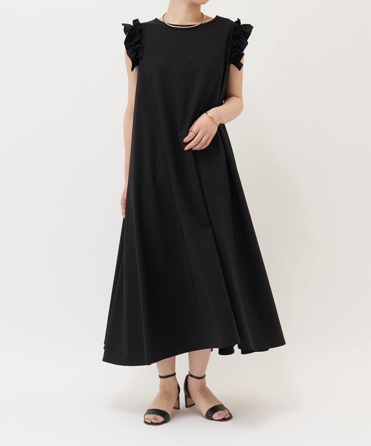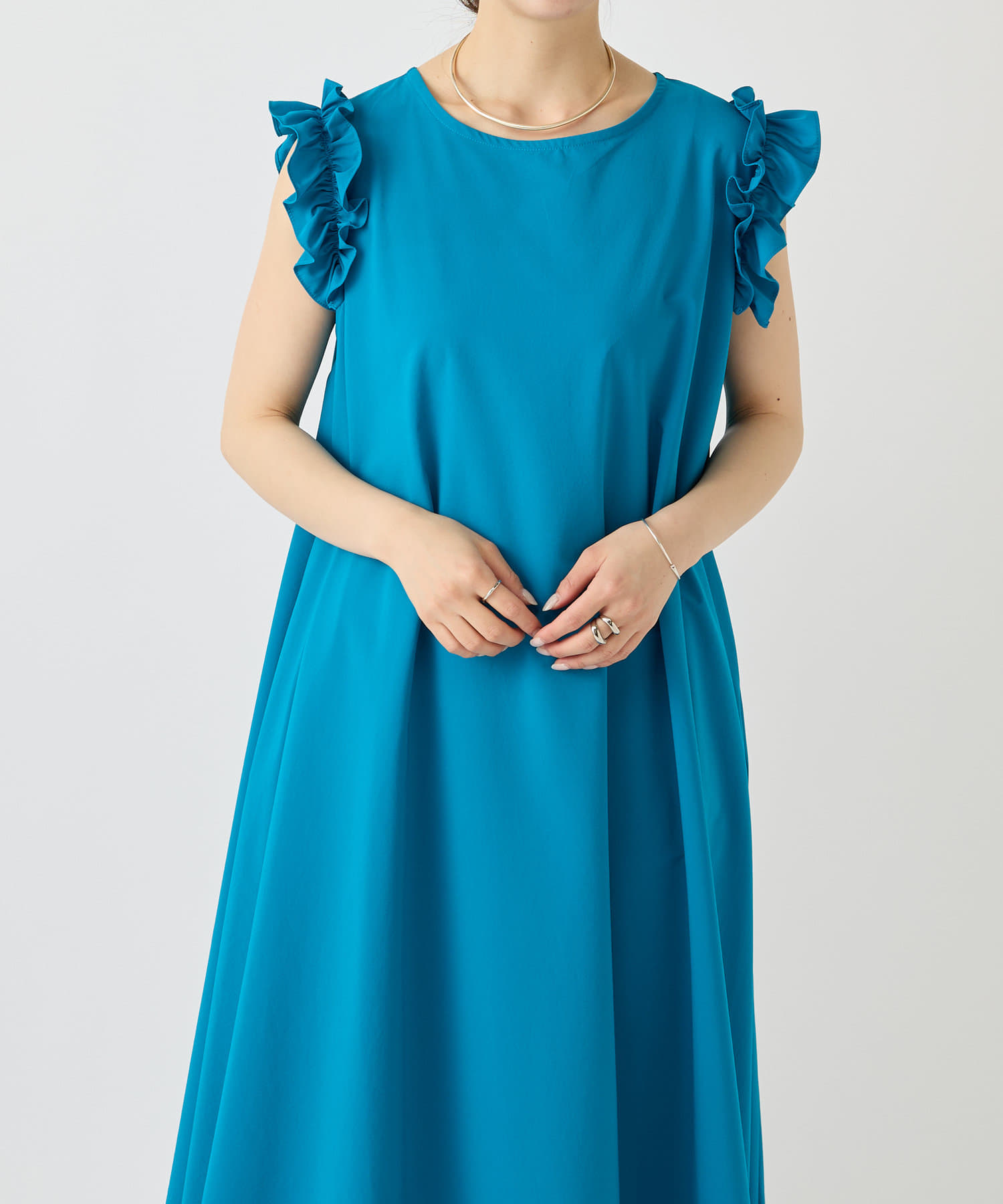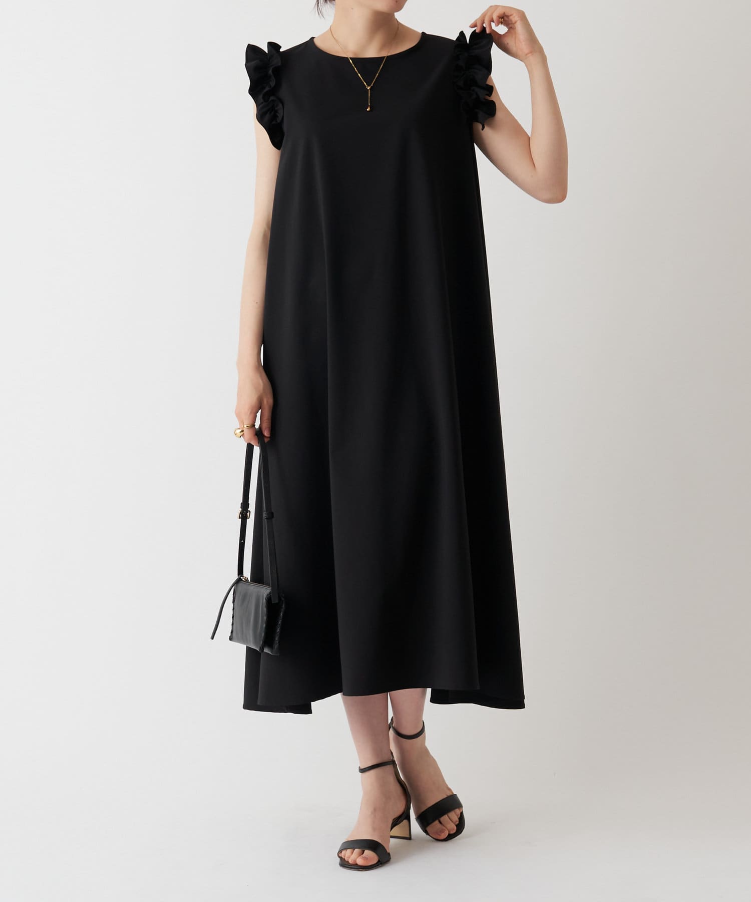 ノースリーブで肩にかかるデザインですが、腕が気になる方はサラッとカーデを肩掛けするのもおすすめ。