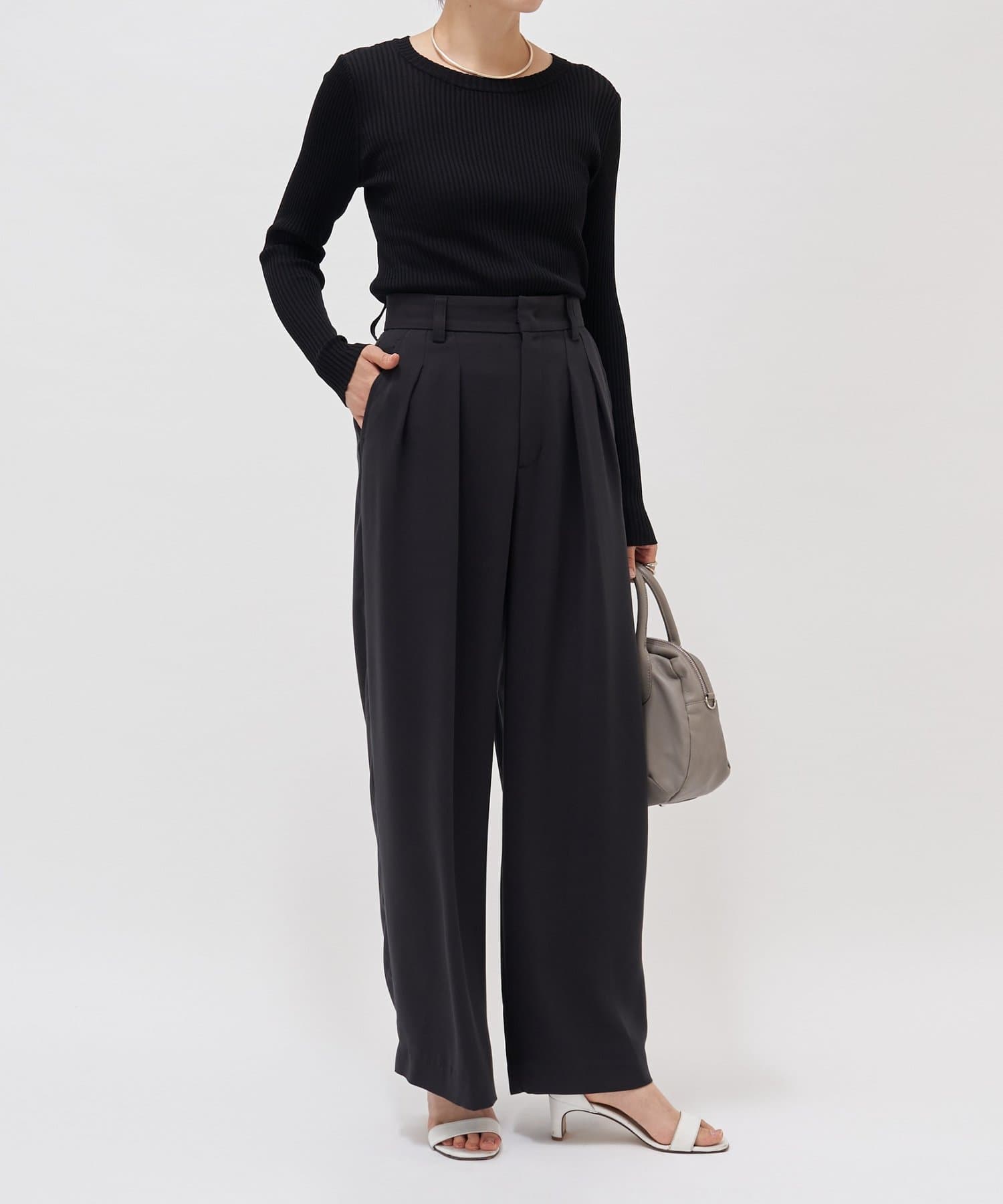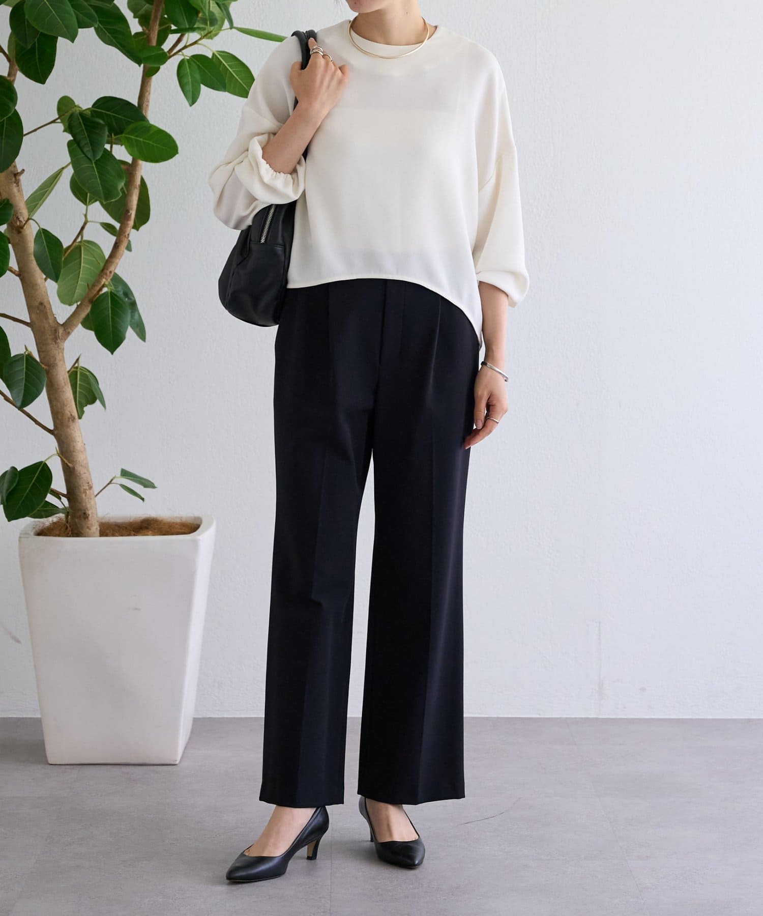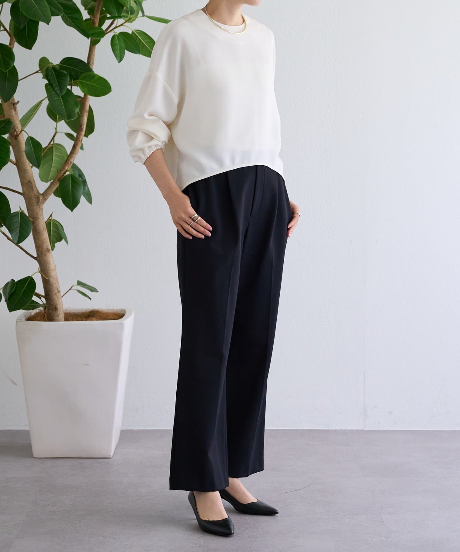 しなやかな生地が動くたびに美しいドレープを描き、きちんと感がありながらも快適な履き心地。