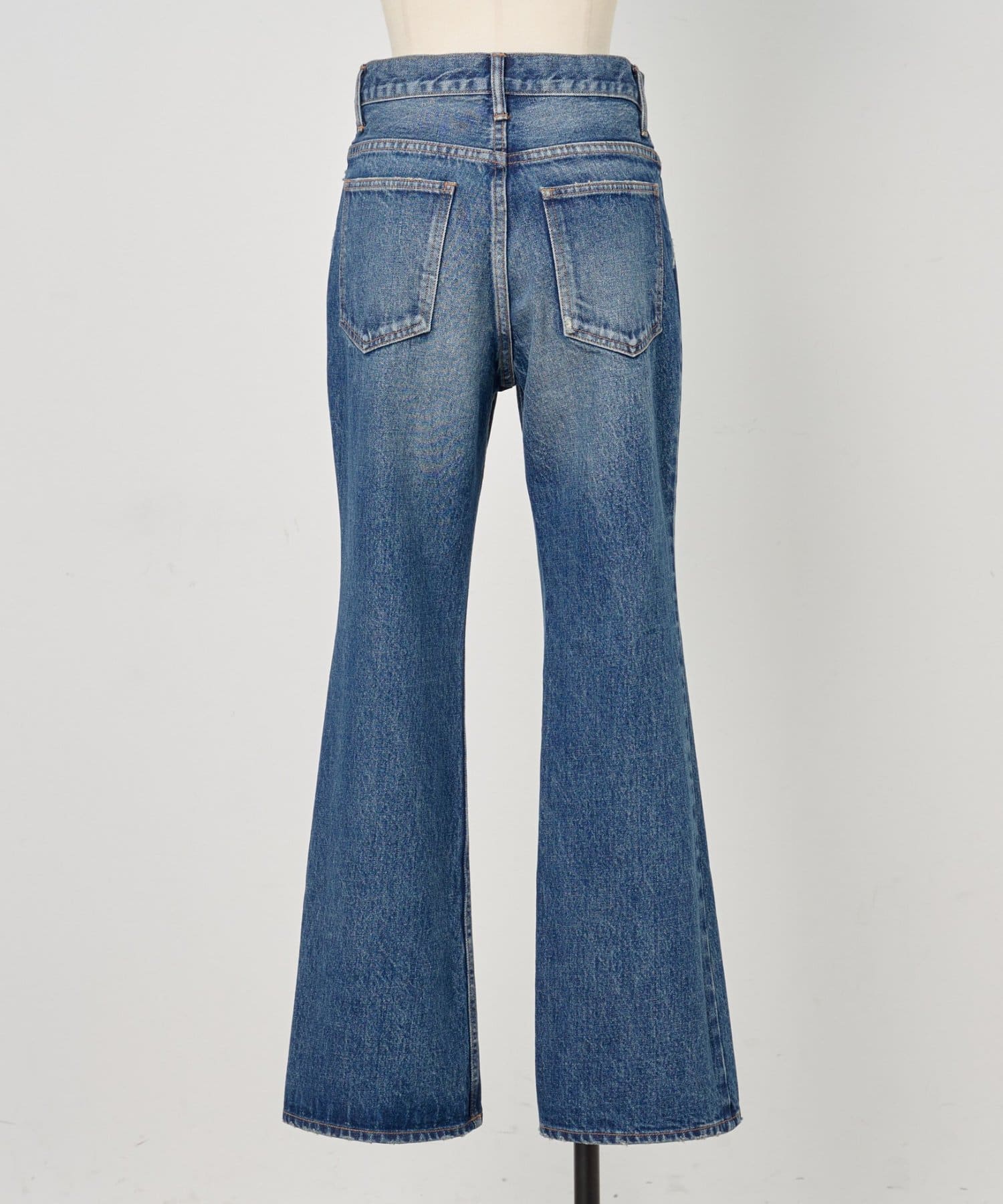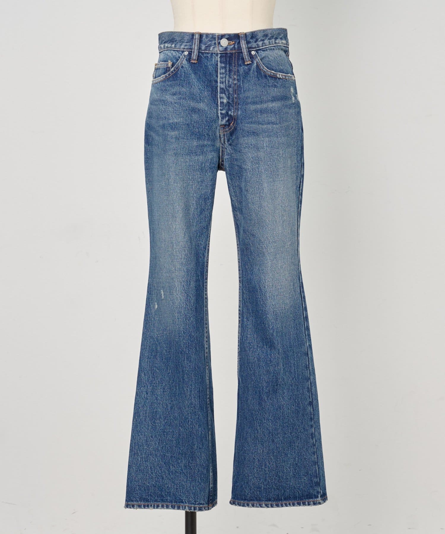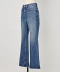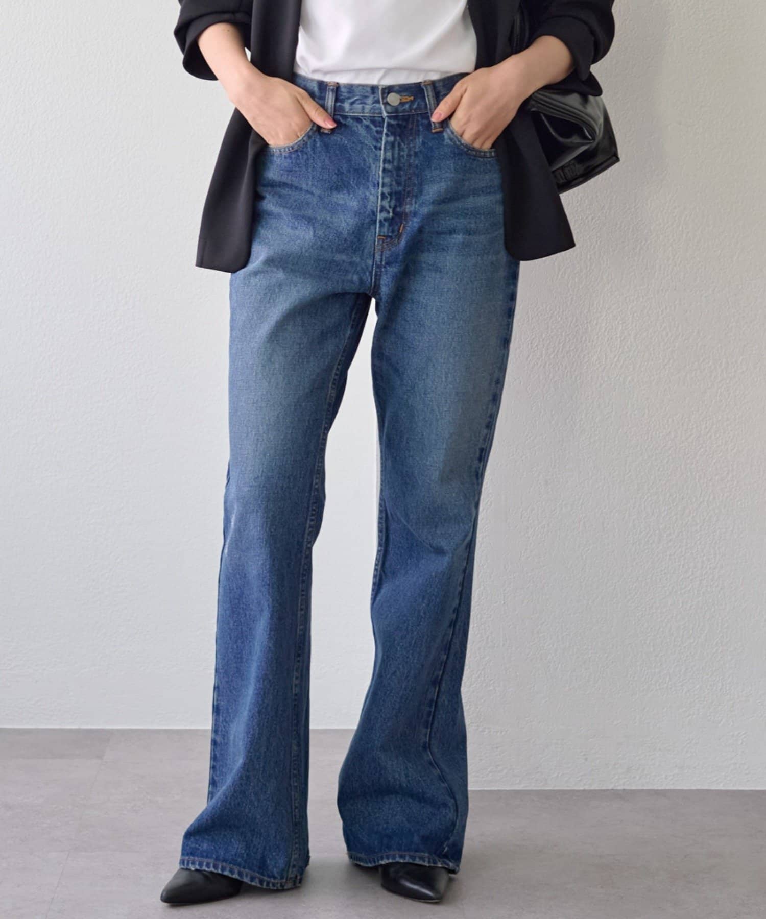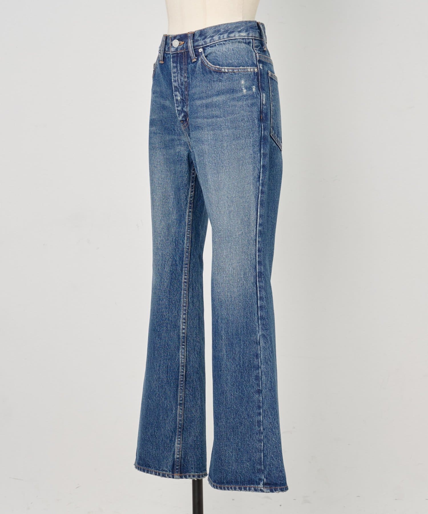 ダメージ加工を施した、脚のラインをすっきり見せる細めのフレアジーンズ。