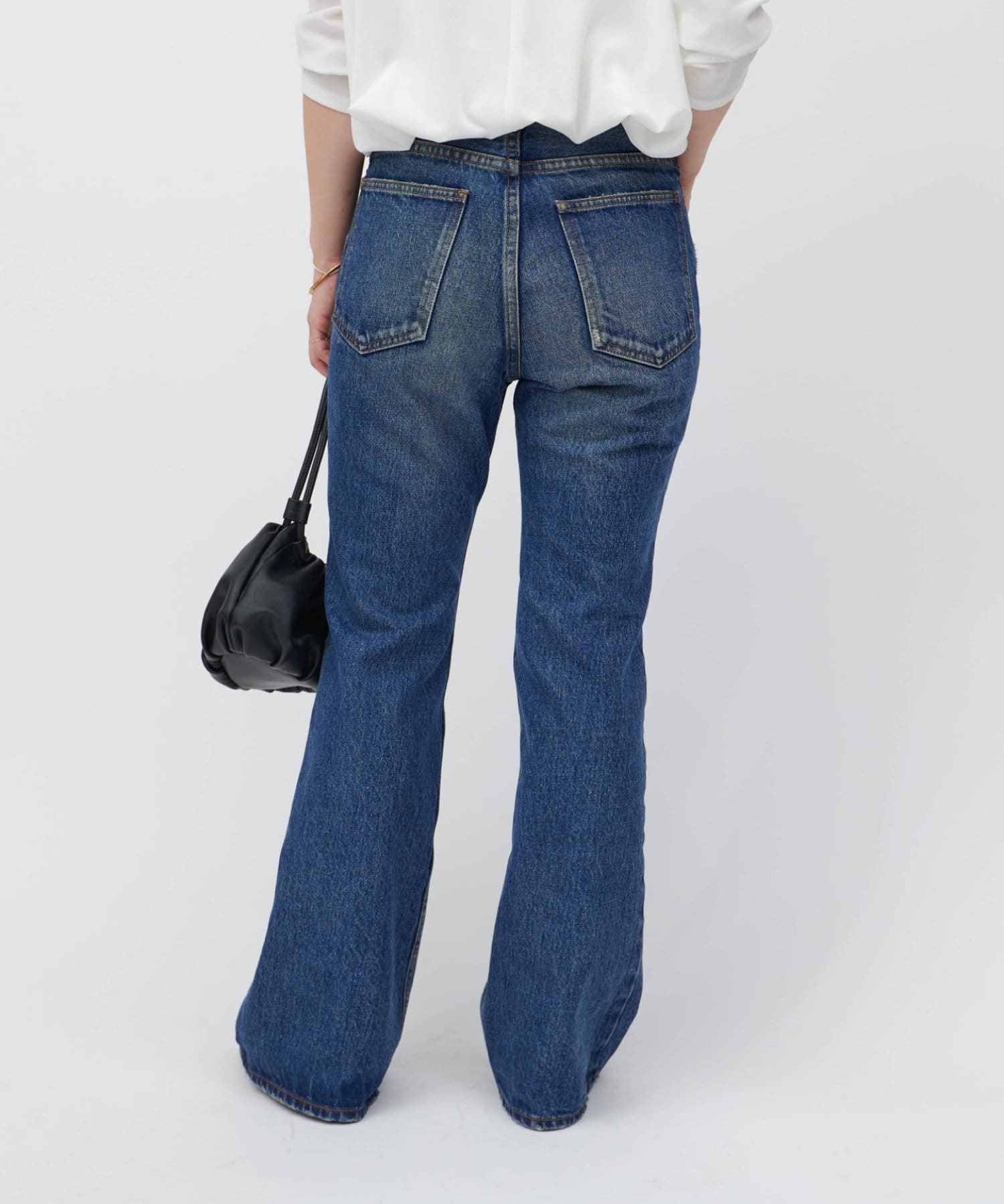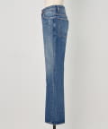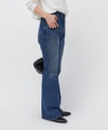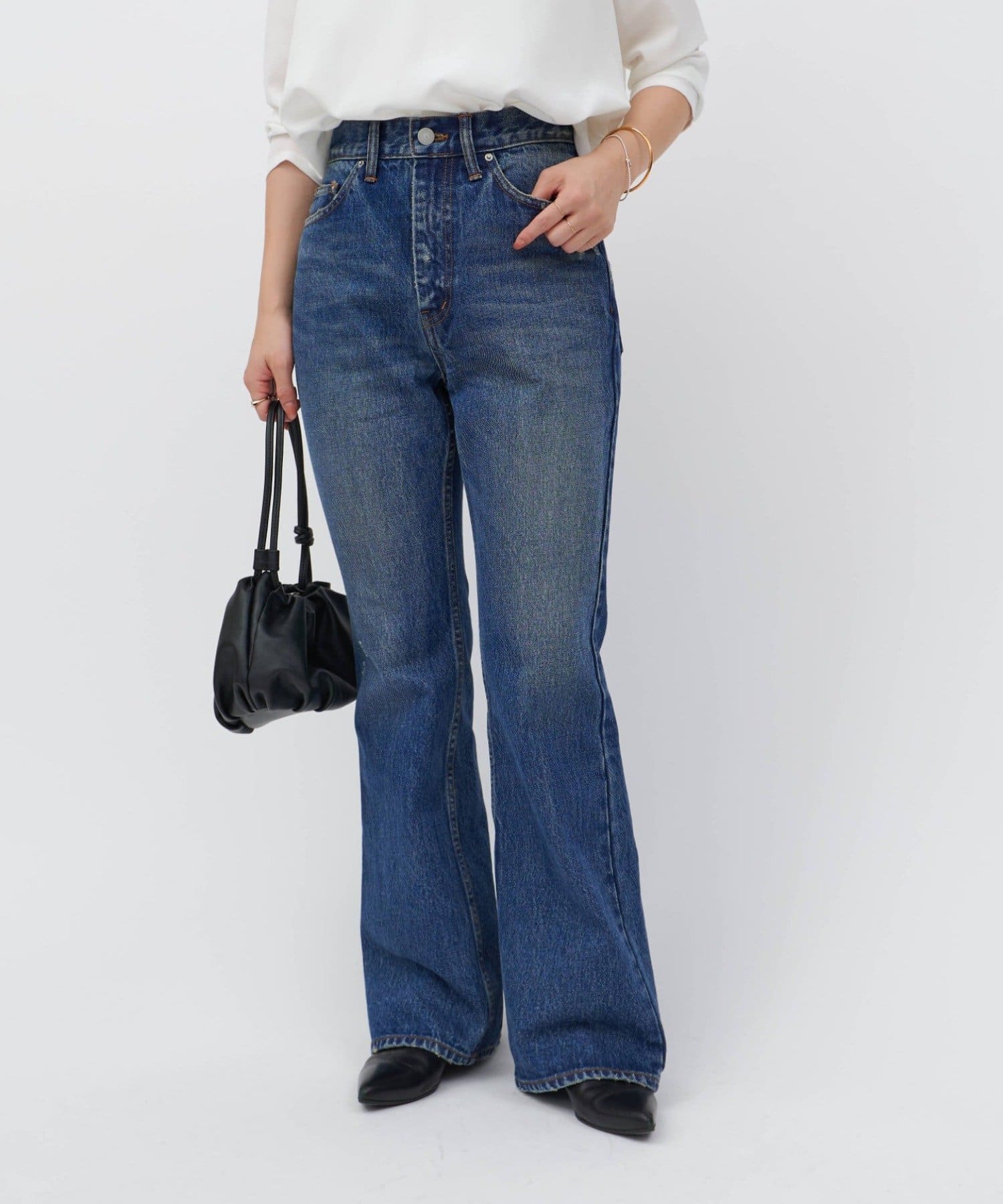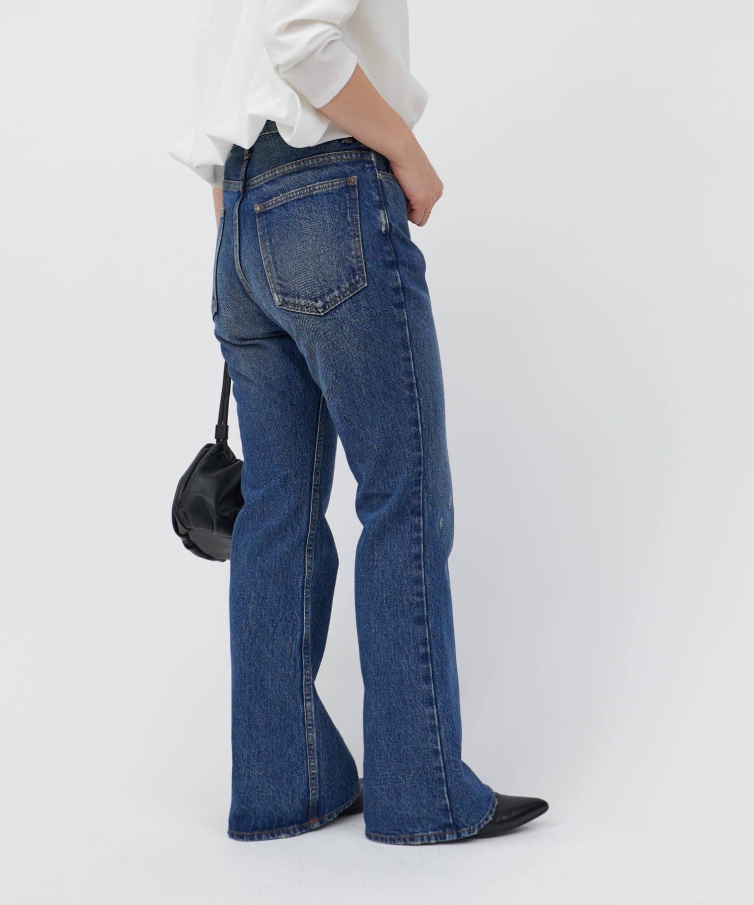 ダメージ加工を施した、脚のラインをすっきり見せる細めのフレアジーンズ。