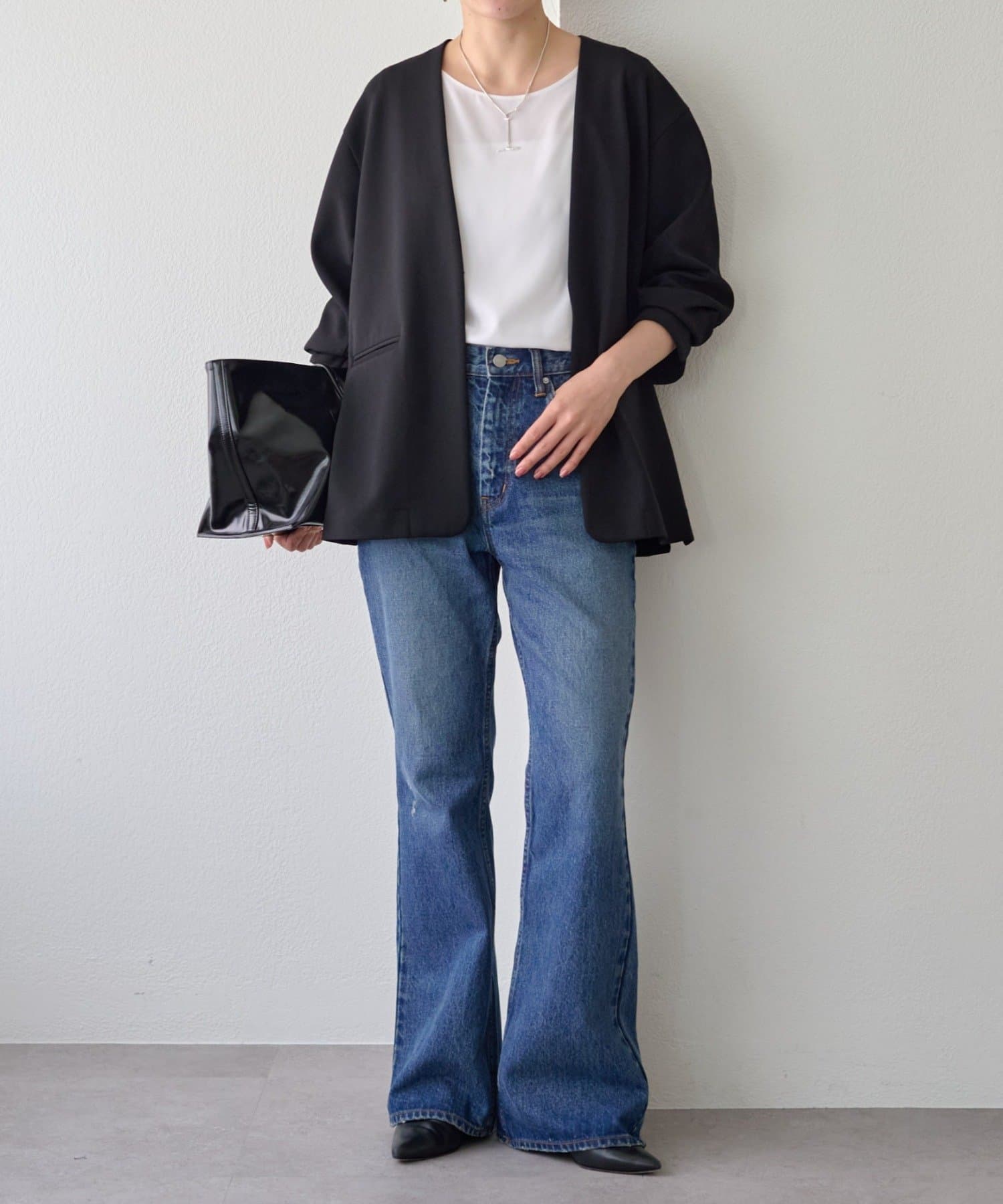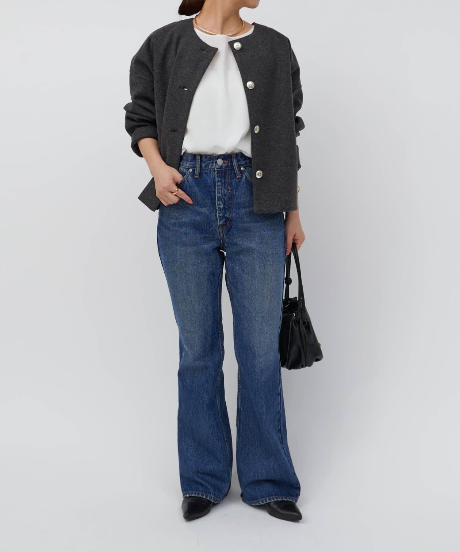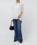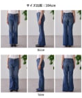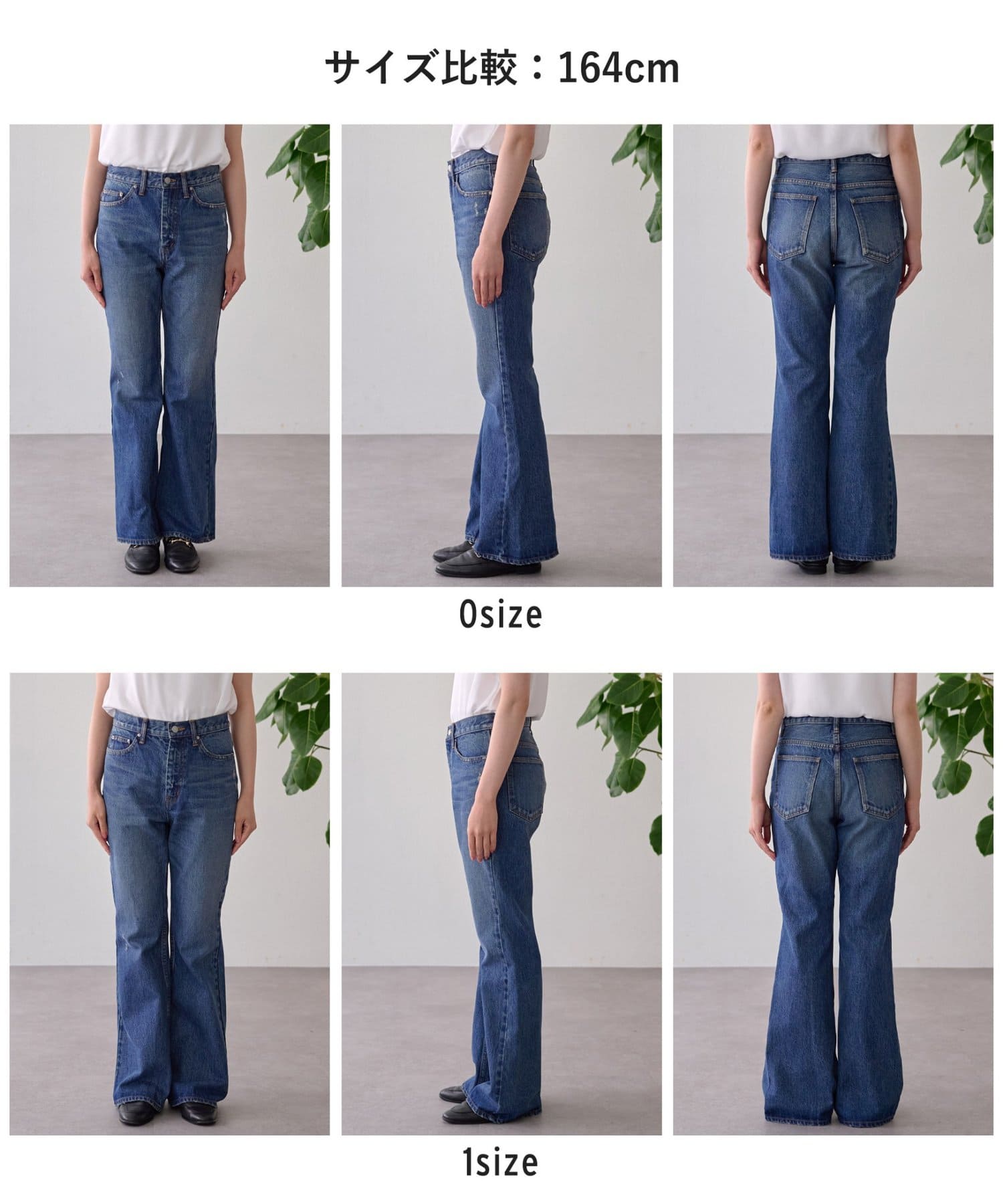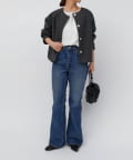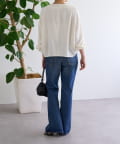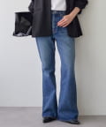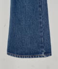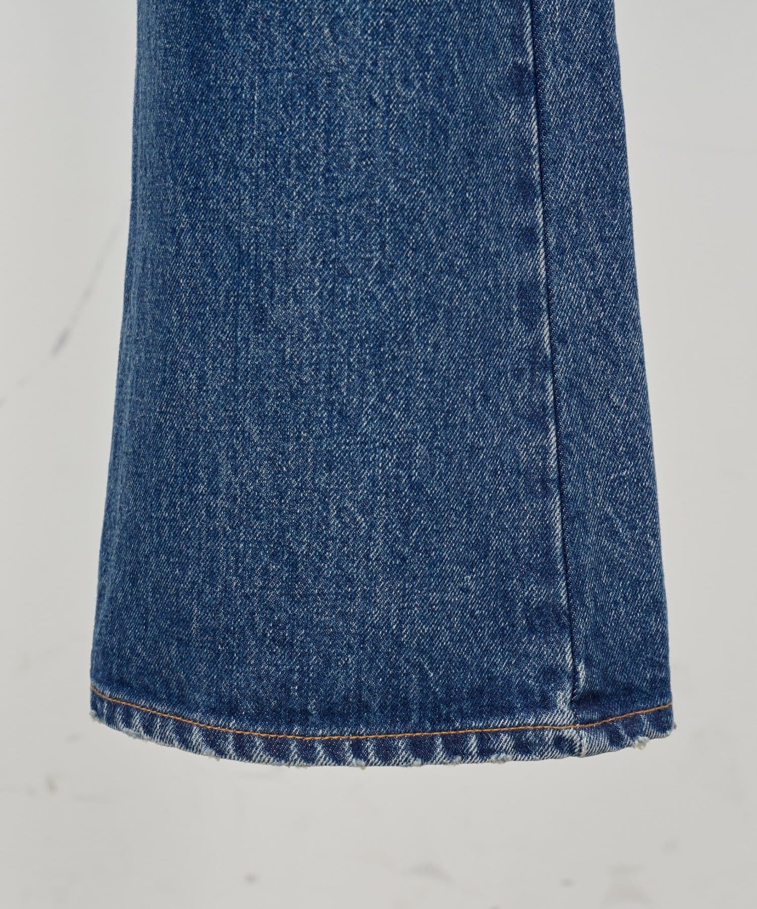 ダメージ加工を施した、脚のラインをすっきり見せる細めのフレアジーンズ。