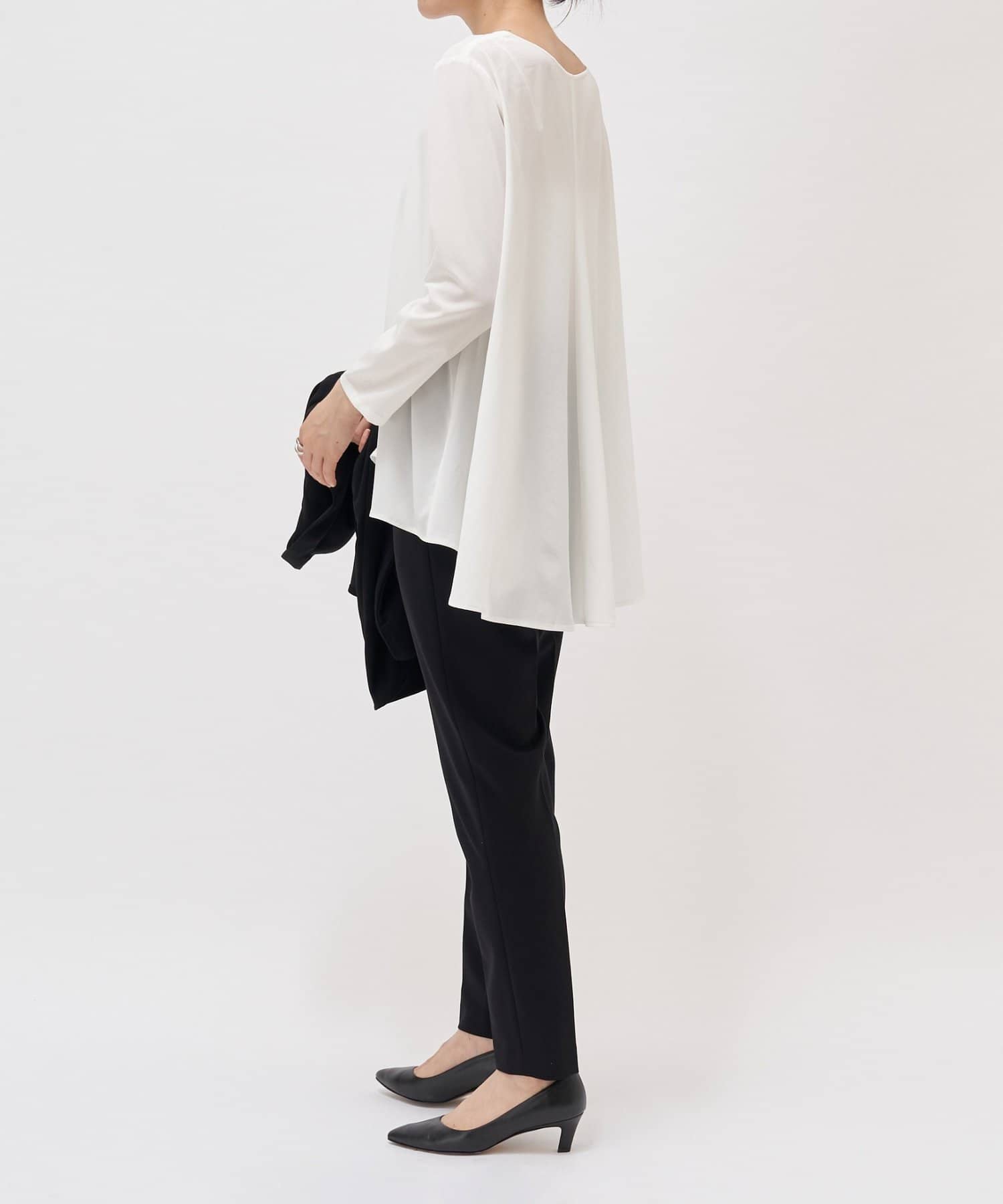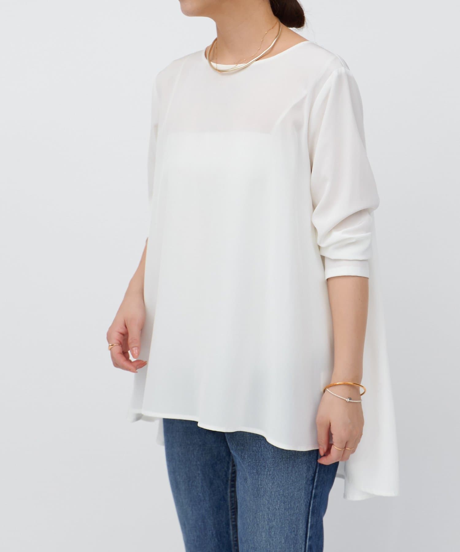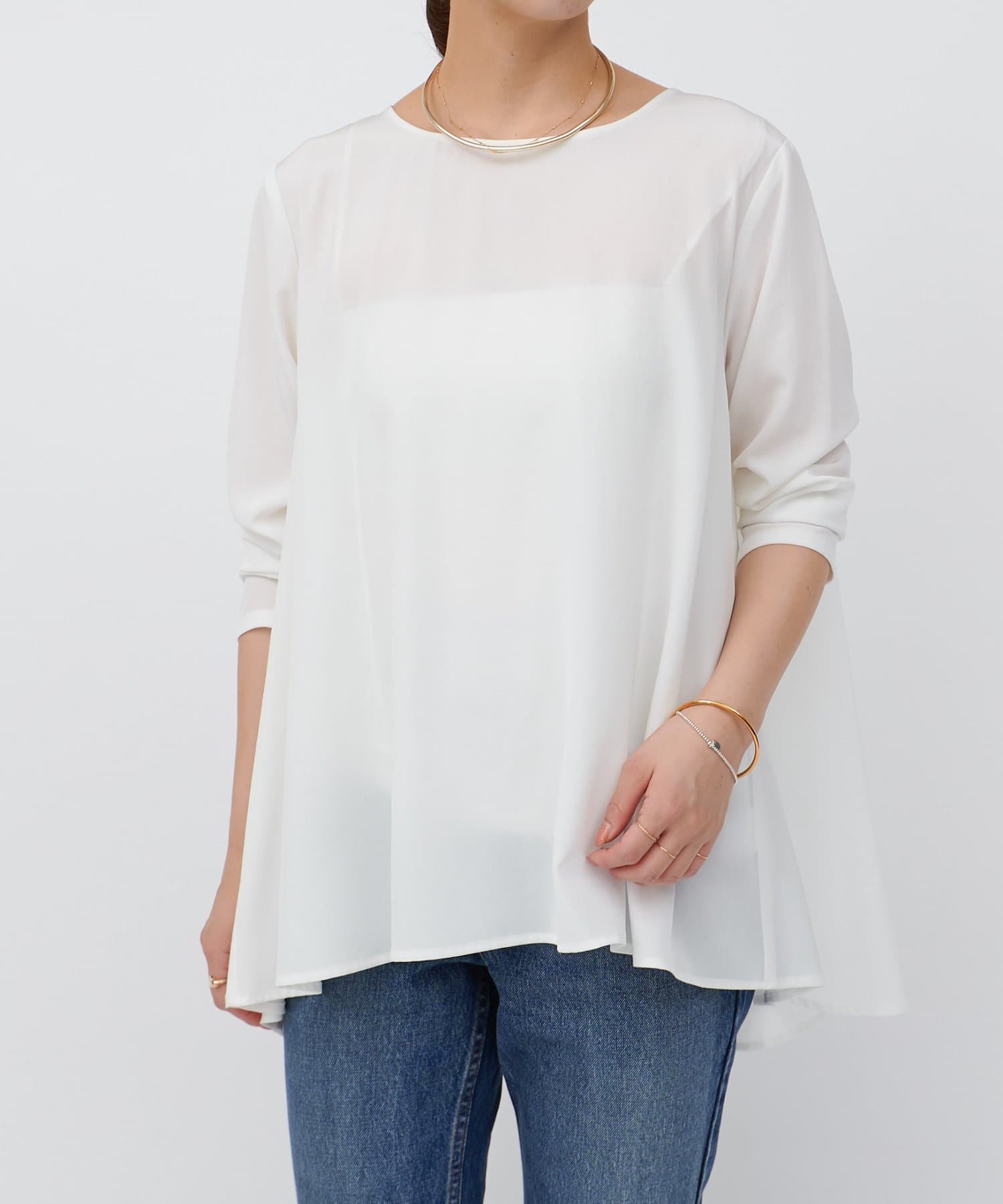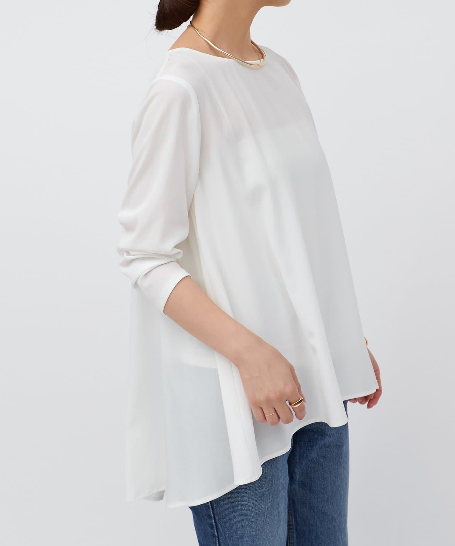 シンプルながら後ろフレアのシルエットがサマになるブラウス。