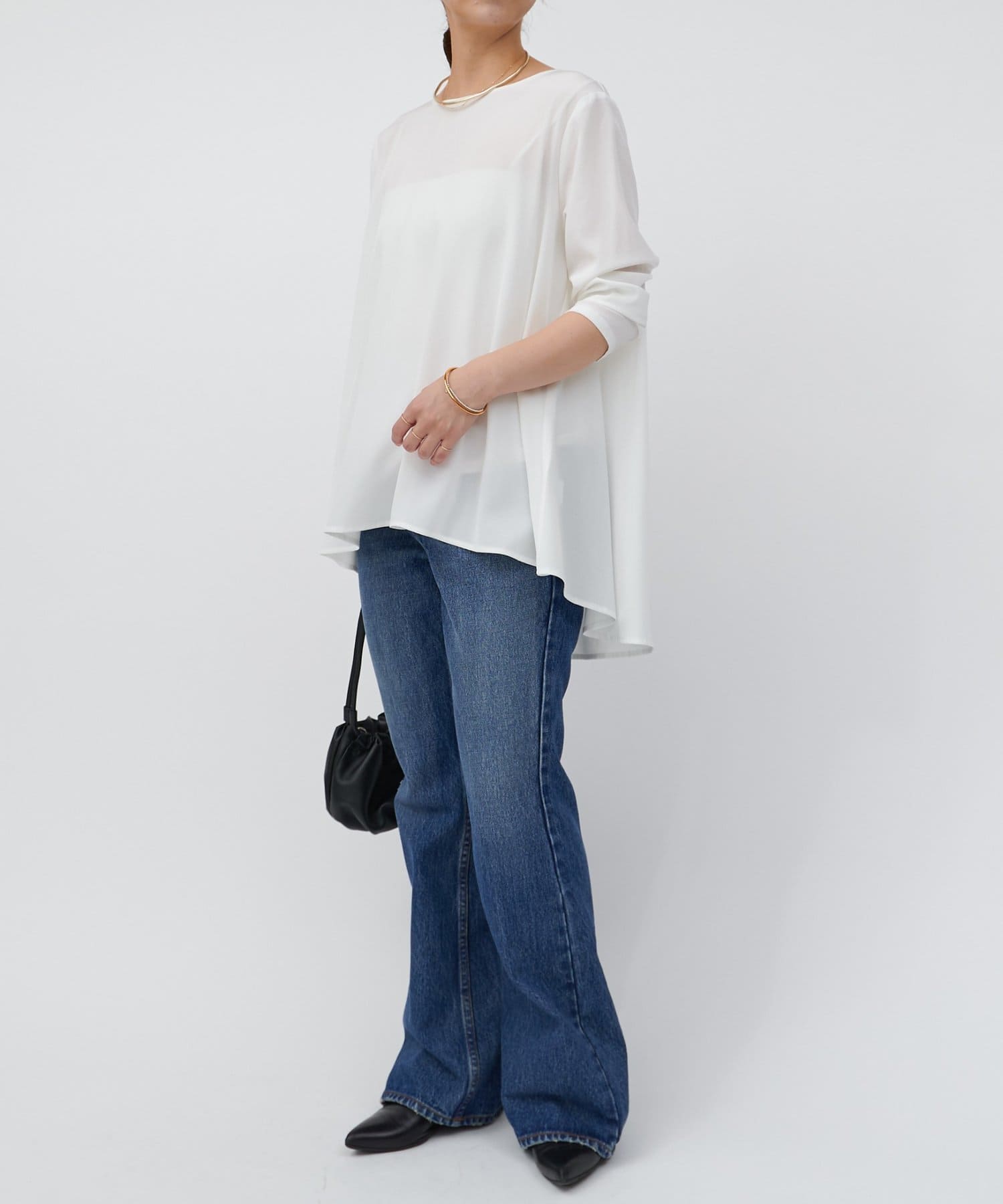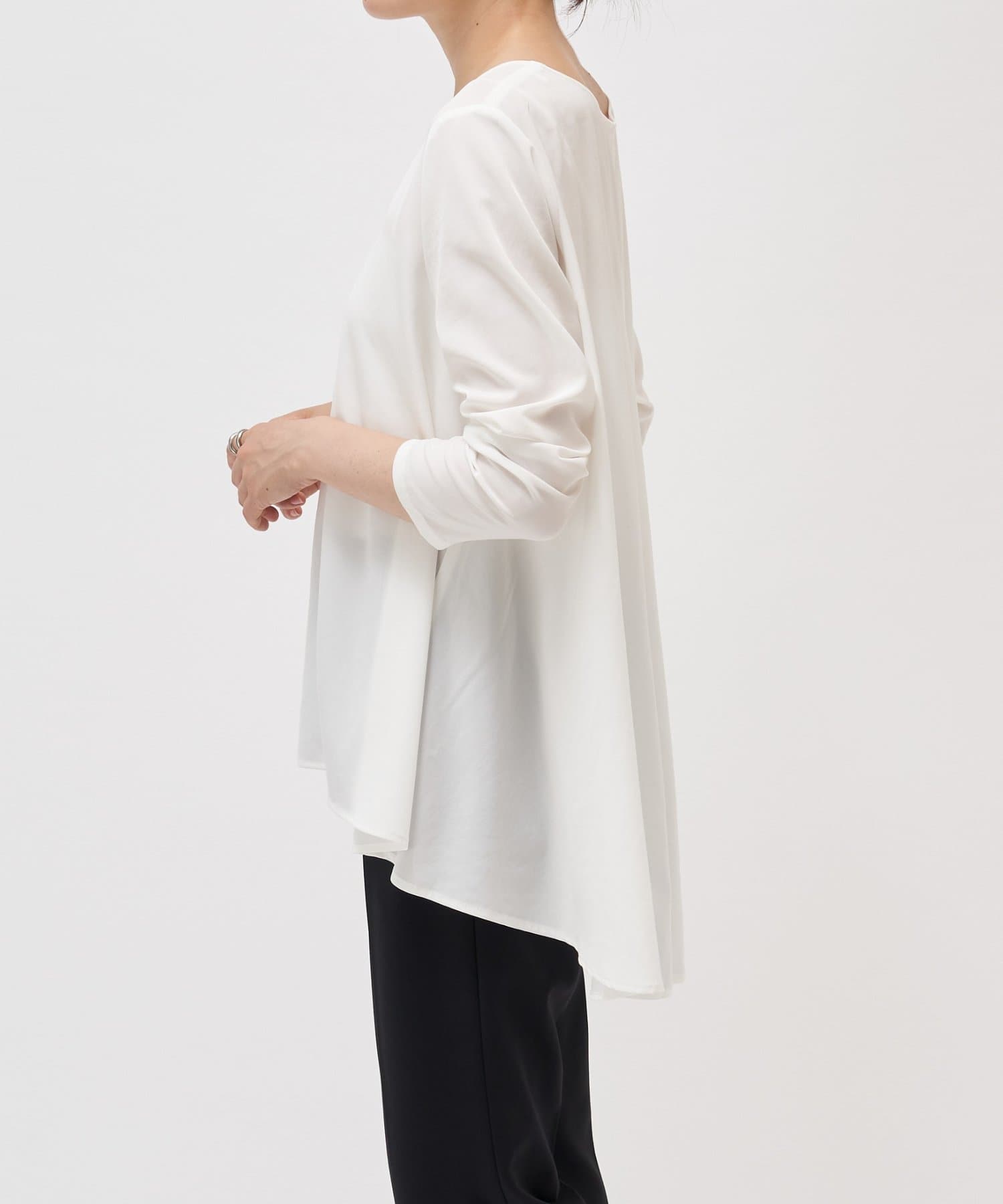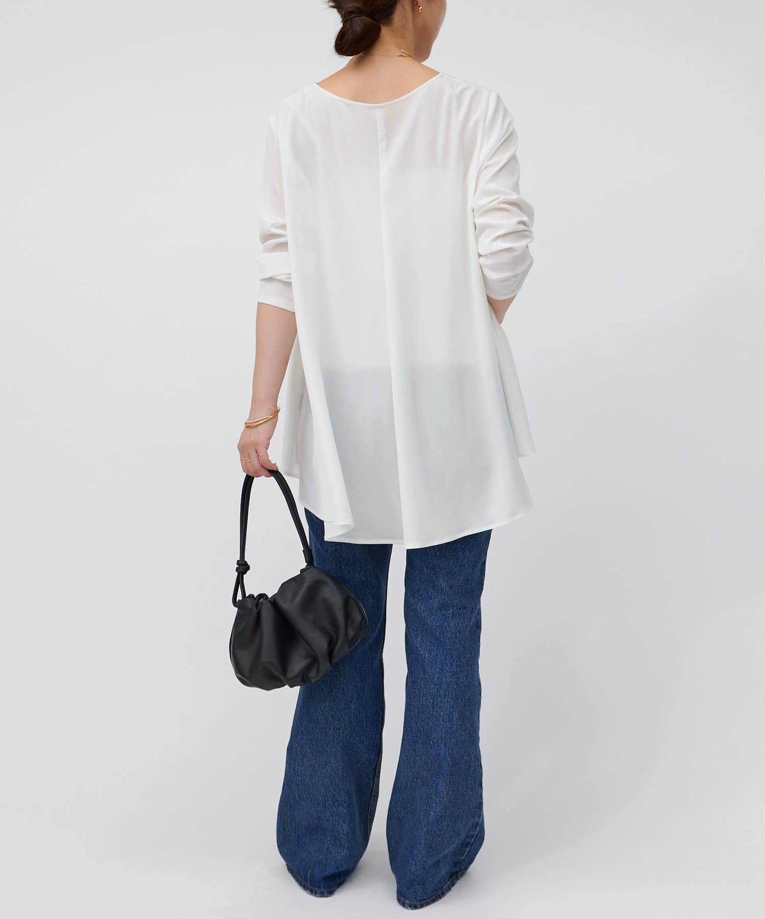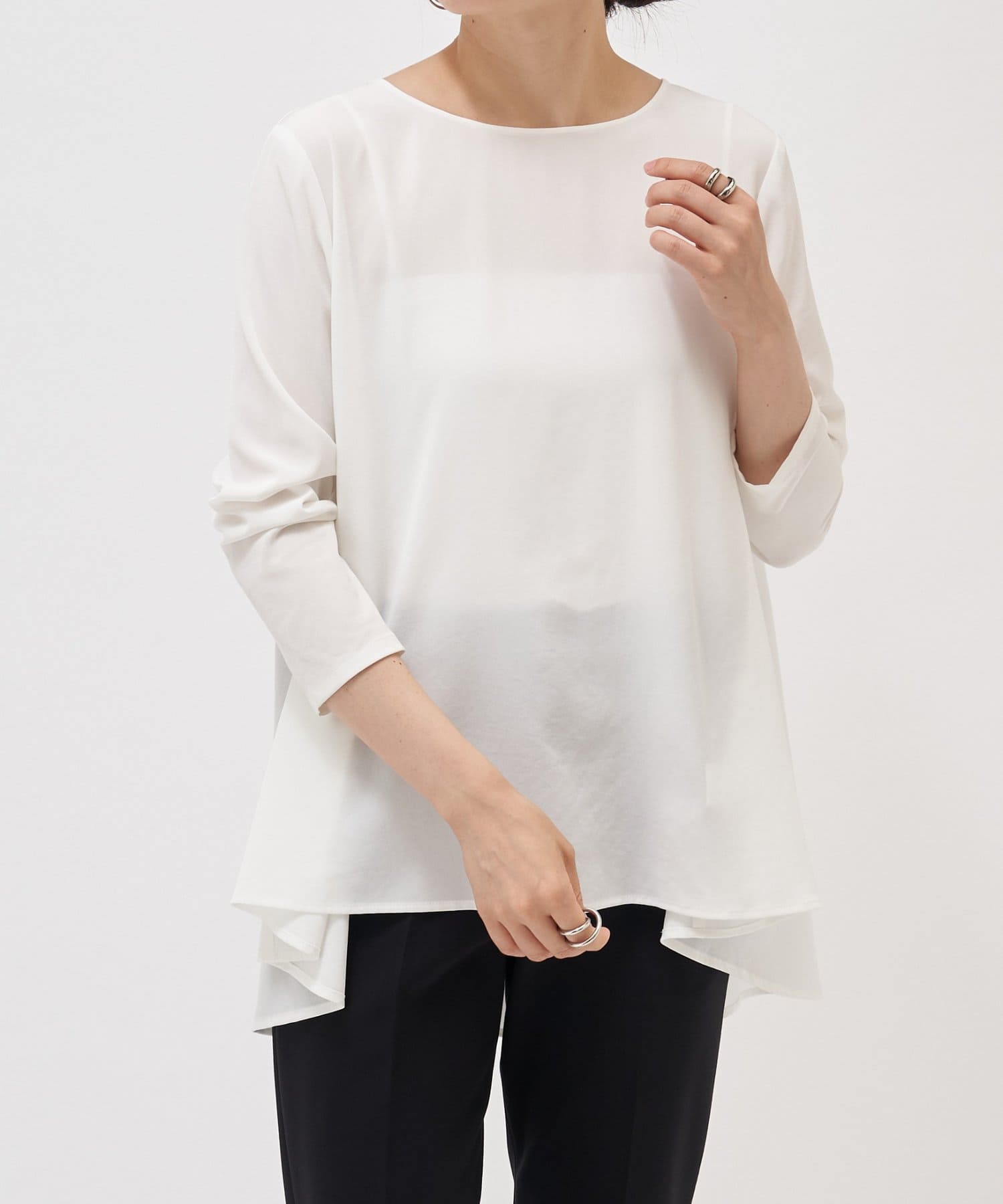 シンプルながら後ろフレアのシルエットがサマになるブラウス。
