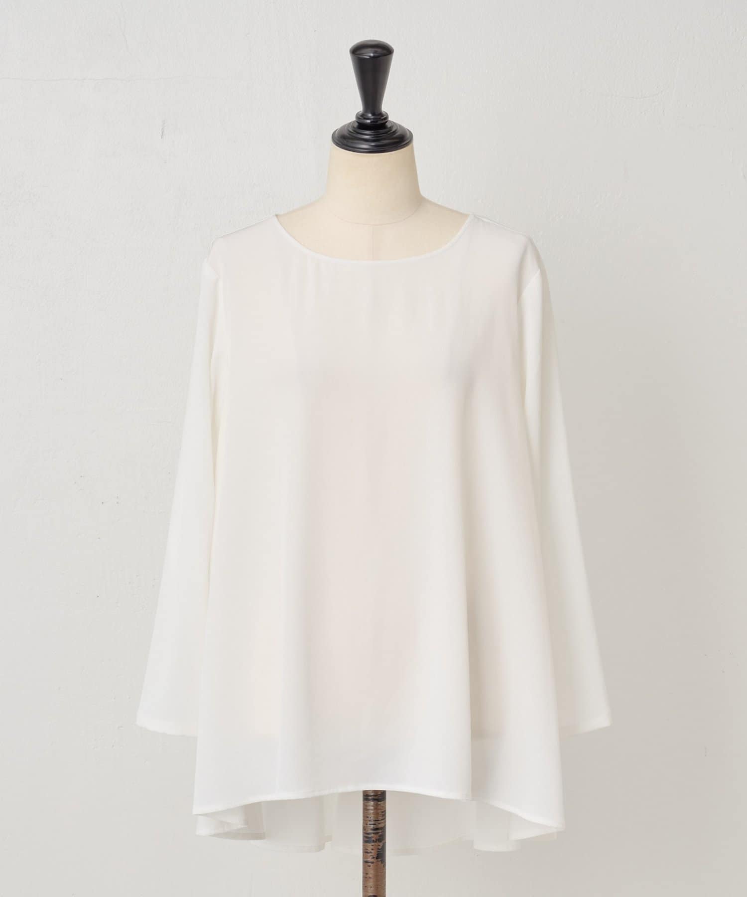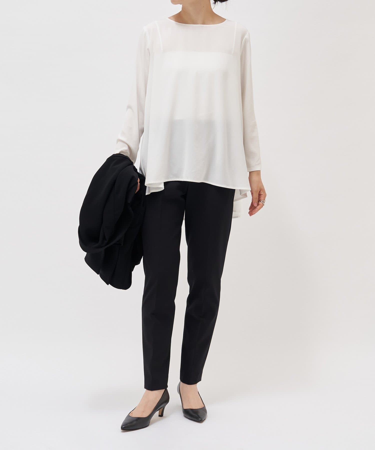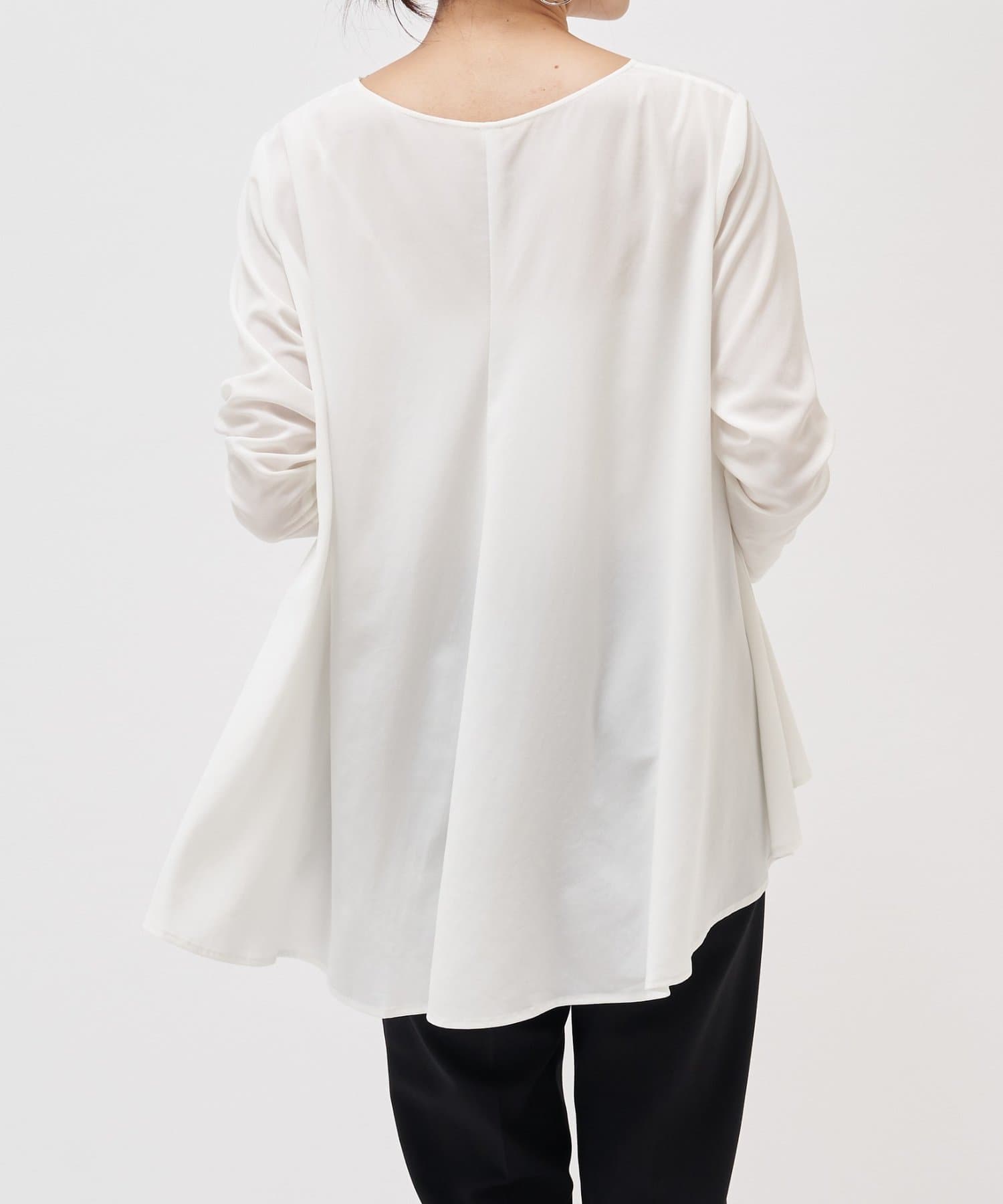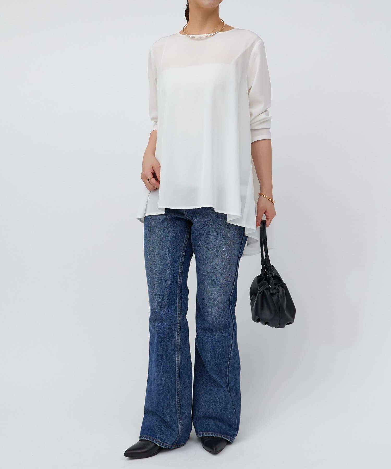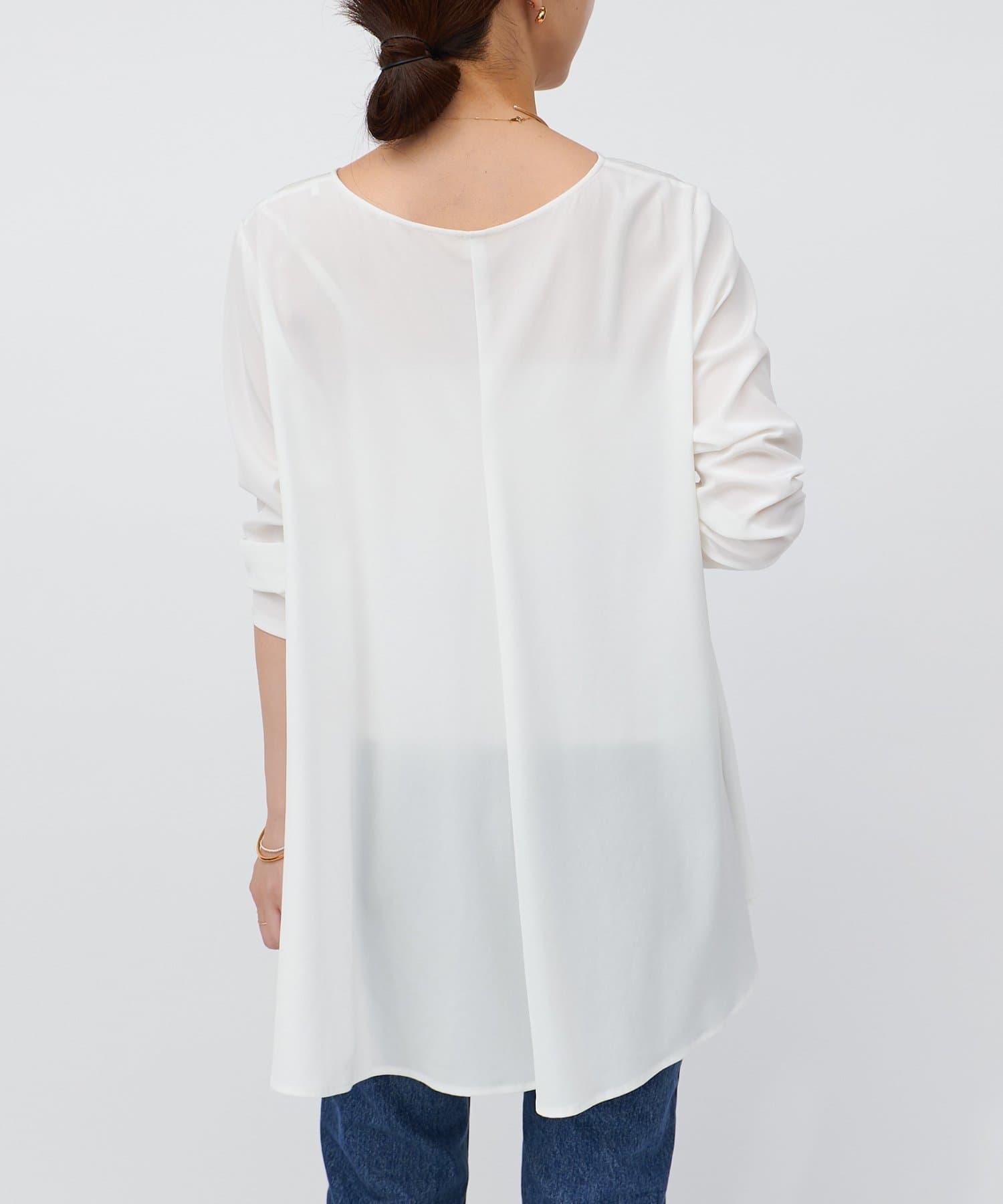 シンプルながら後ろフレアのシルエットがサマになるブラウス。