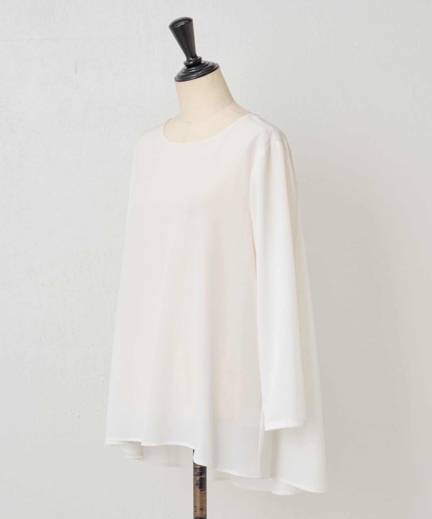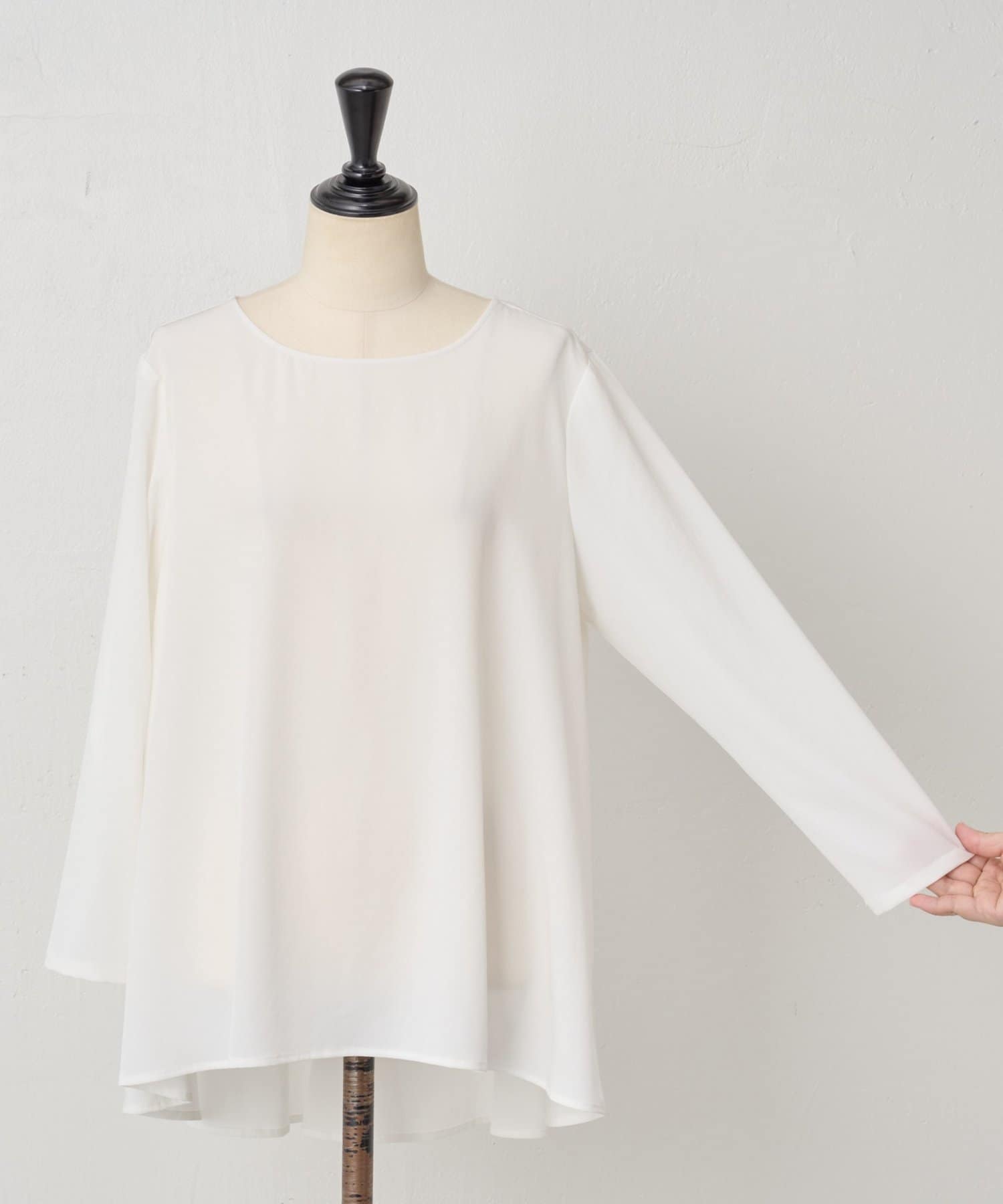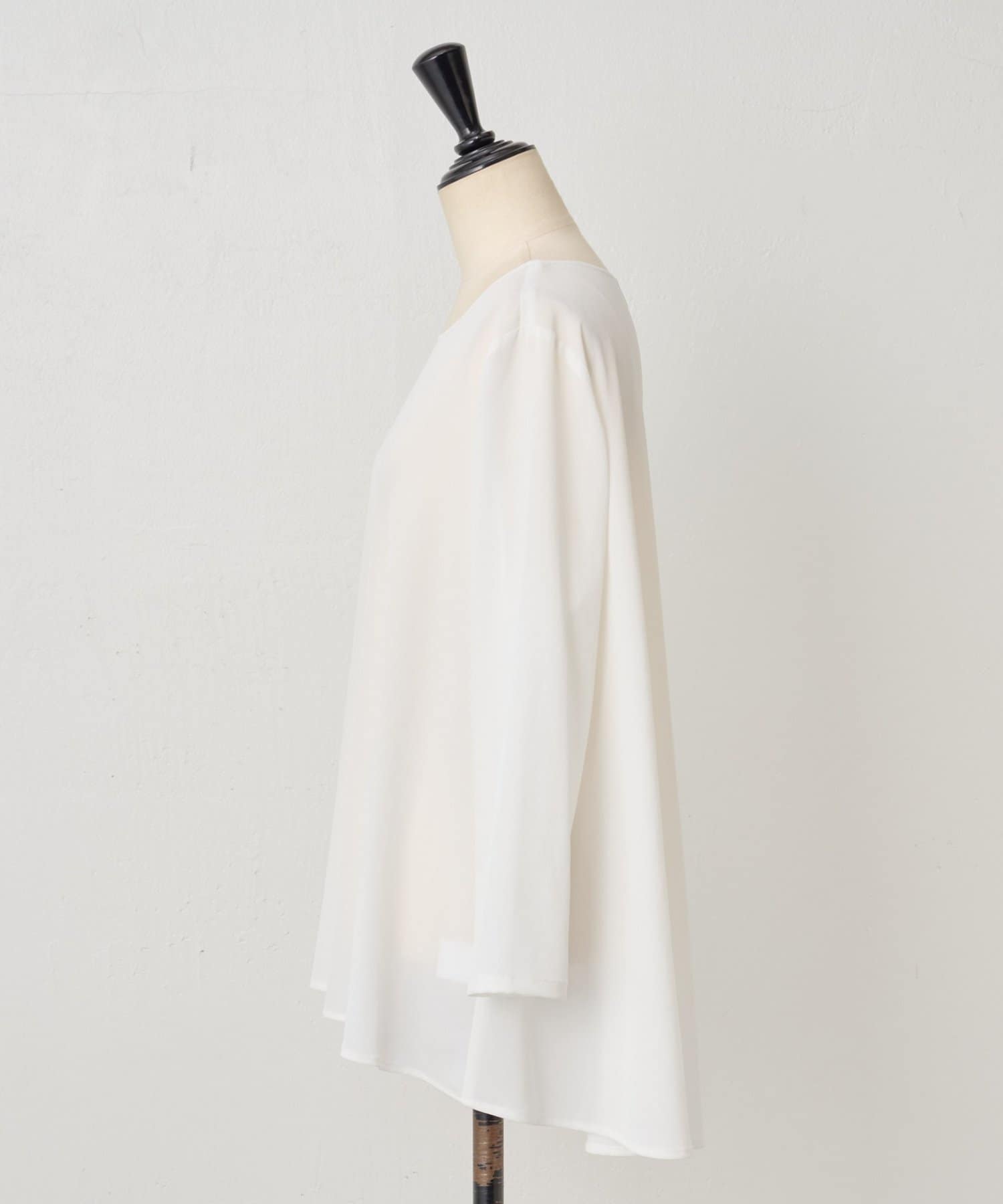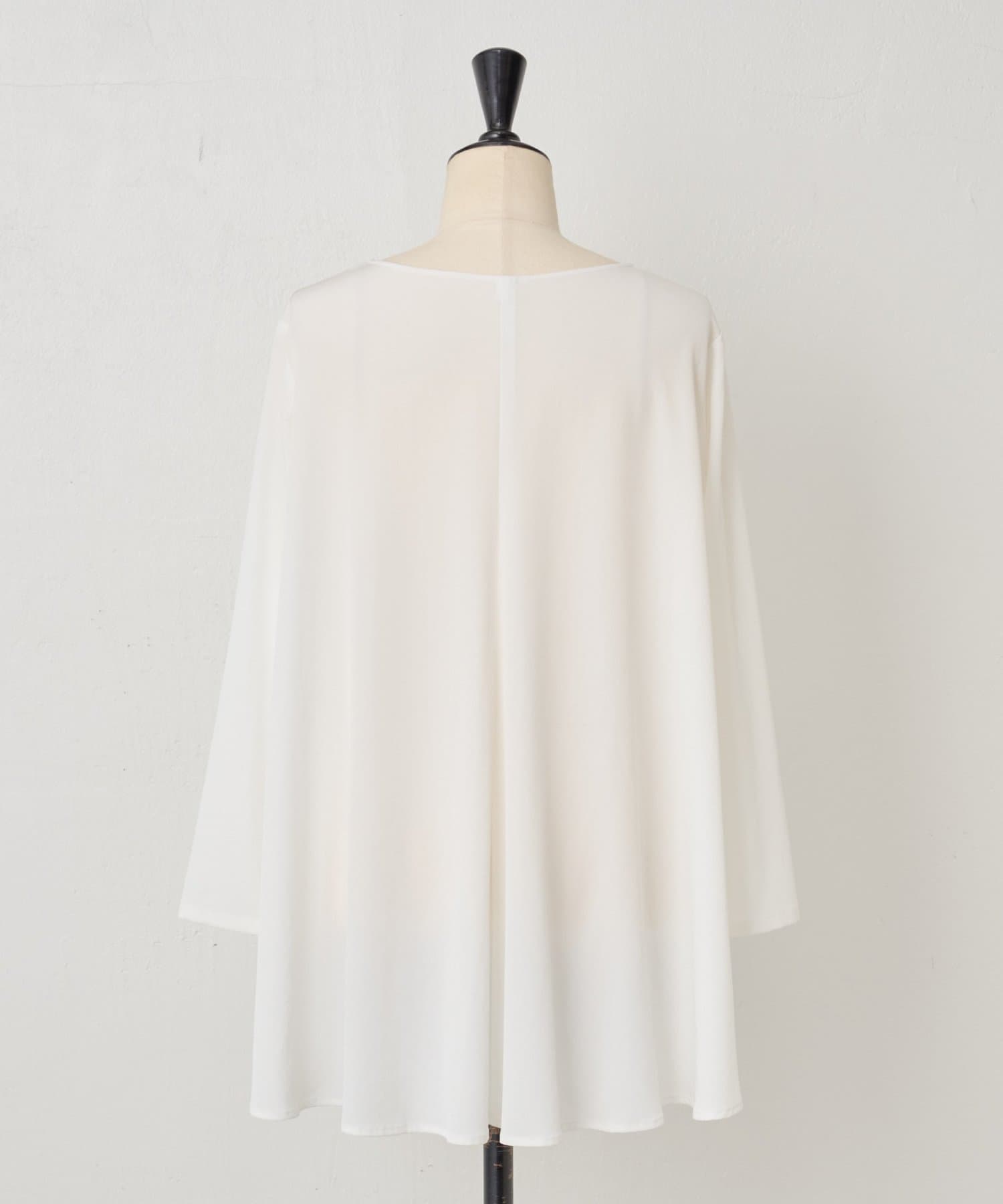 シンプルながら後ろフレアのシルエットがサマになるブラウス。
