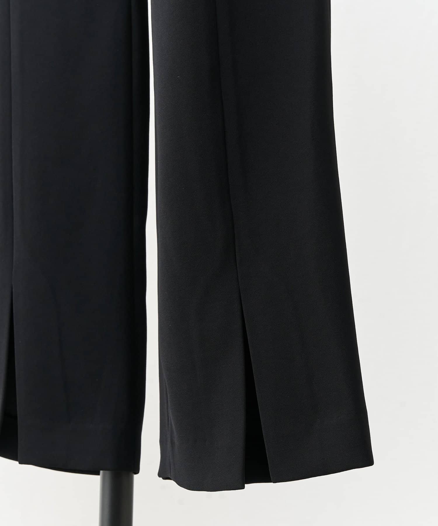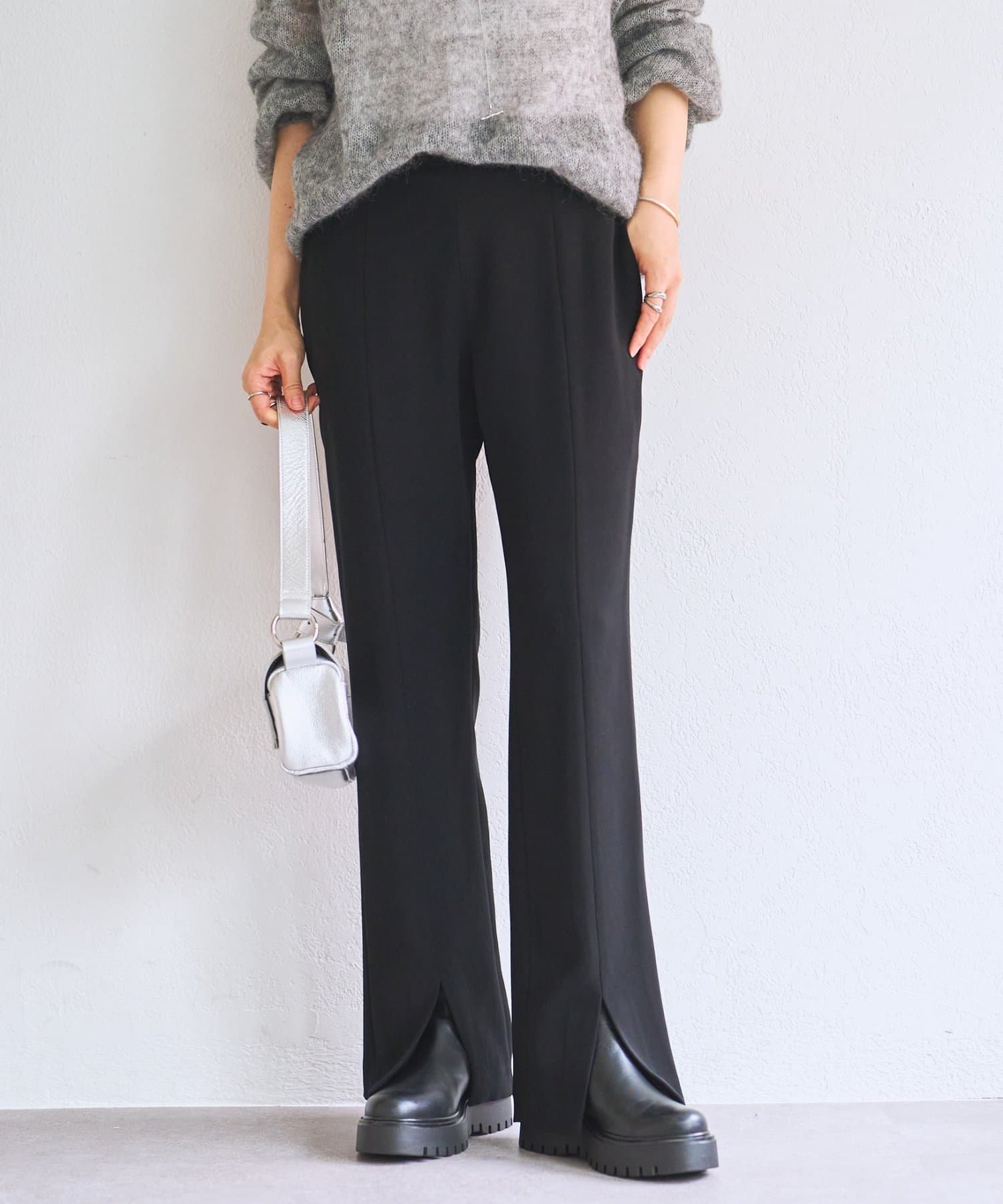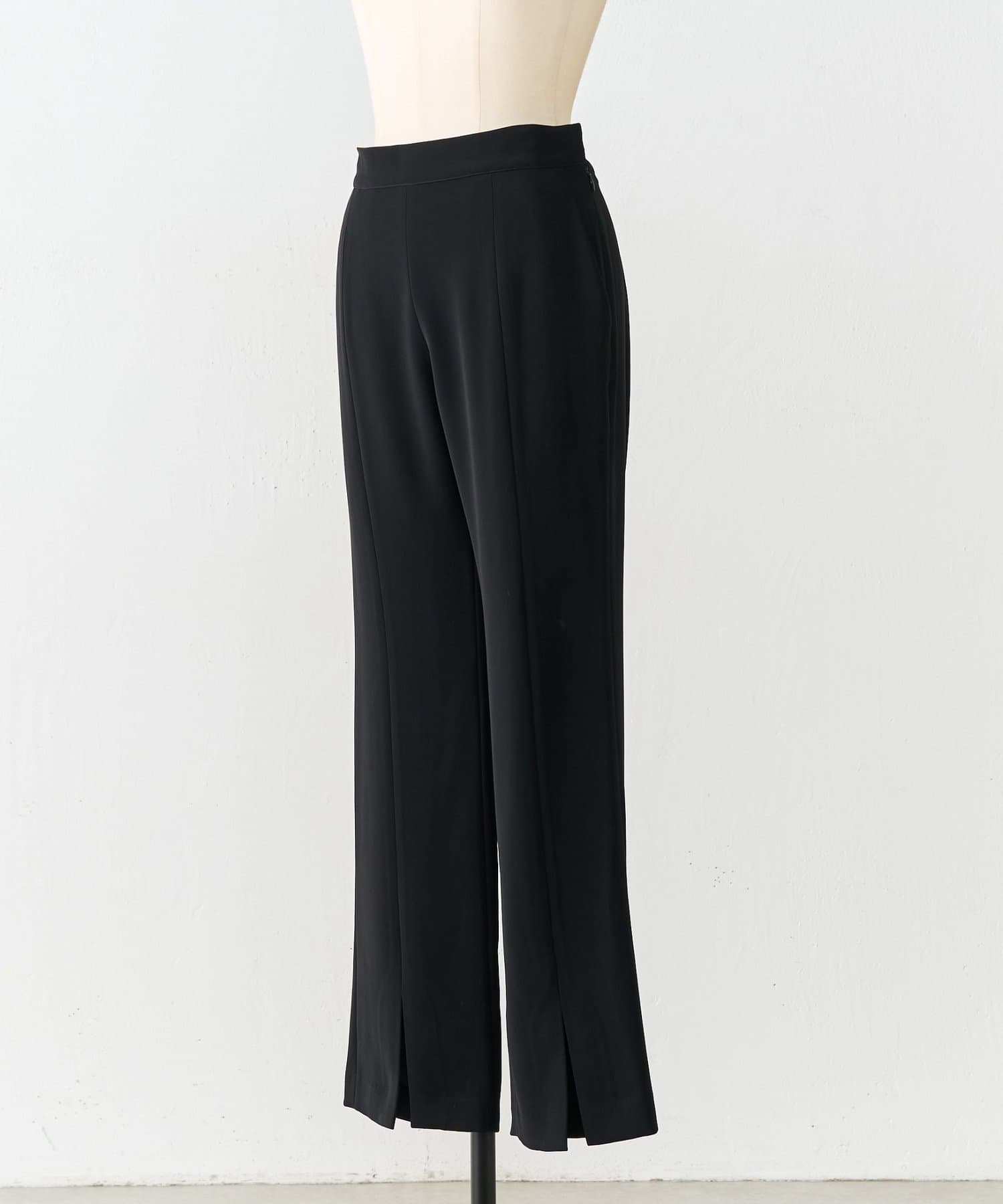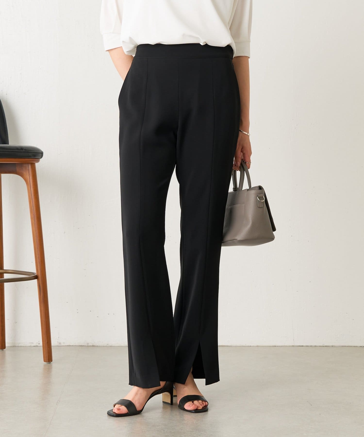 フロント部分はセンタープレスではなくセンターシーム(縫い目)を入れることできちんと感があり、裾のフロントスリットがデザインポイント。