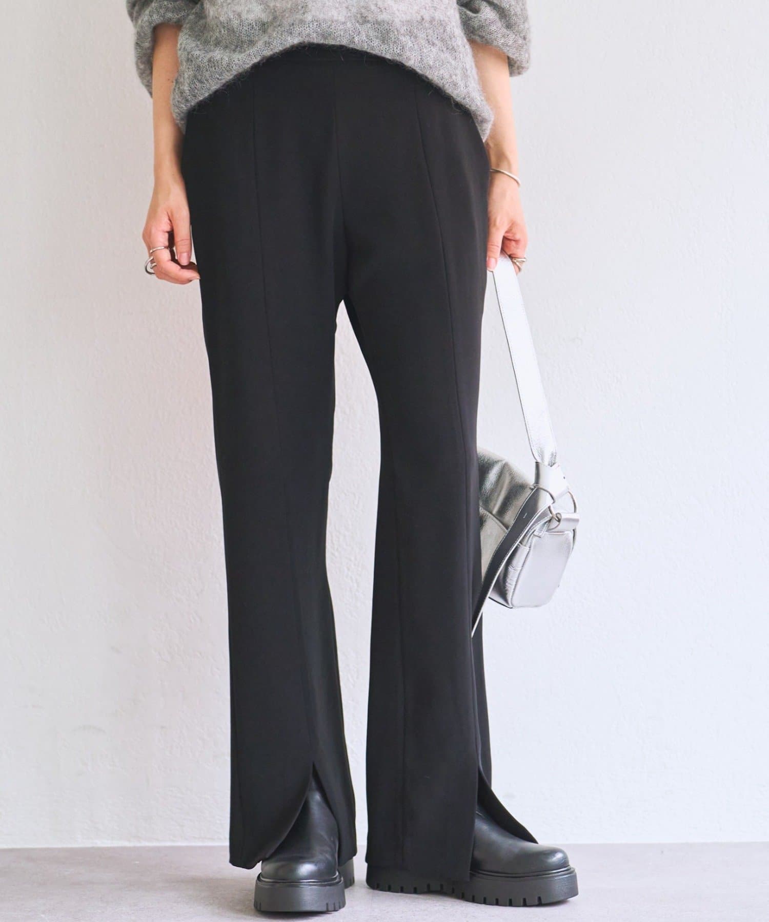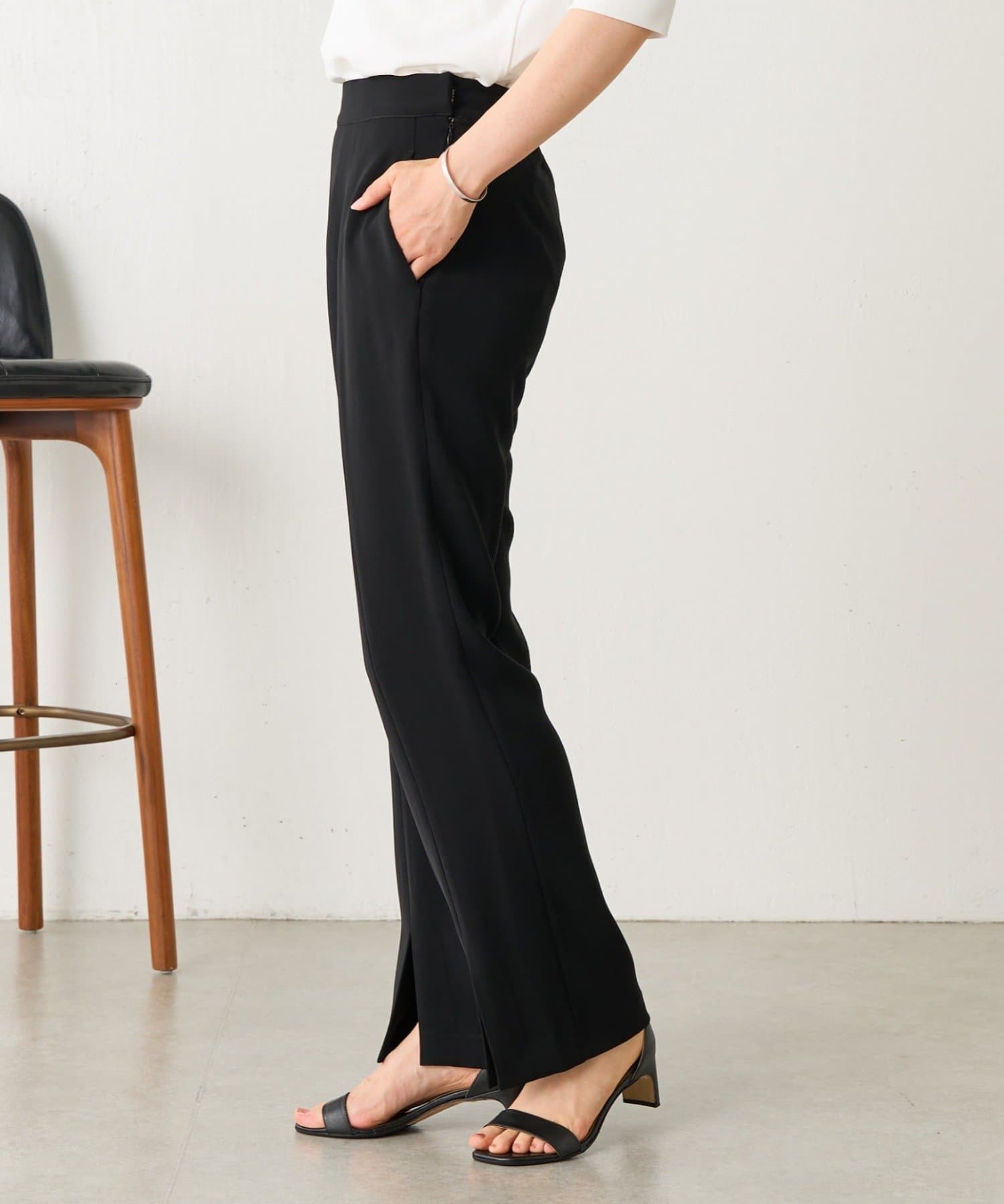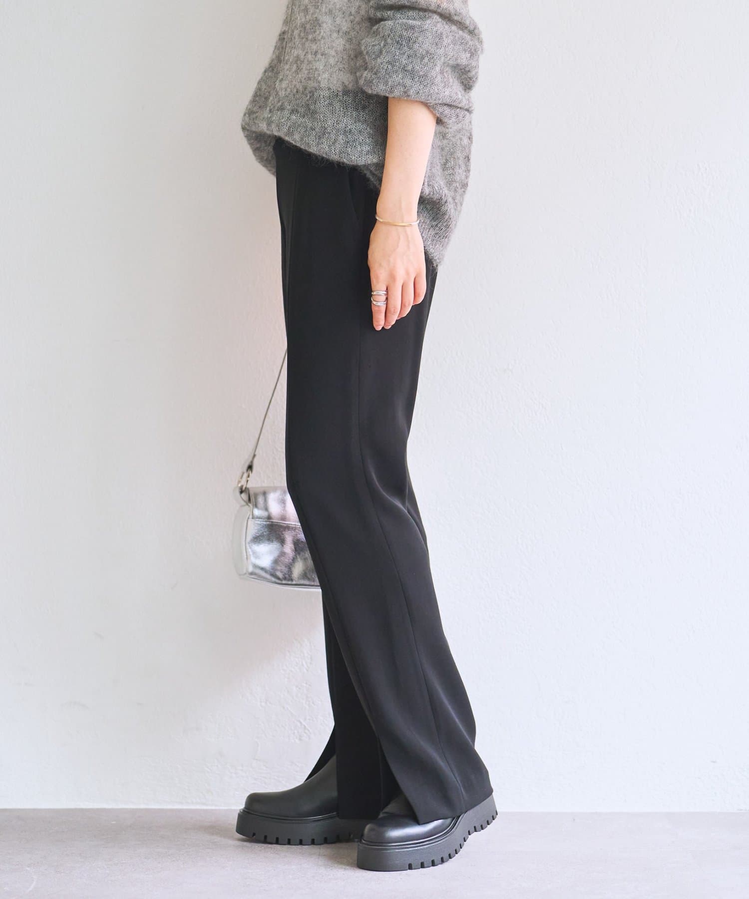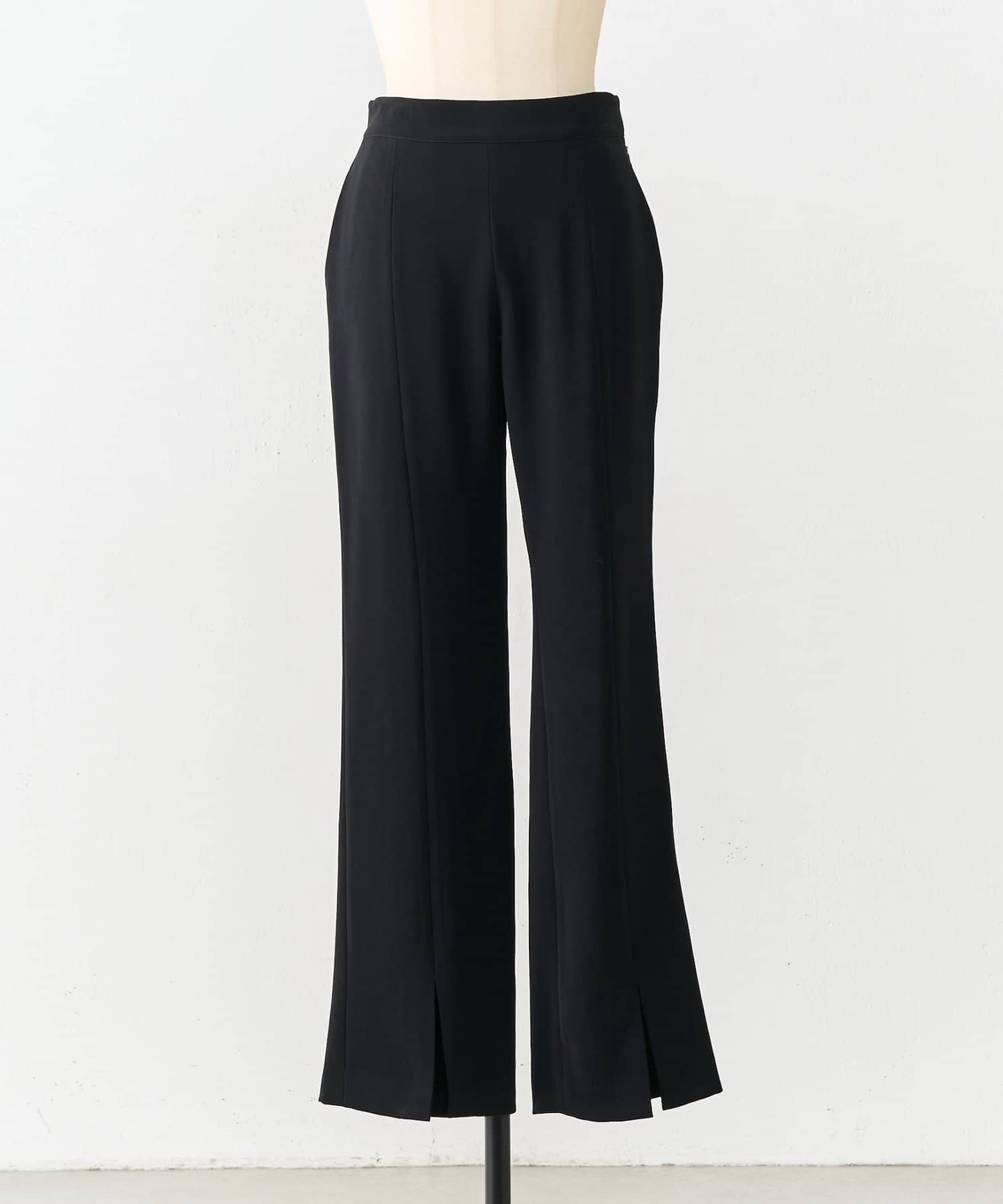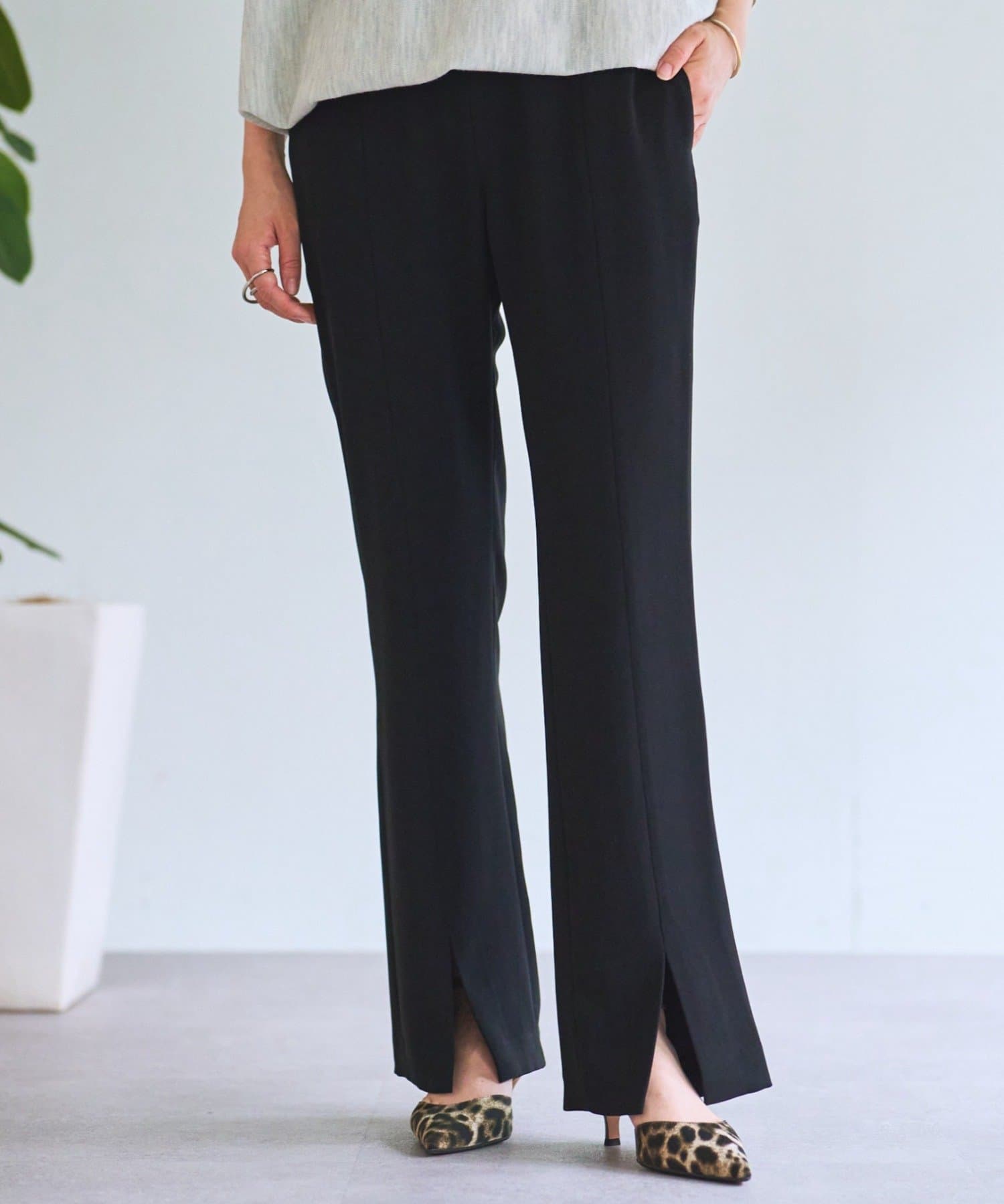 フロント部分はセンタープレスではなくセンターシーム(縫い目)を入れることできちんと感があり、裾のフロントスリットがデザインポイント。