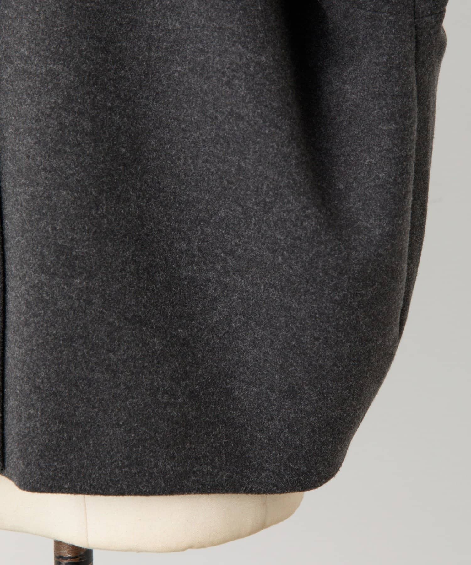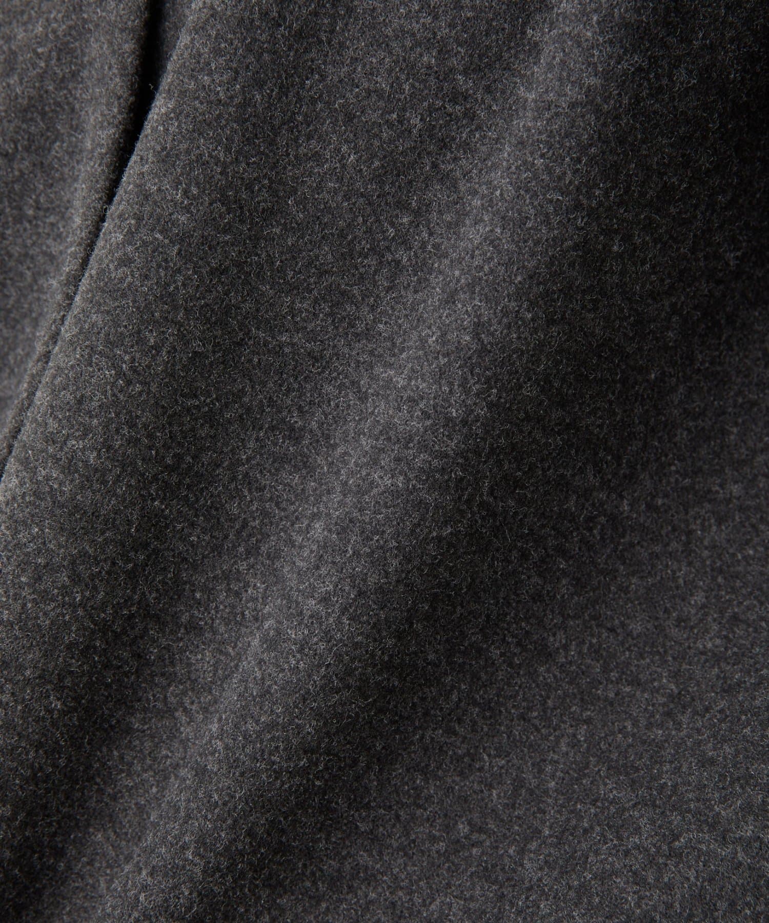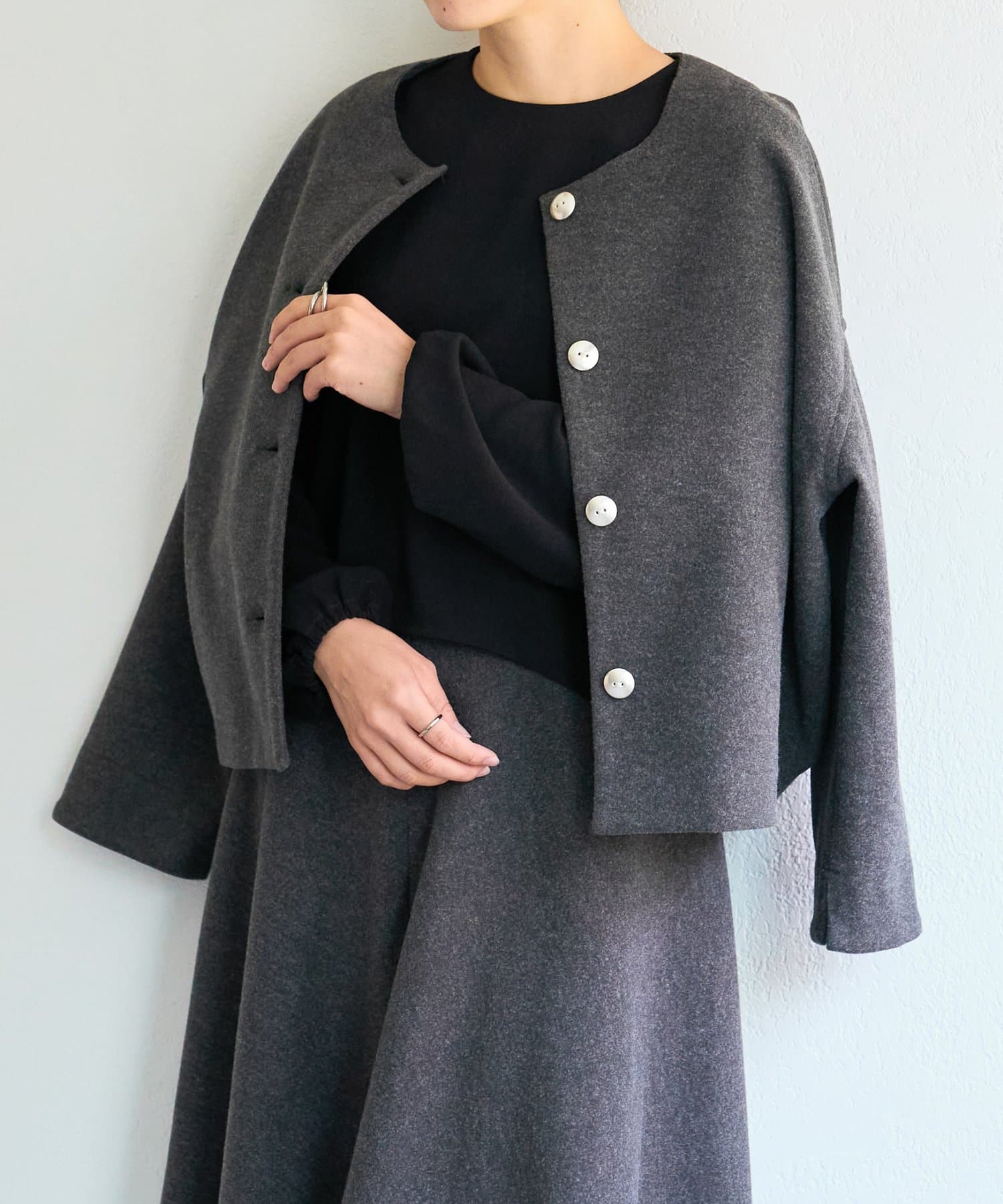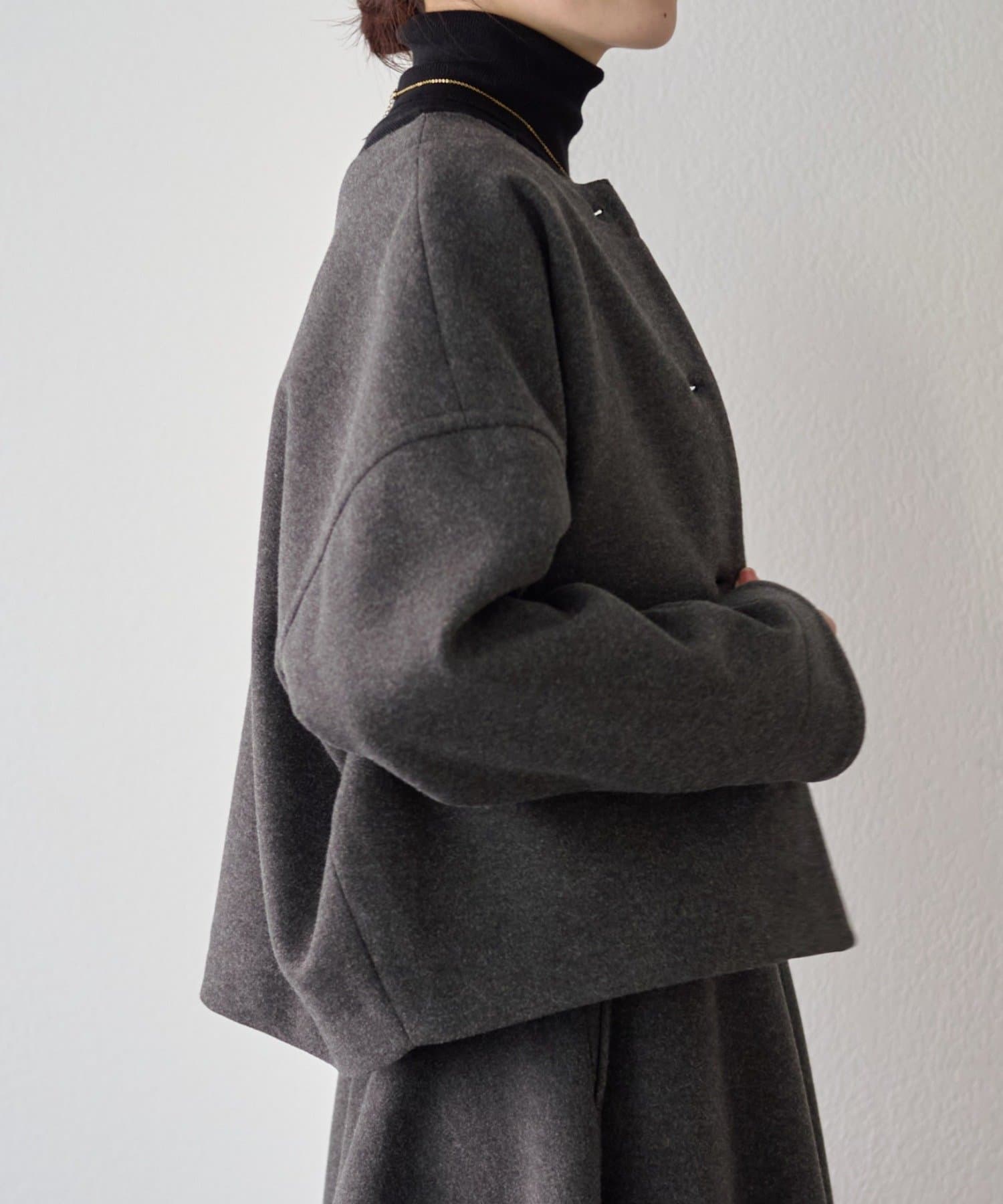 圧力をかけてフェルト状に加工しているので、襟元はあえて切りっぱなし加工にし、ステッチで抑え、ヌケ感を出しているのがポイント。