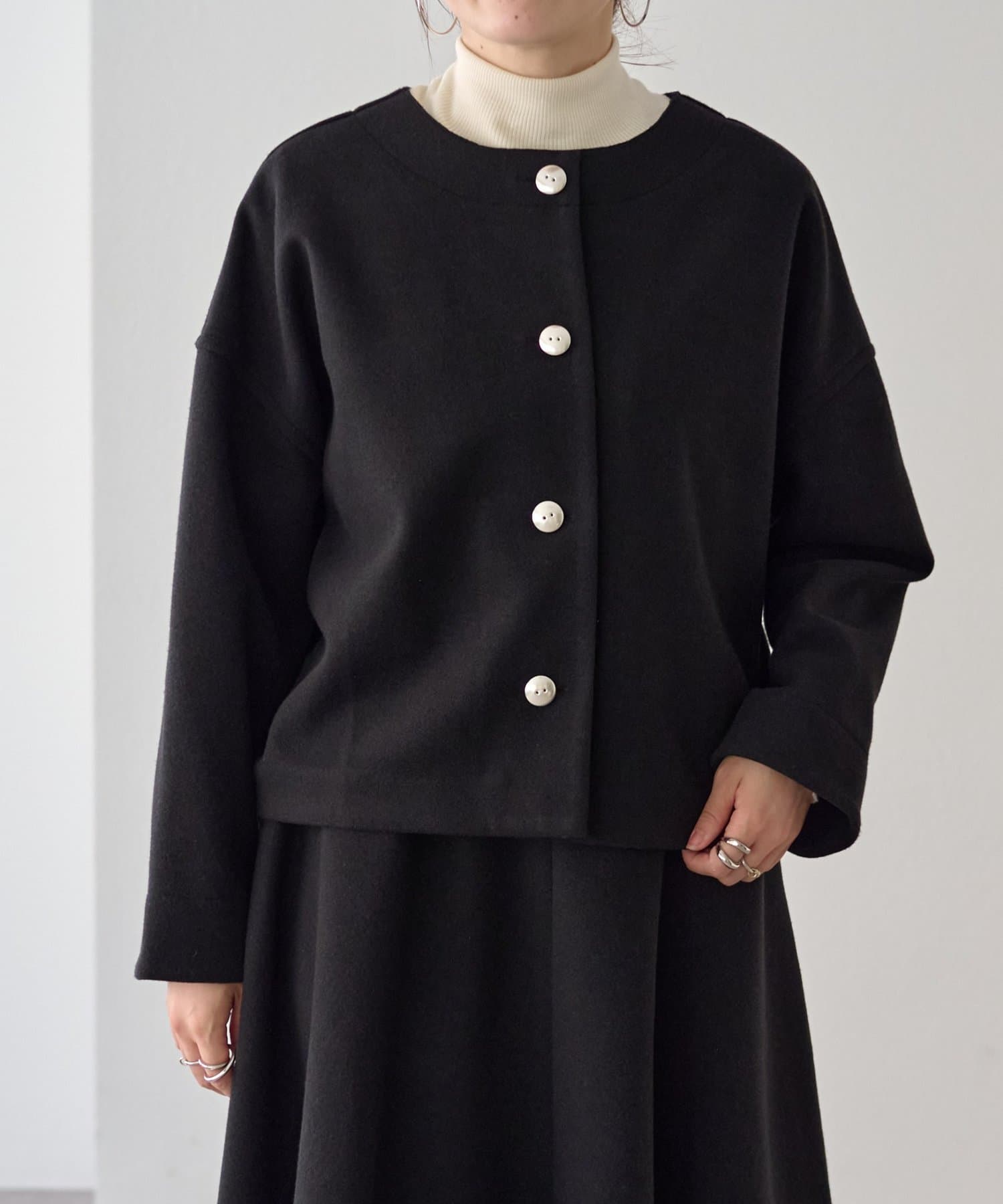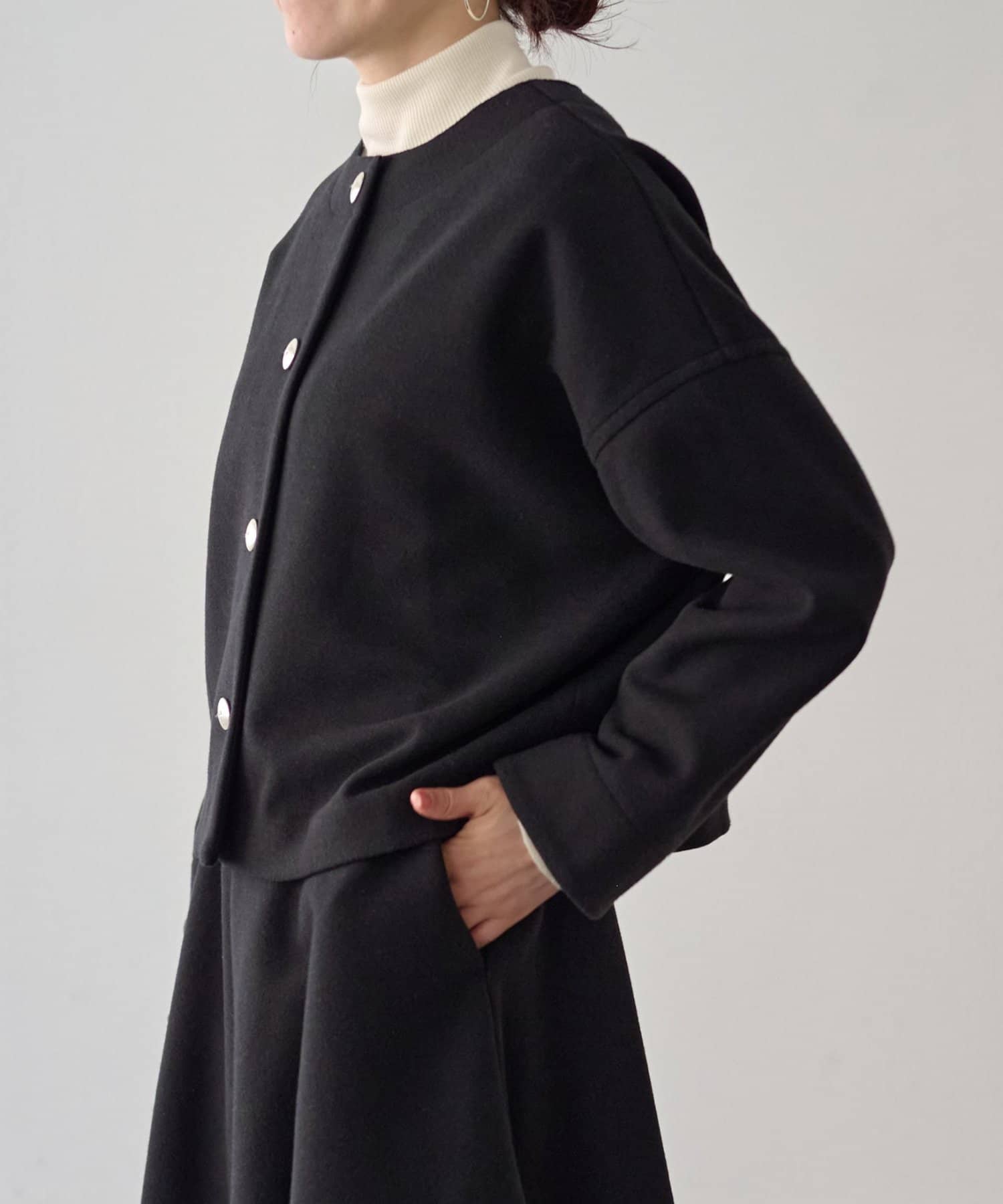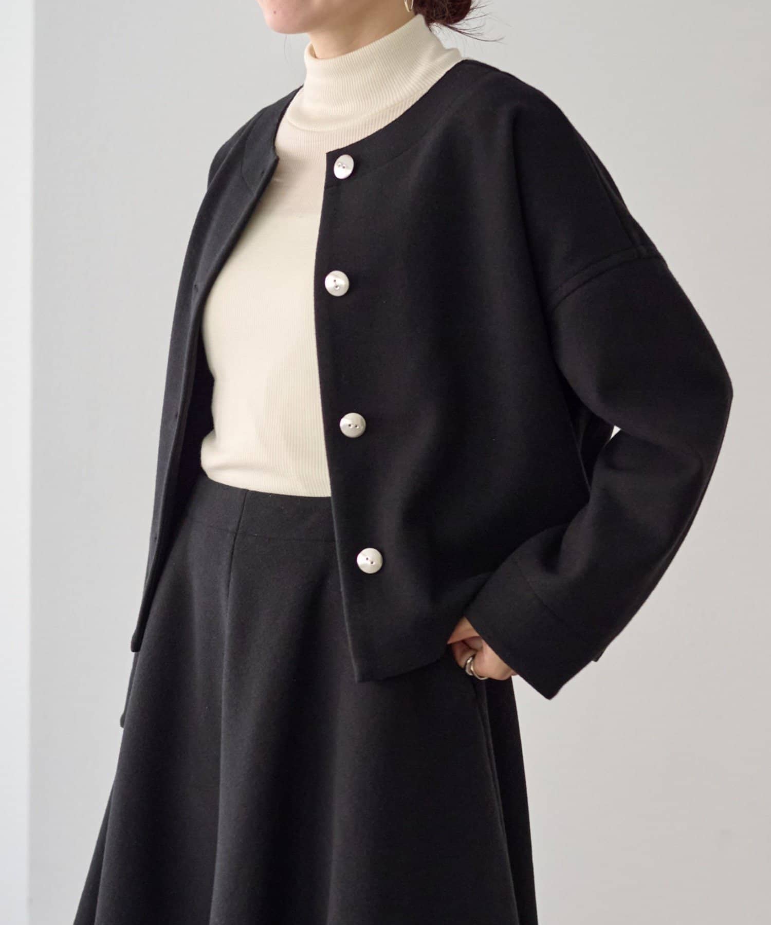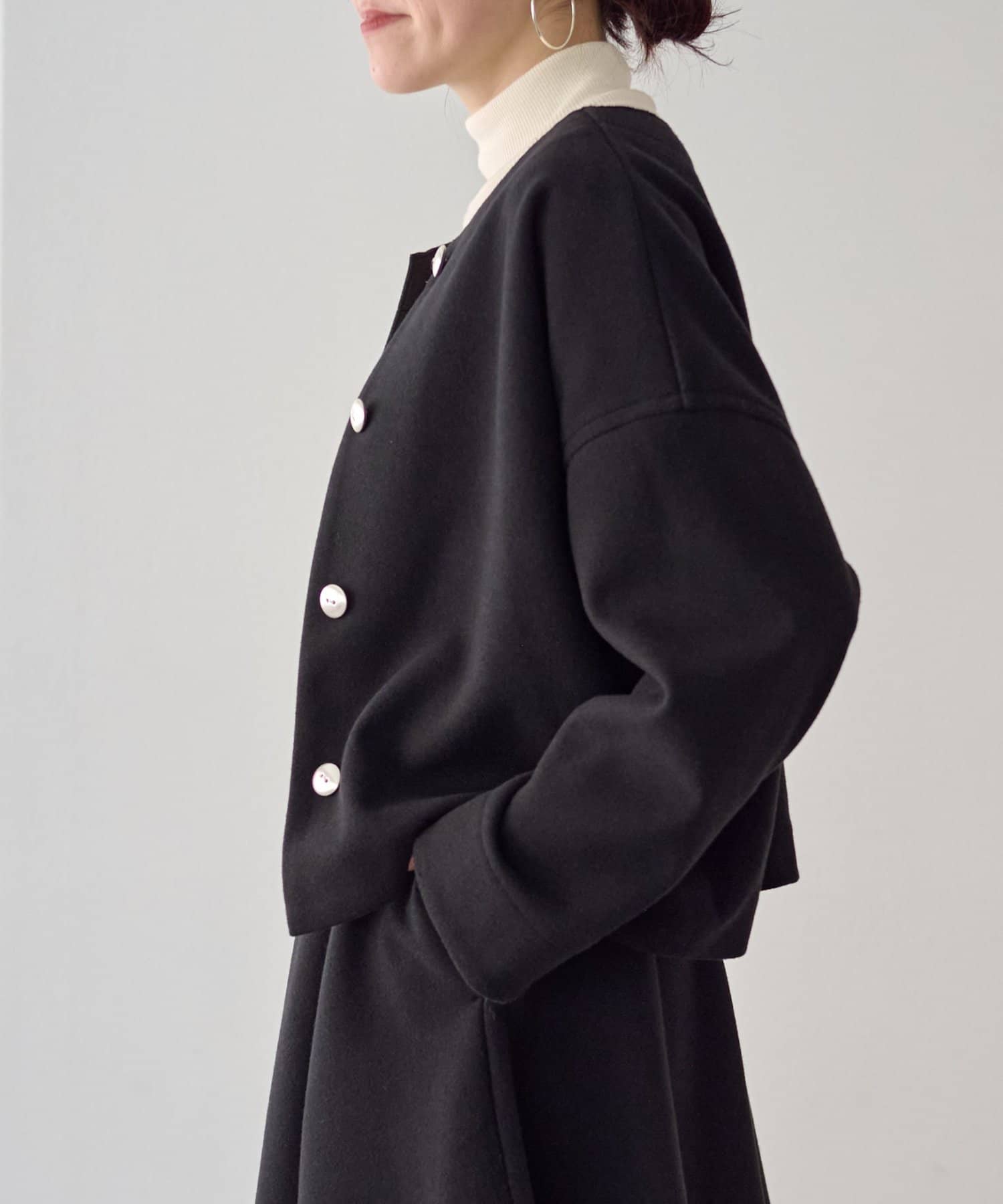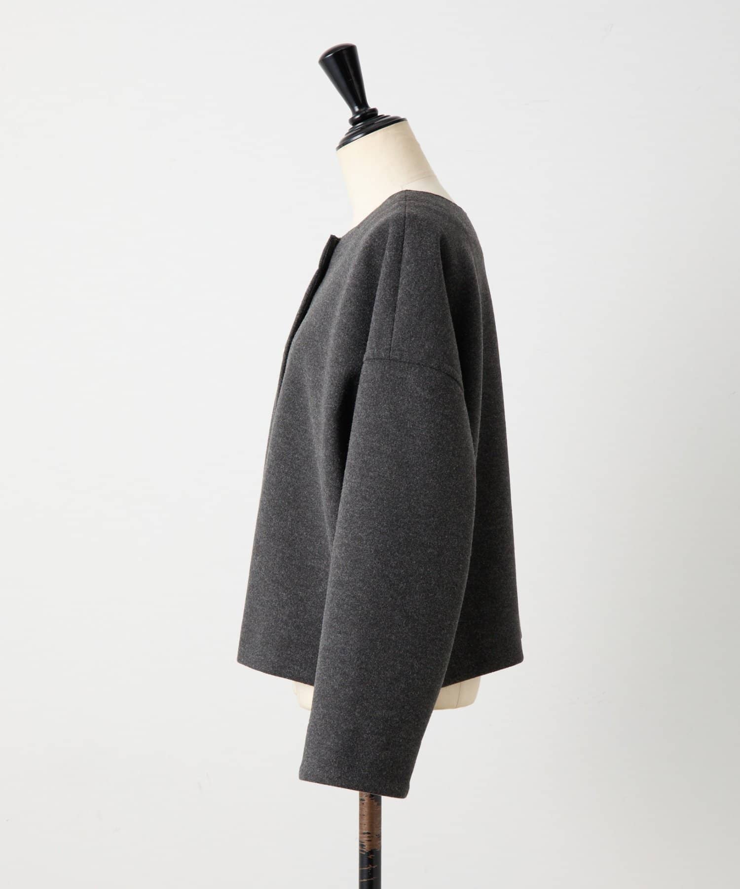 圧力をかけてフェルト状に加工しているので、襟元はあえて切りっぱなし加工にし、ステッチで抑え、ヌケ感を出しているのがポイント。