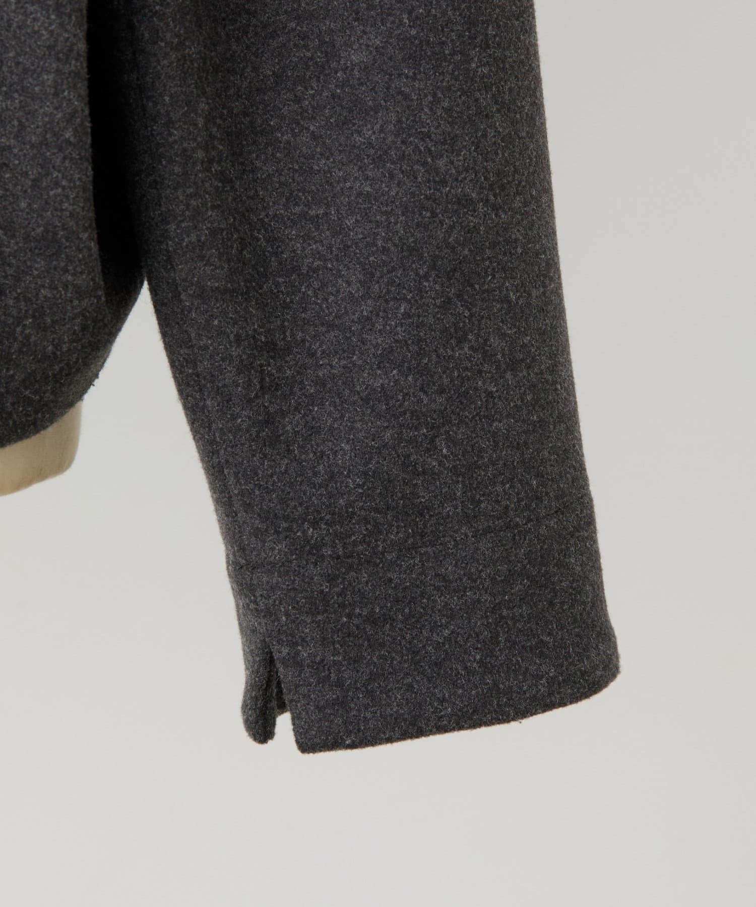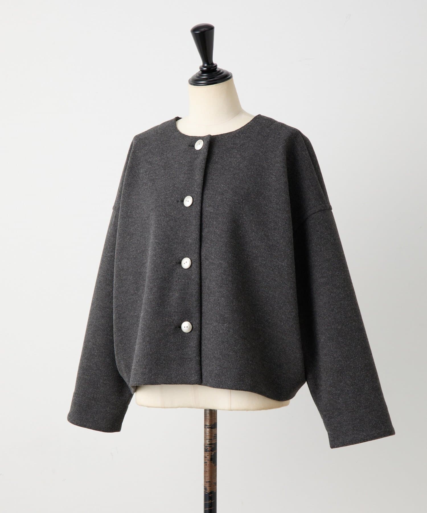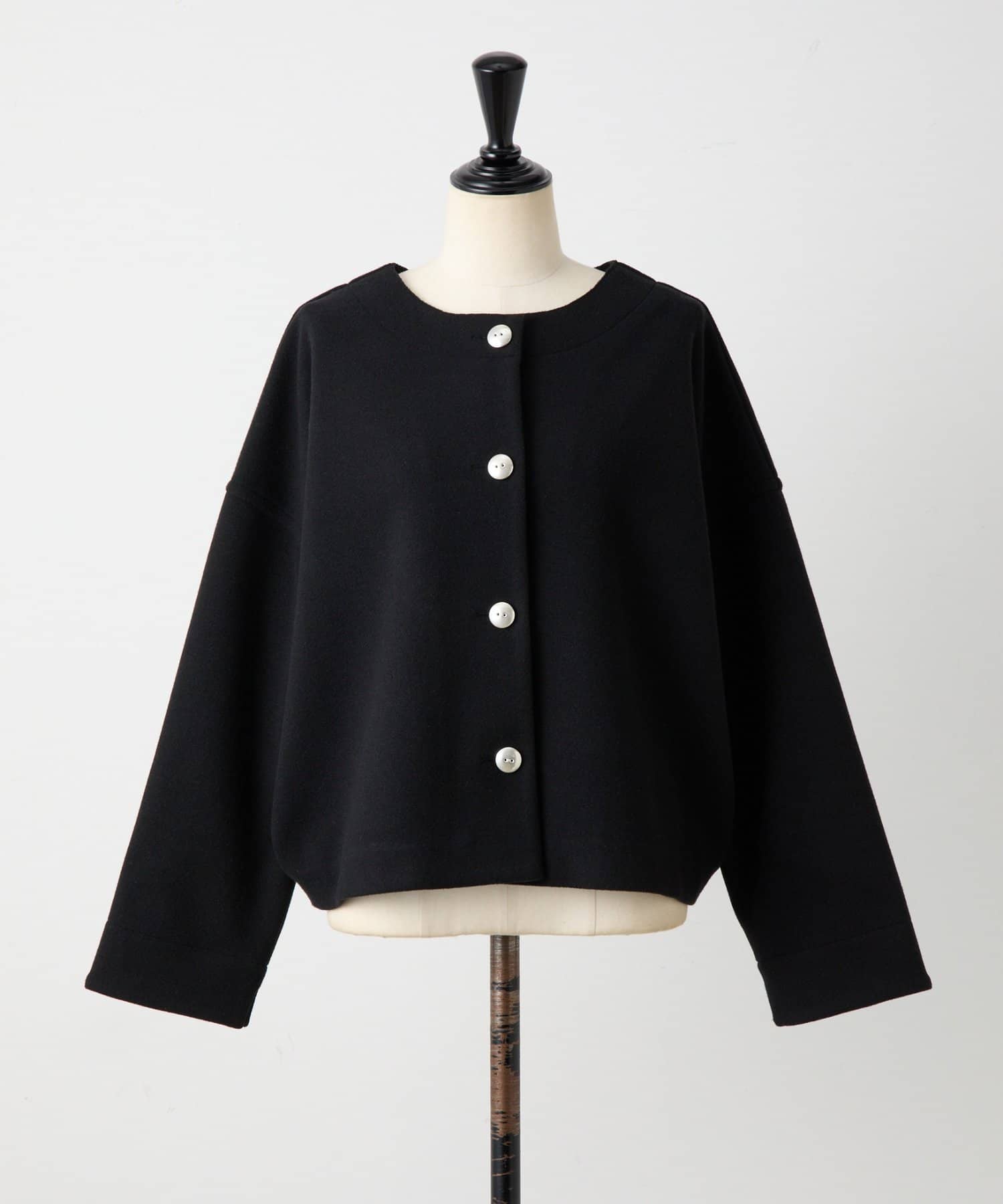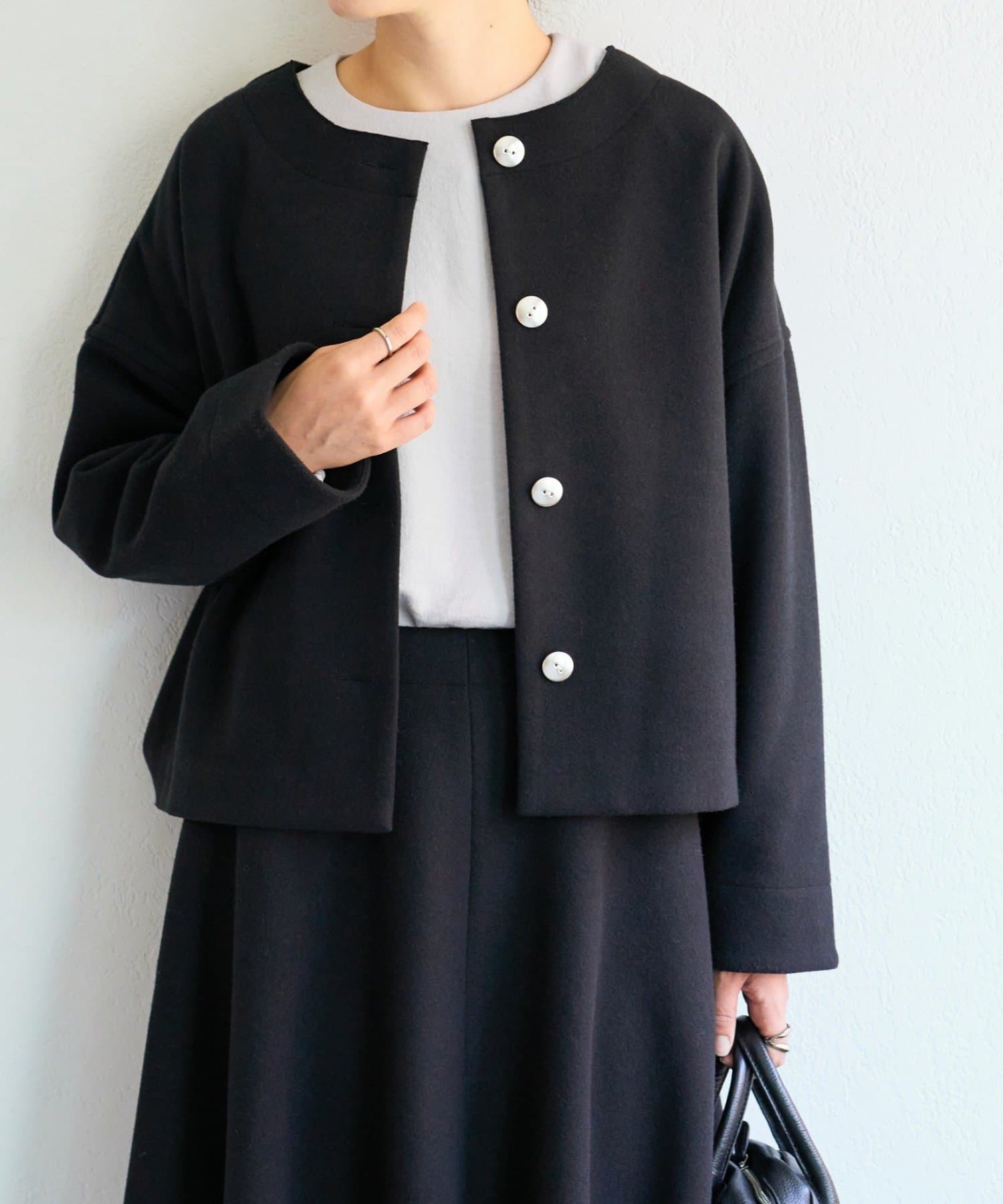 圧力をかけてフェルト状に加工しているので、襟元はあえて切りっぱなし加工にし、ステッチで抑え、ヌケ感を出しているのがポイント。