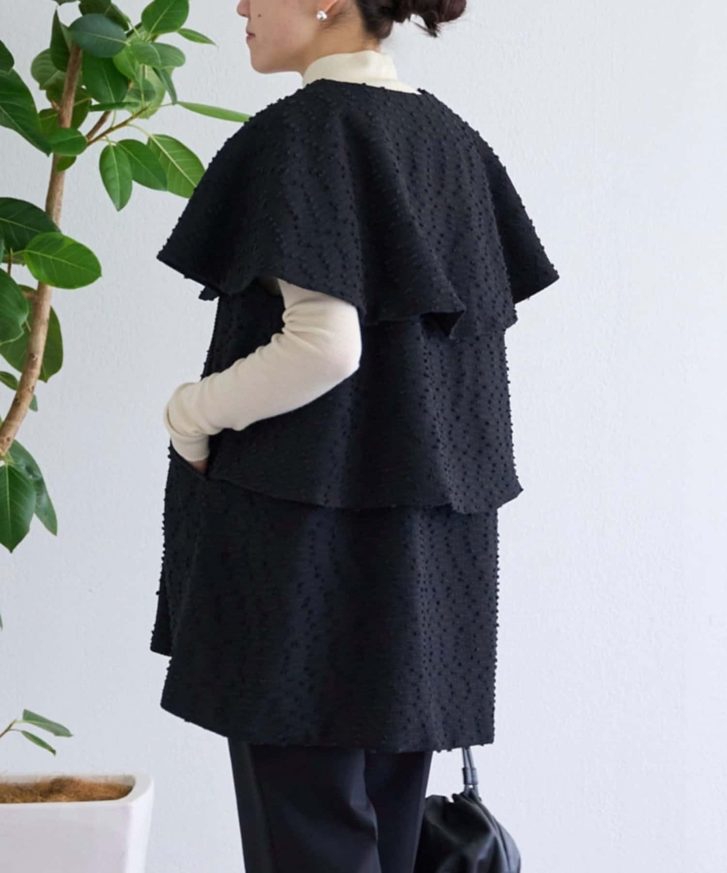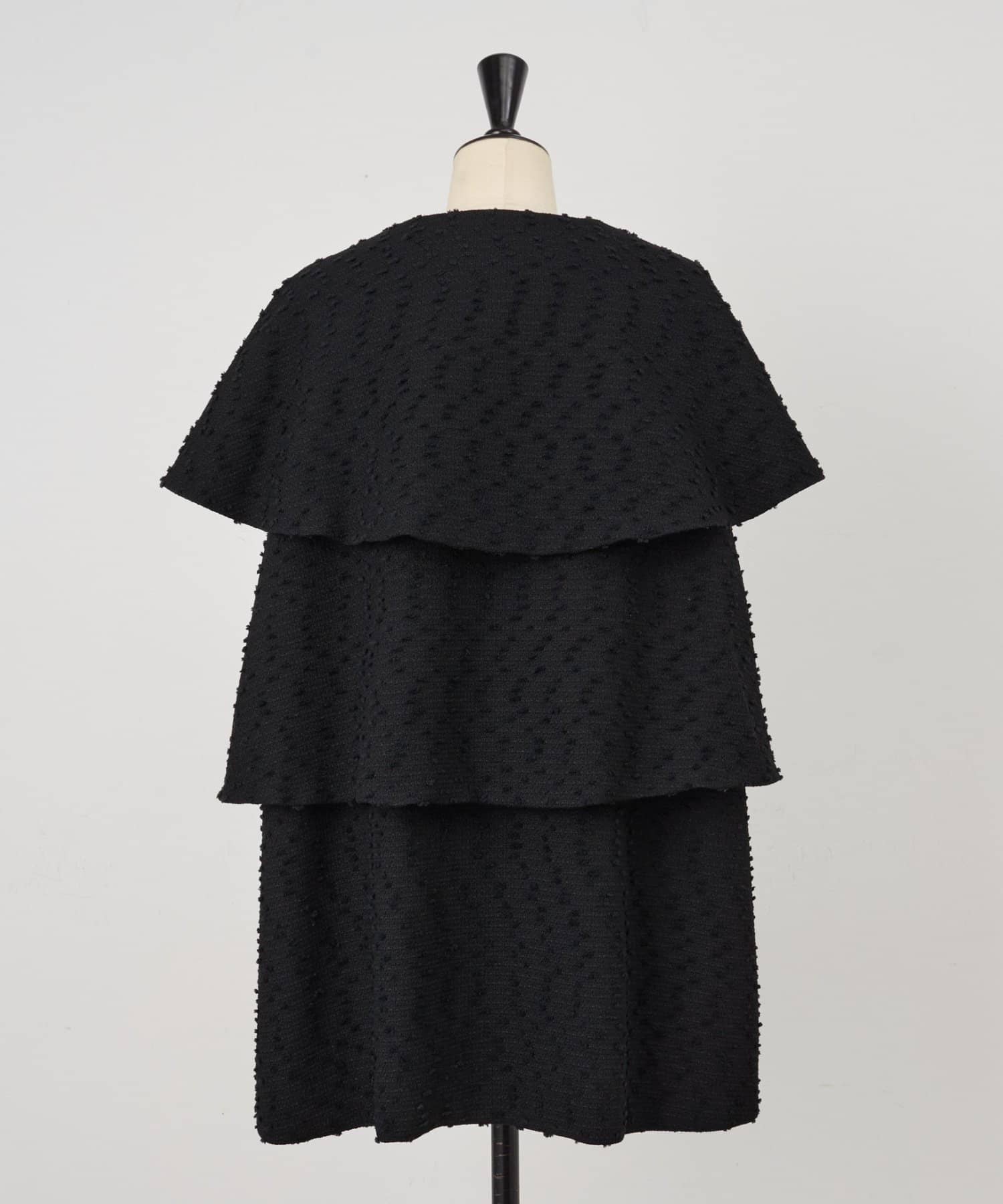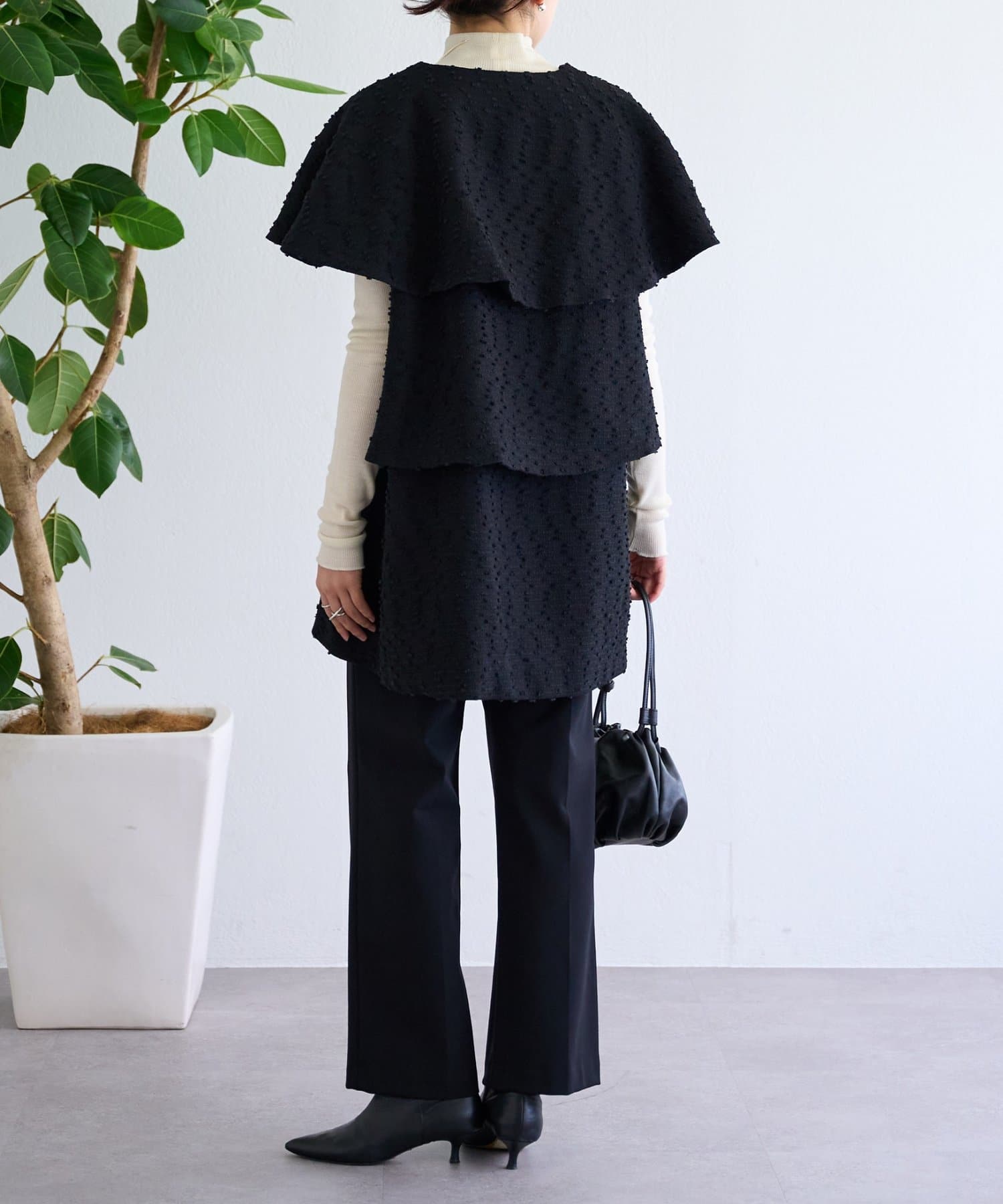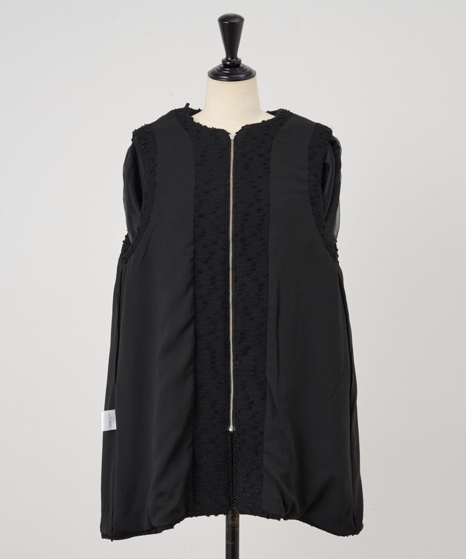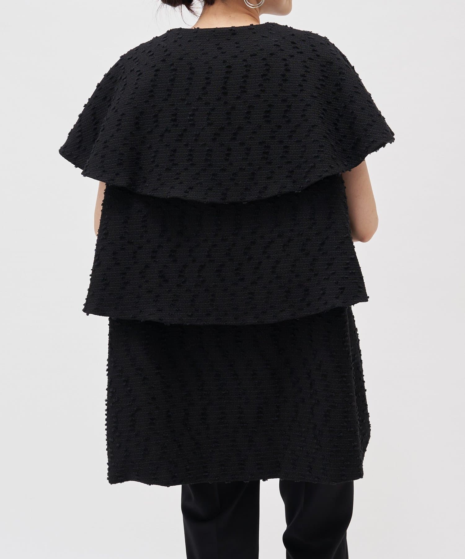 バックスタイルのティアードと、つぶつぶとした糸目が華やかなツイードベスト。