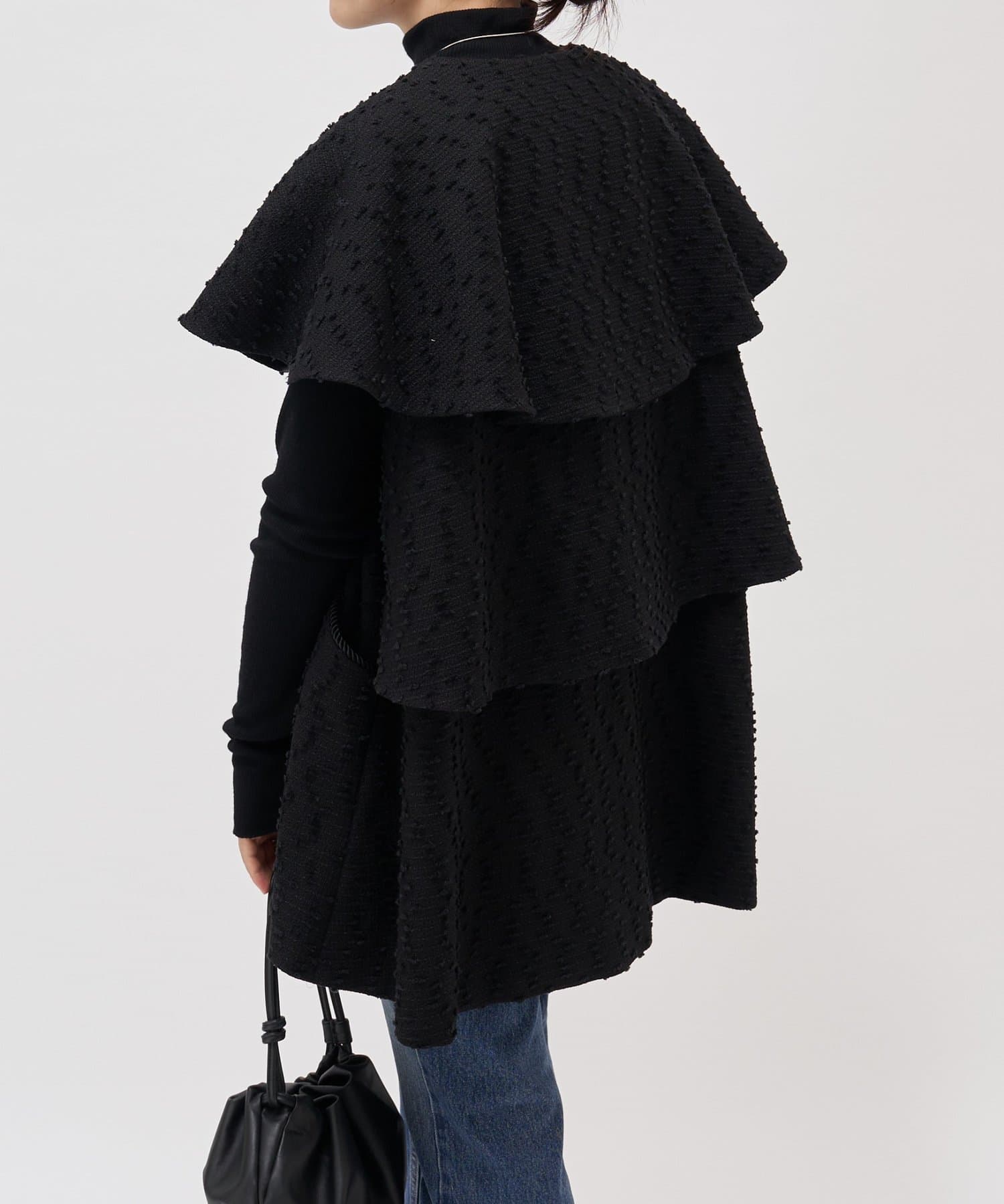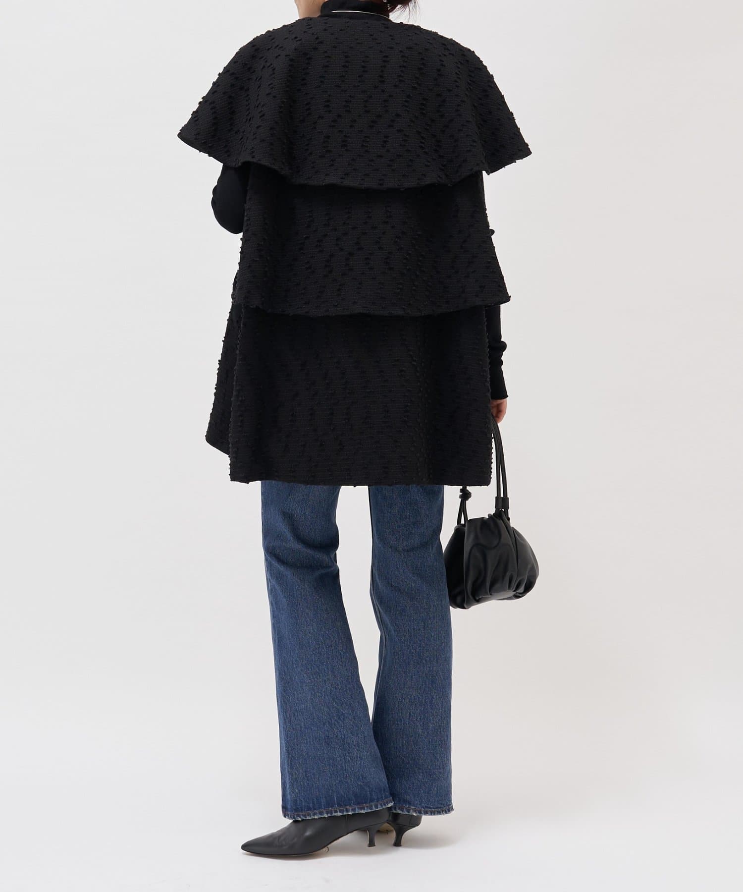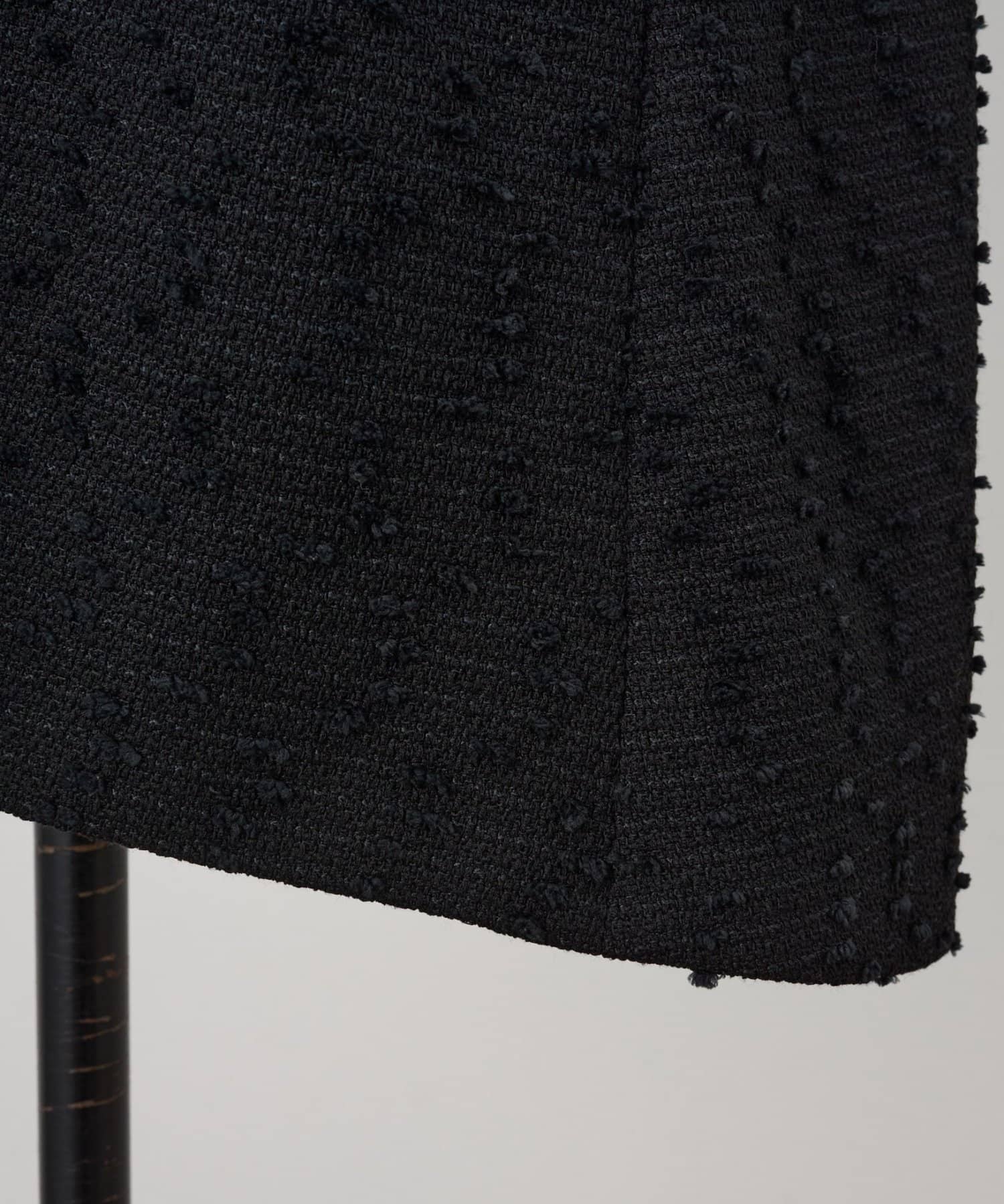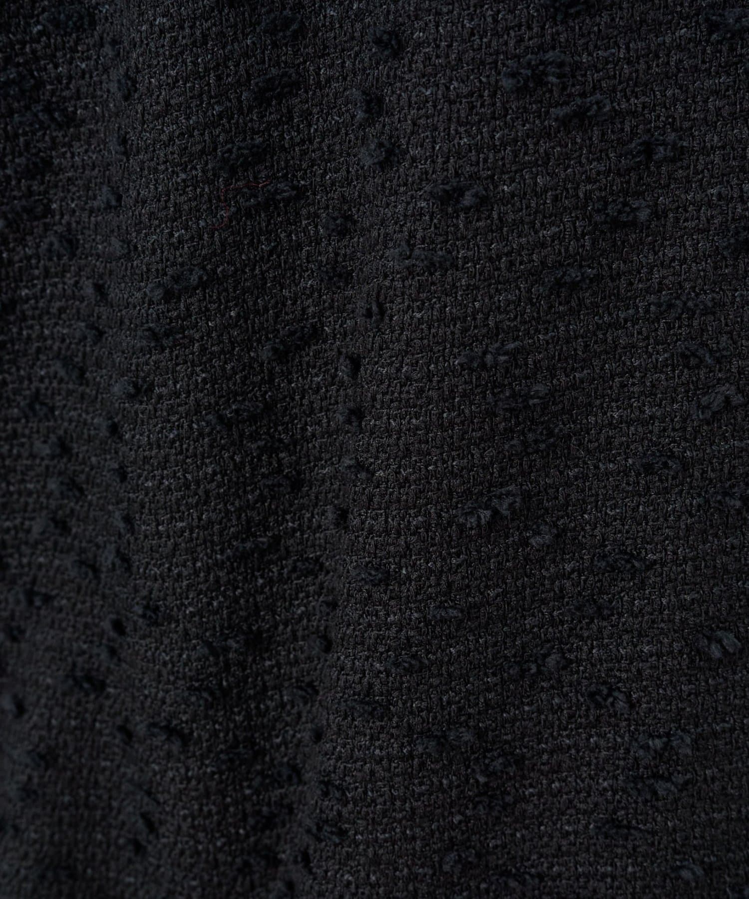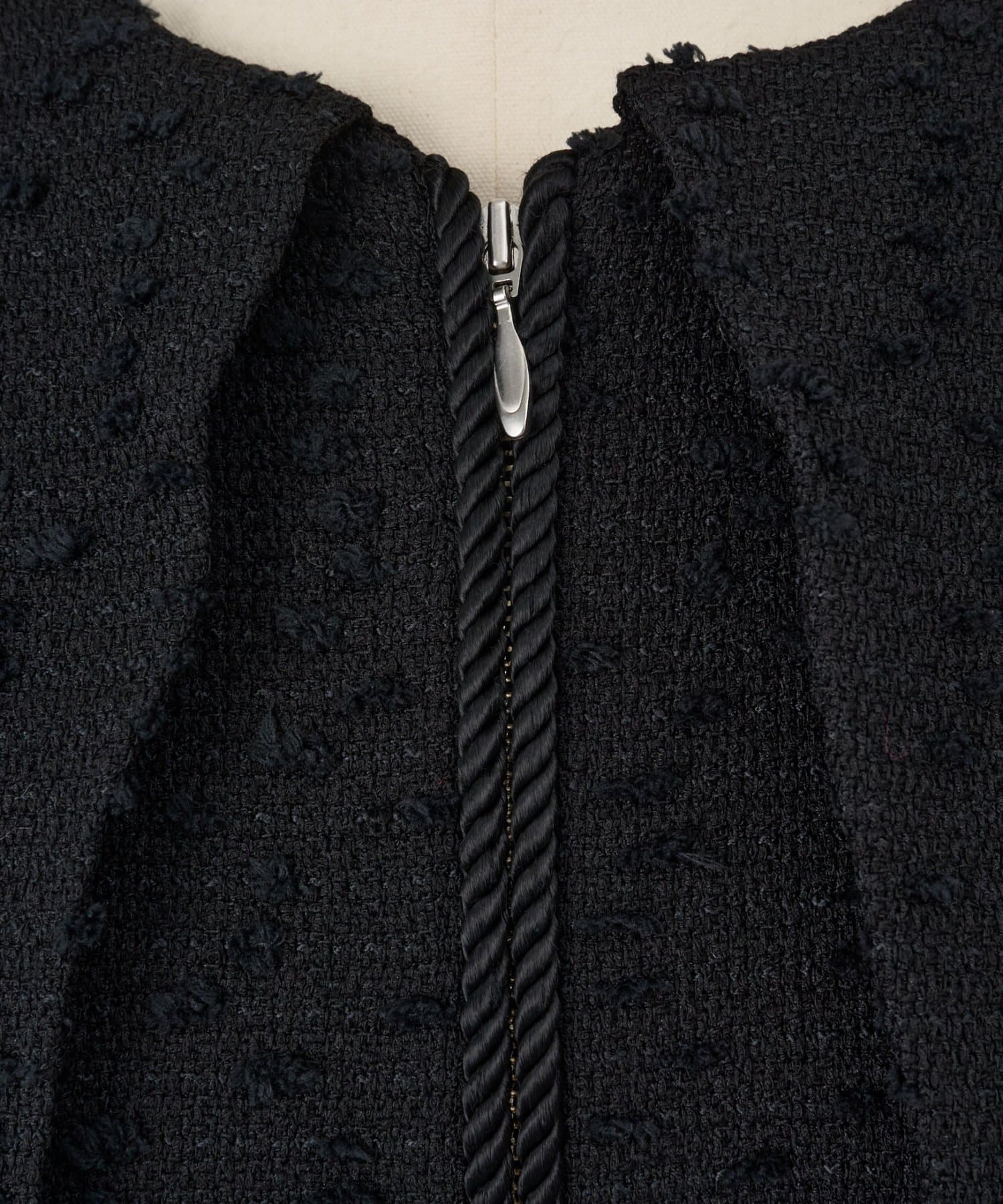 バックスタイルのティアードと、つぶつぶとした糸目が華やかなツイードベスト。