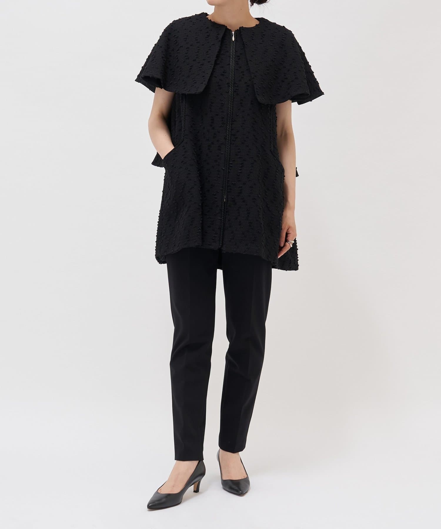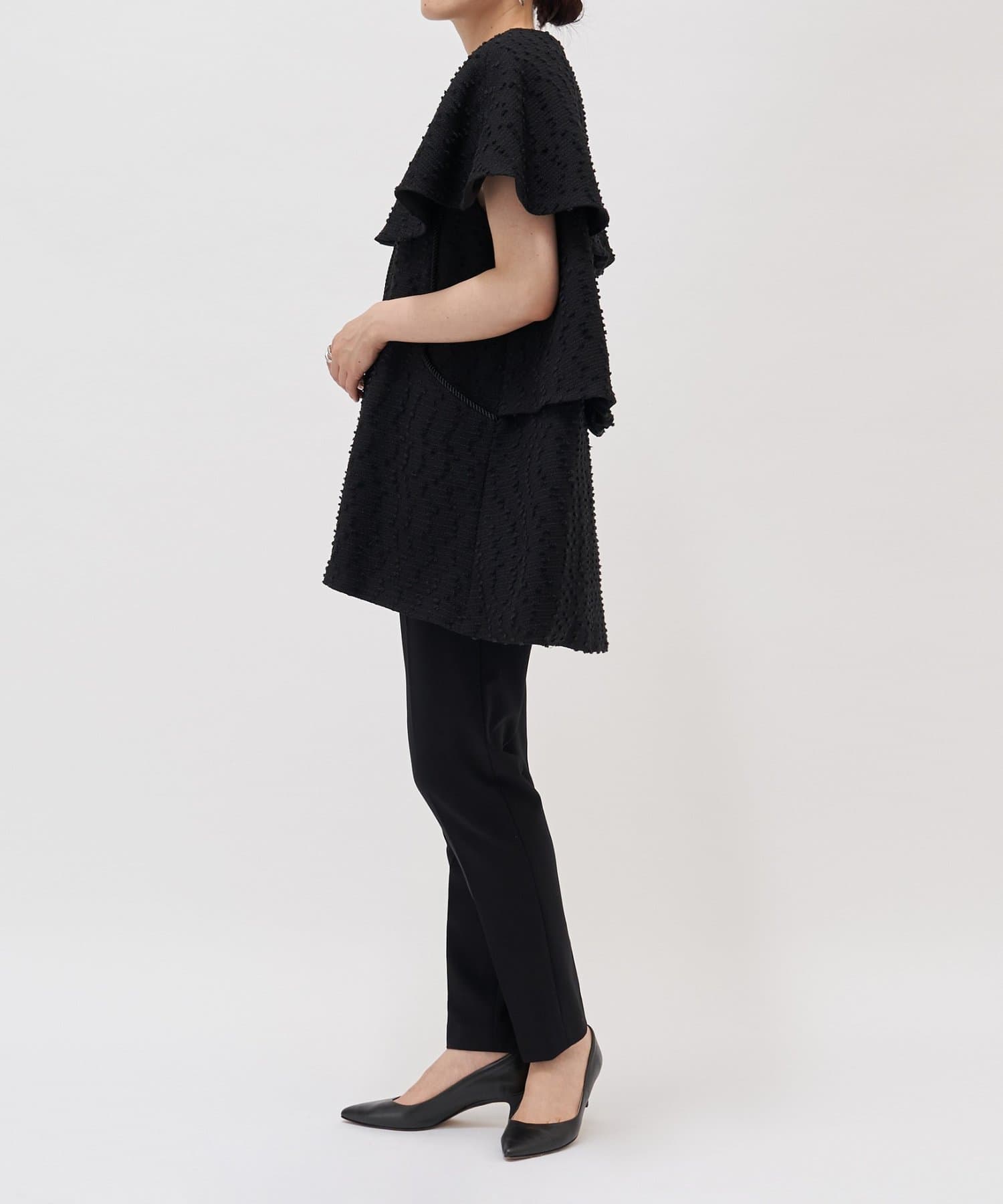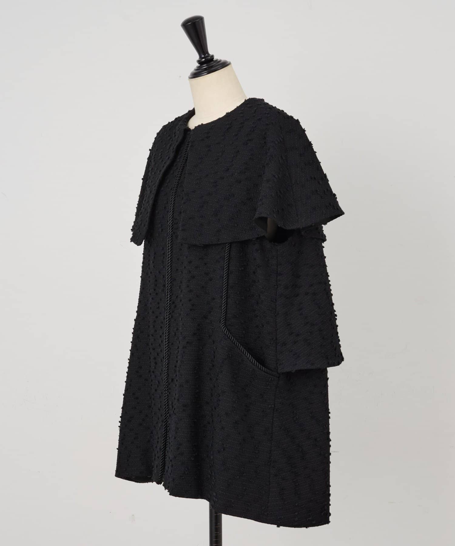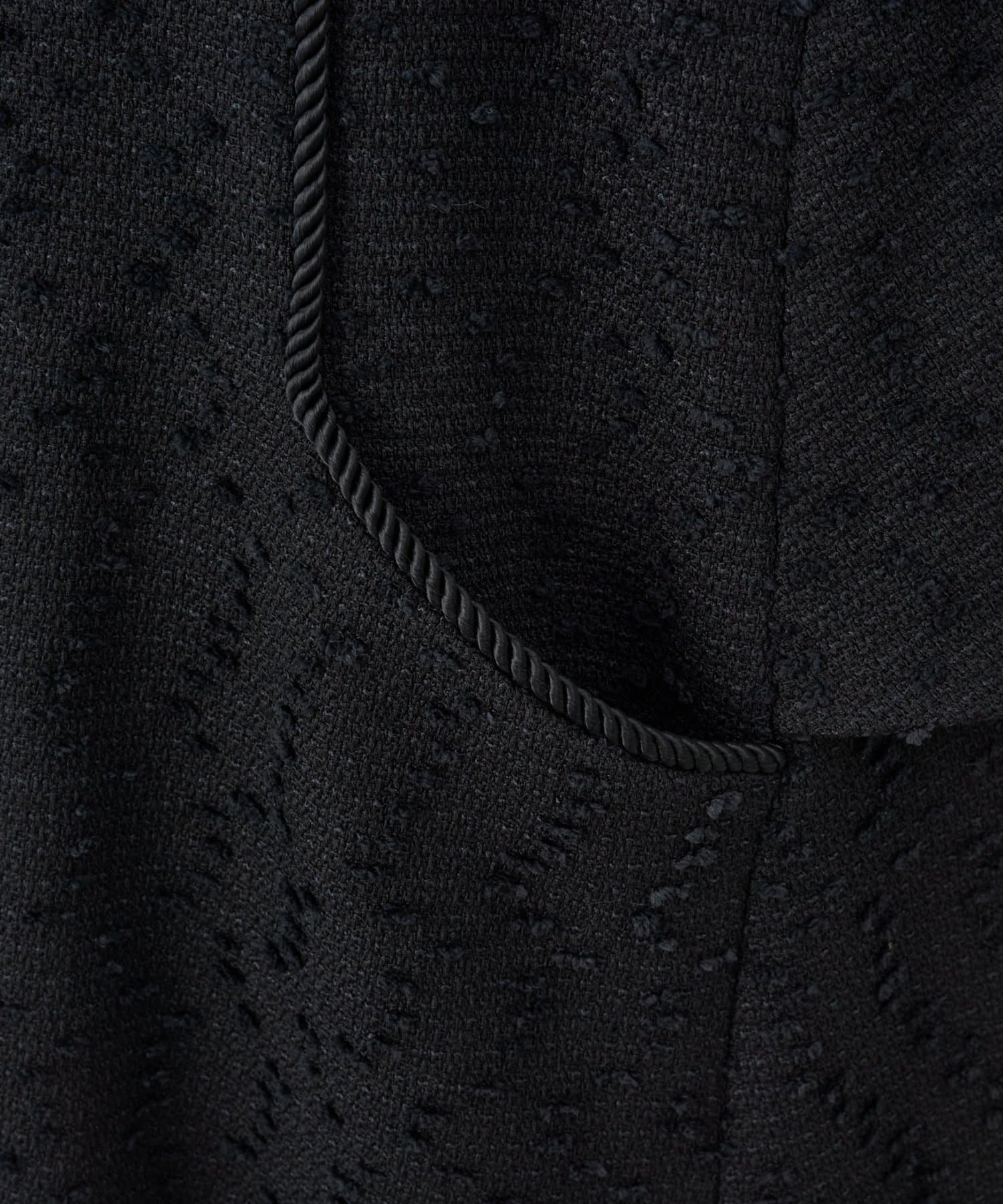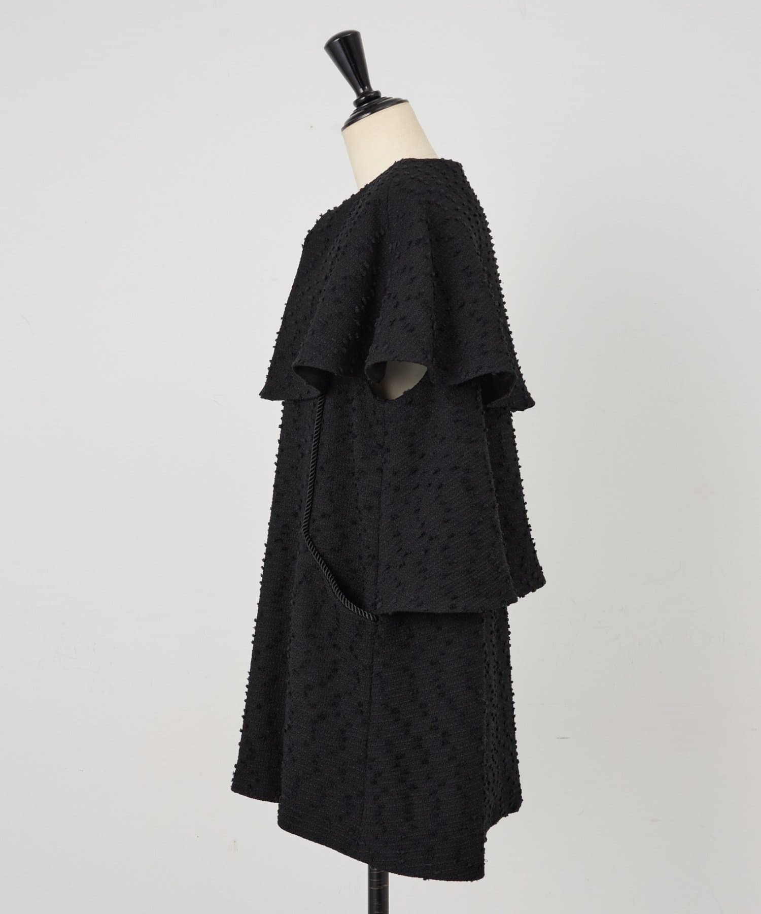 バックスタイルのティアードと、つぶつぶとした糸目が華やかなツイードベスト。