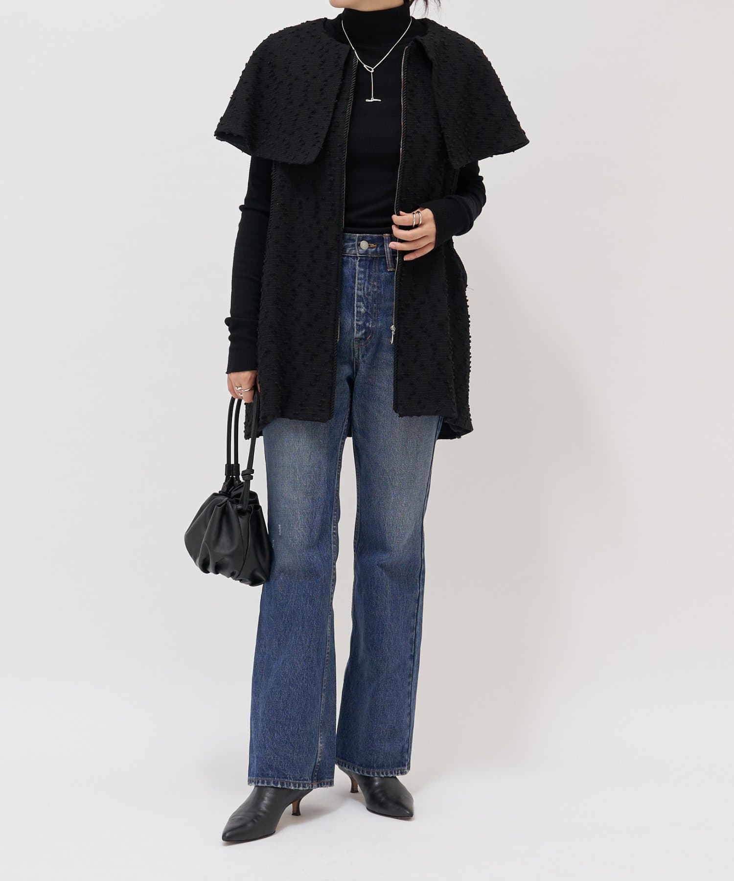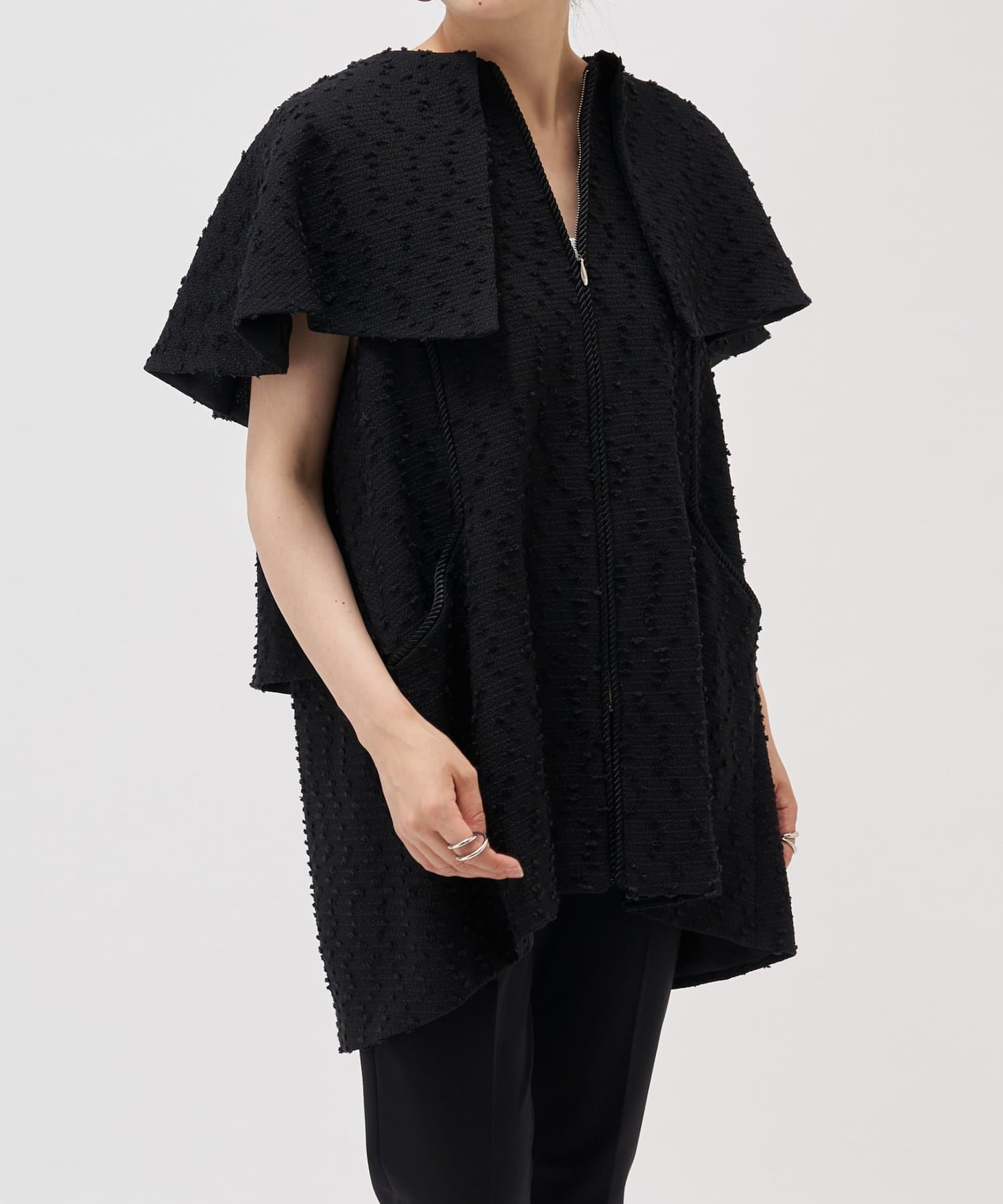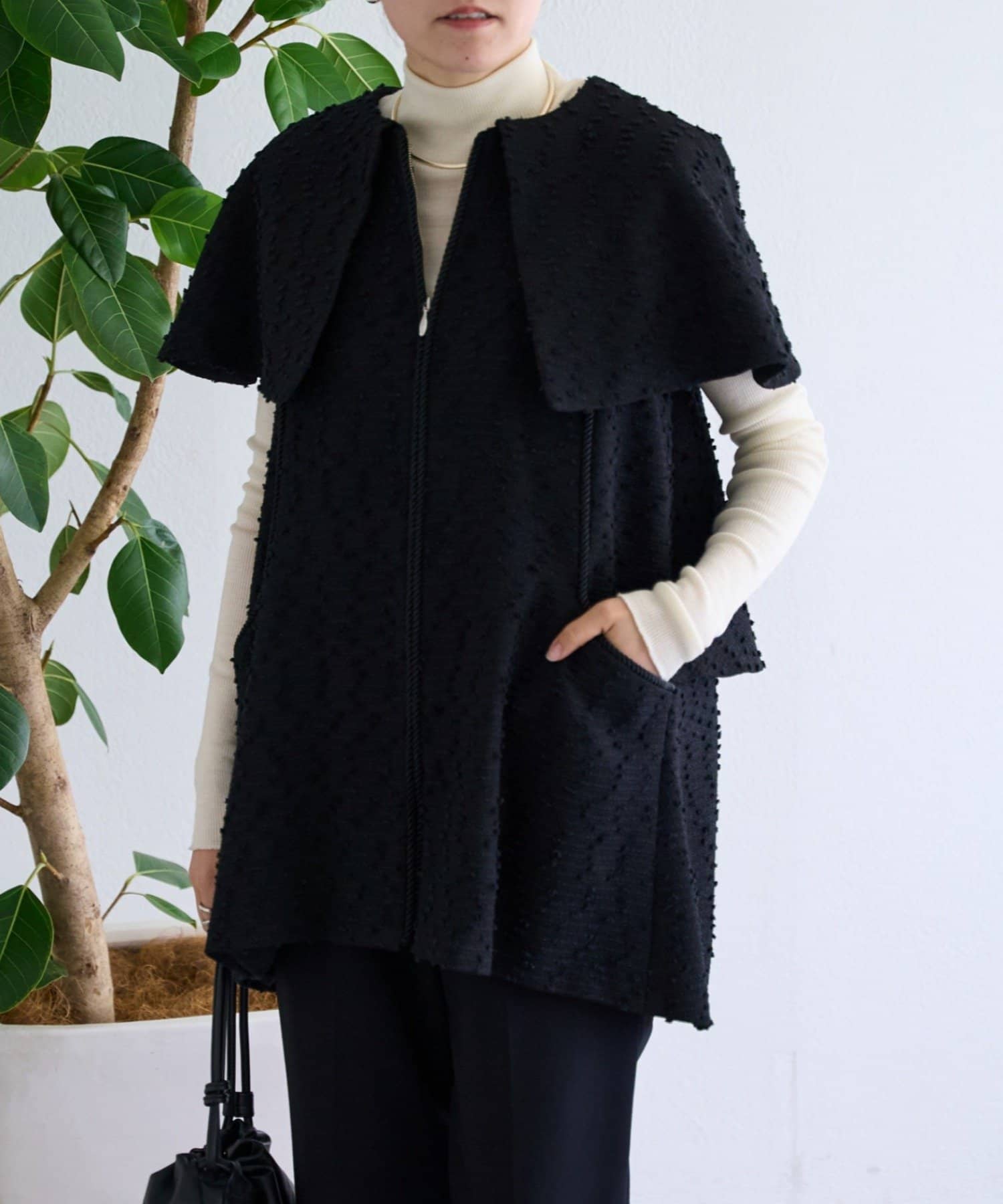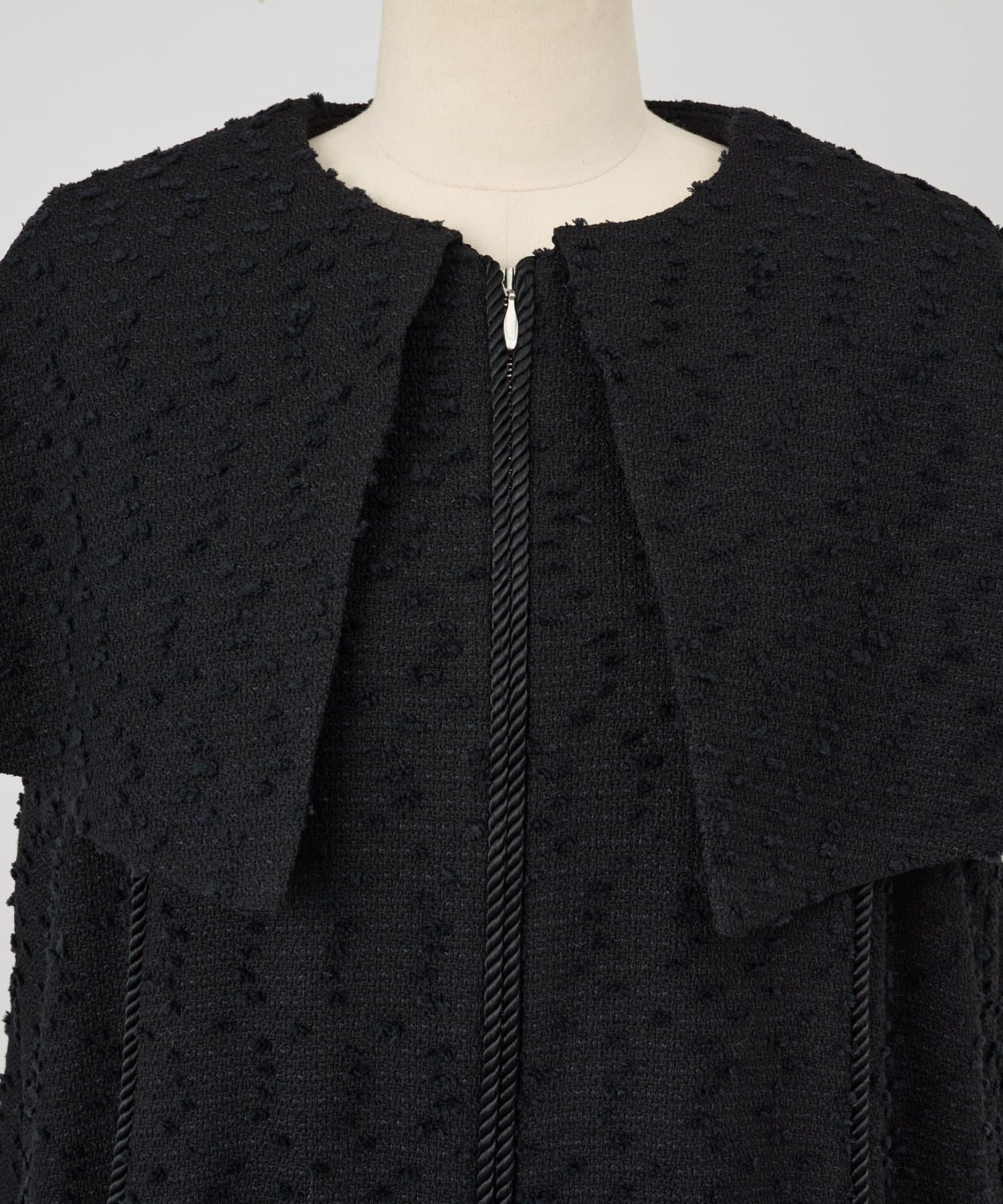 肩を覆うくらいのビッグサイズの衿がロマンチックでフェミニンな雰囲気を演出します。