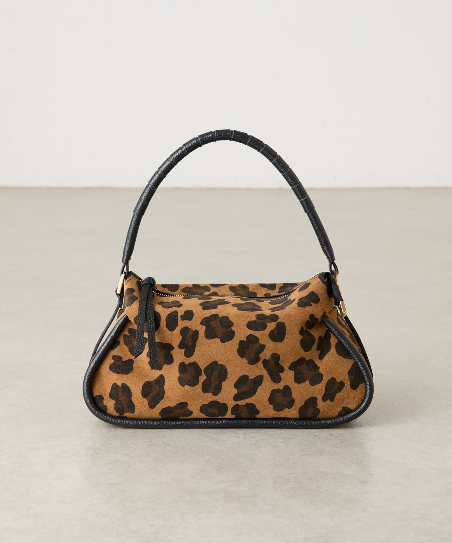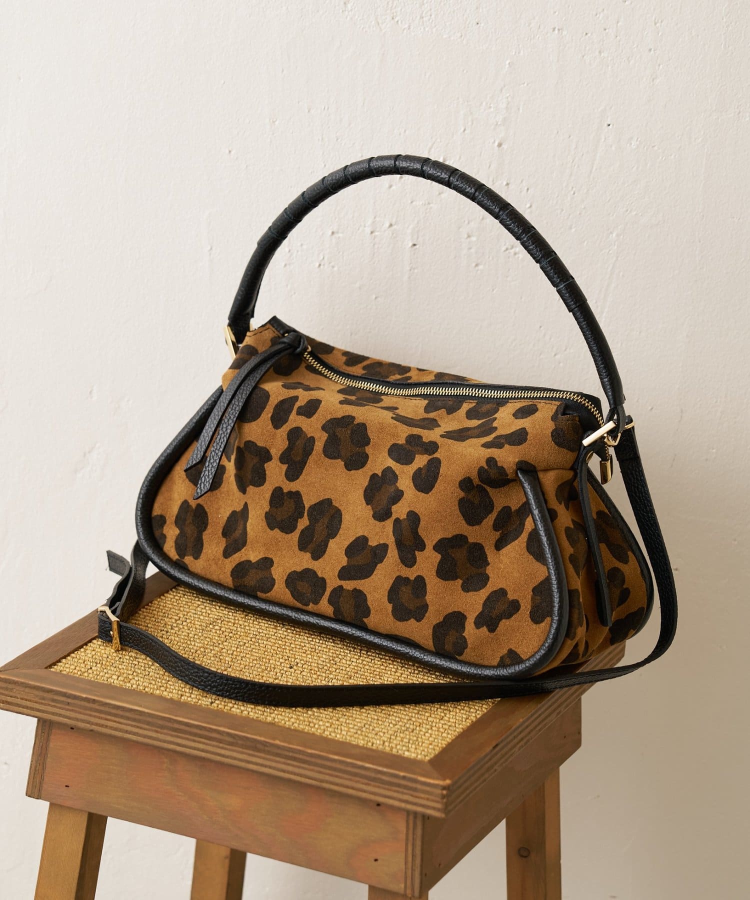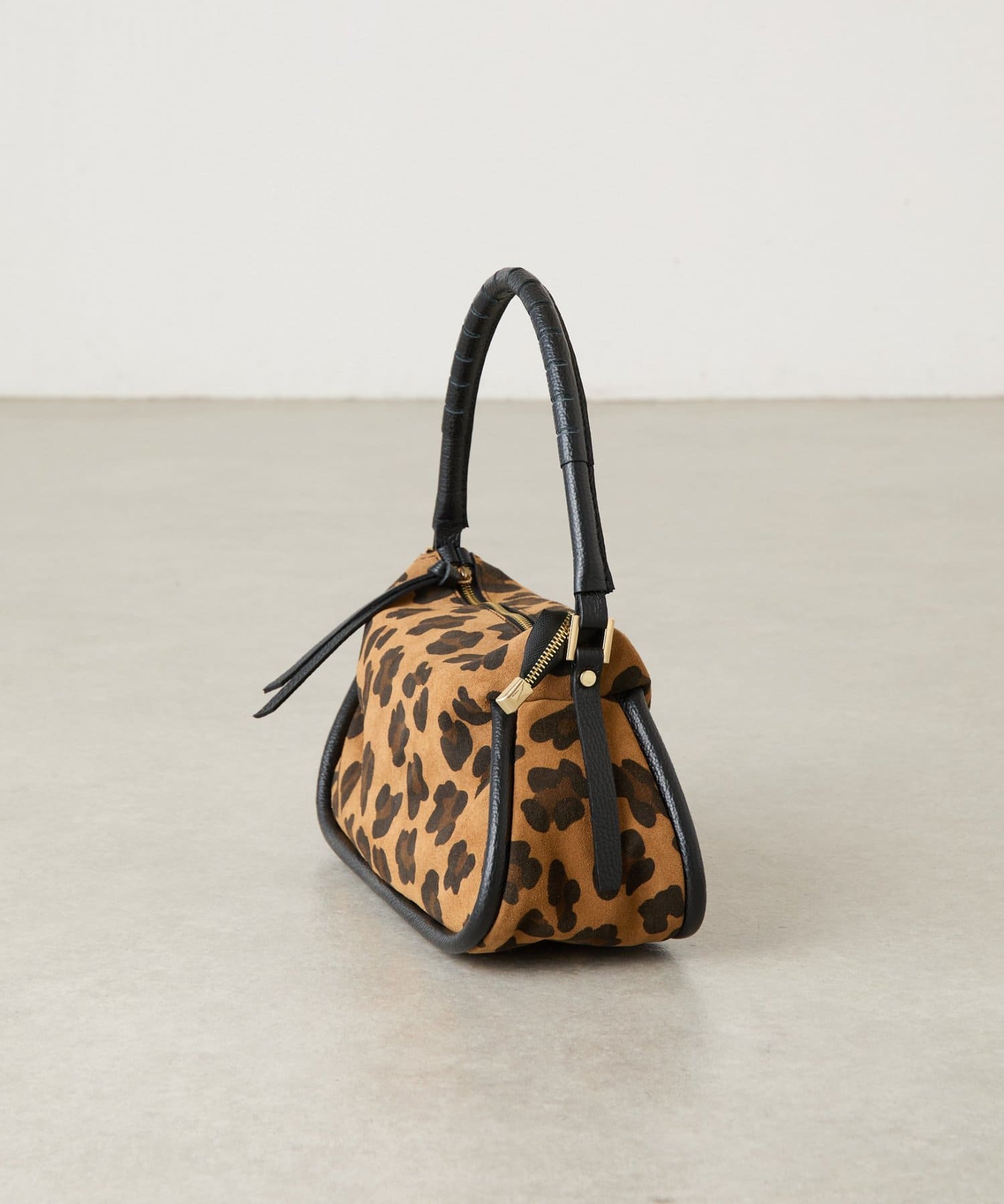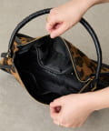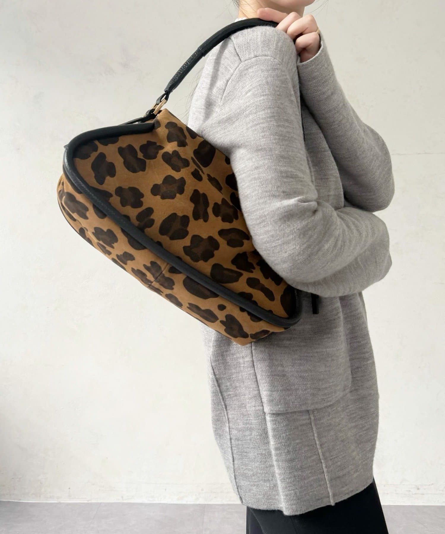 起毛感のあるスエード調のレオパードをメインに、持ち手や引手には肌なじみのよい滑らかなシボ革を組み合わせ、