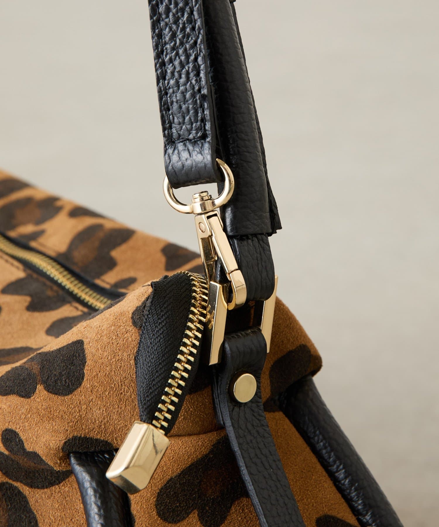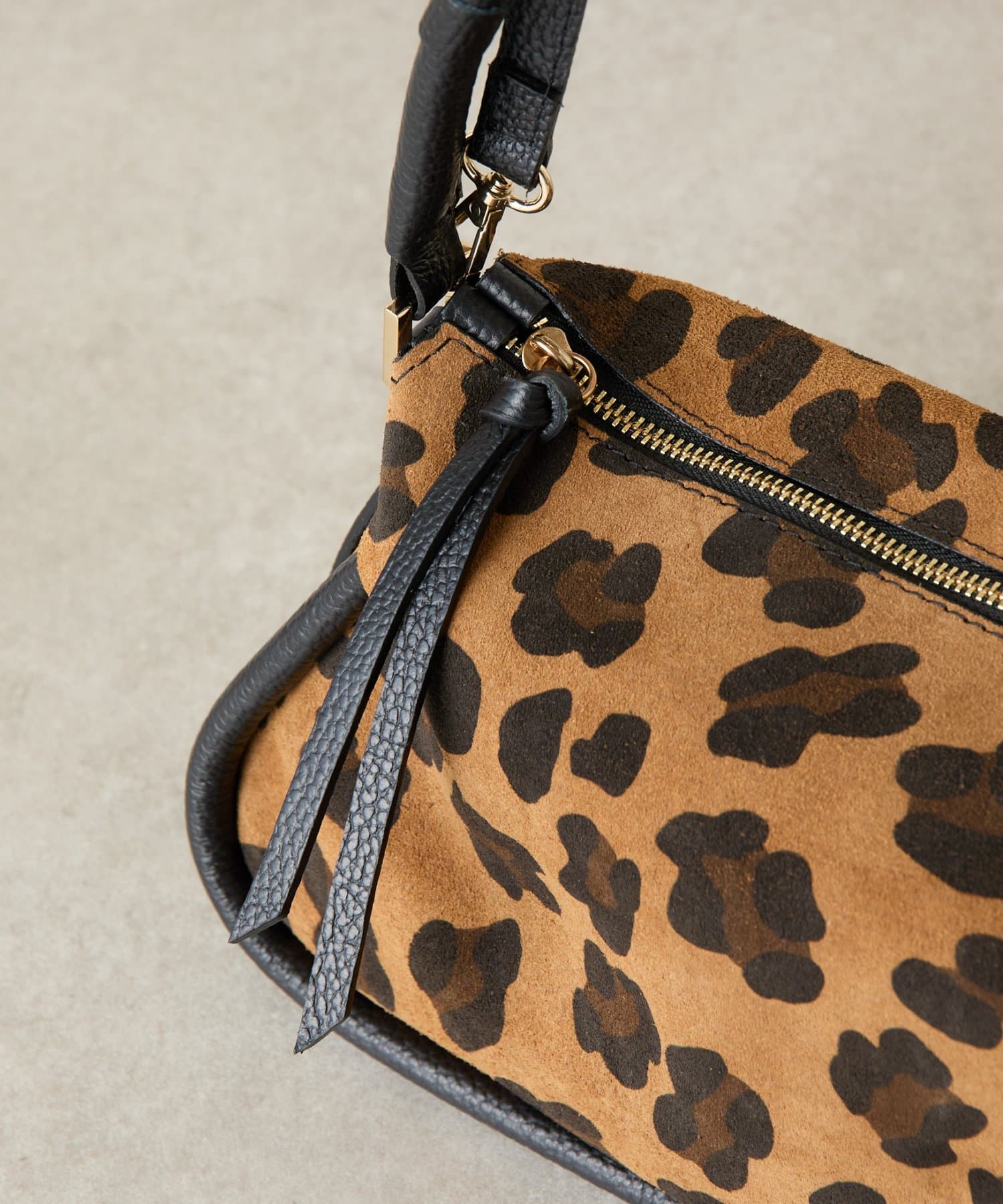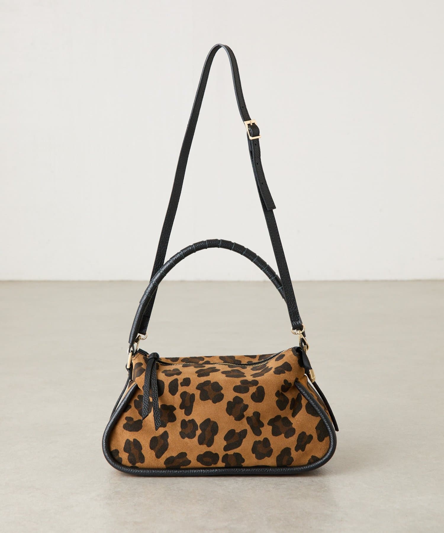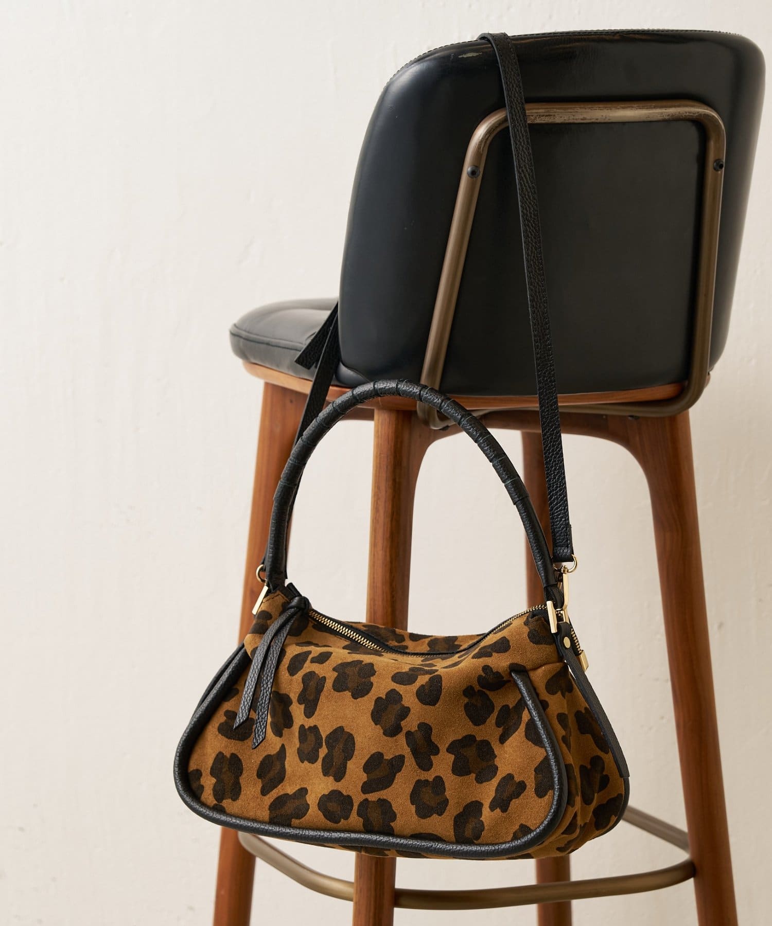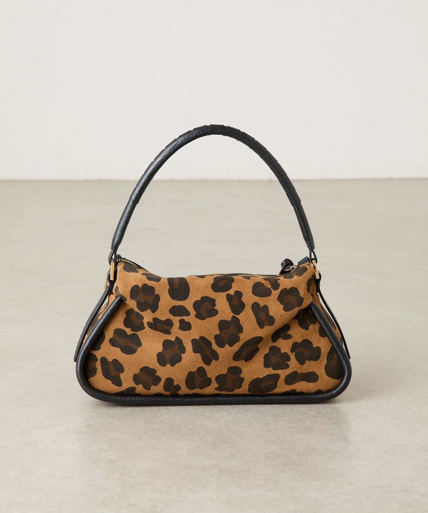 起毛感のあるスエード調のレオパードをメインに、持ち手や引手には肌なじみのよい滑らかなシボ革を組み合わせ、