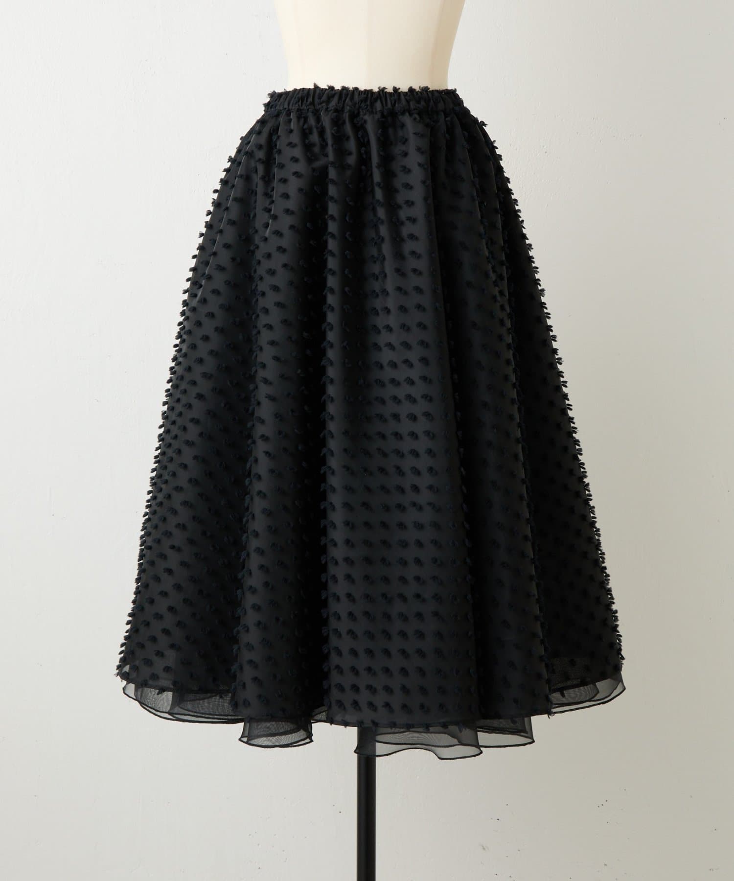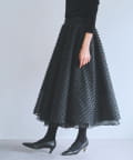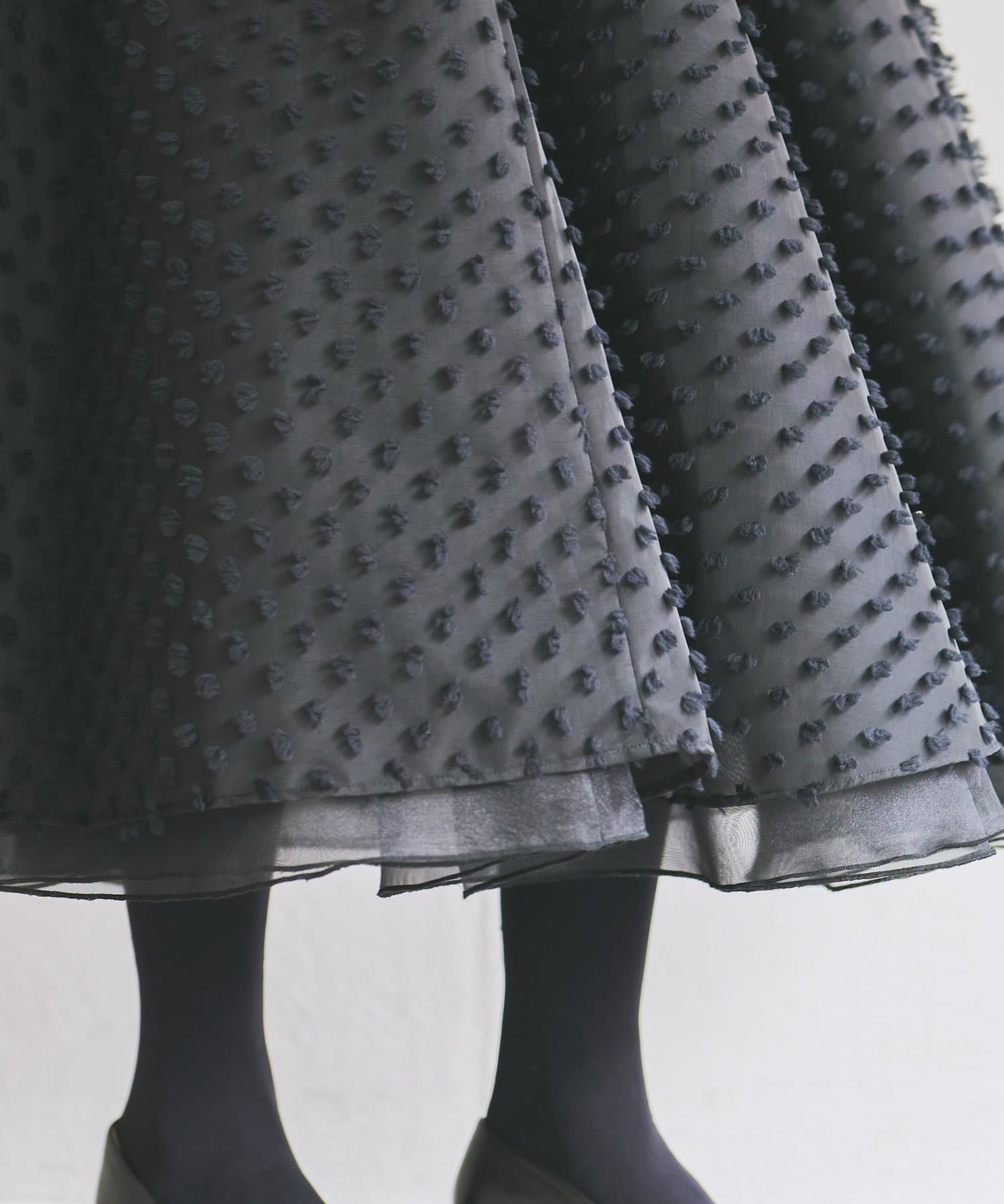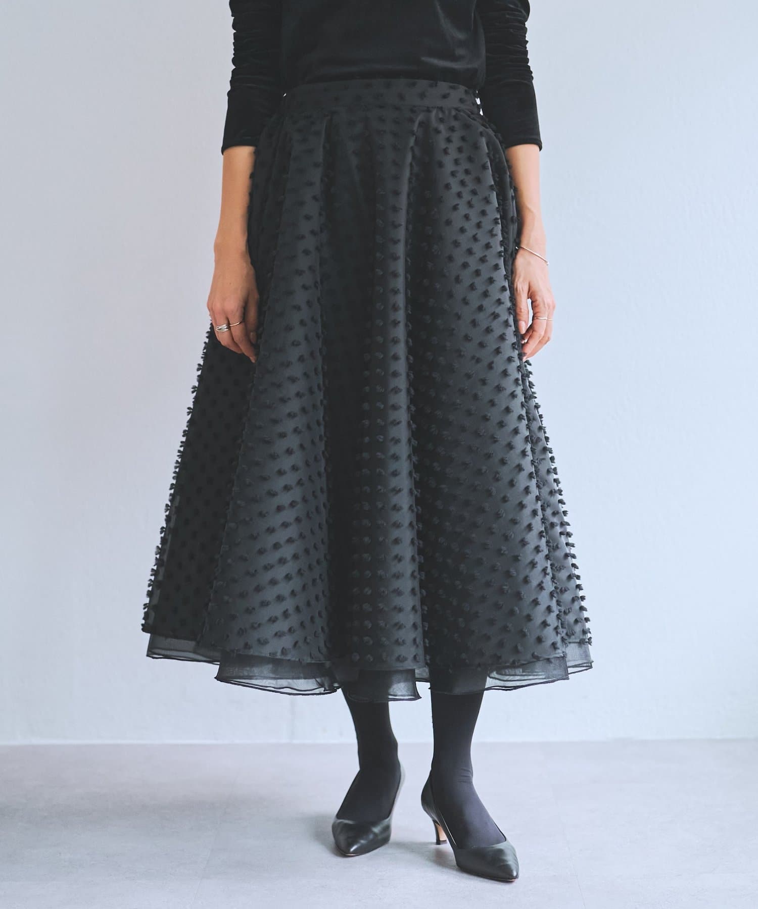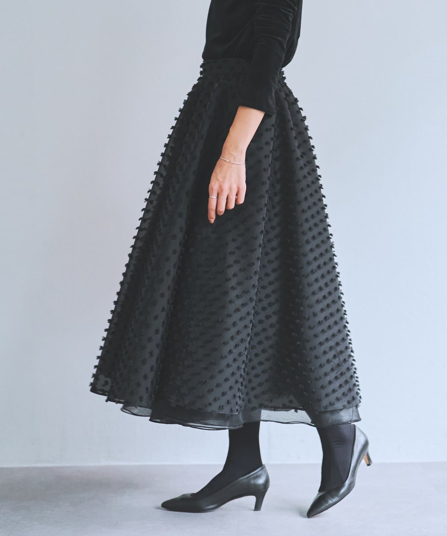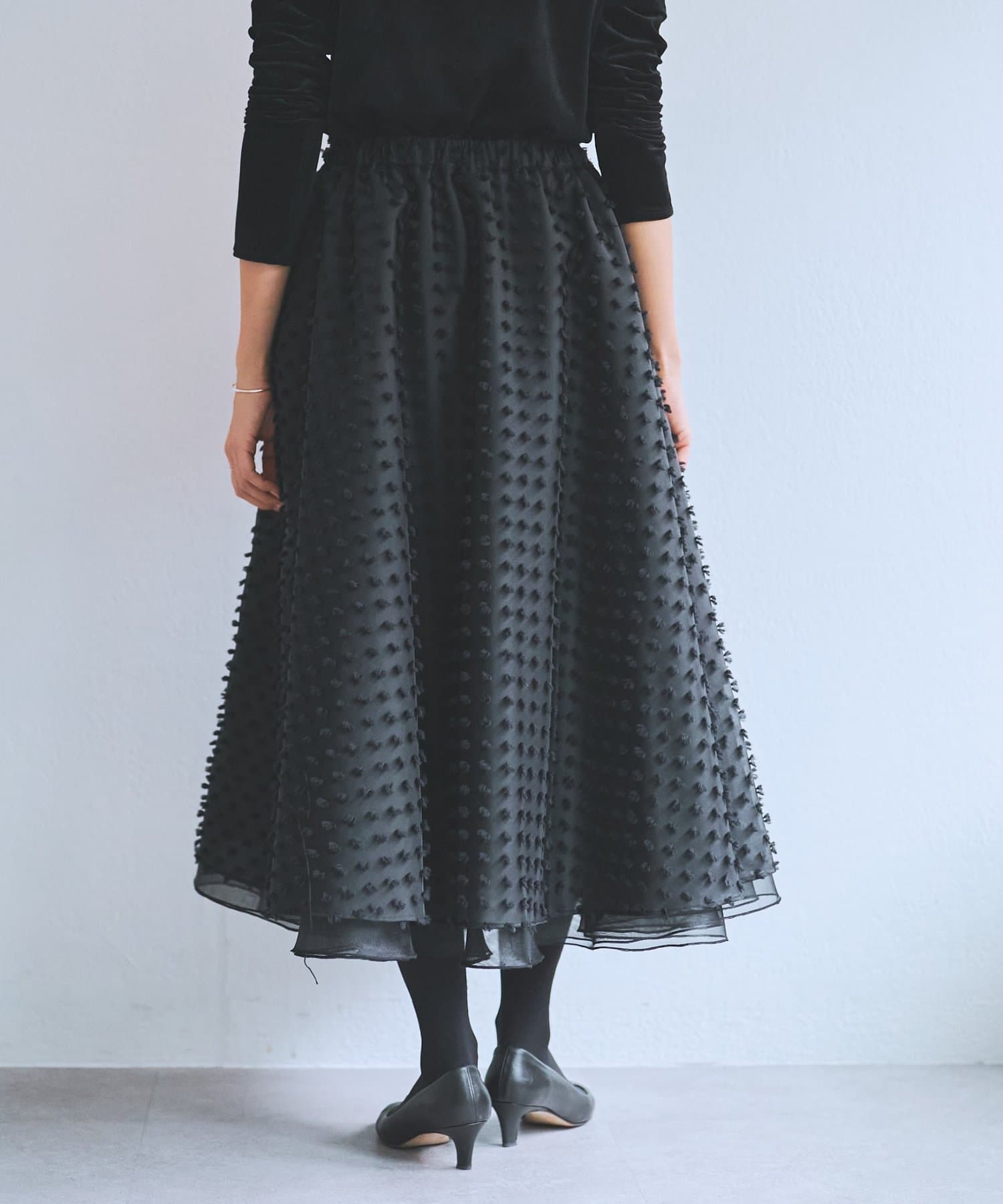 シアー素材を重ね、軽やかなボリューム感を引き出したジャガードスカート。