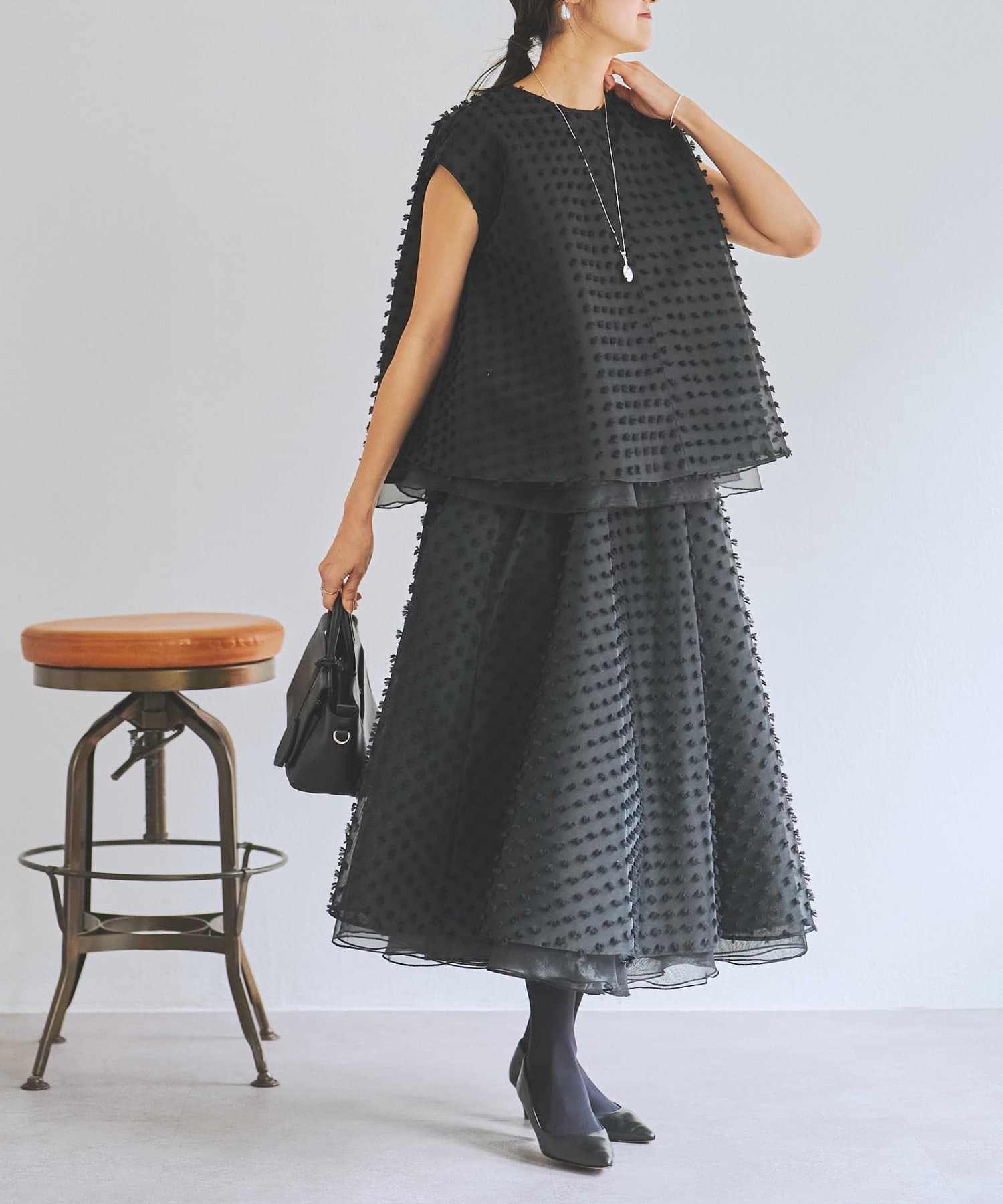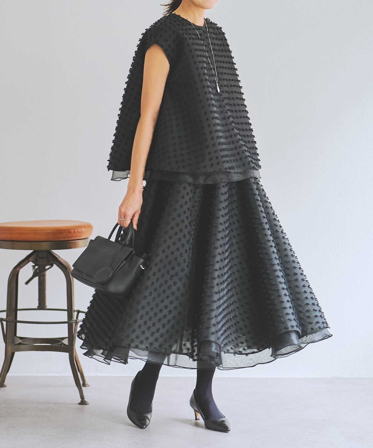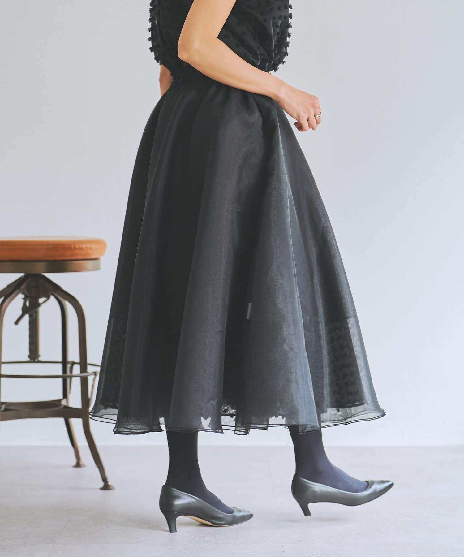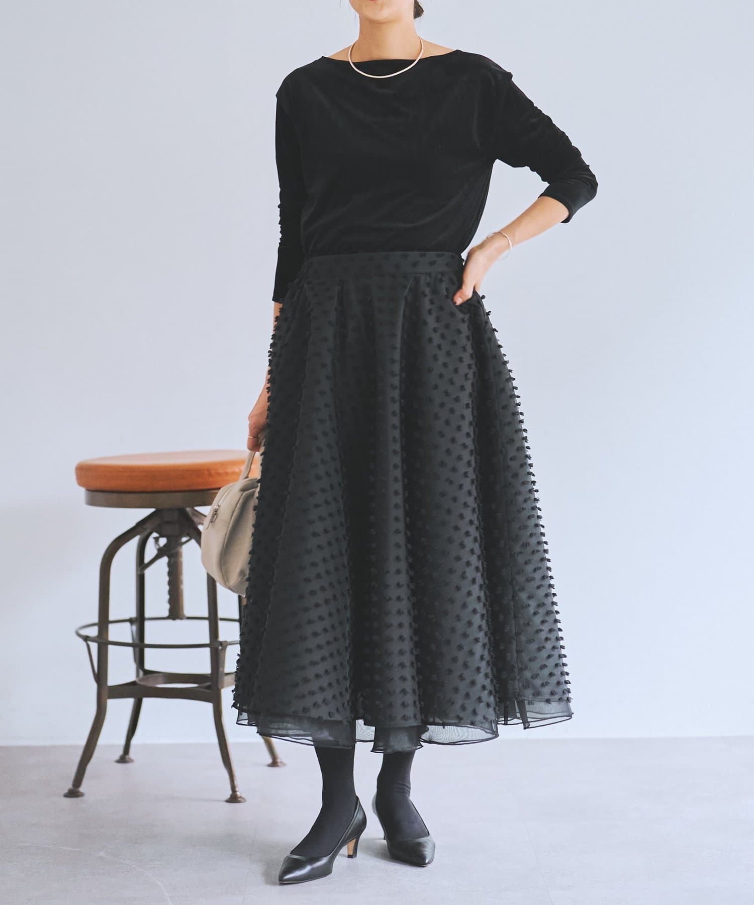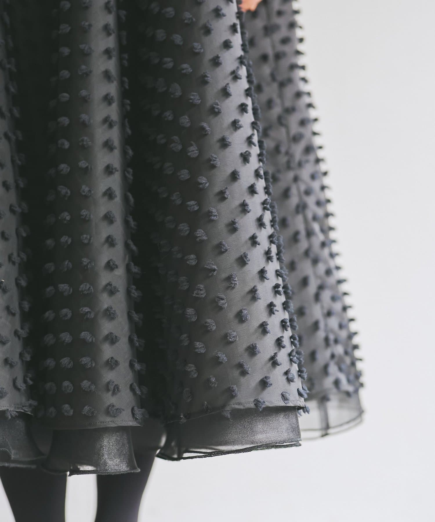 シアー素材を重ね、軽やかなボリューム感を引き出したジャガードスカート。