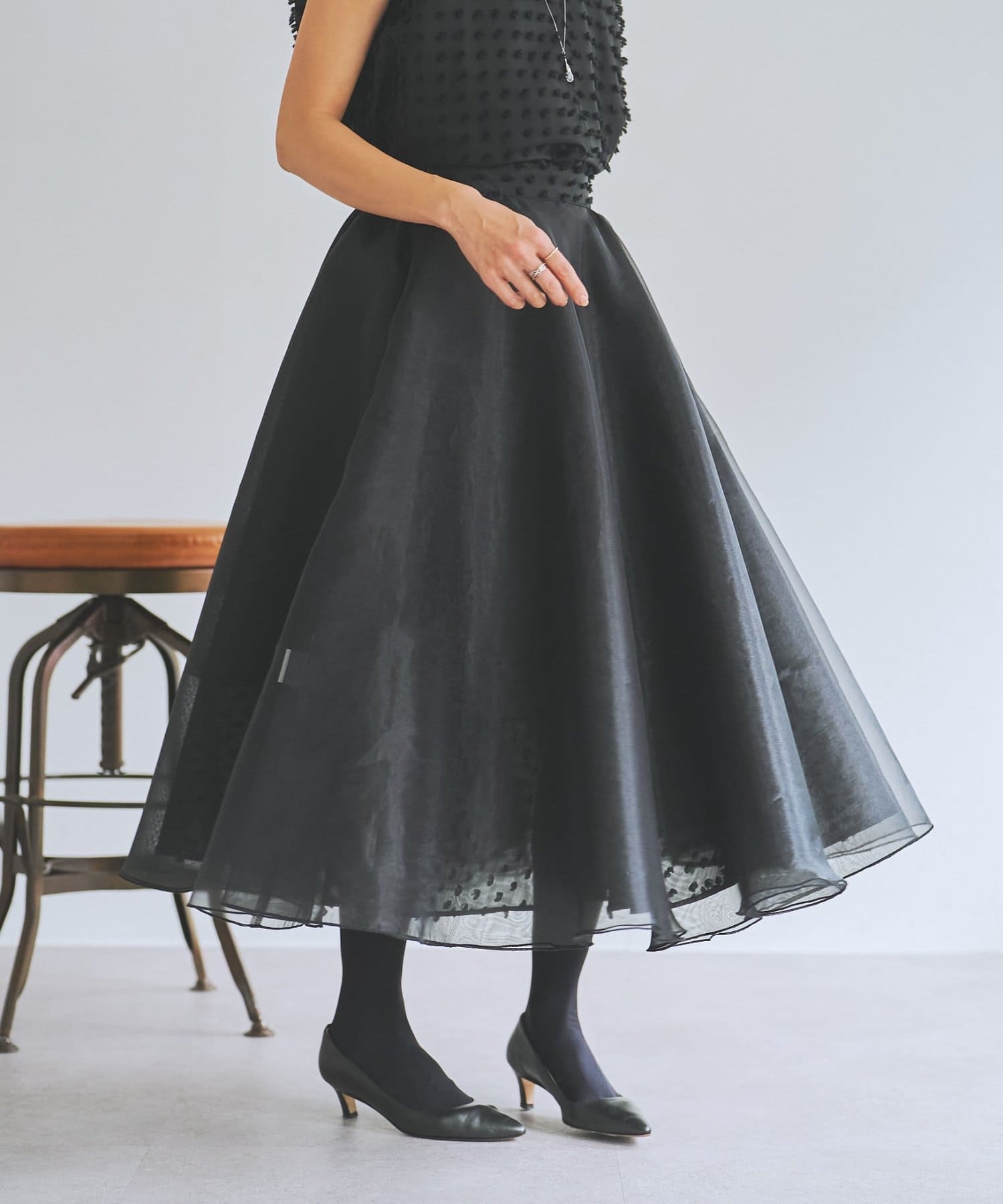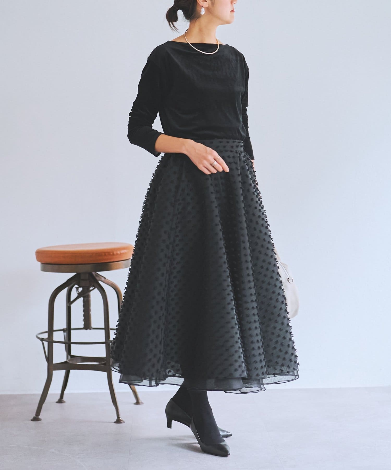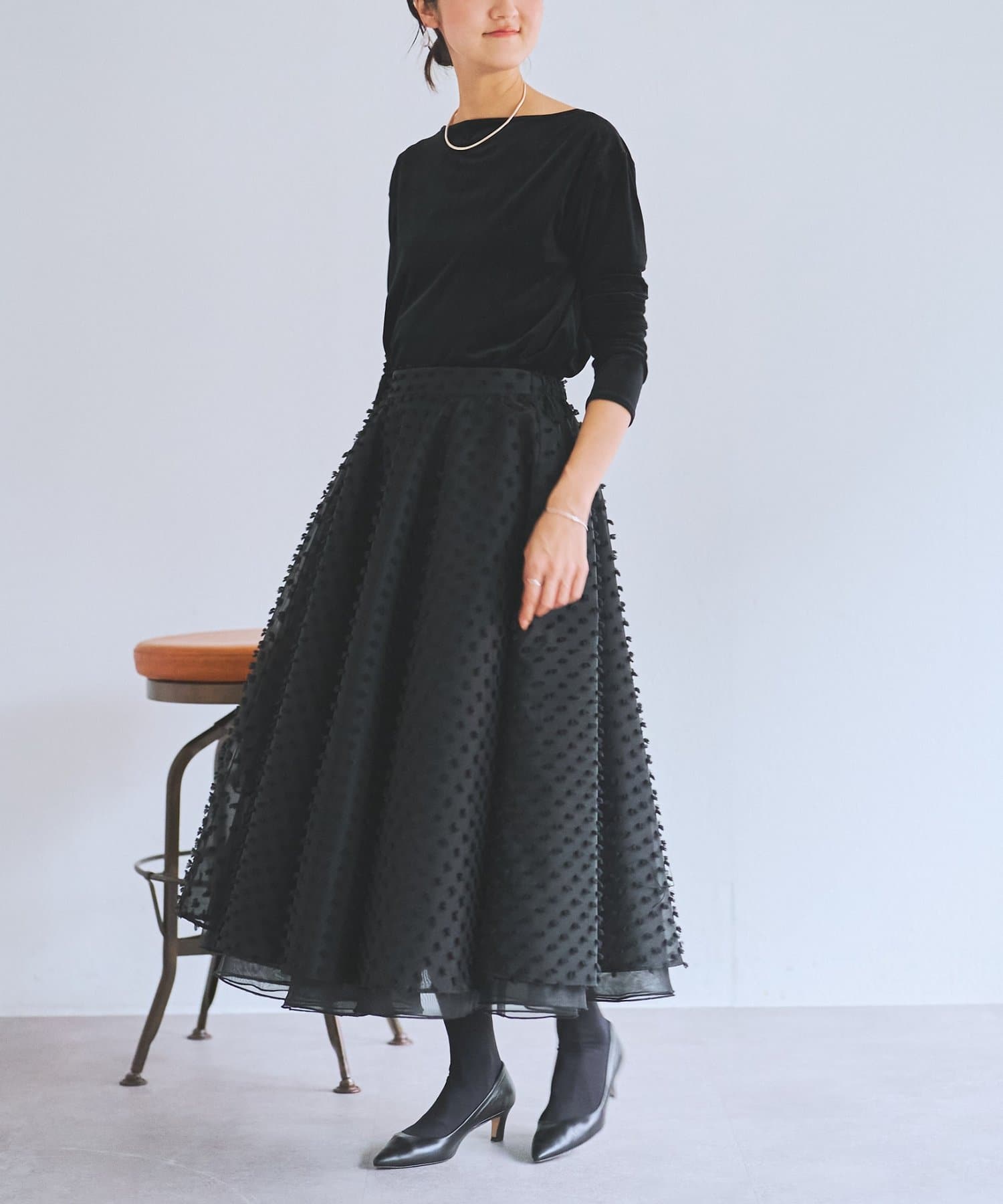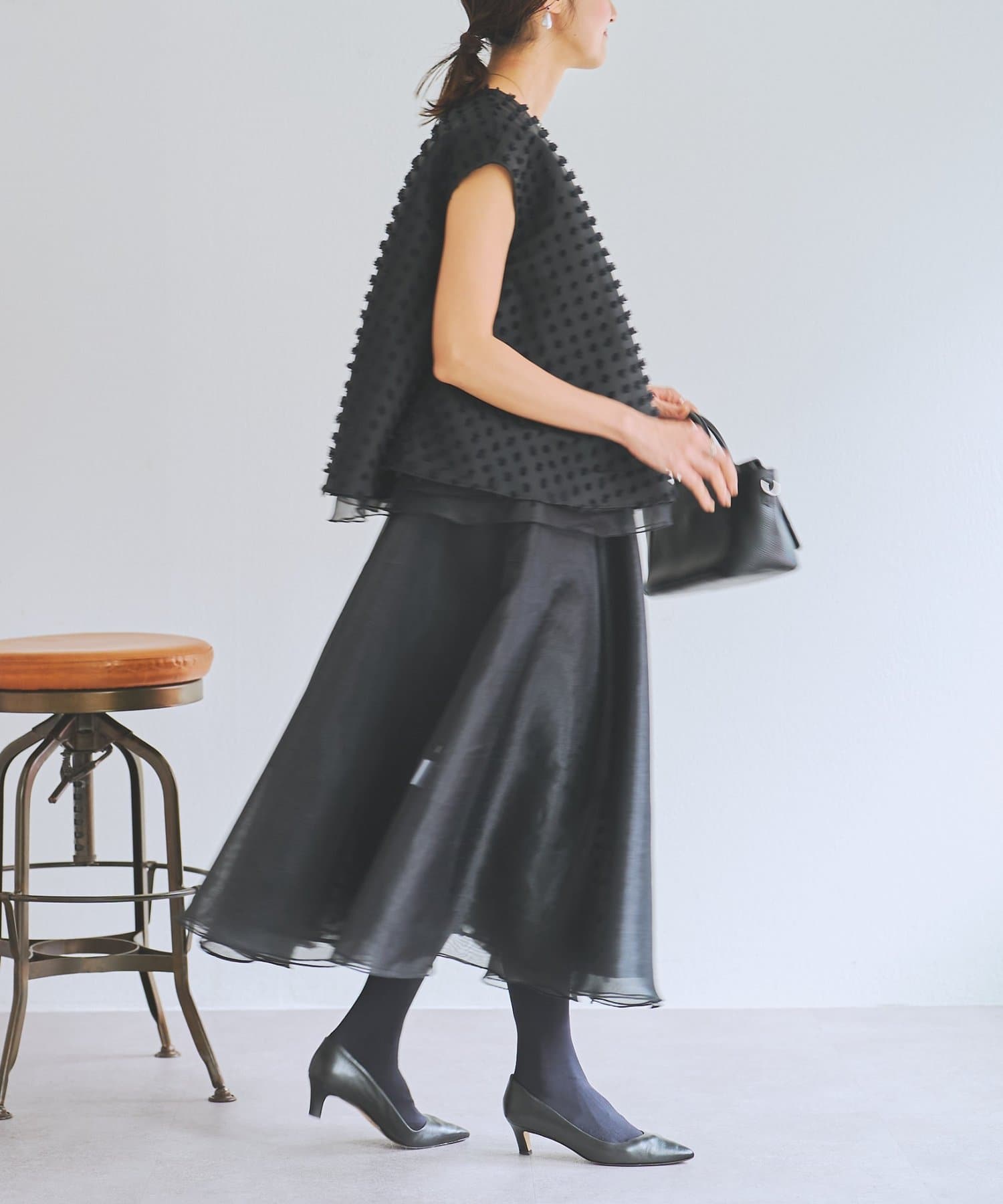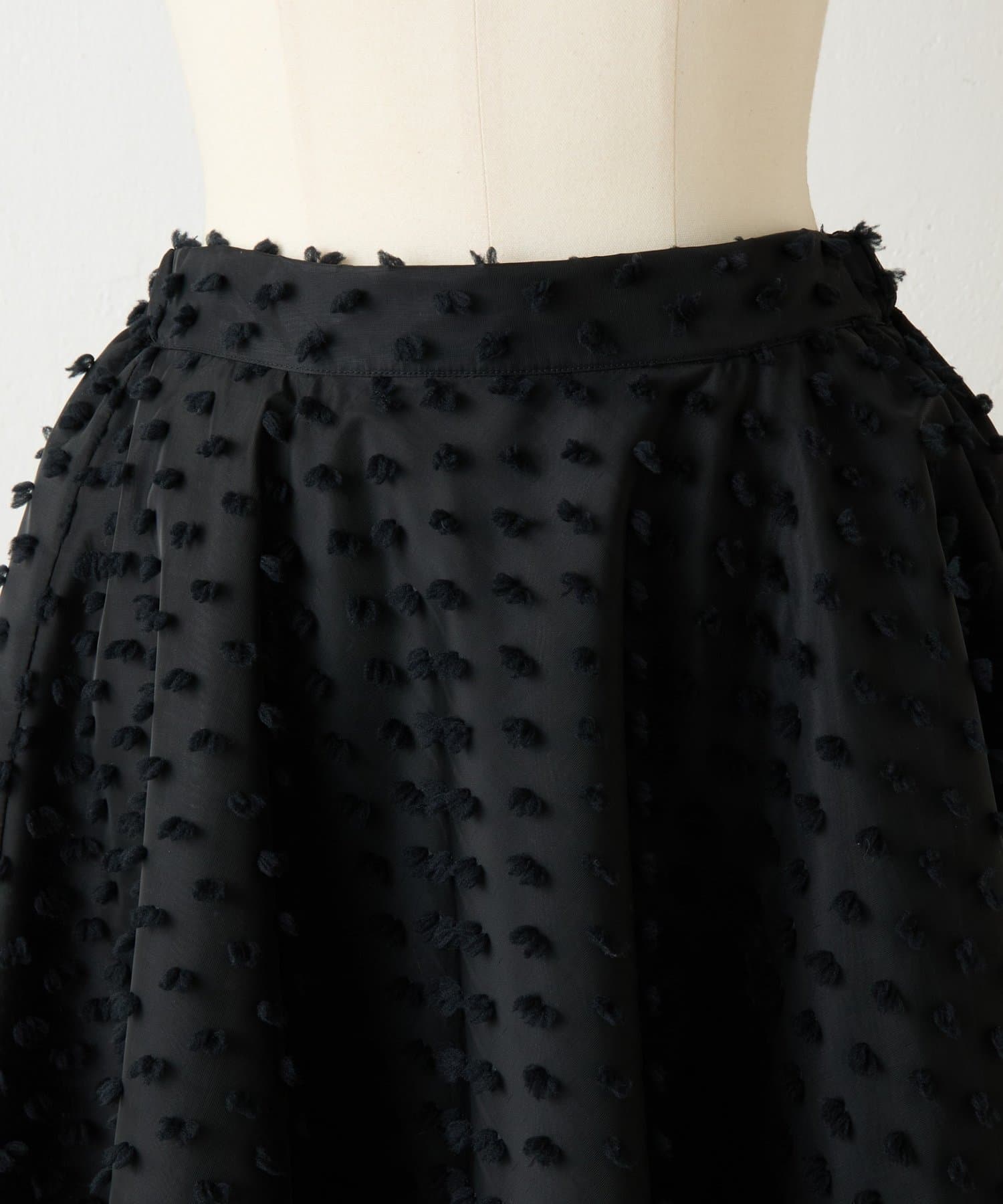 シアー素材を重ね、軽やかなボリューム感を引き出したジャガードスカート。