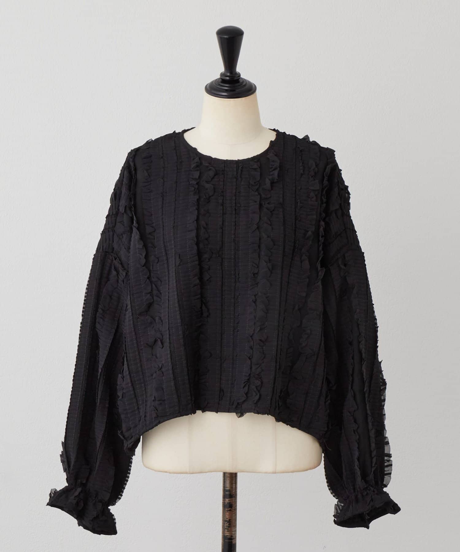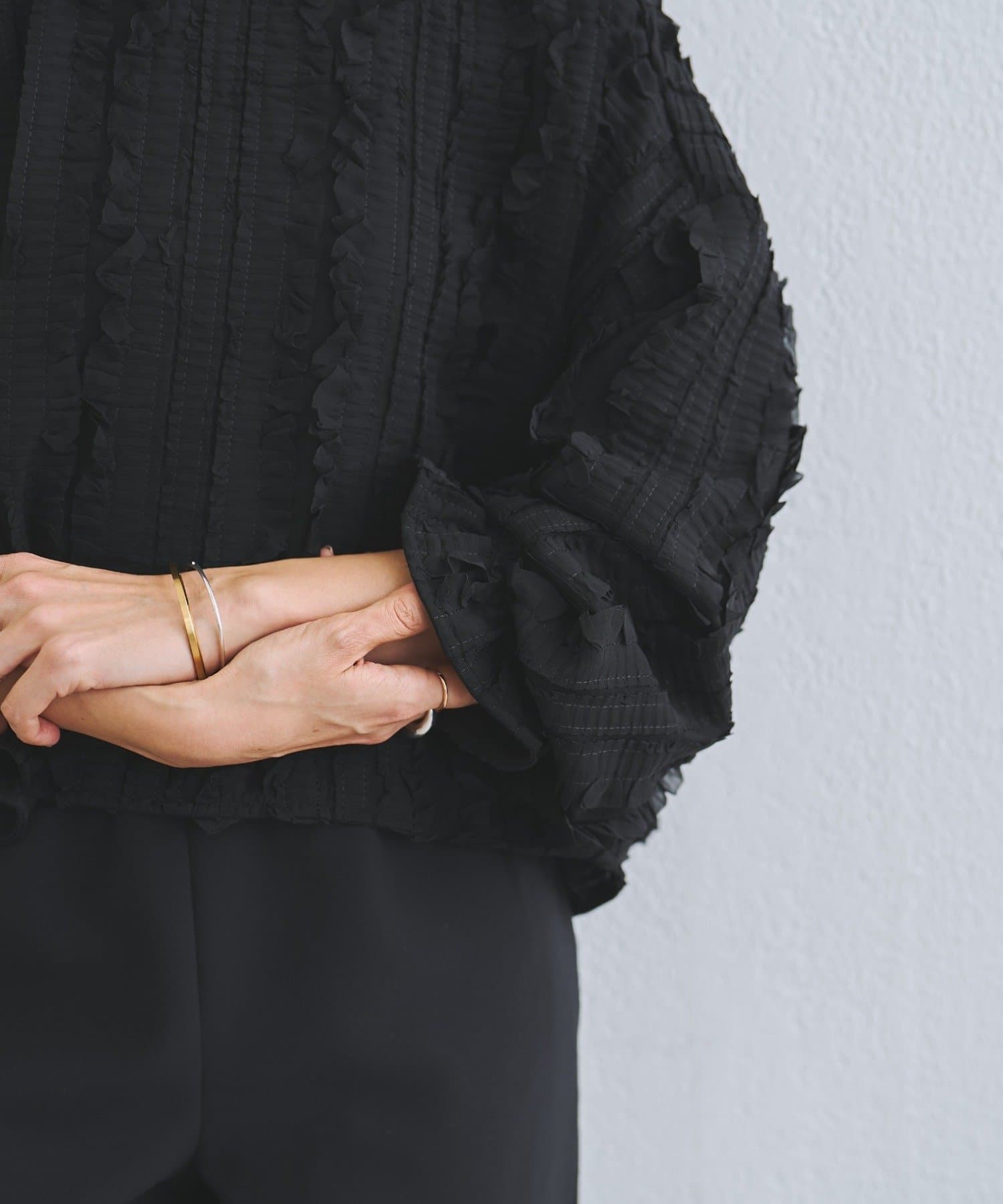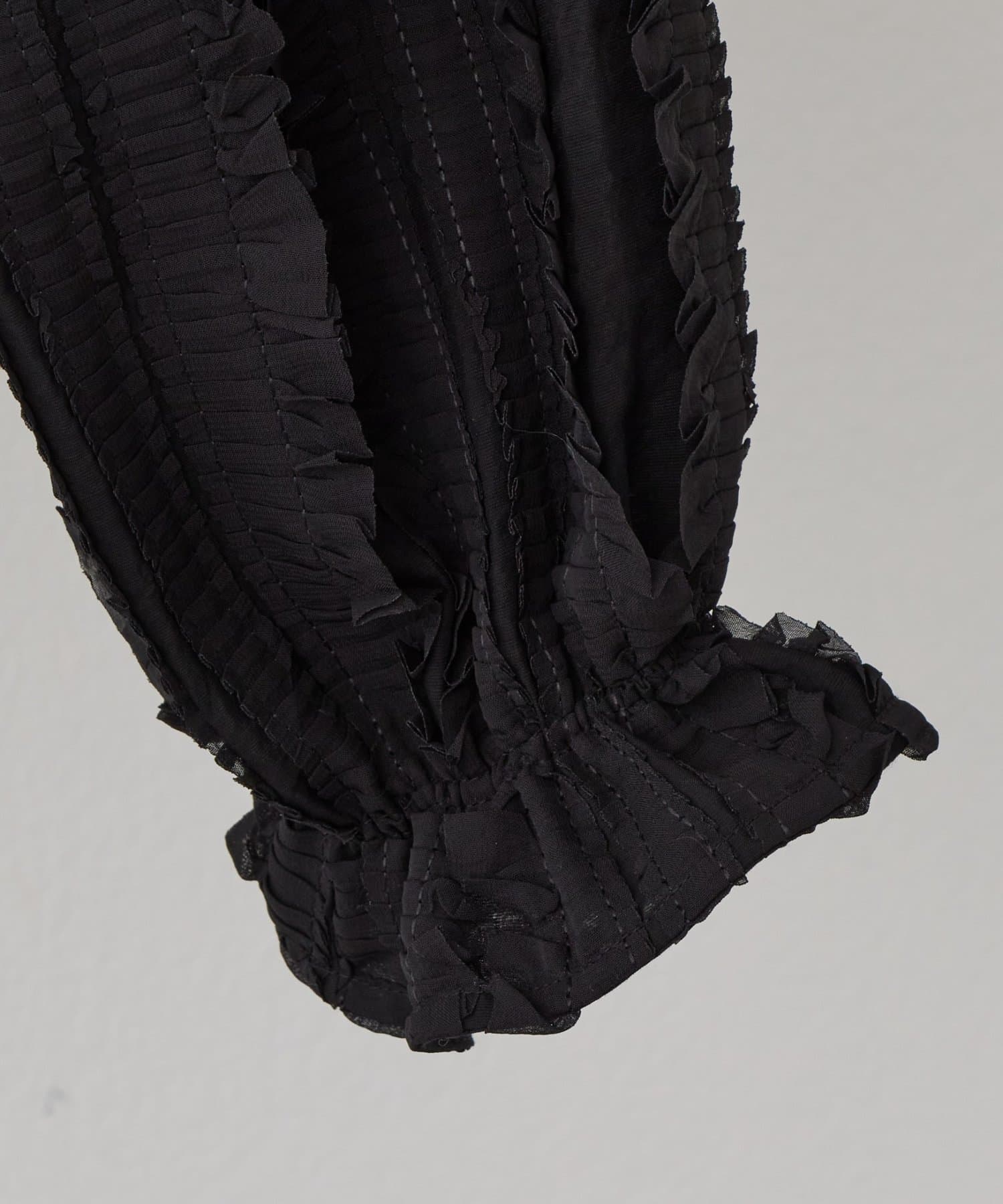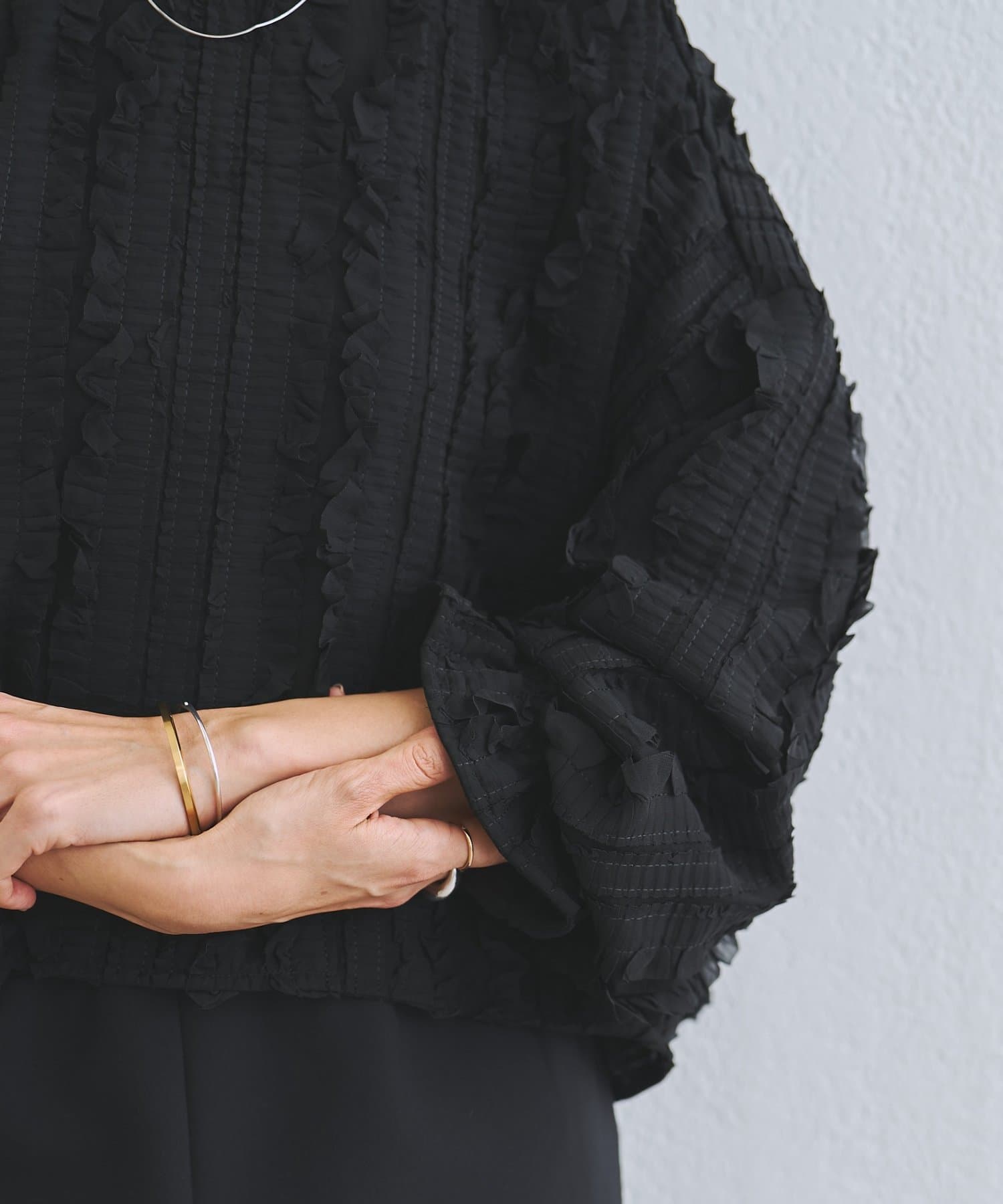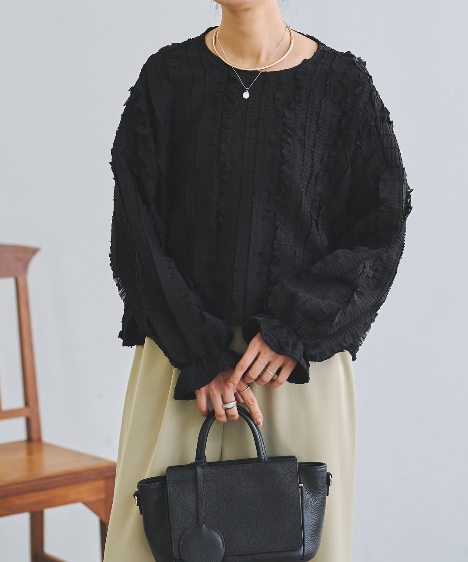 細かなプリーツとフリルを重ねた表情豊かなブラウス。