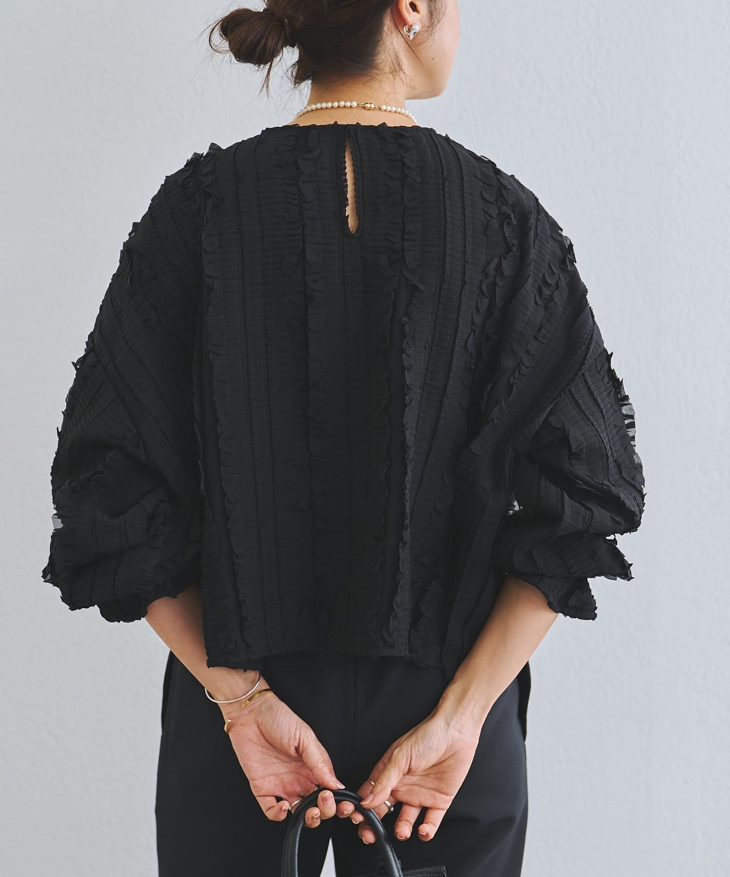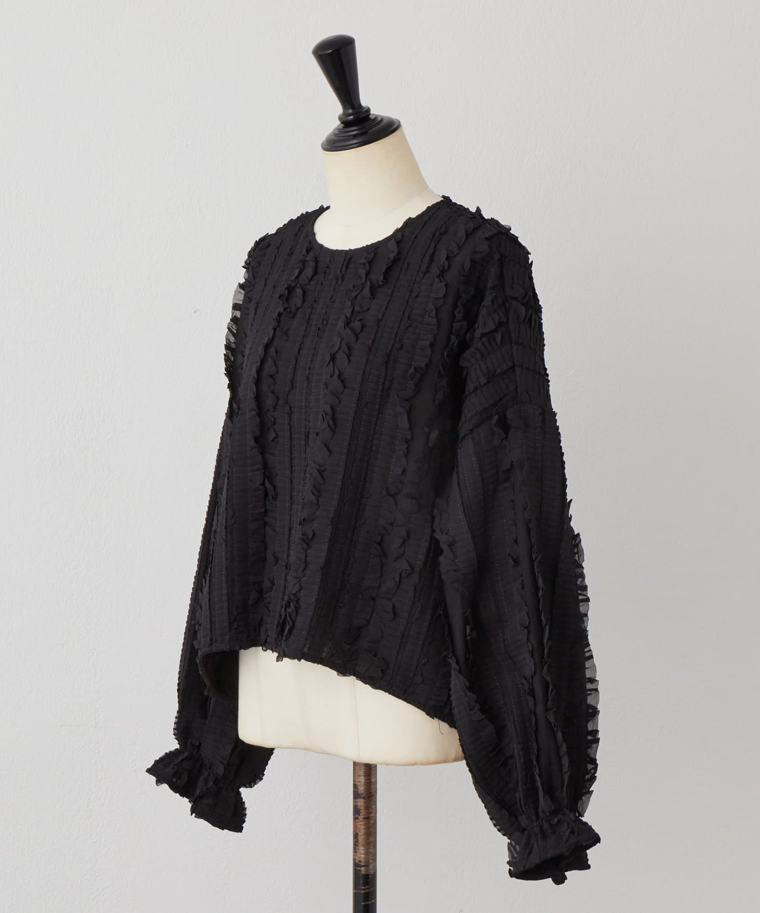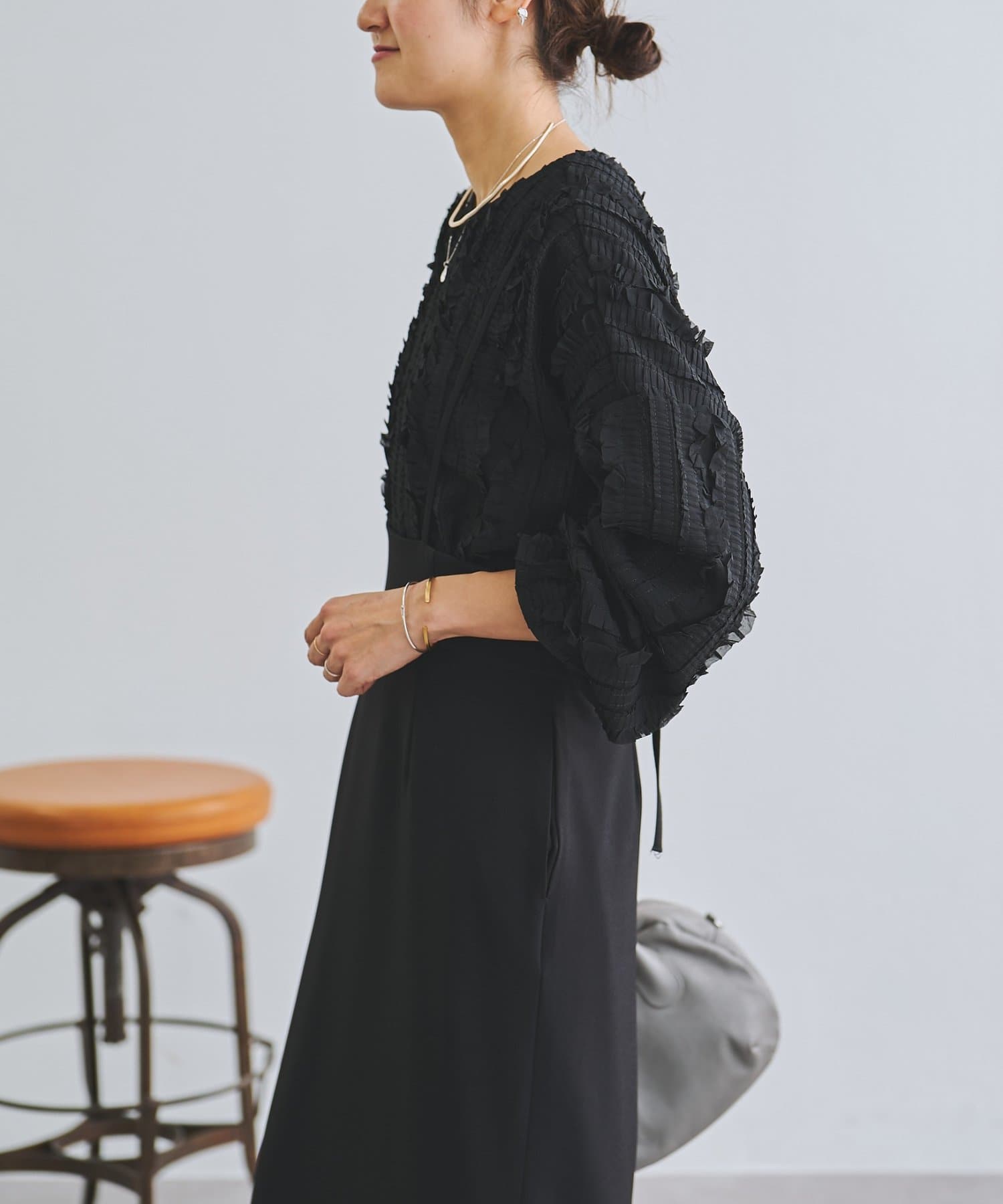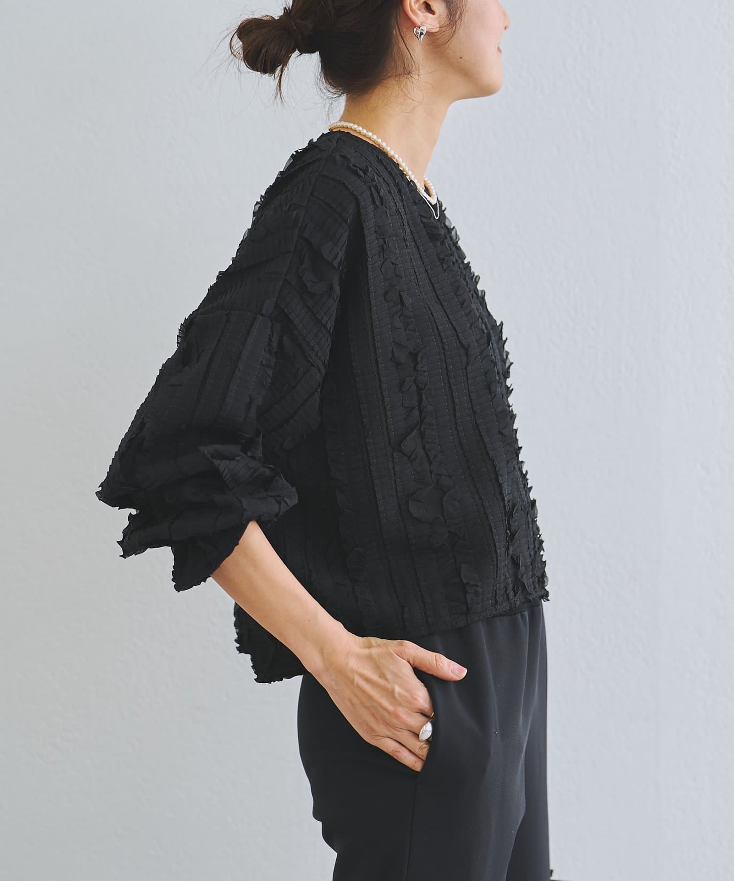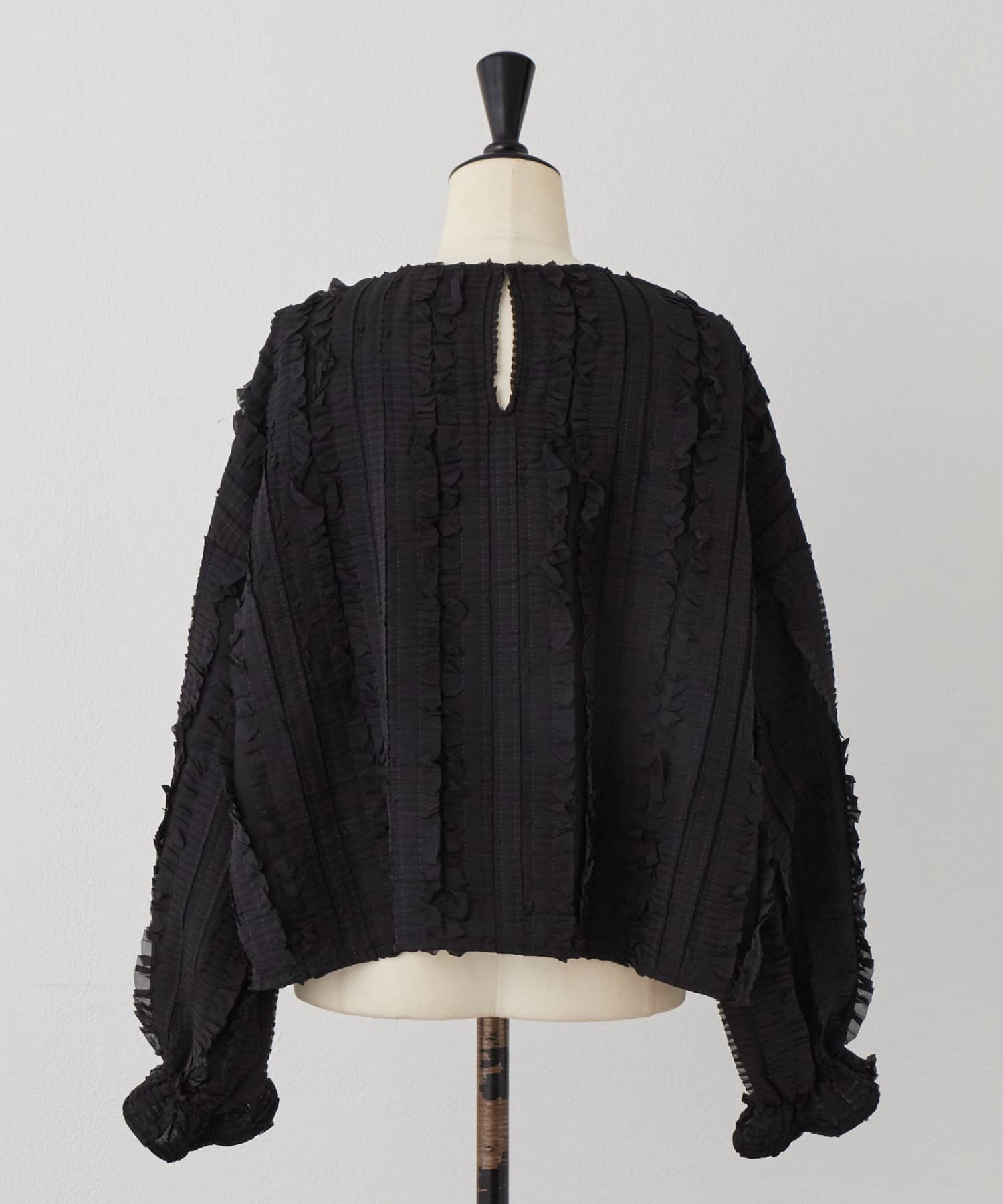 細かなプリーツとフリルを重ねた表情豊かなブラウス。