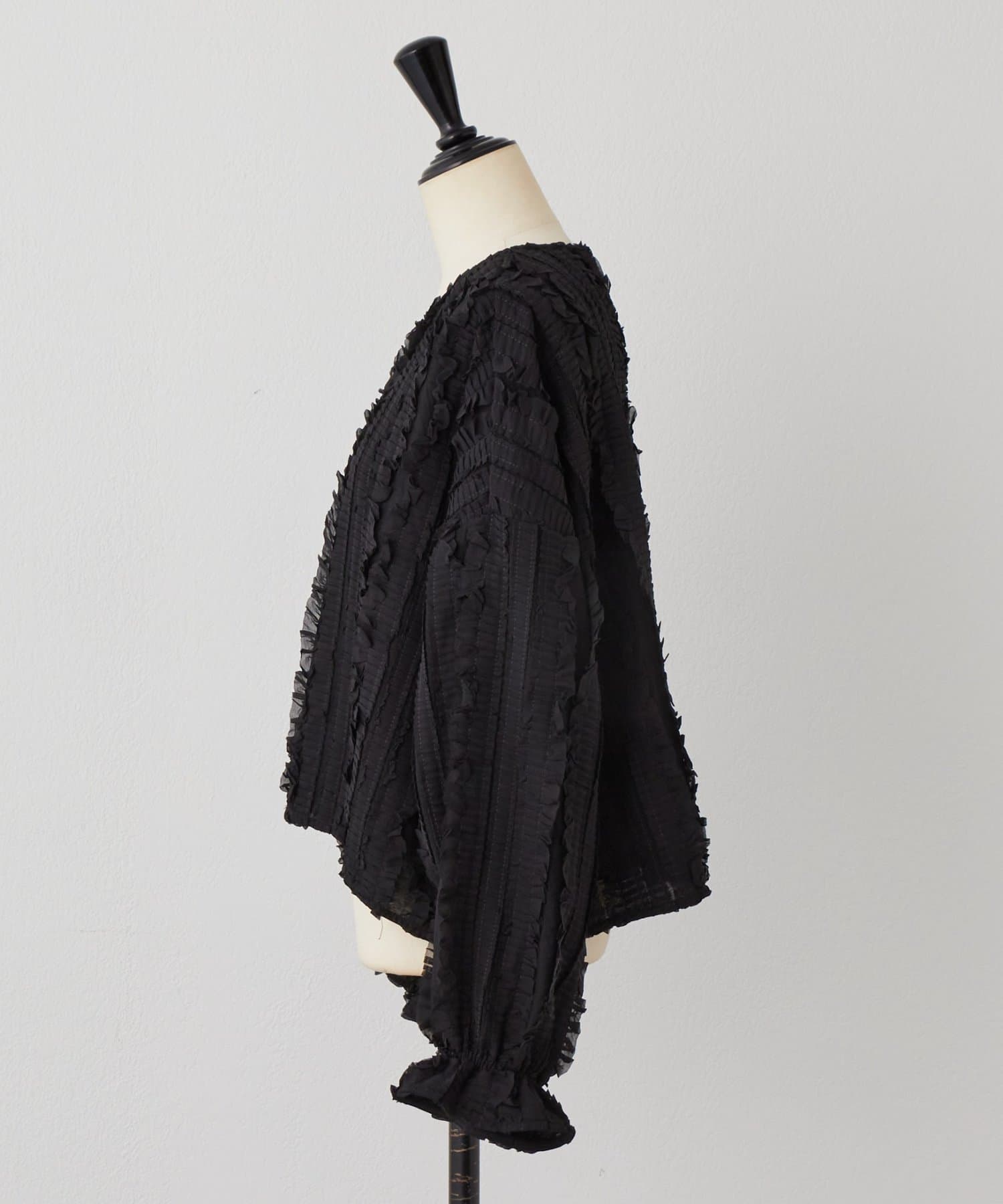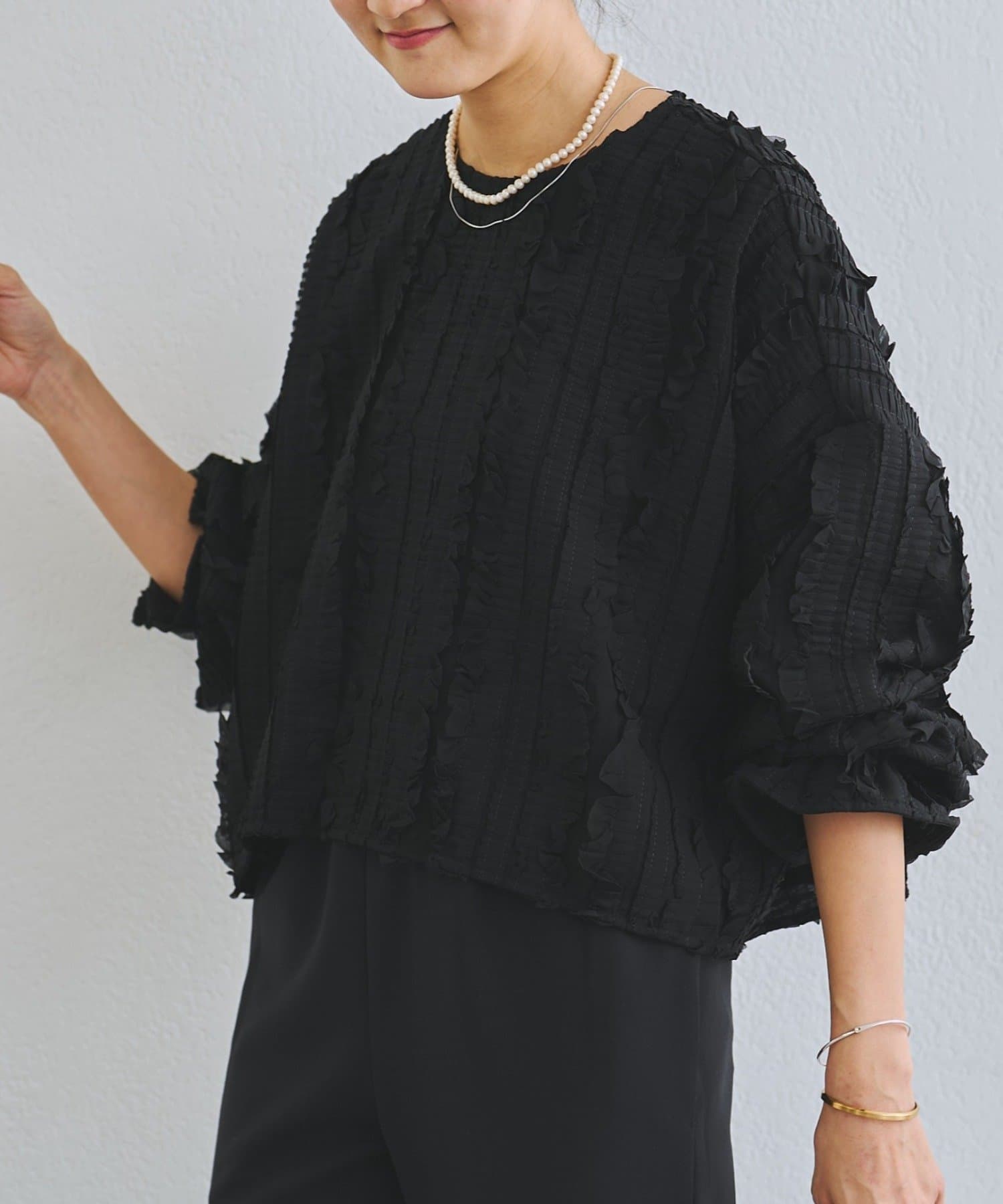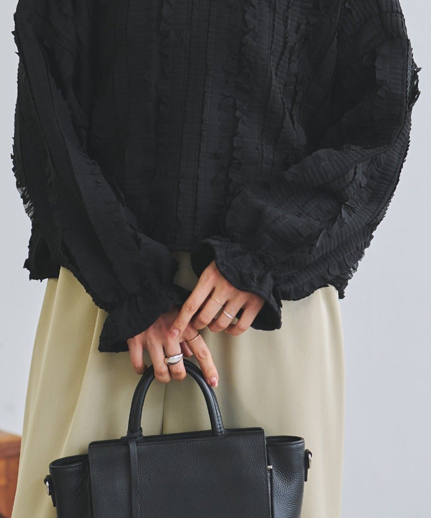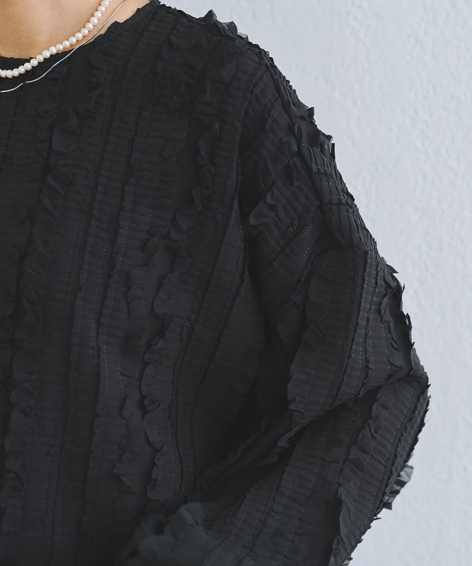 細かなプリーツとフリルを重ねた表情豊かなブラウス。