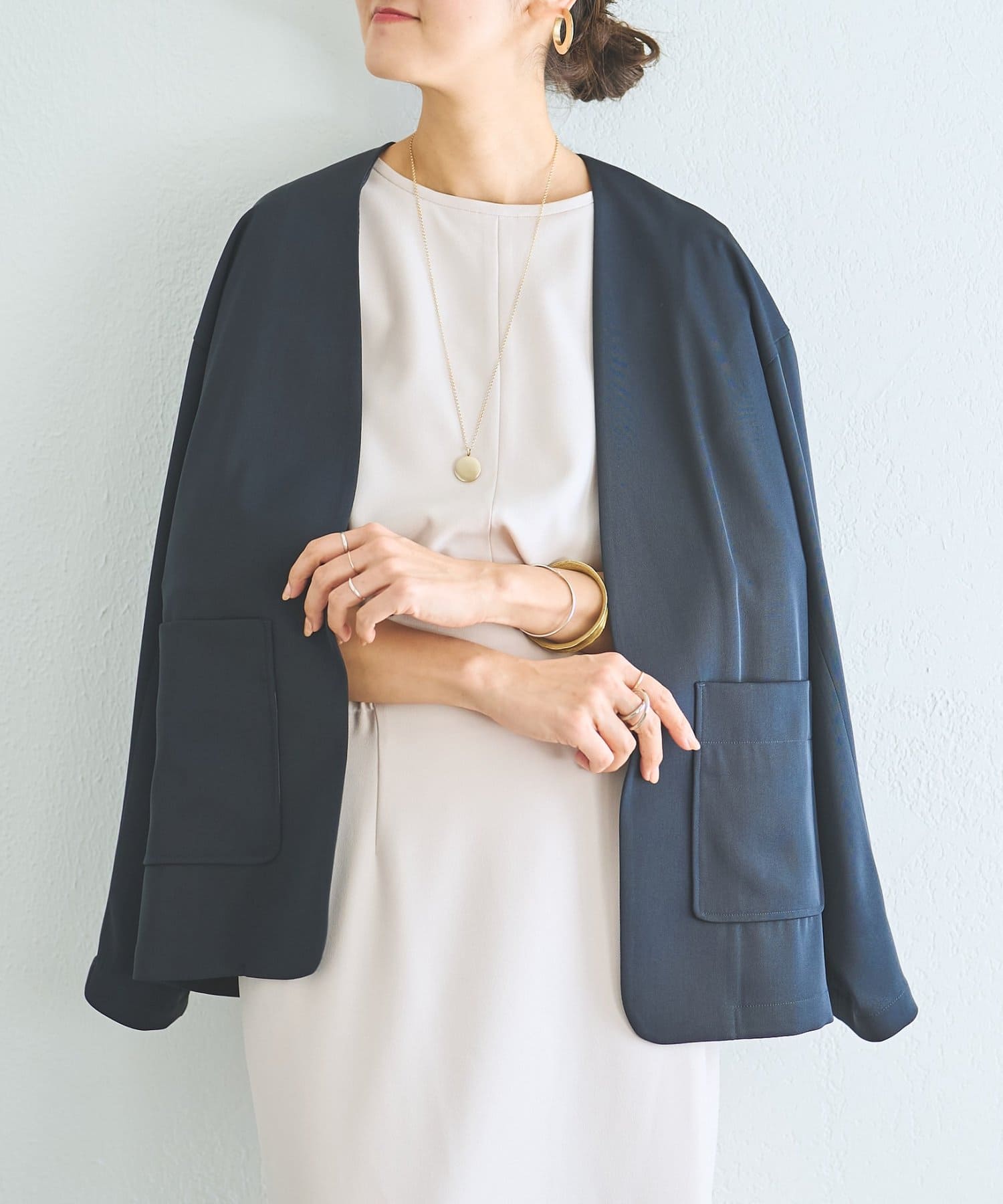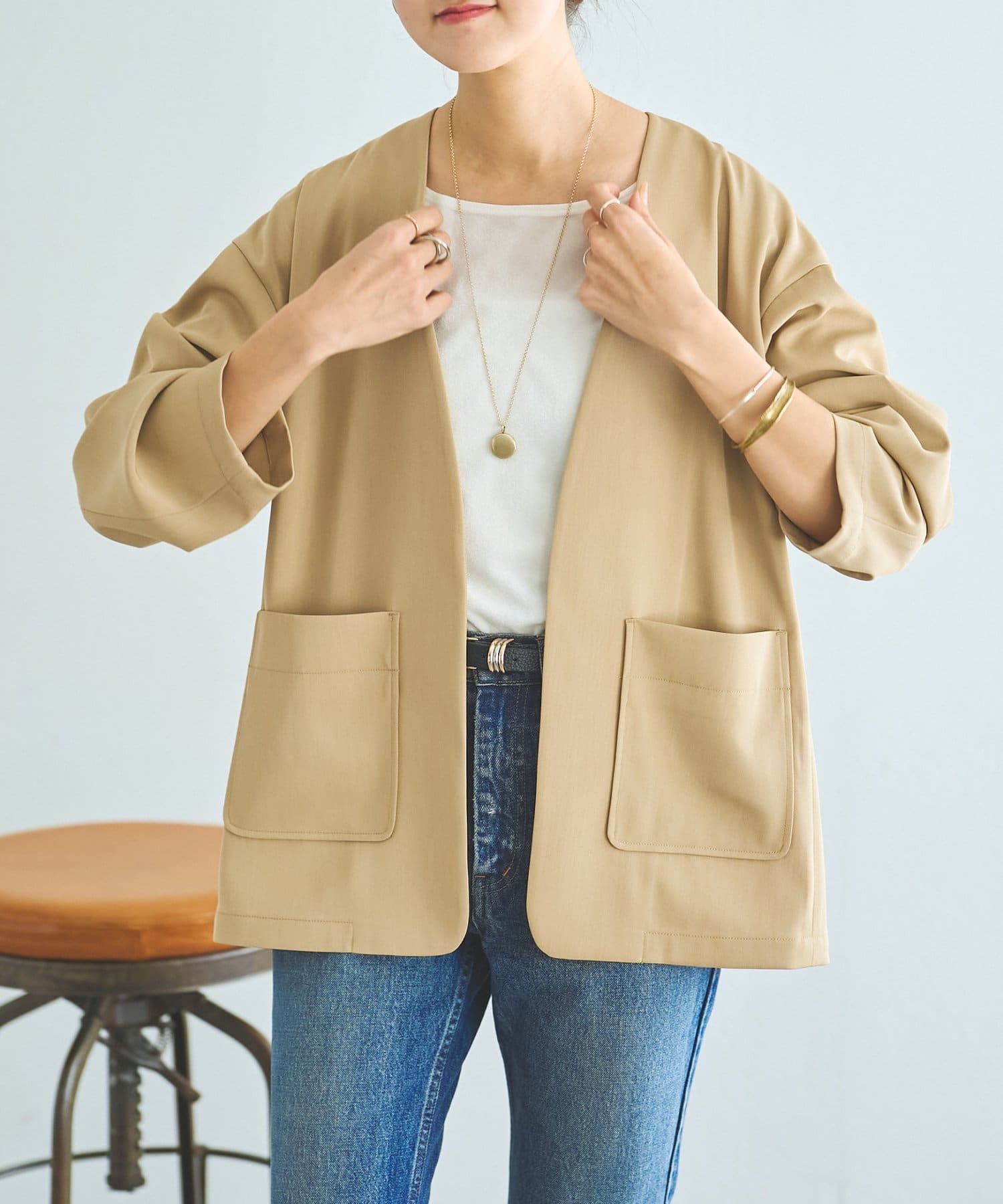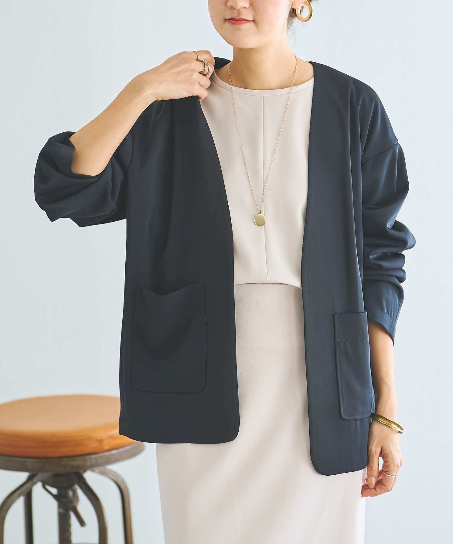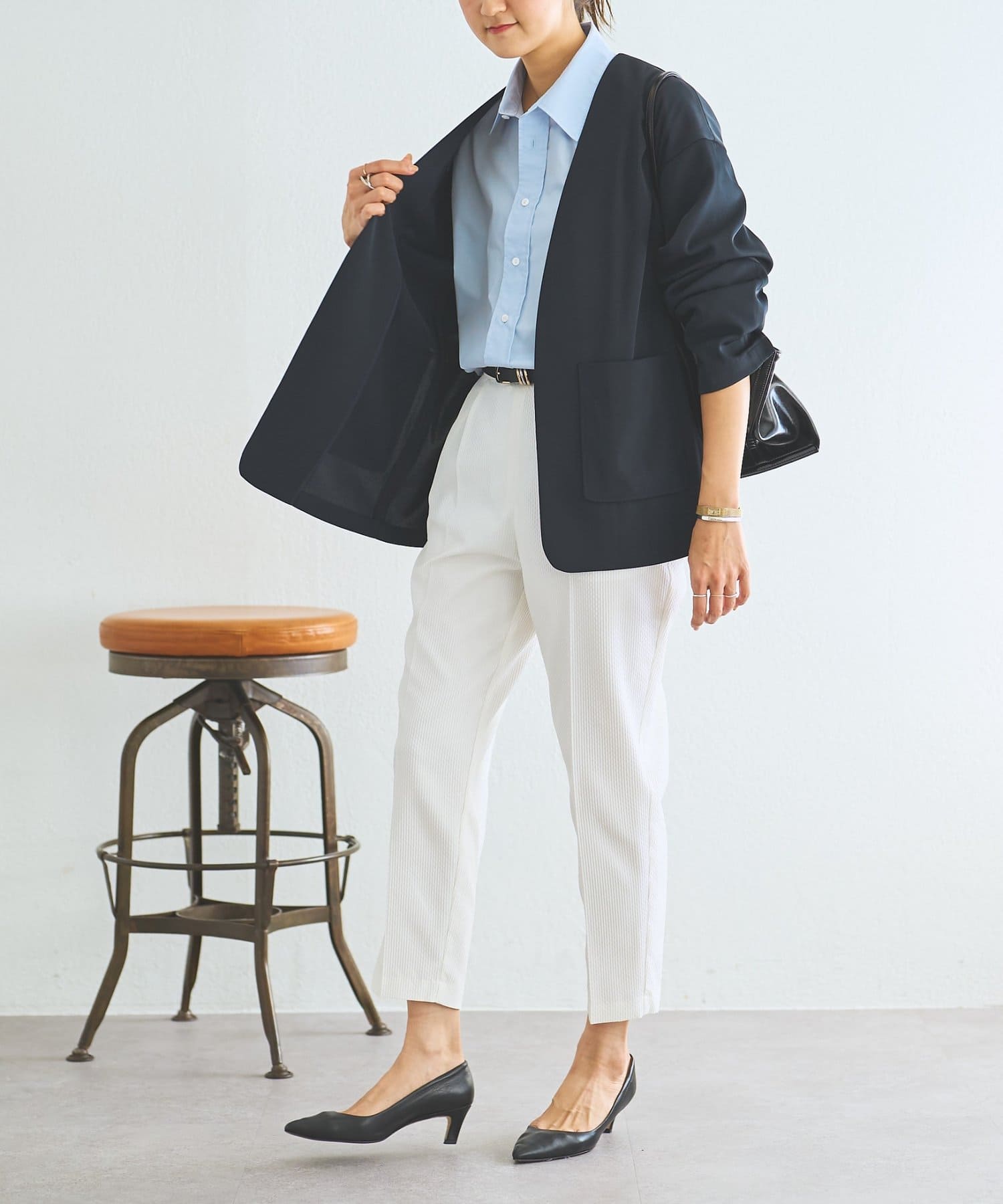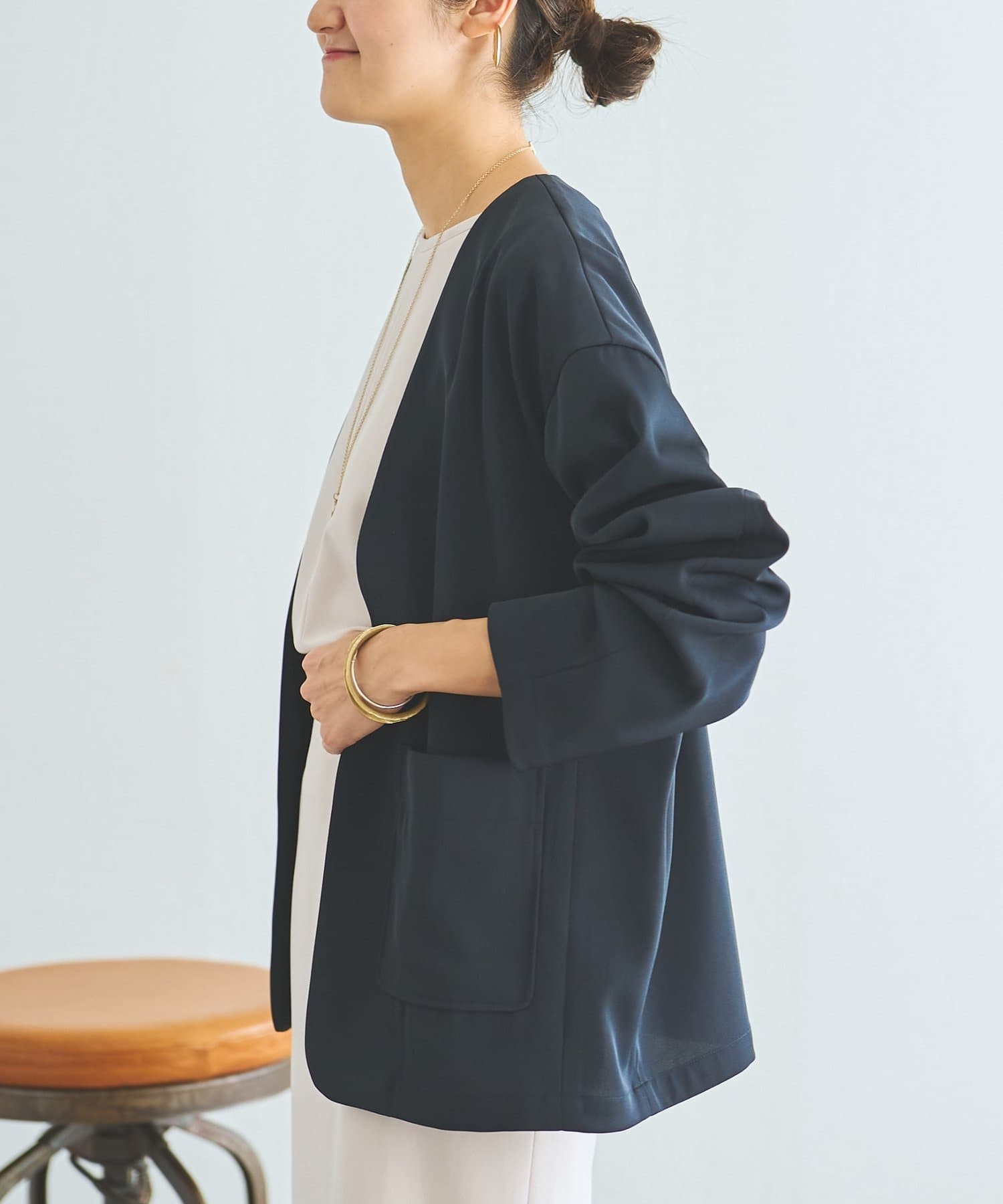 すっきりとした衿元で、さっと羽織るだけできちんと感を演出できるノーカラージャケット。