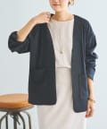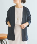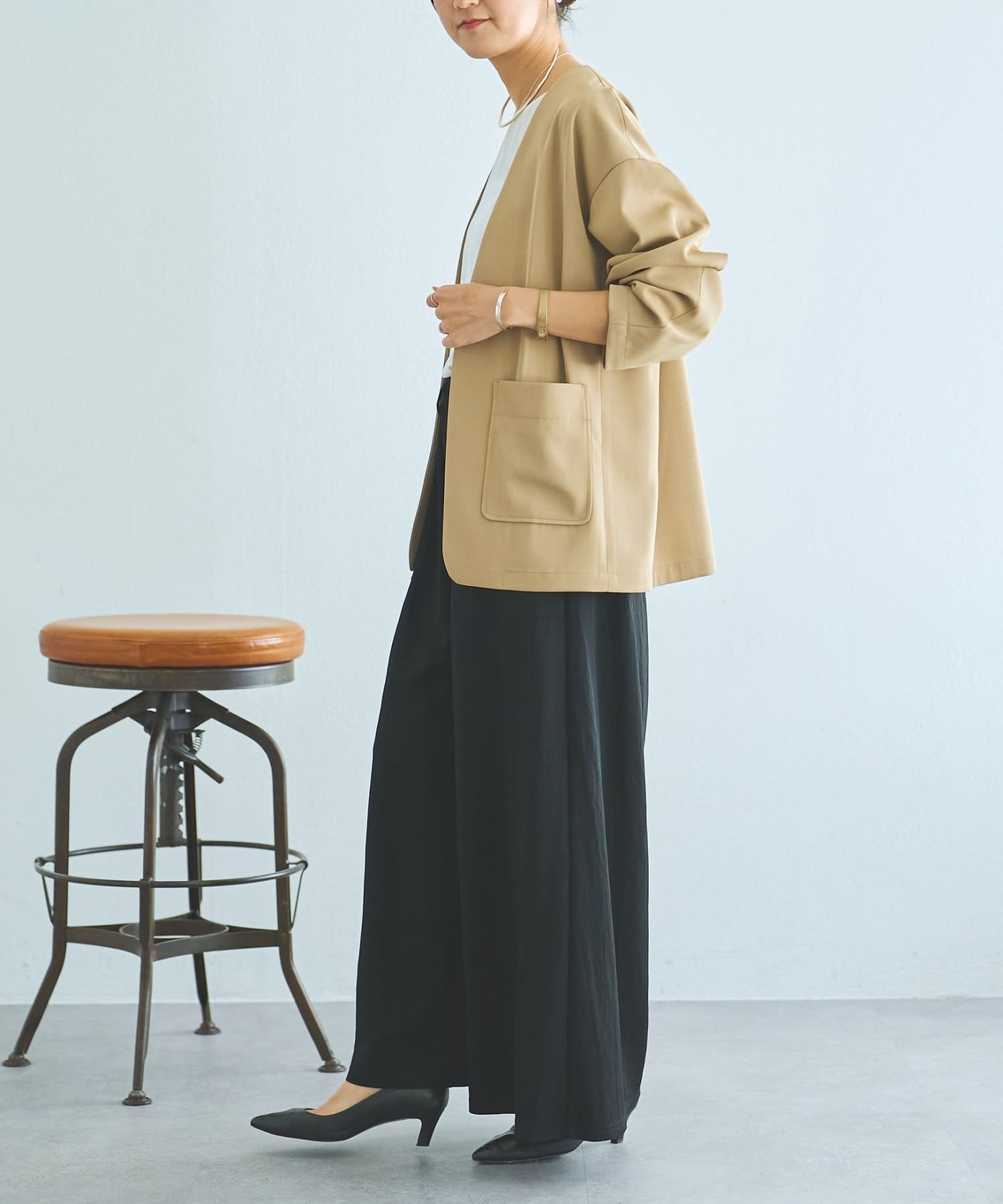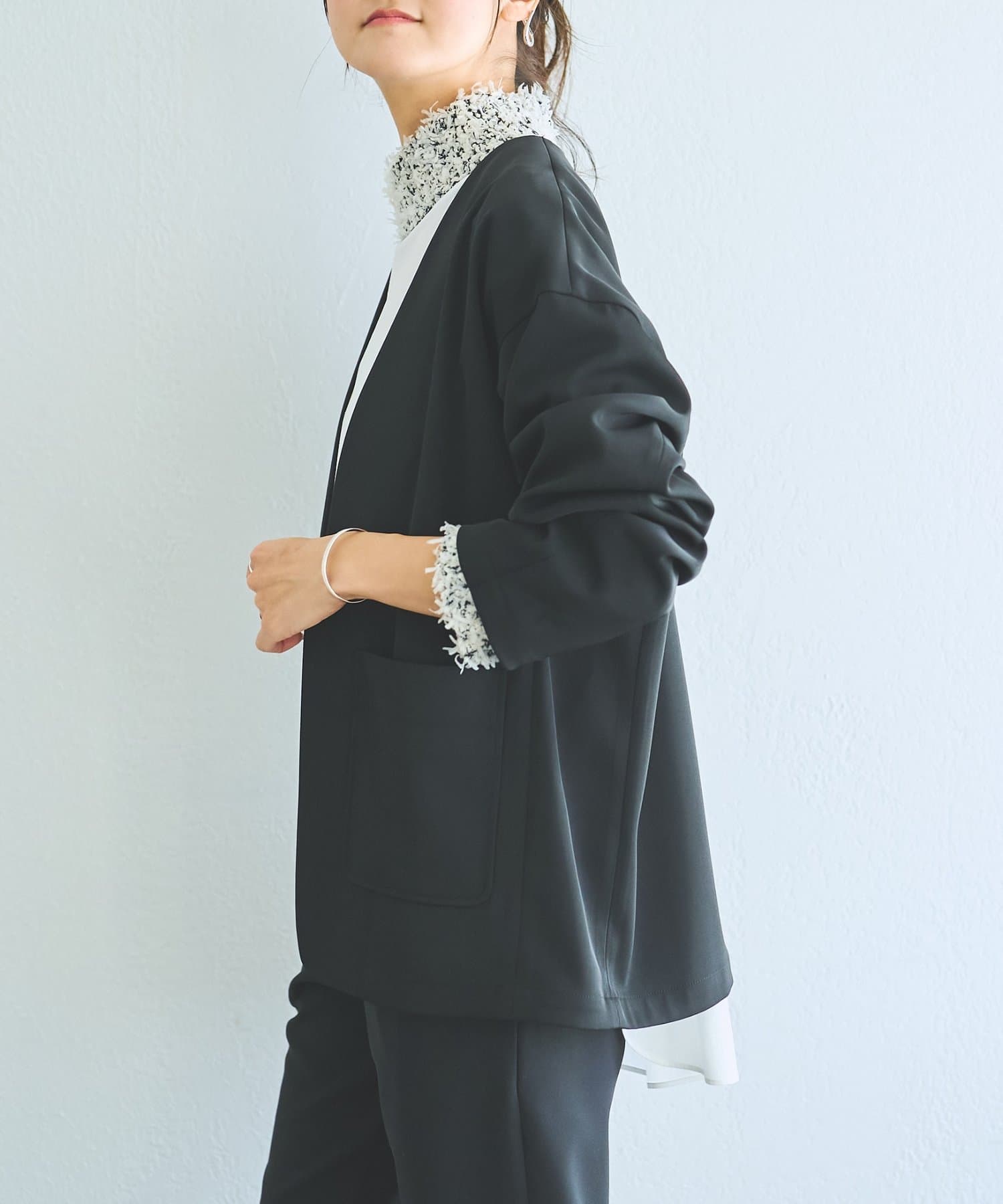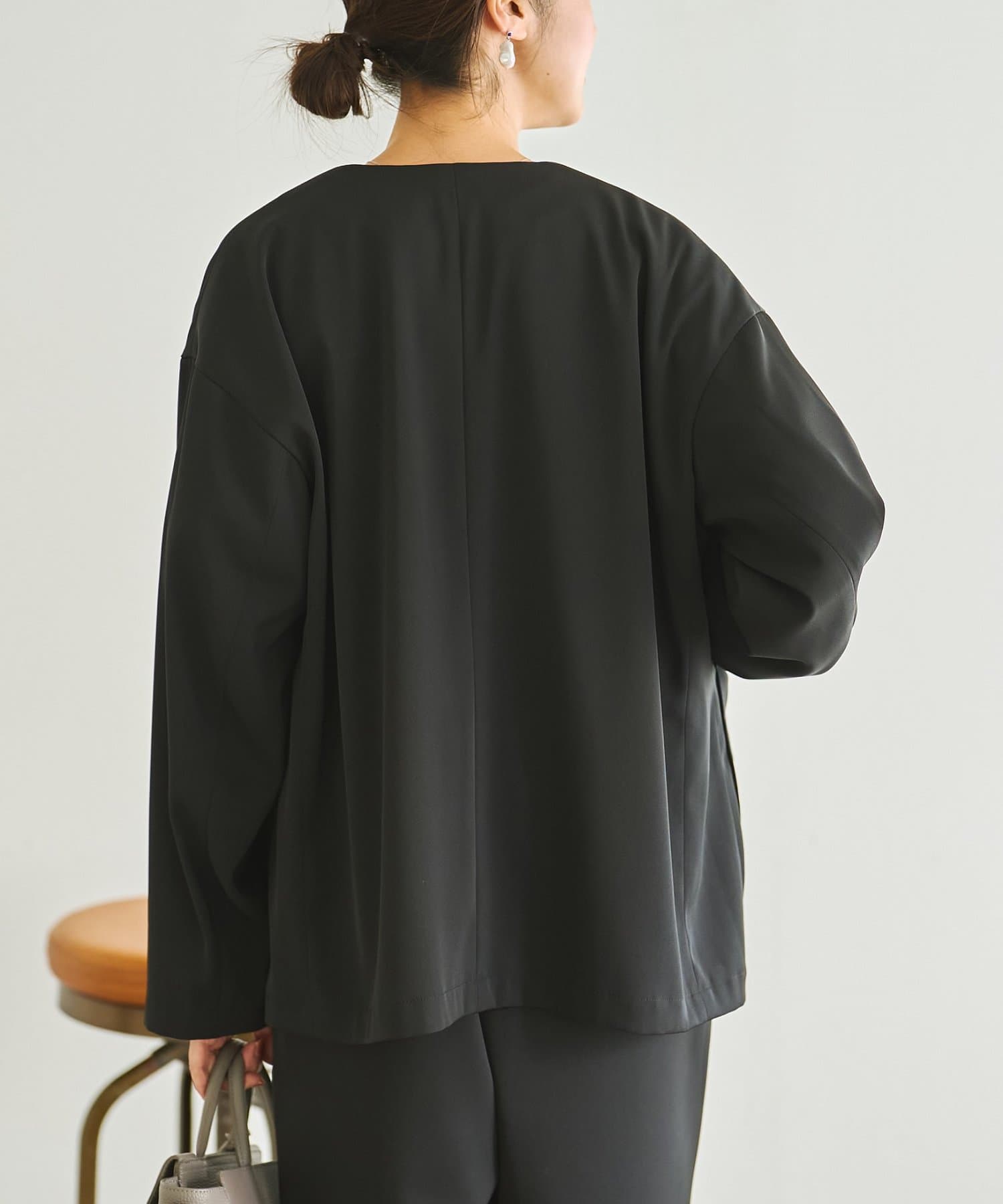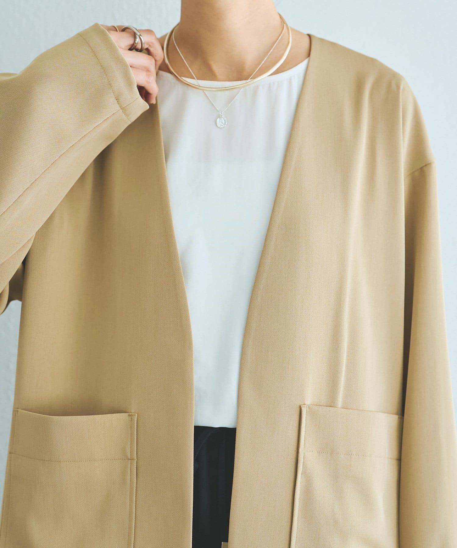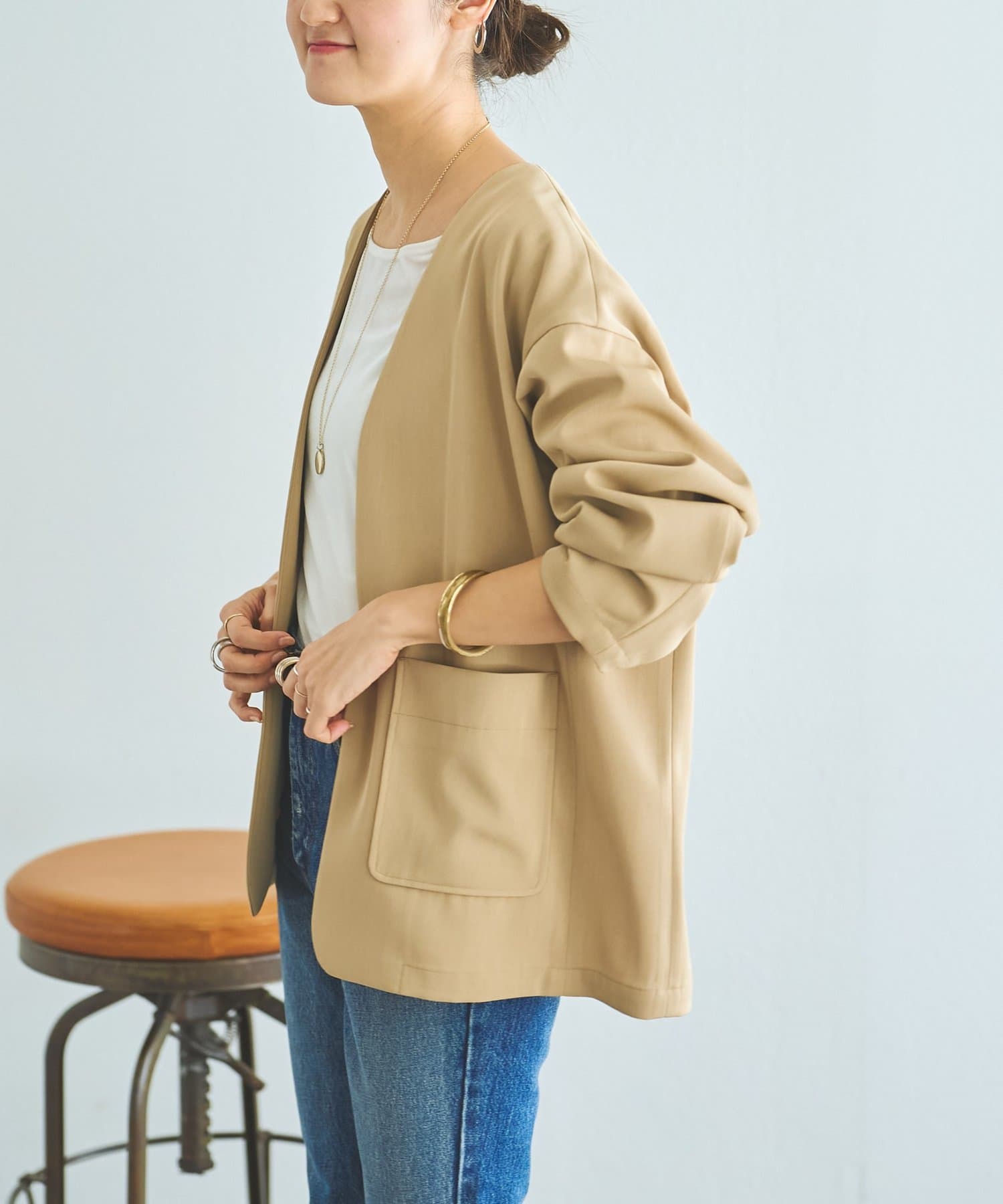 すっきりとした衿元で、さっと羽織るだけできちんと感を演出できるノーカラージャケット。