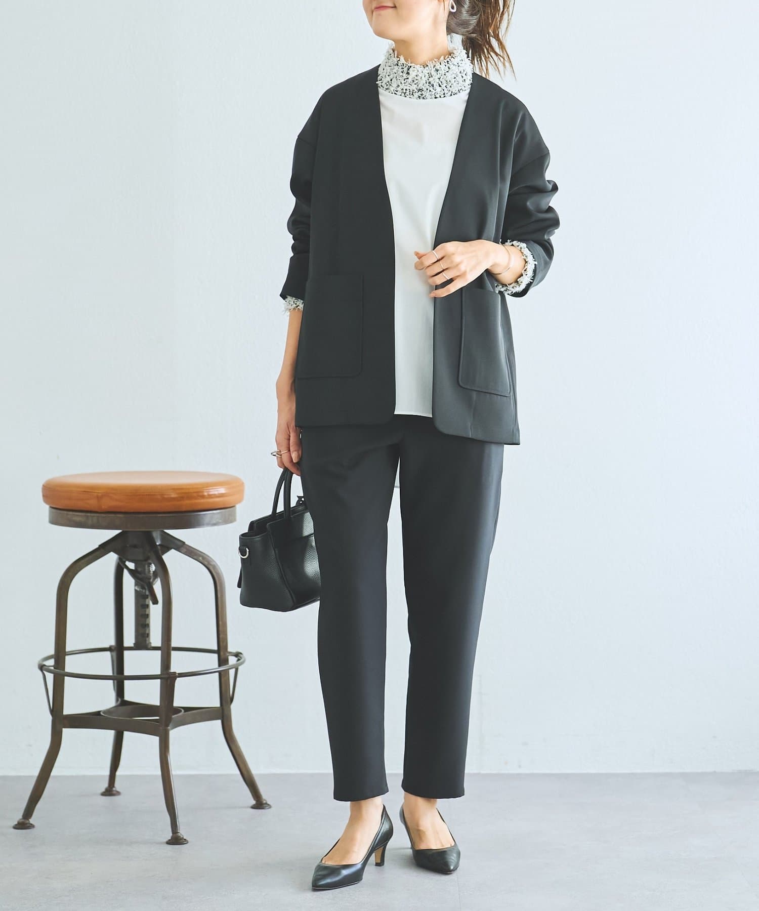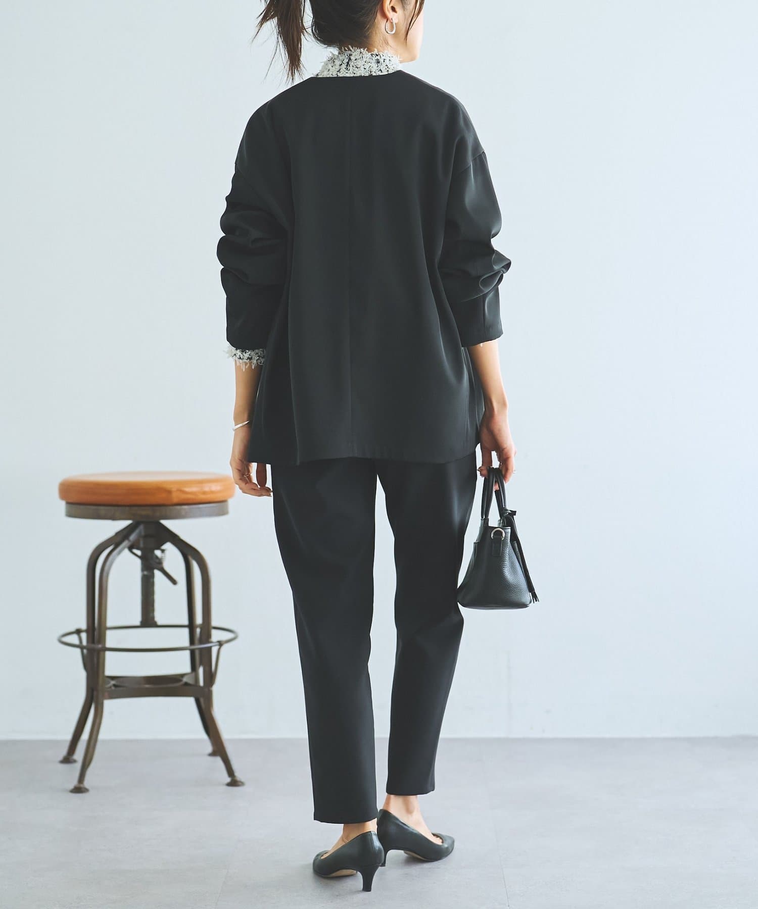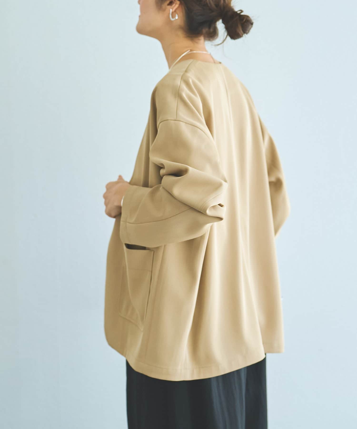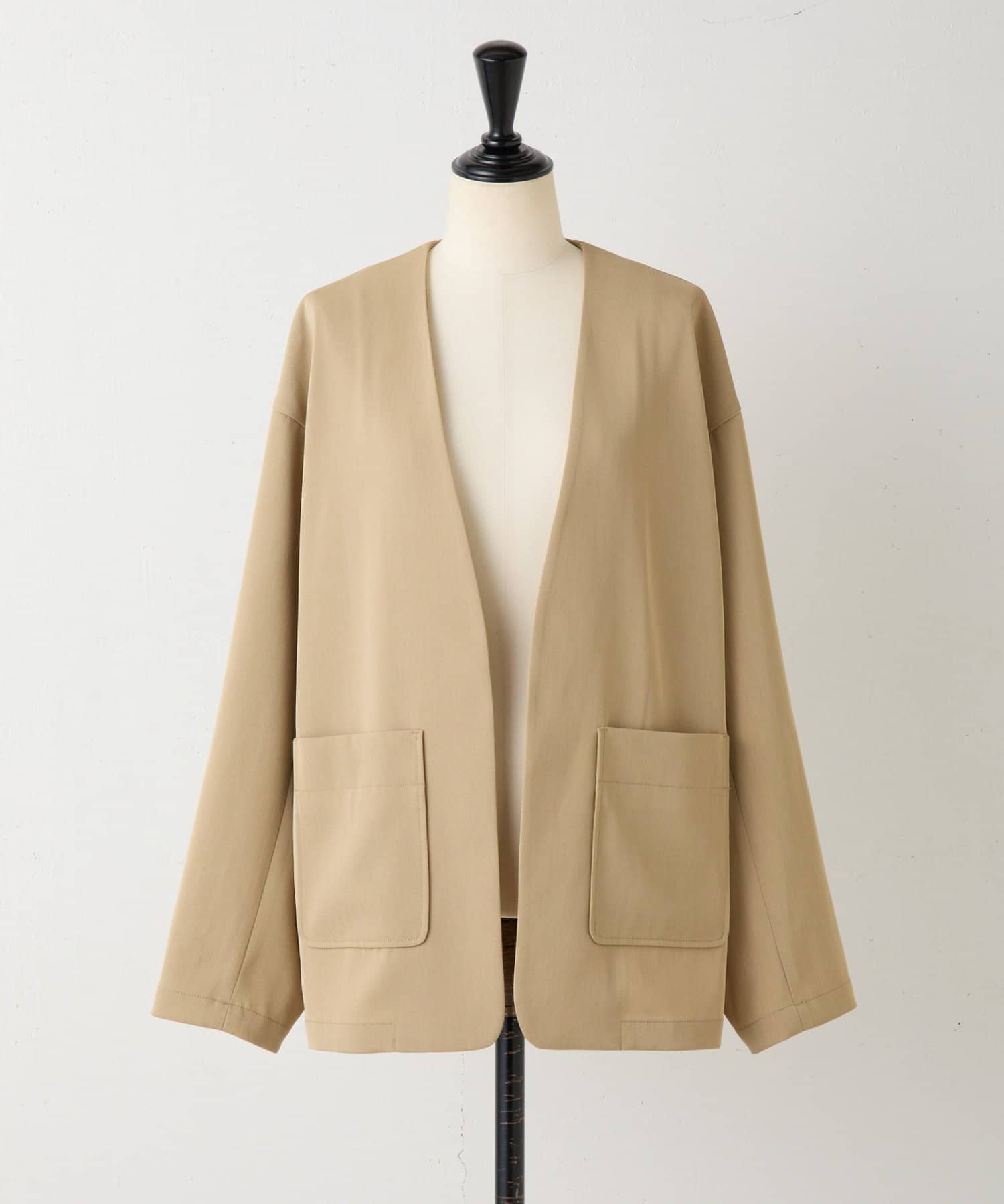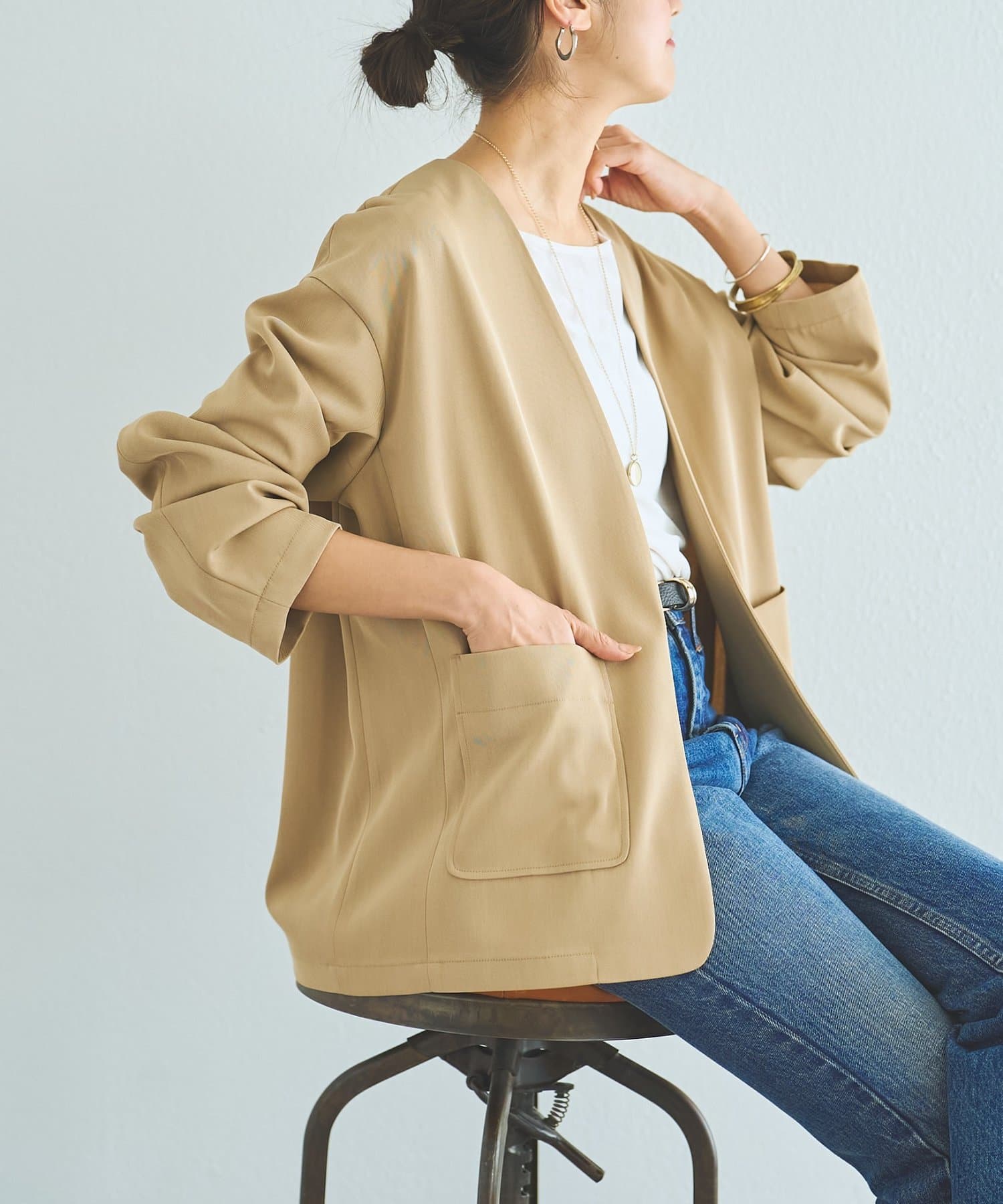 すっきりとした衿元で、さっと羽織るだけできちんと感を演出できるノーカラージャケット。