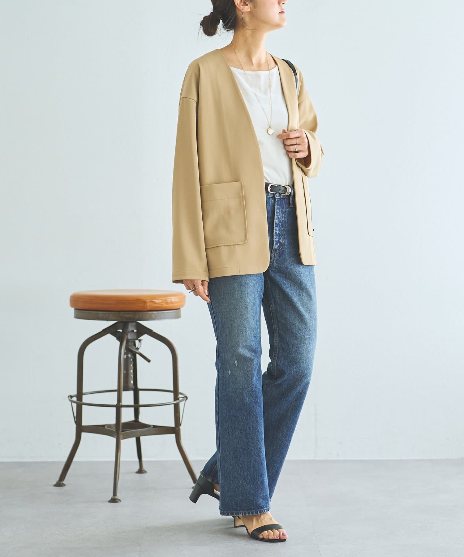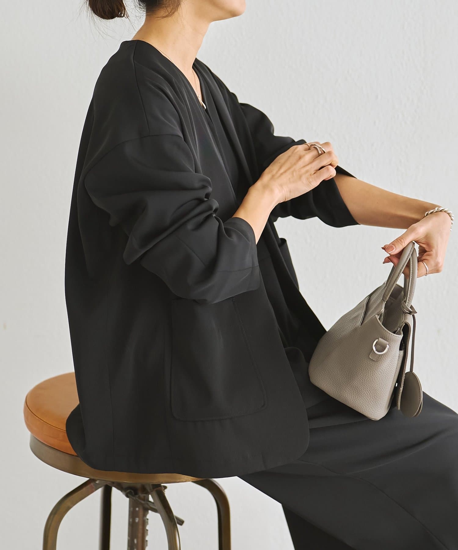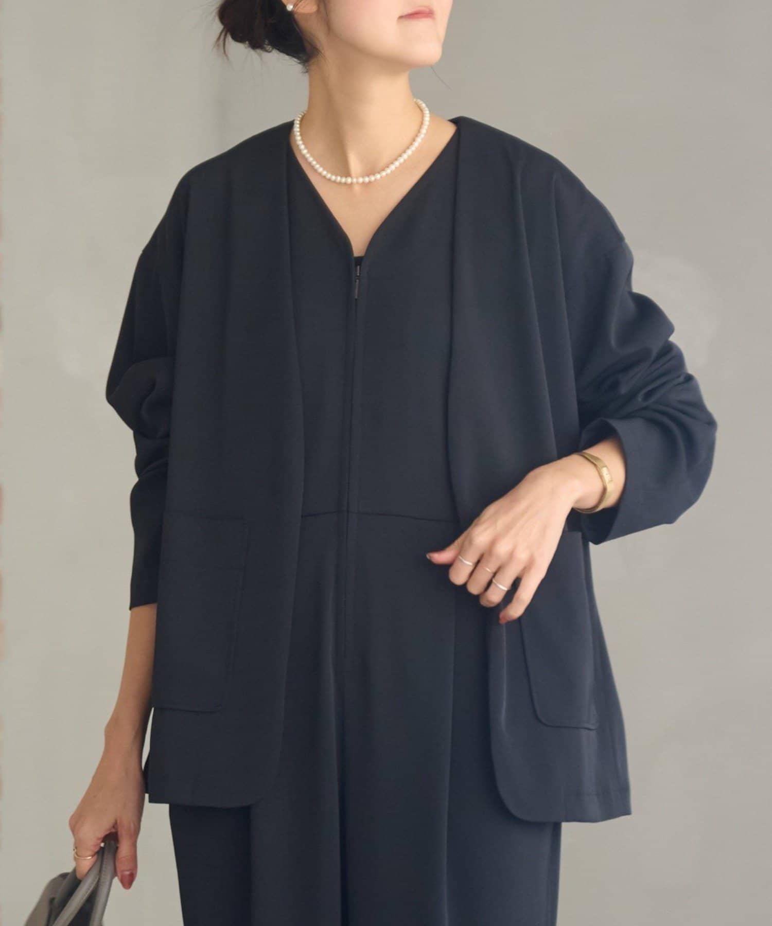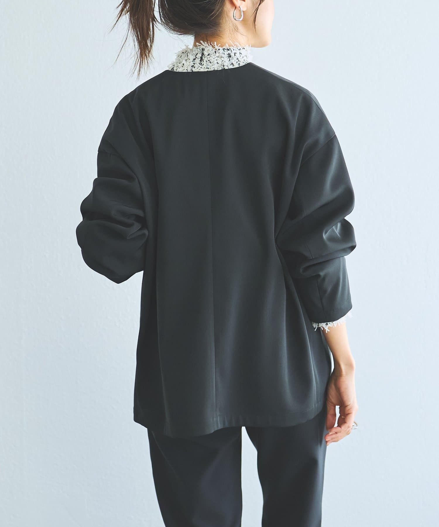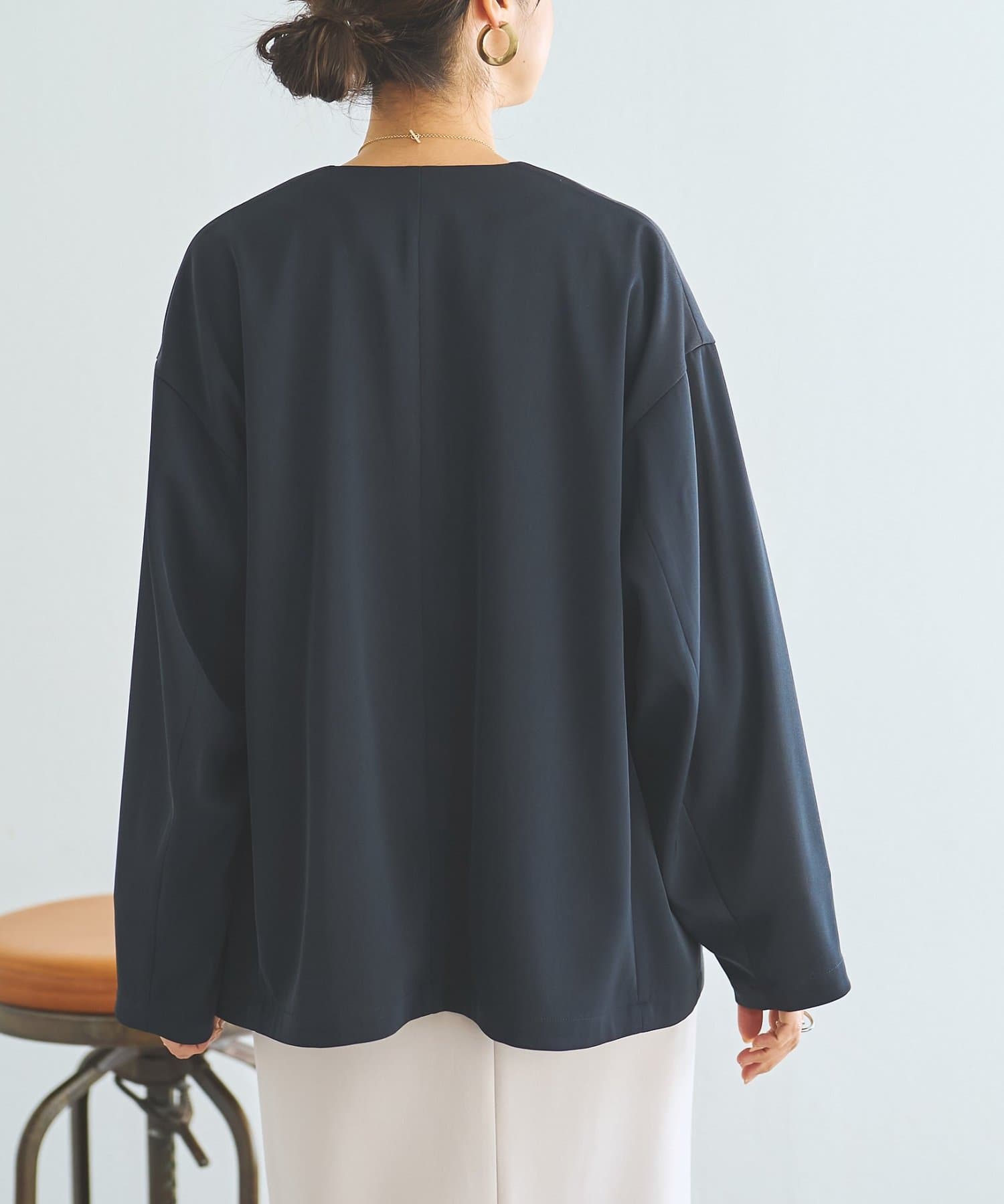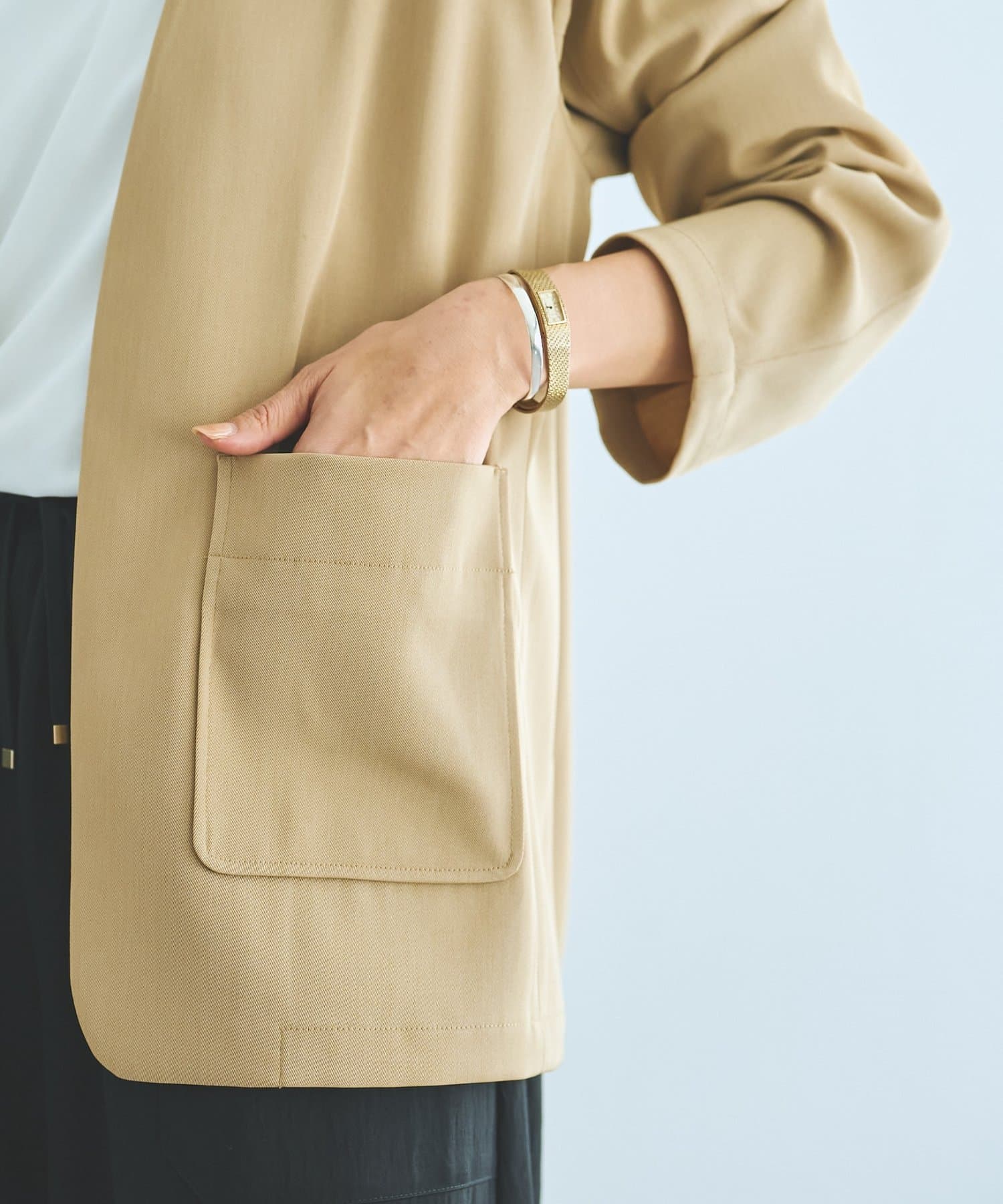 すっきりとした衿元で、さっと羽織るだけできちんと感を演出できるノーカラージャケット。