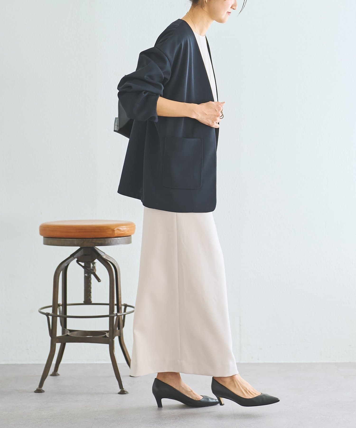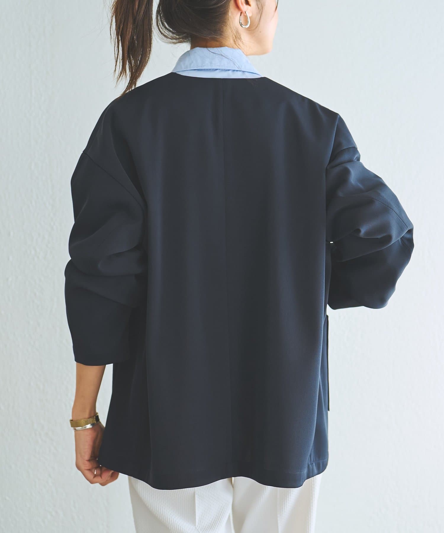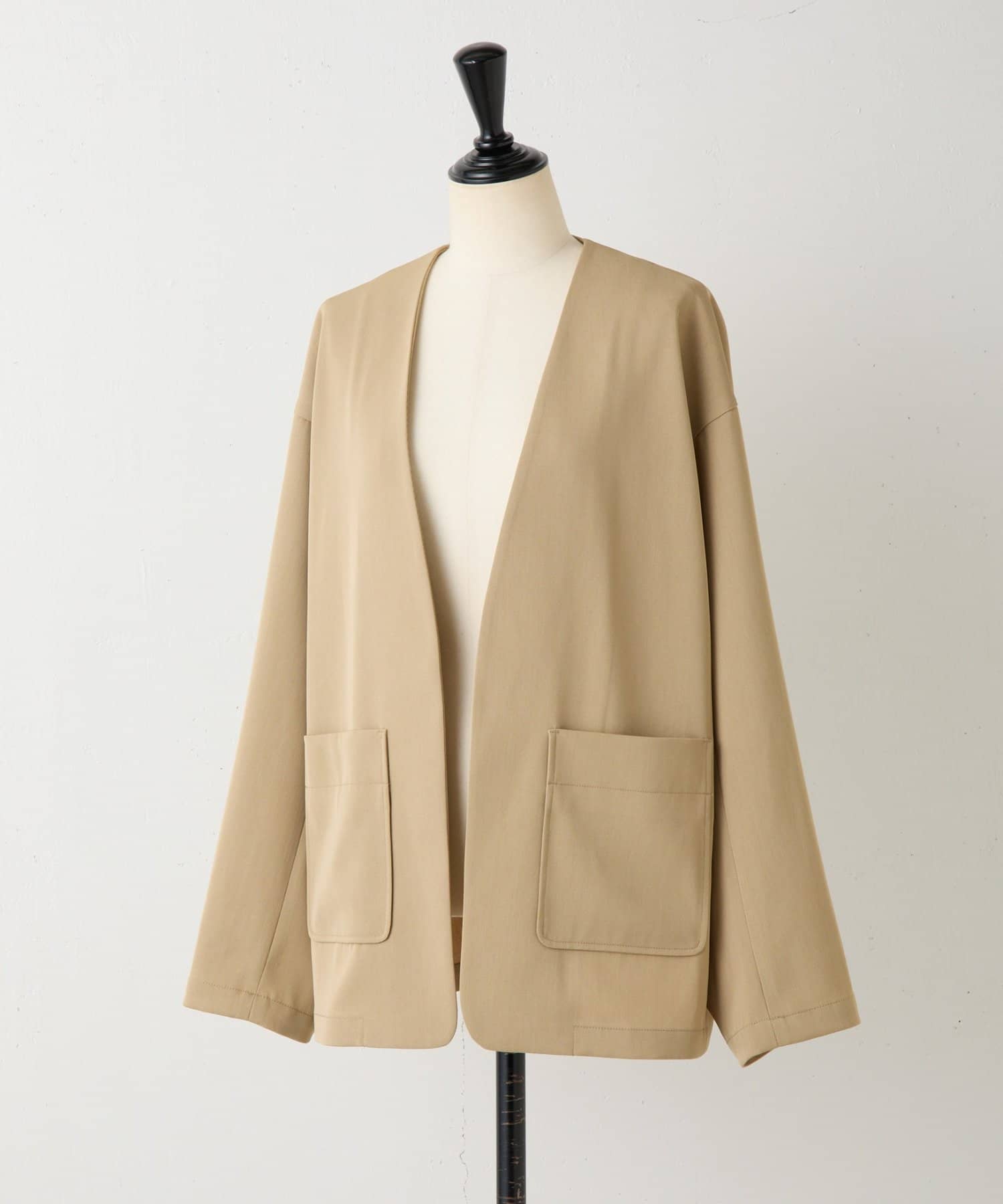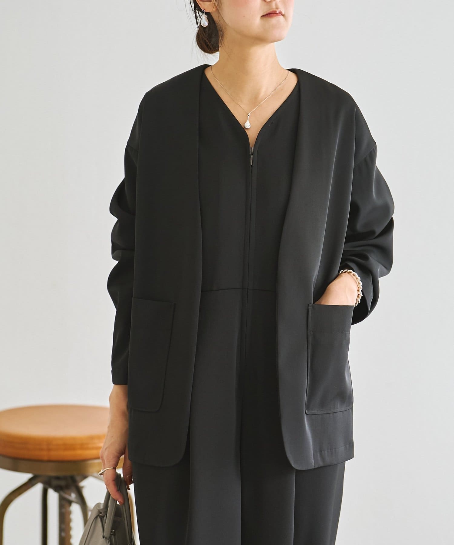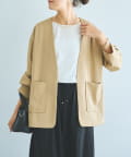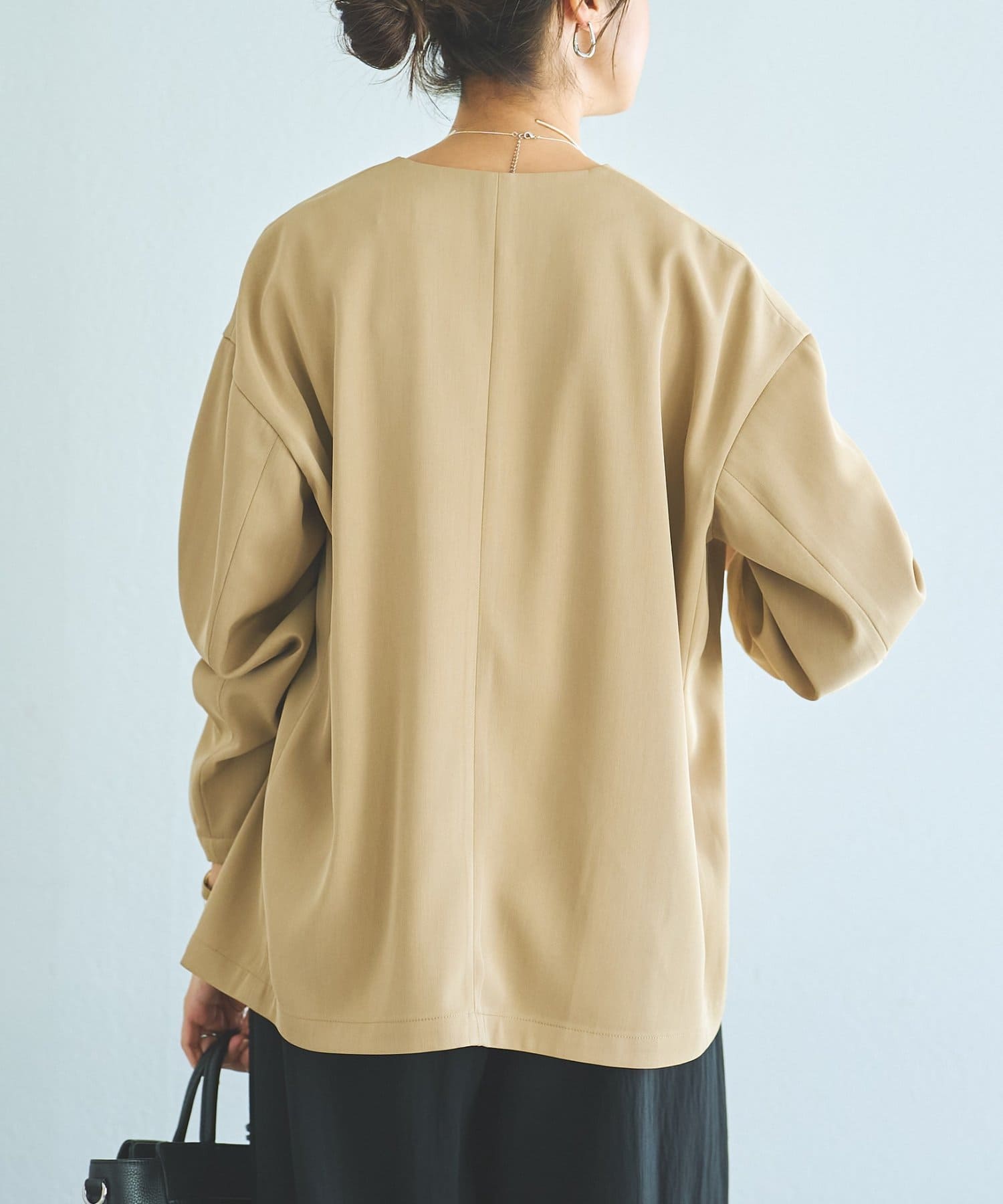 すっきりとした衿元で、さっと羽織るだけできちんと感を演出できるノーカラージャケット。