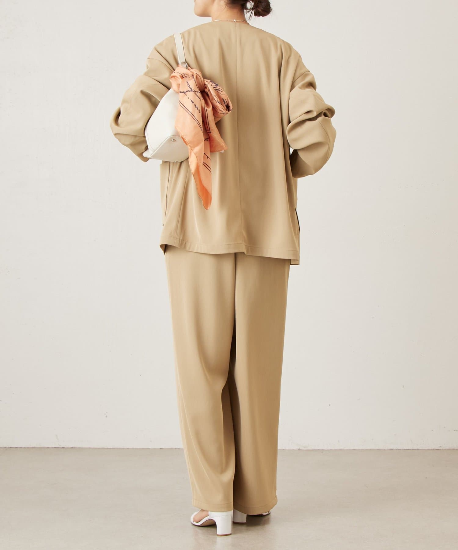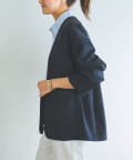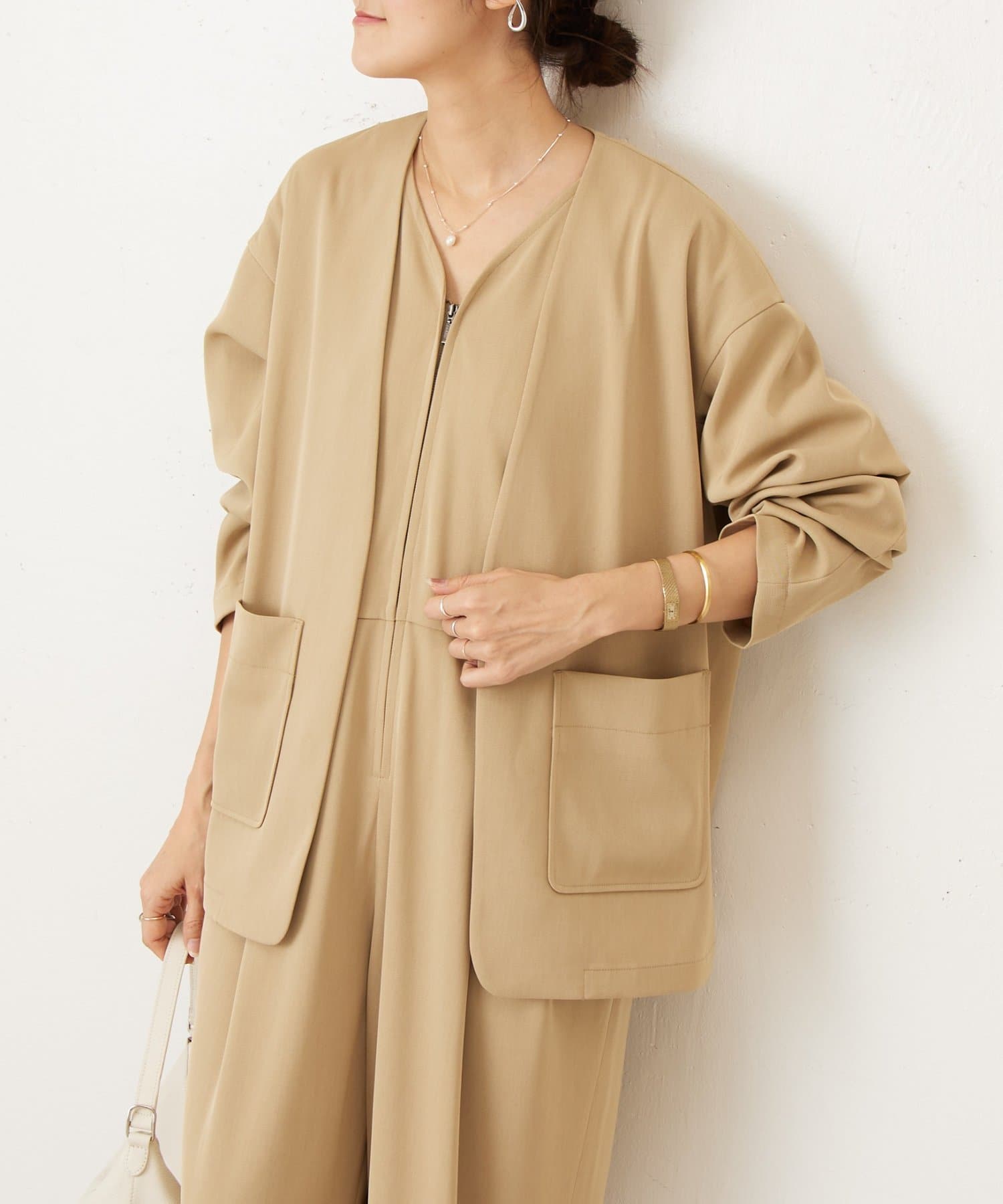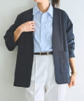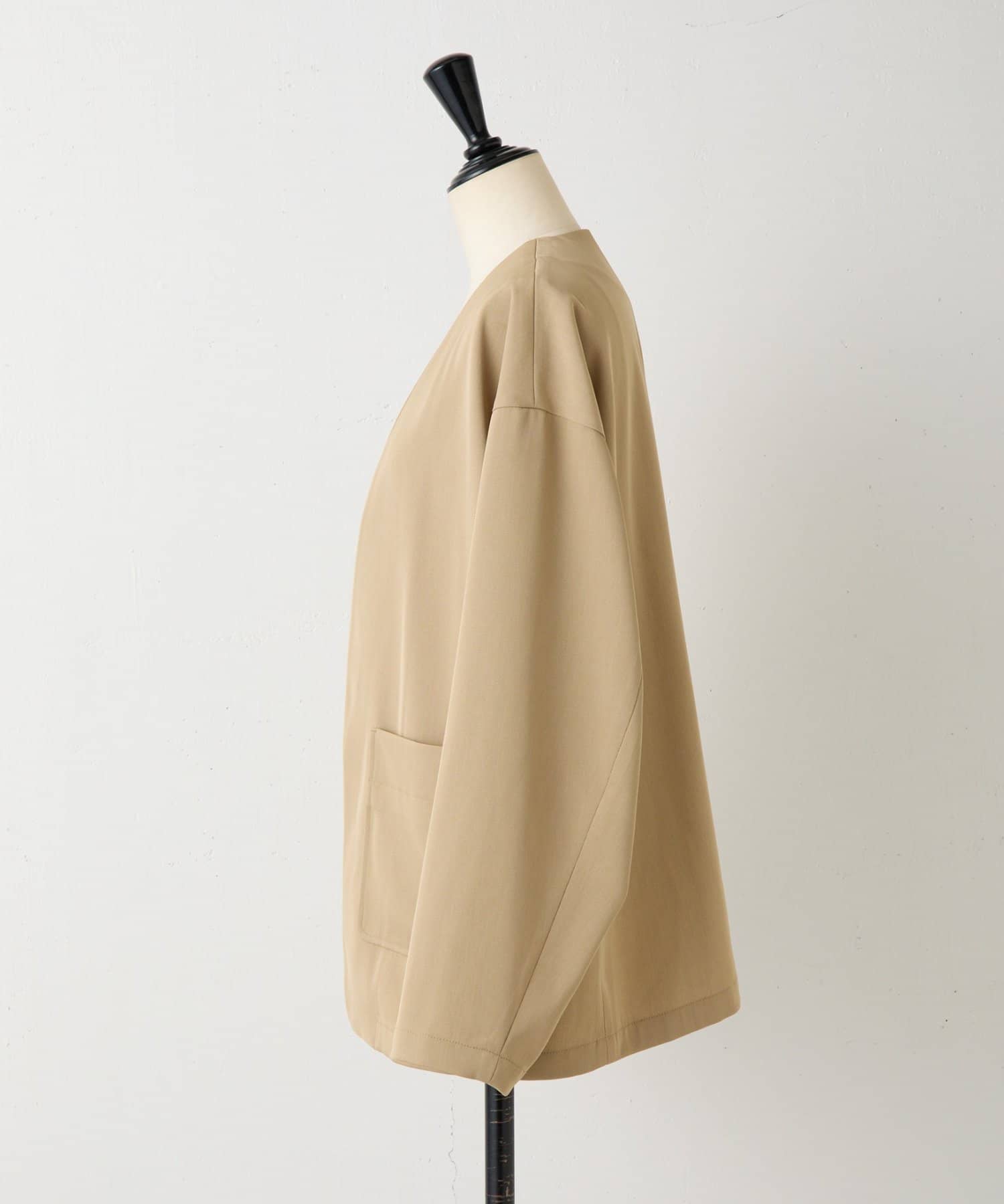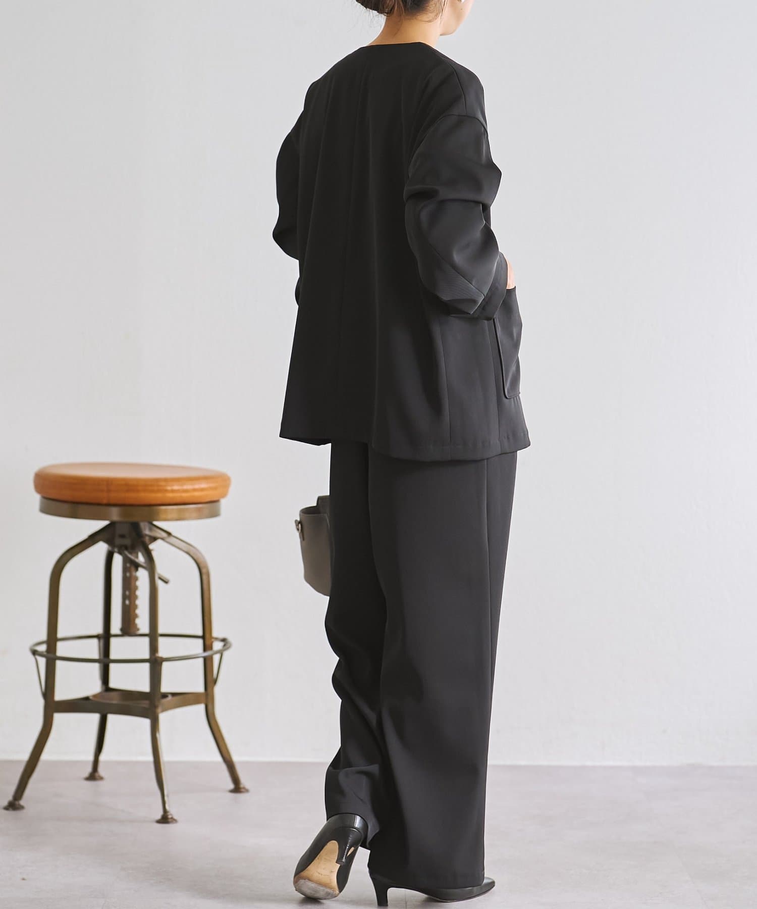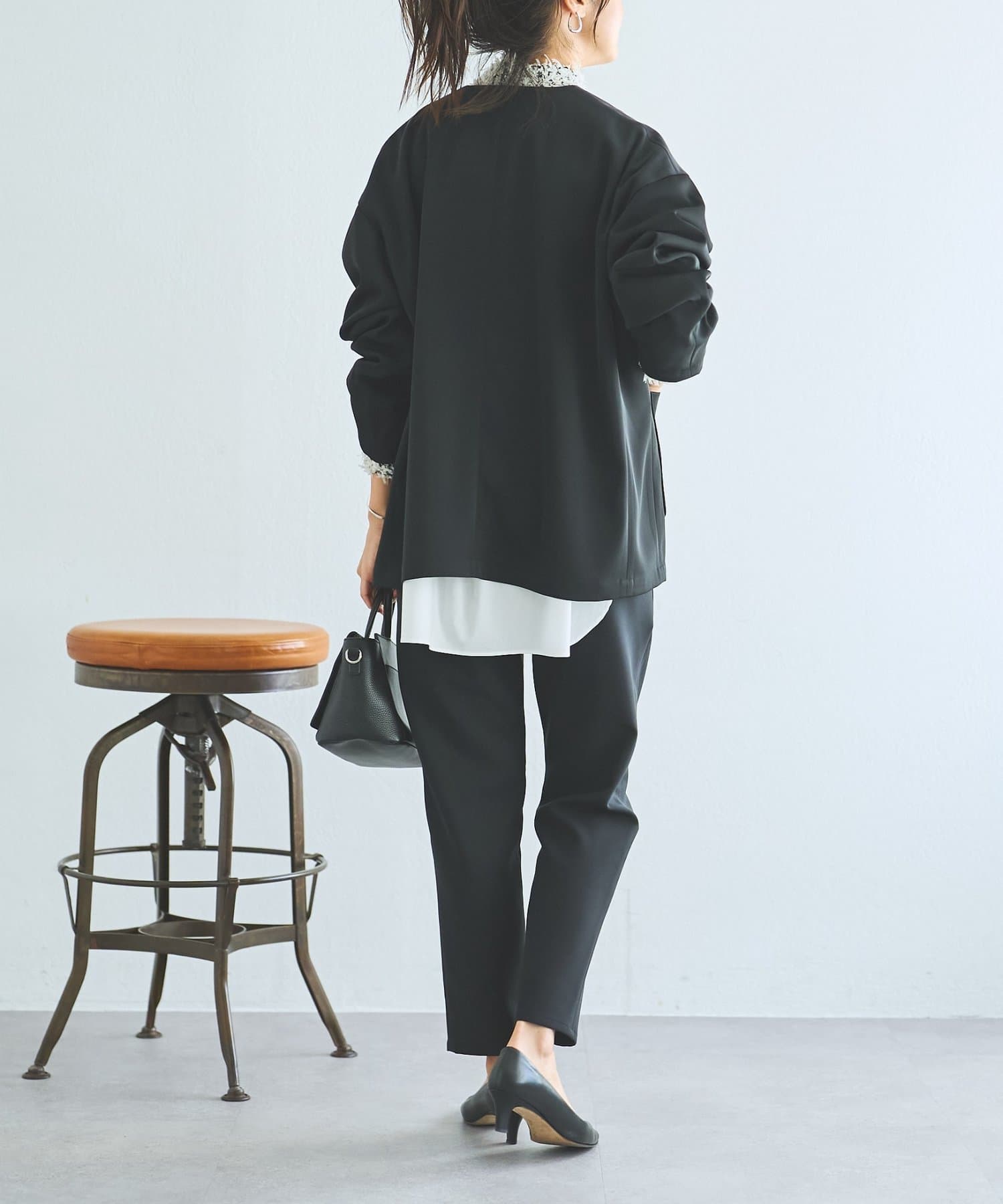 すっきりとした衿元で、さっと羽織るだけできちんと感を演出できるノーカラージャケット。