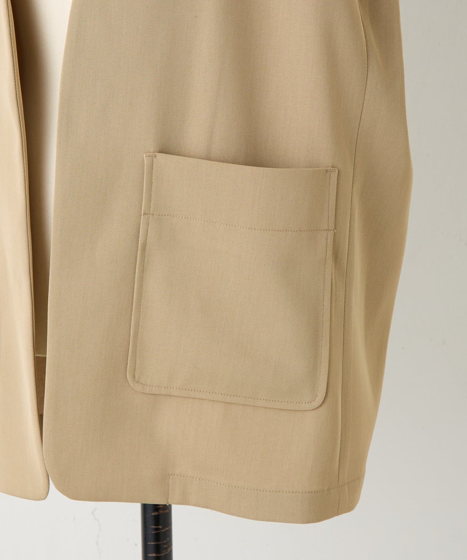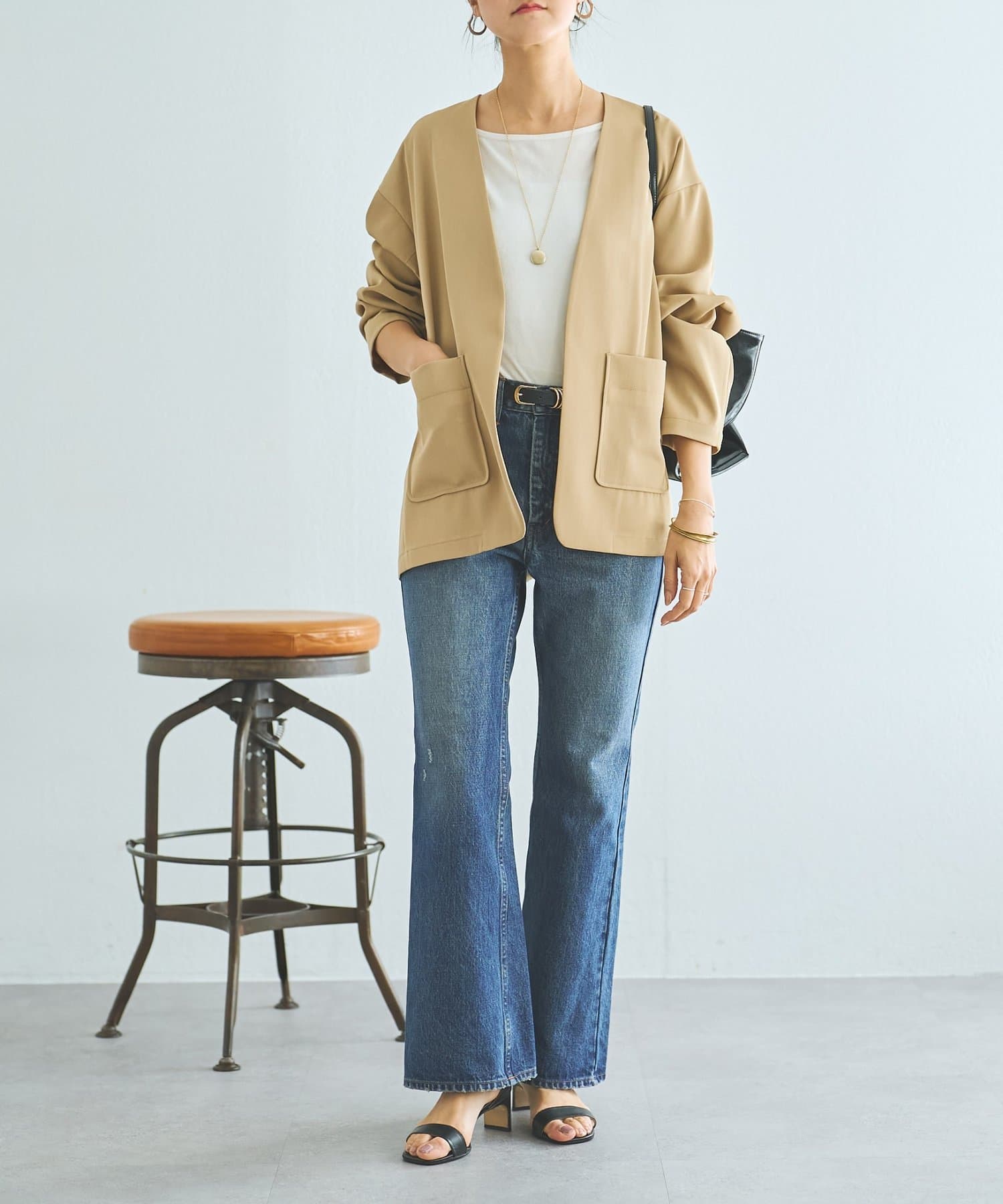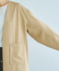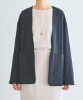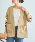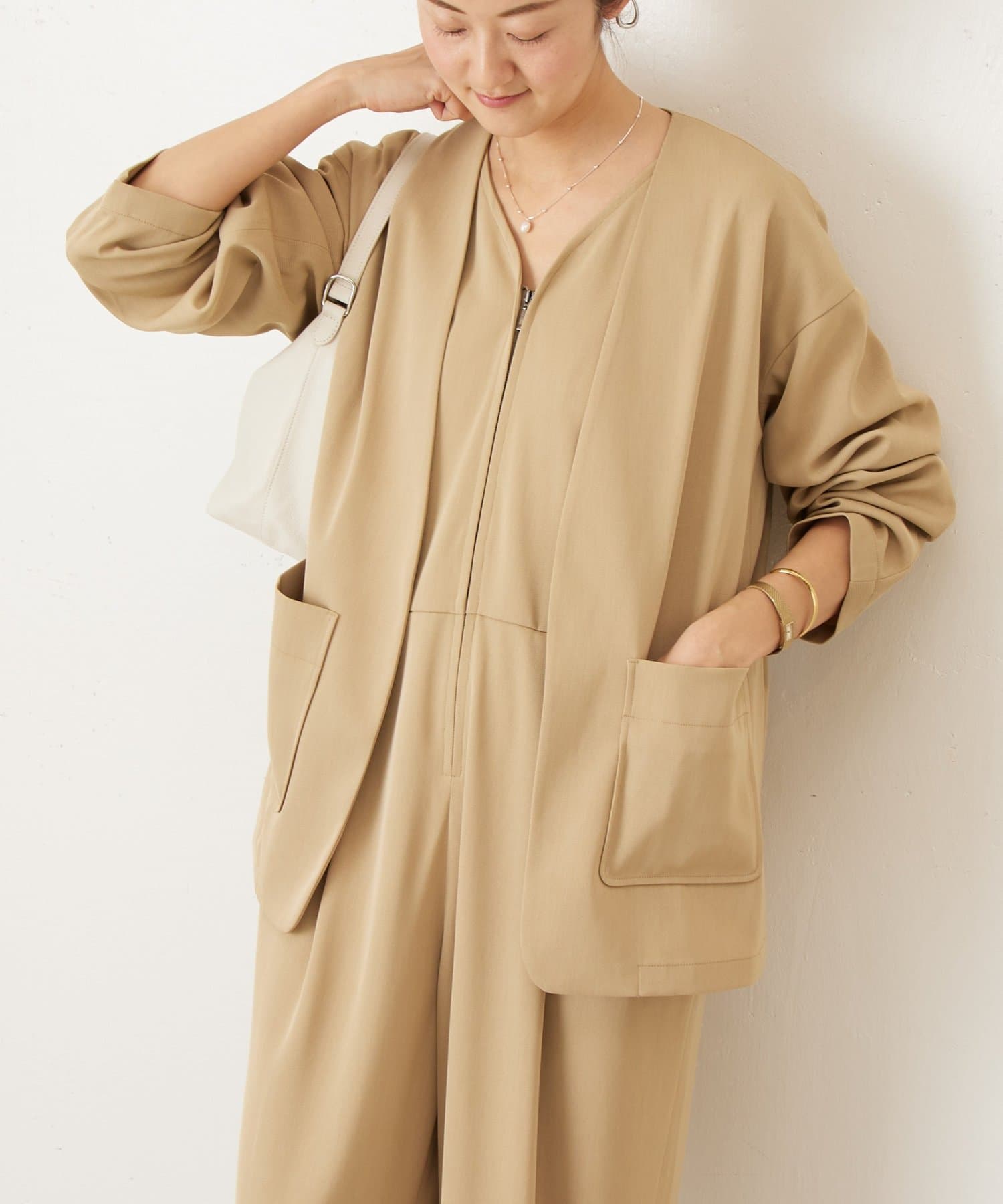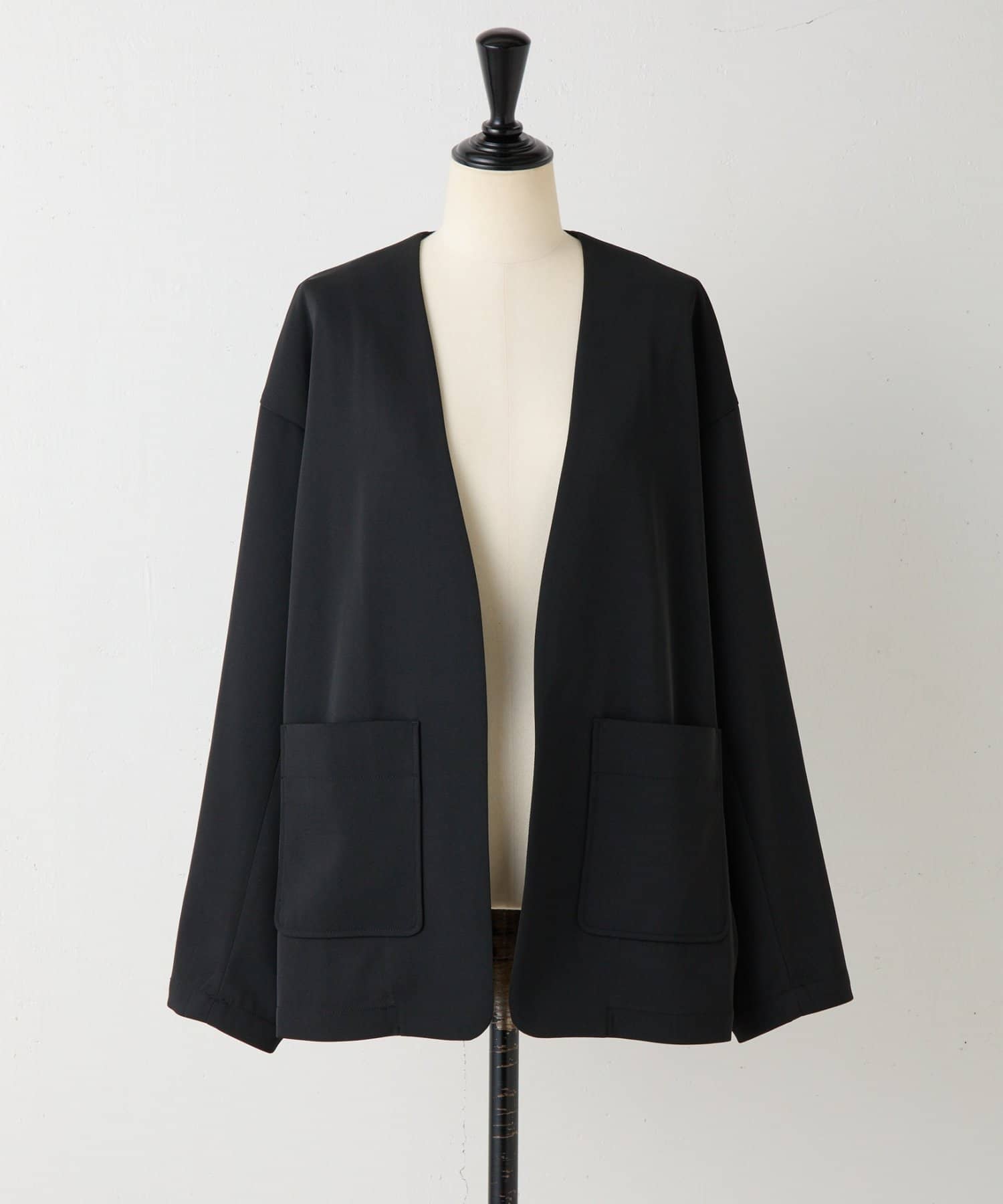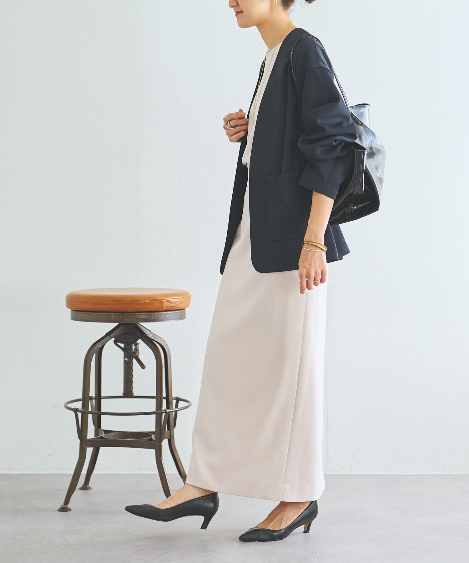 すっきりとした衿元で、さっと羽織るだけできちんと感を演出できるノーカラージャケット。