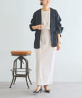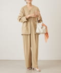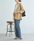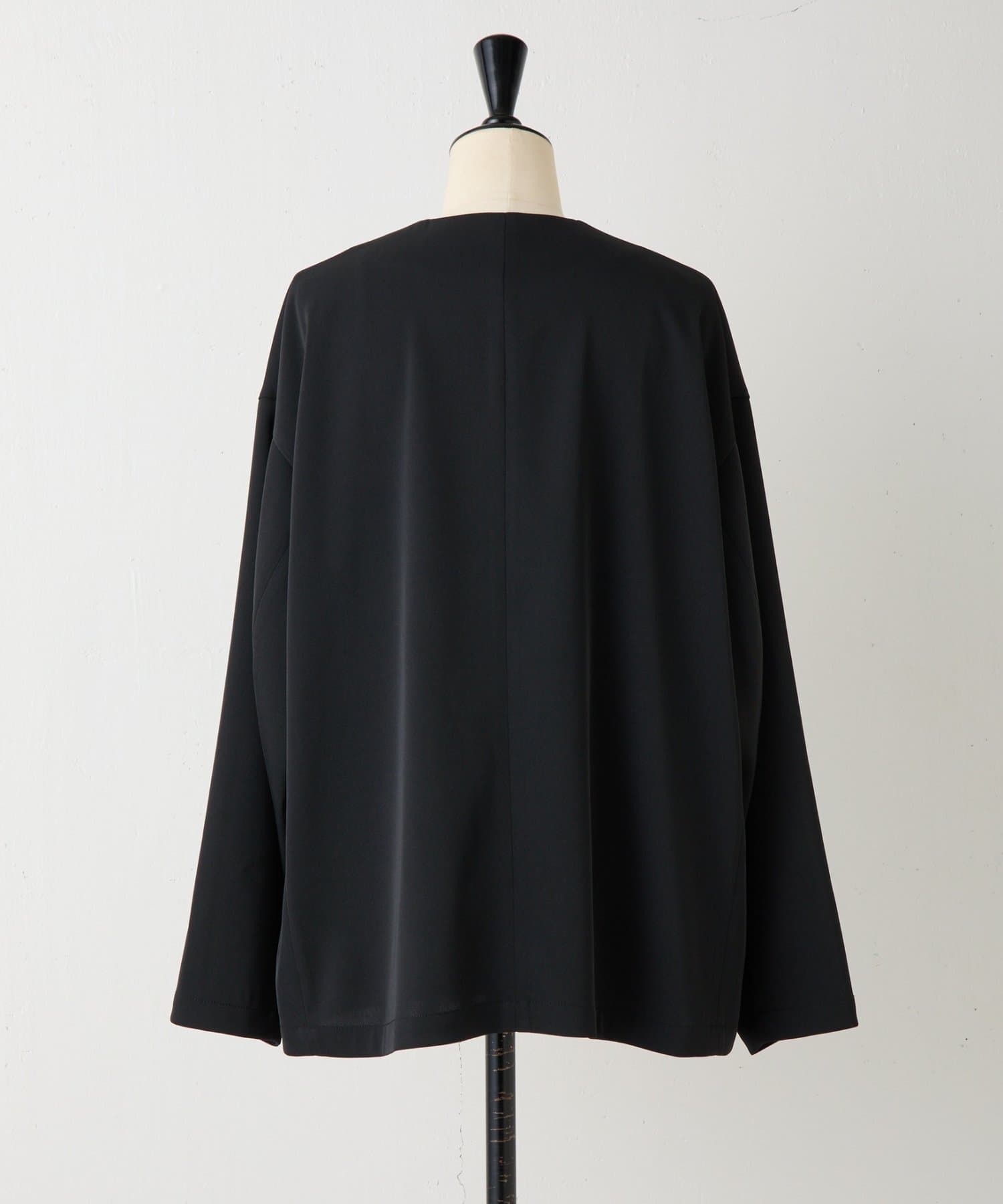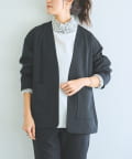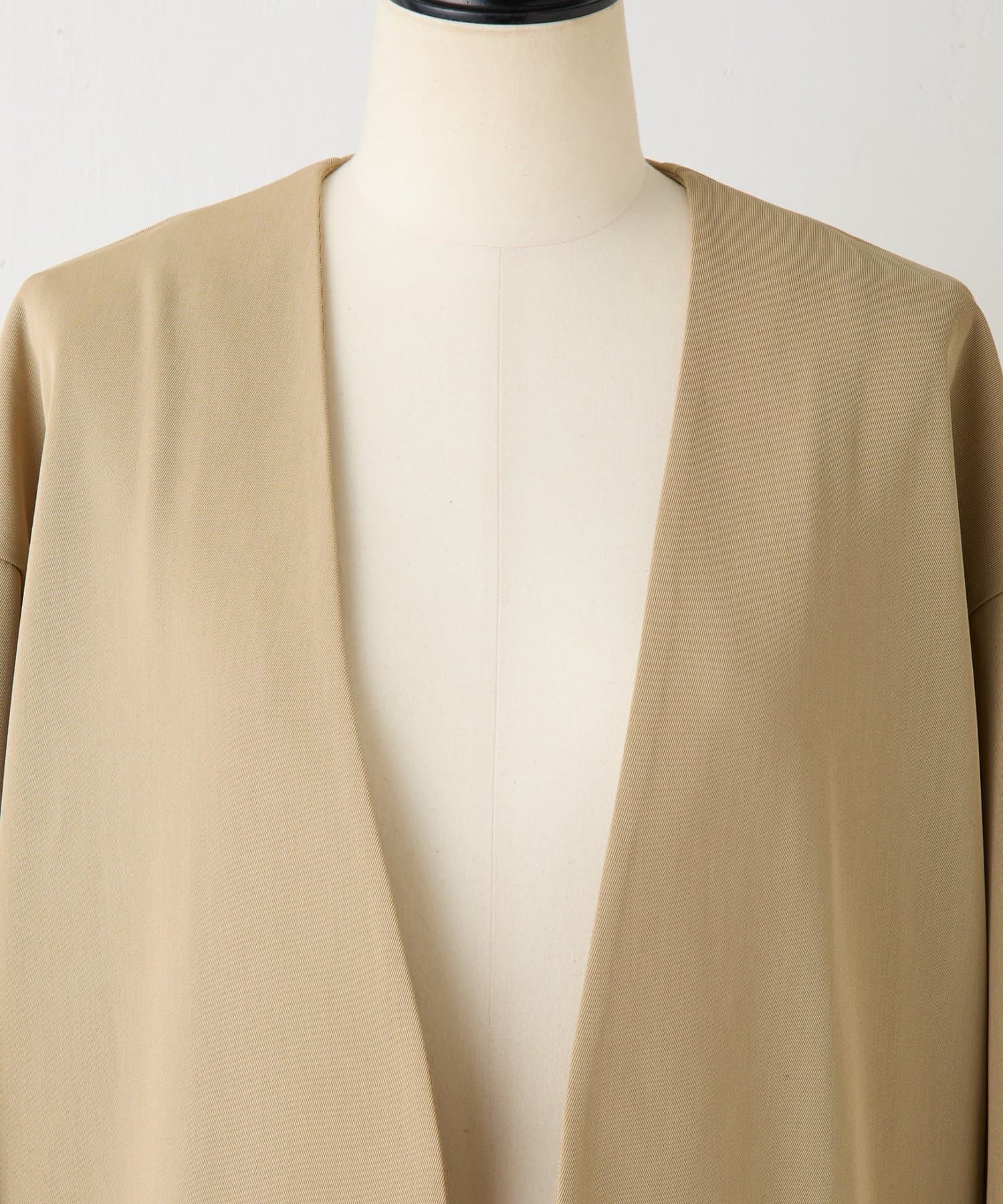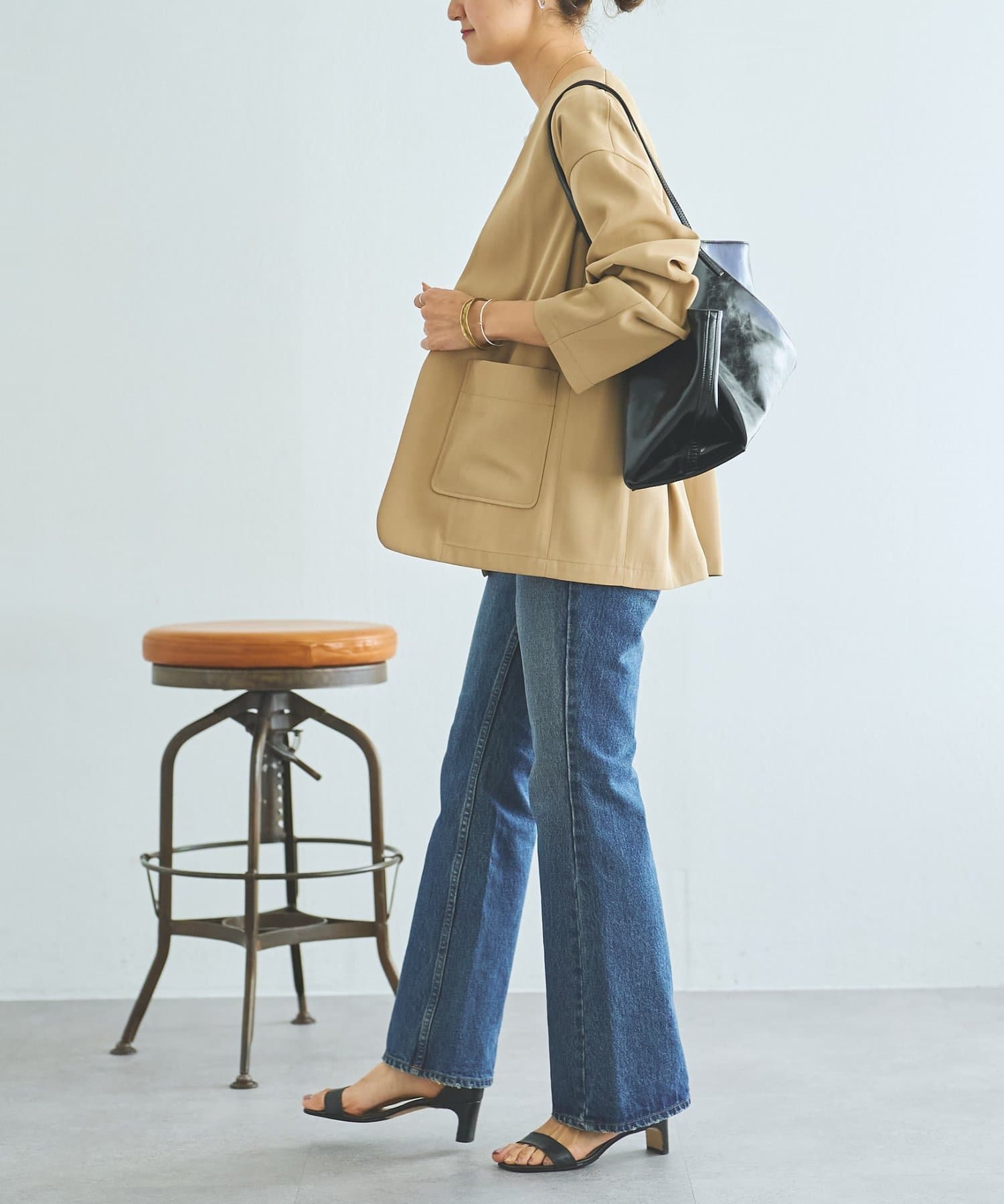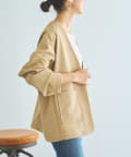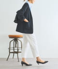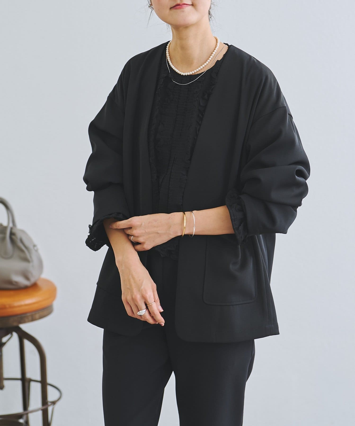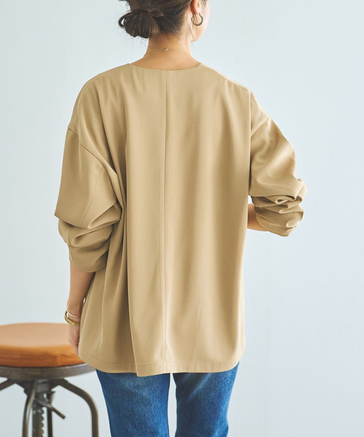 すっきりとした衿元で、さっと羽織るだけできちんと感を演出できるノーカラージャケット。