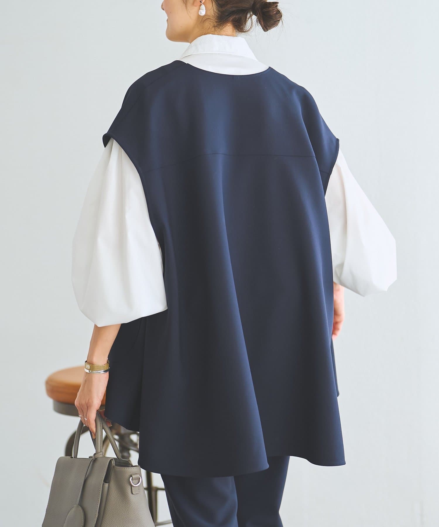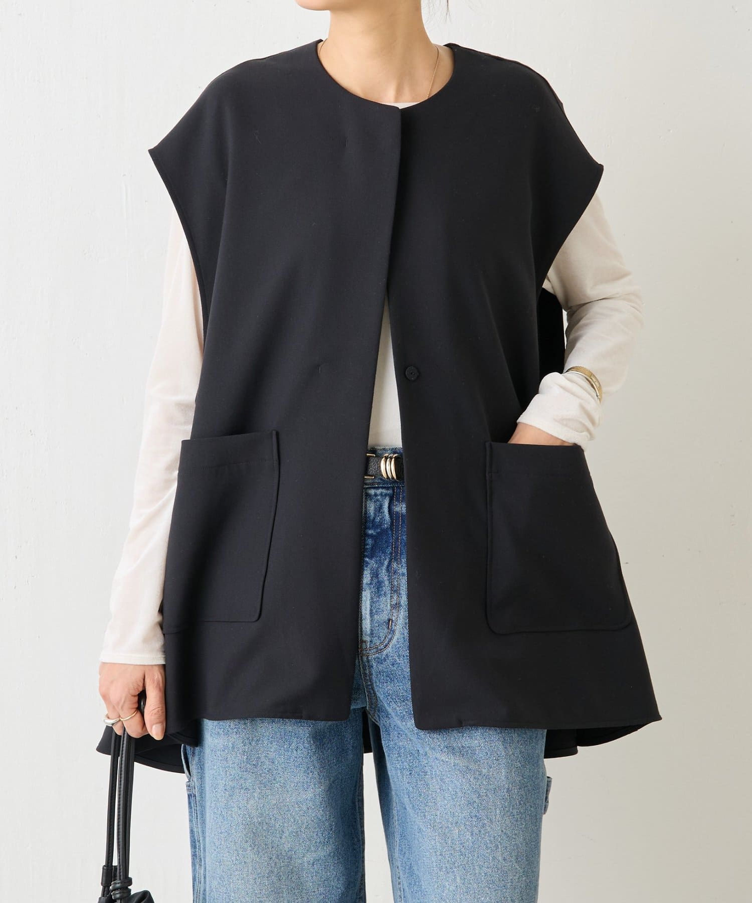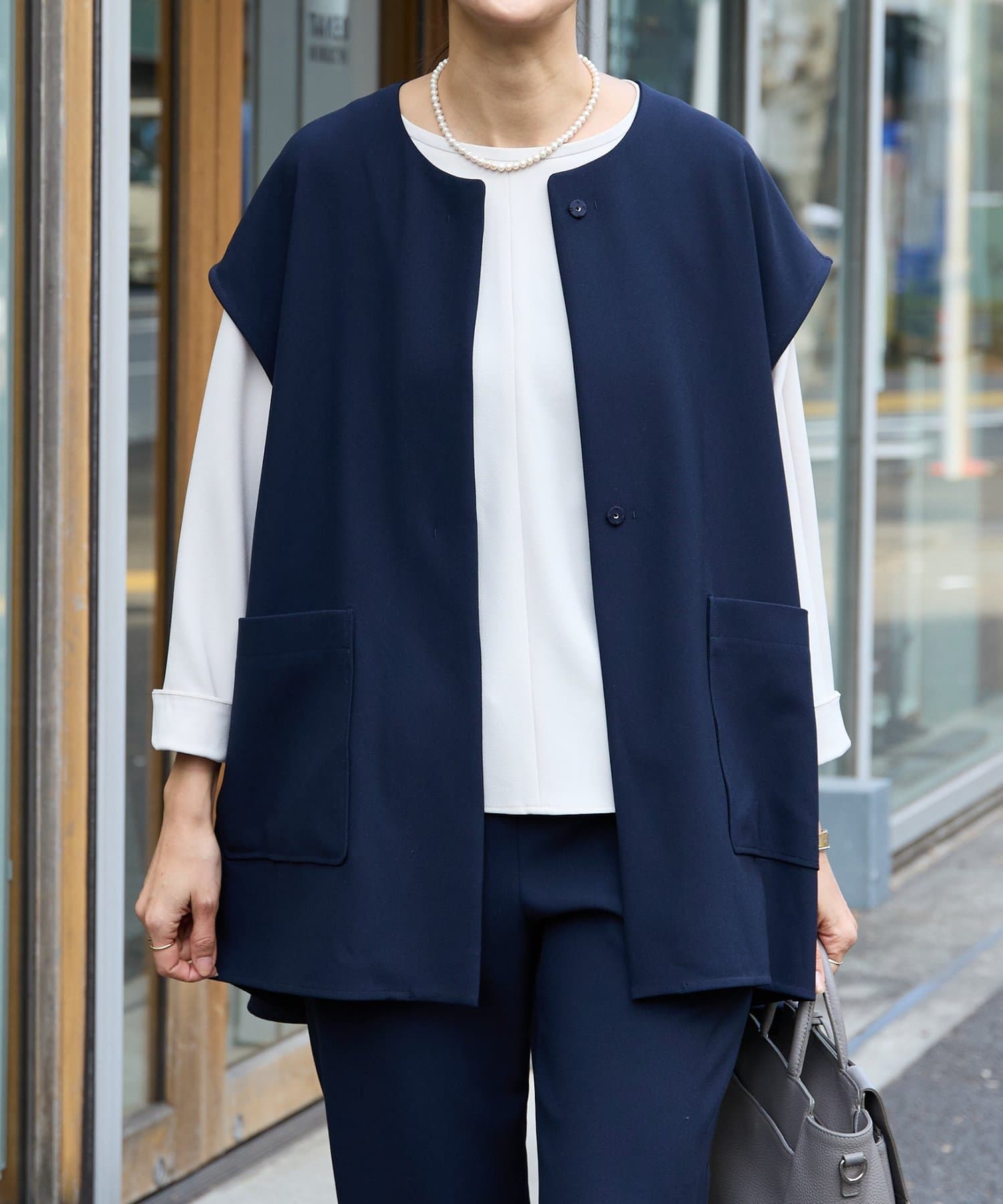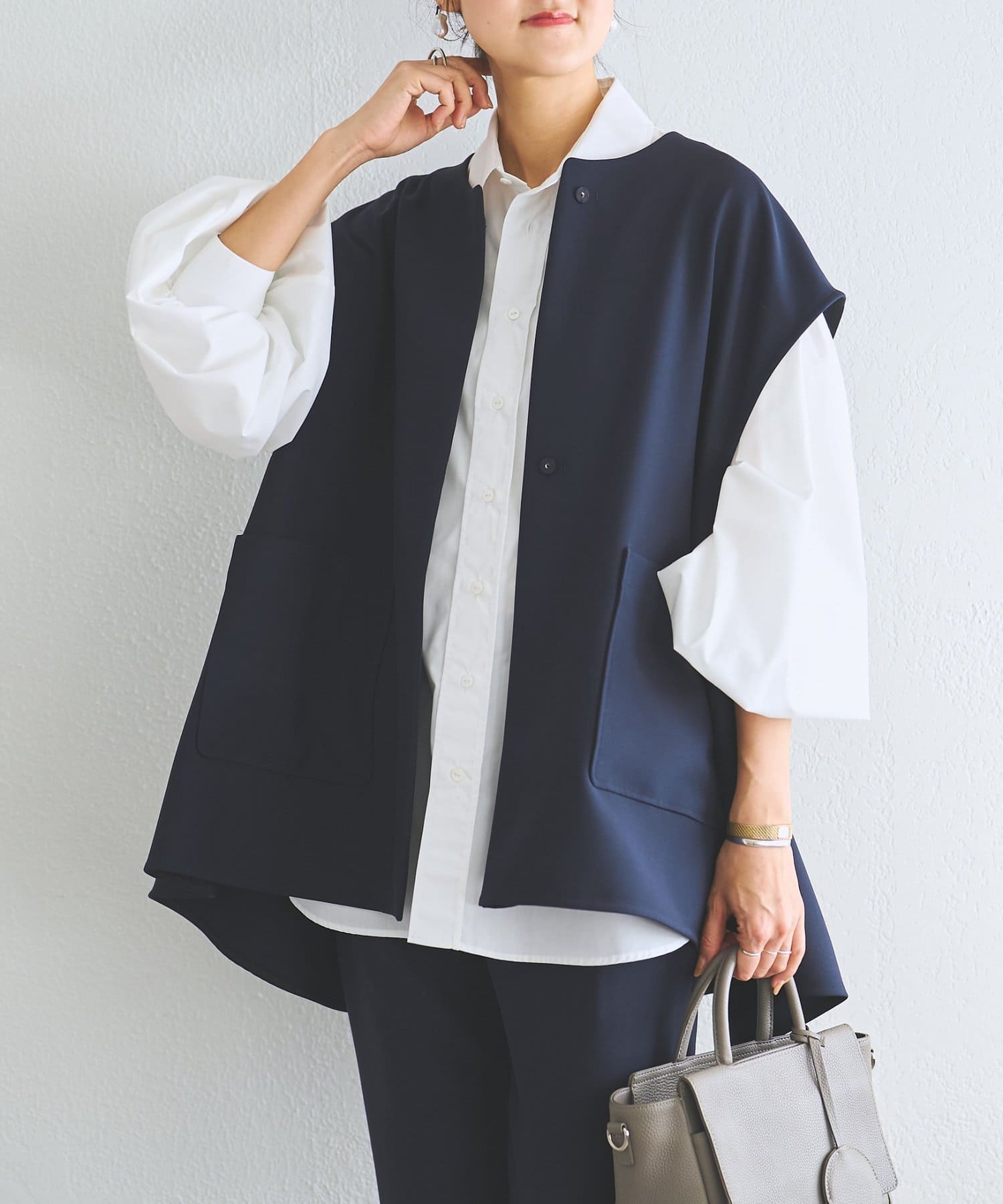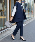 また、デニムやカジュアルなボトムと合わせた抜け感のあるスタイリングも楽しめ、ワードローブに一枚あると頼れる主役ジレです。