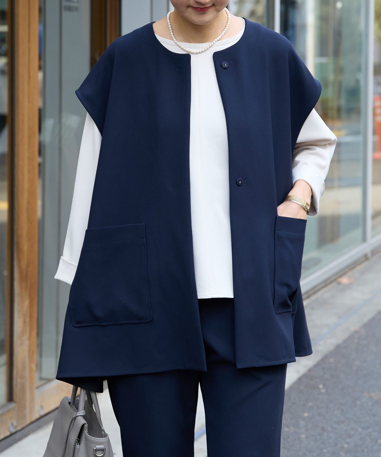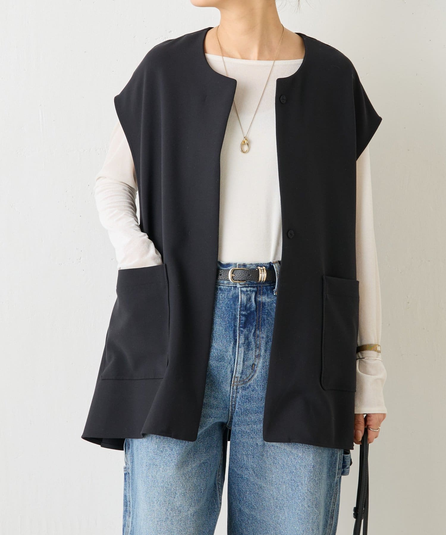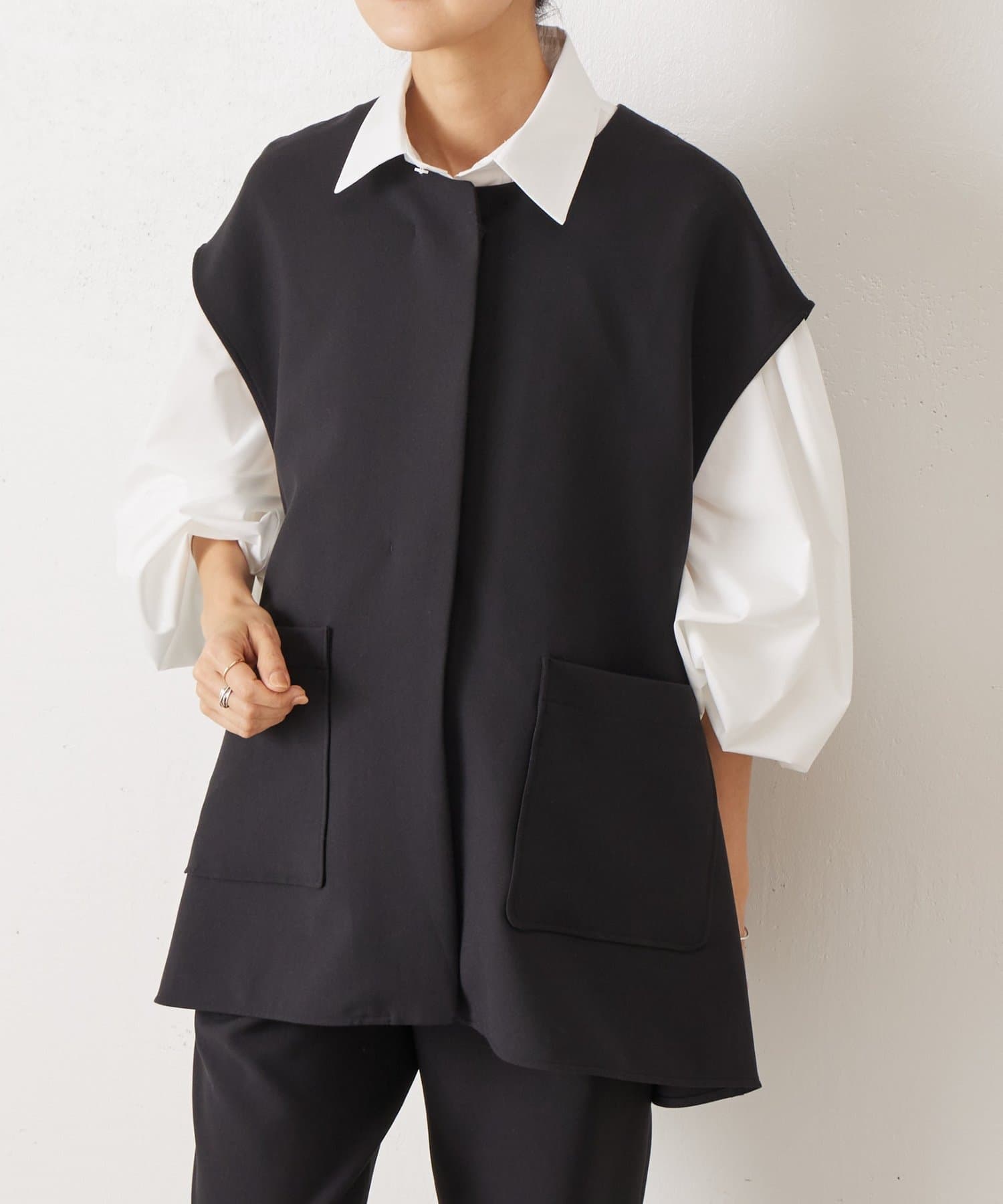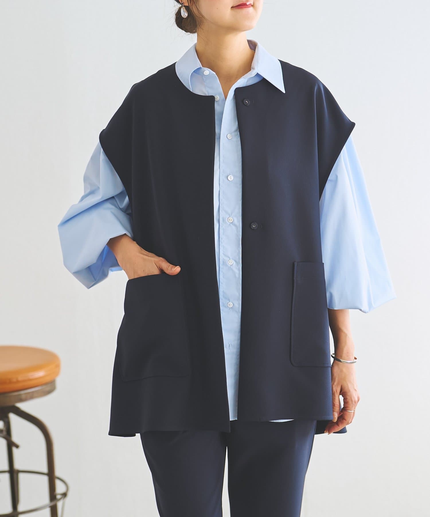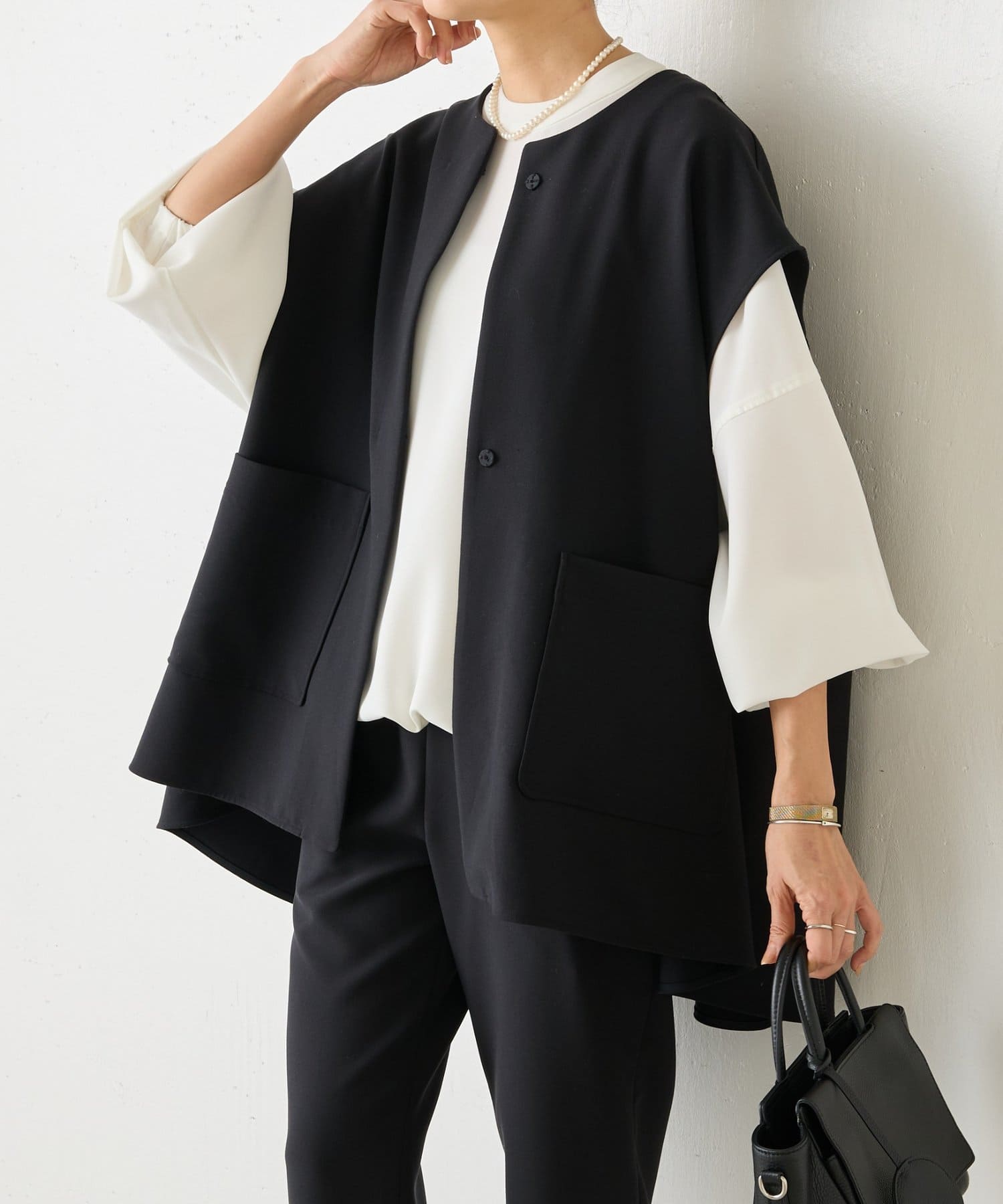 また、デニムやカジュアルなボトムと合わせた抜け感のあるスタイリングも楽しめ、ワードローブに一枚あると頼れる主役ジレです。