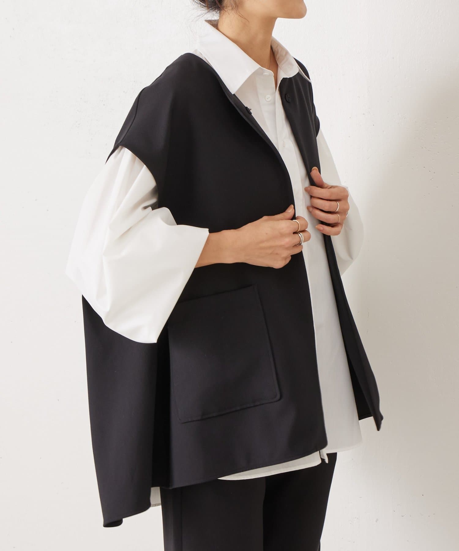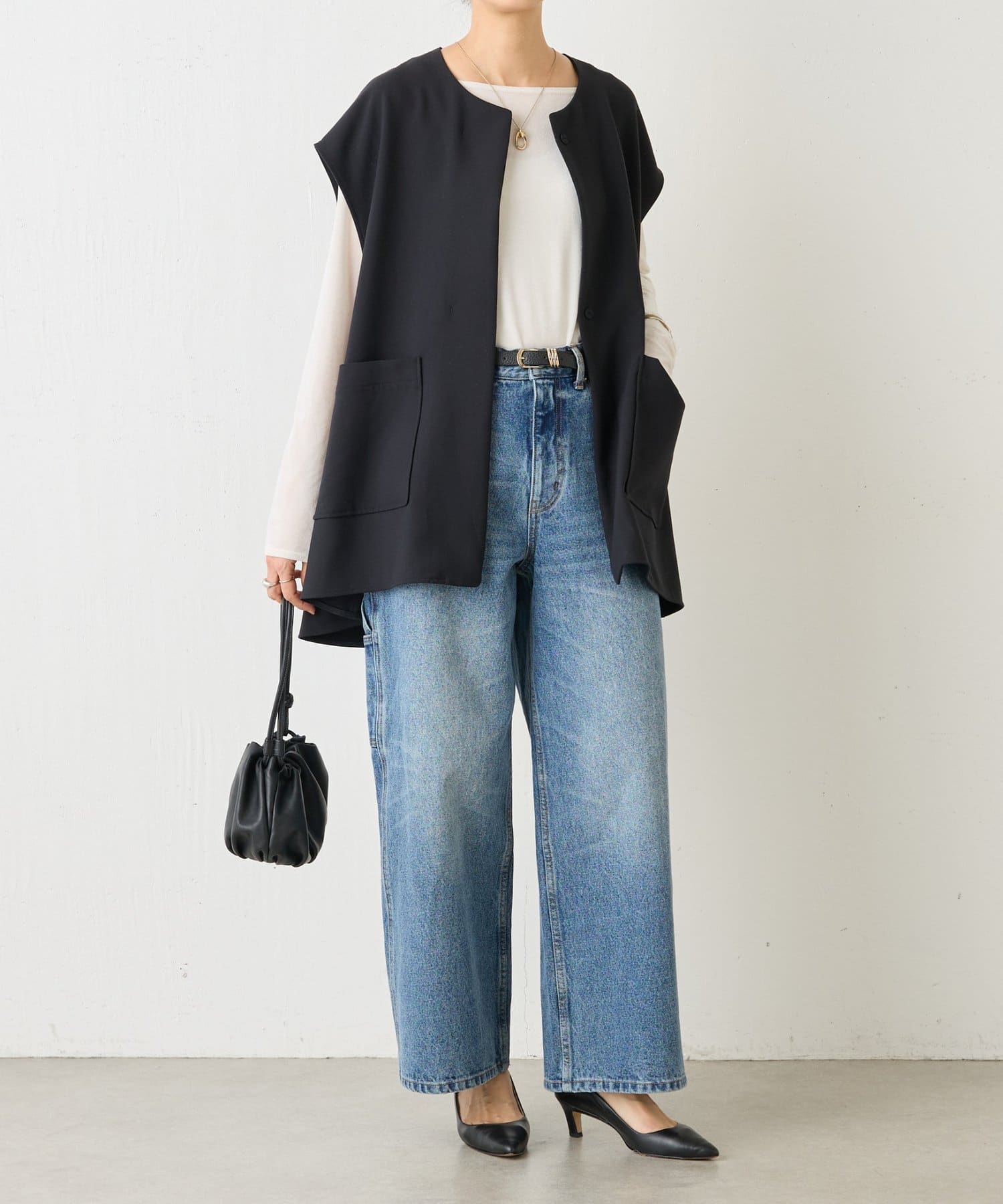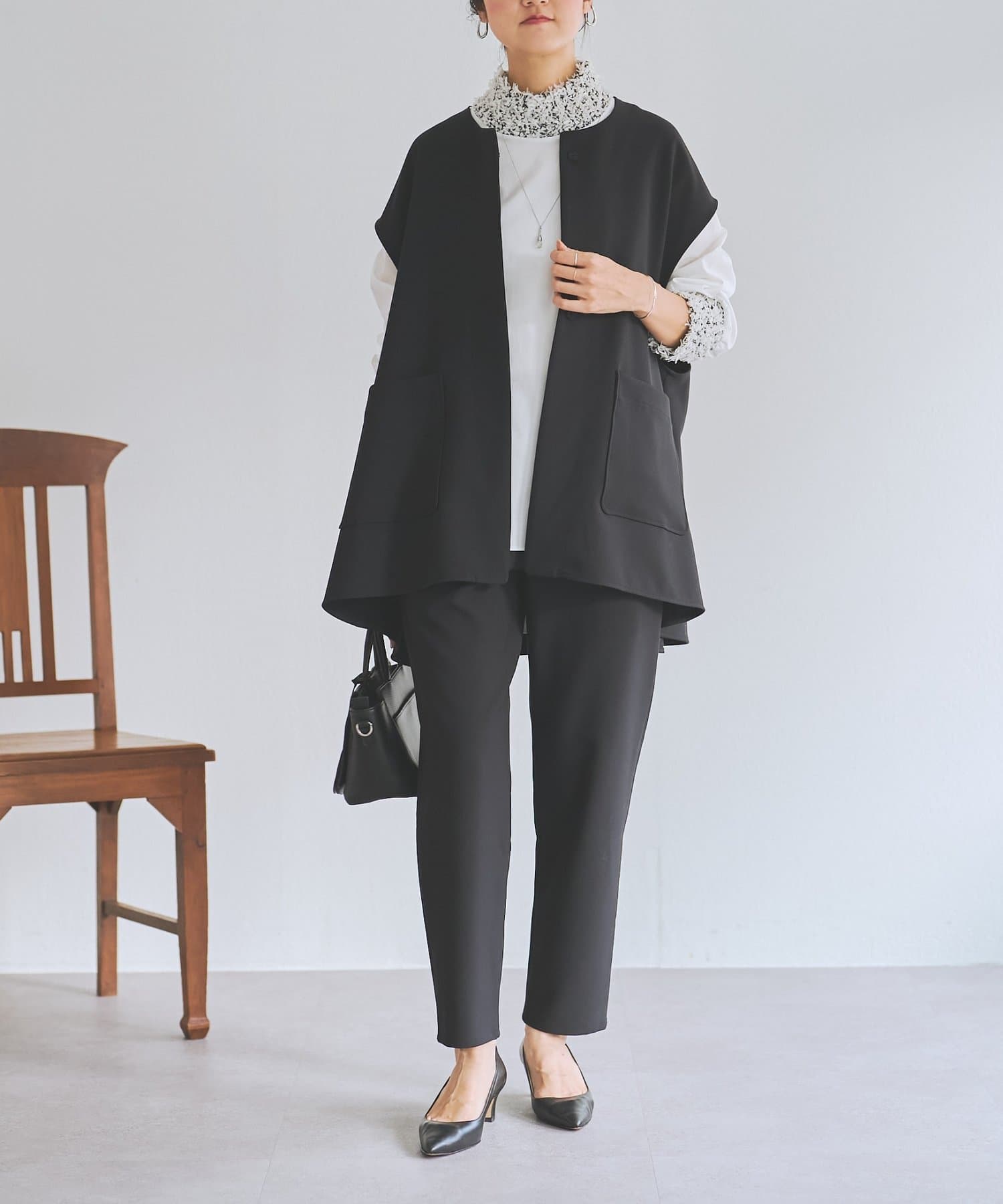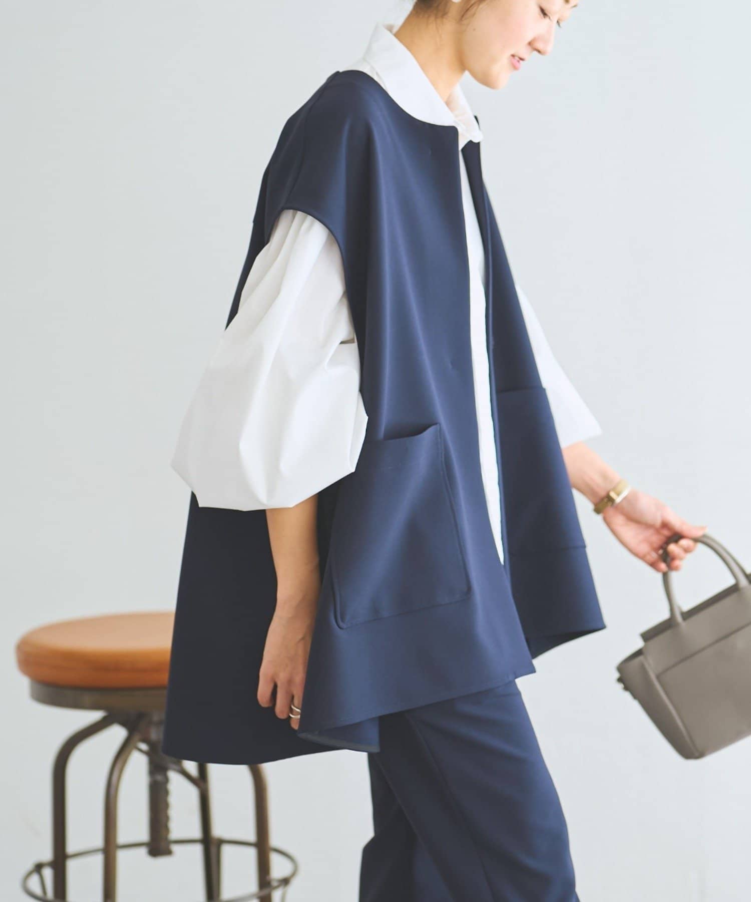 また、デニムやカジュアルなボトムと合わせた抜け感のあるスタイリングも楽しめ、ワードローブに一枚あると頼れる主役ジレです。
