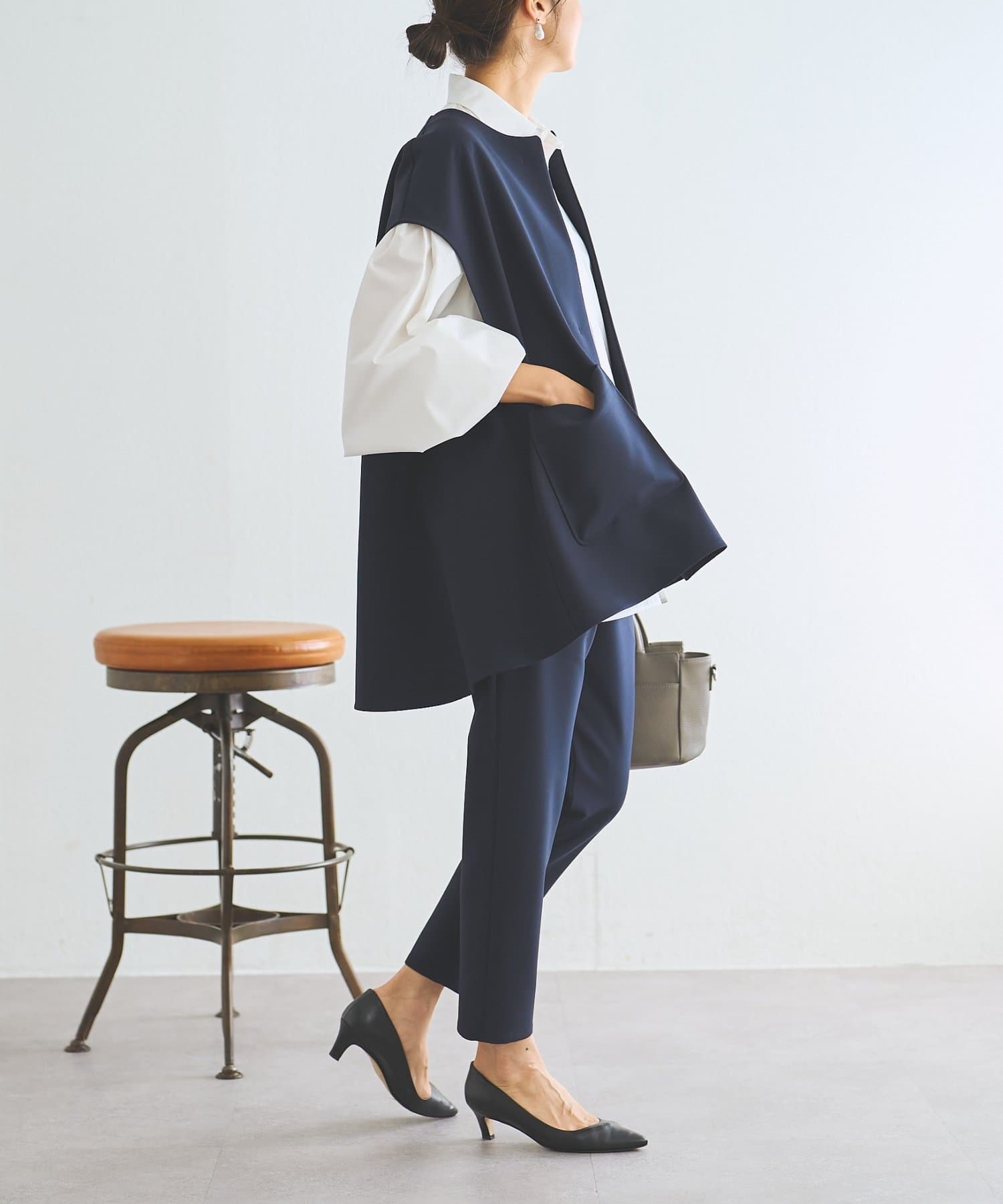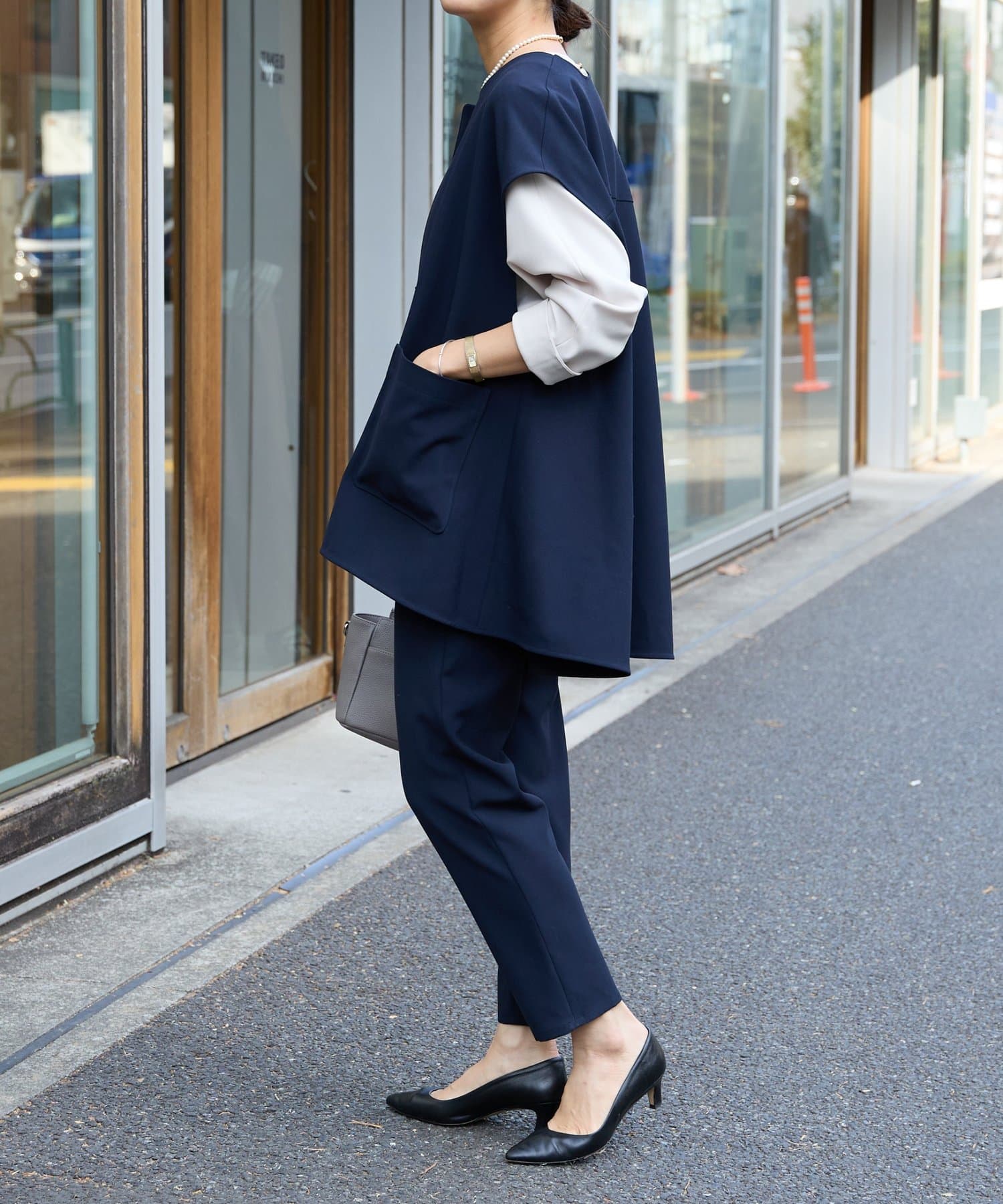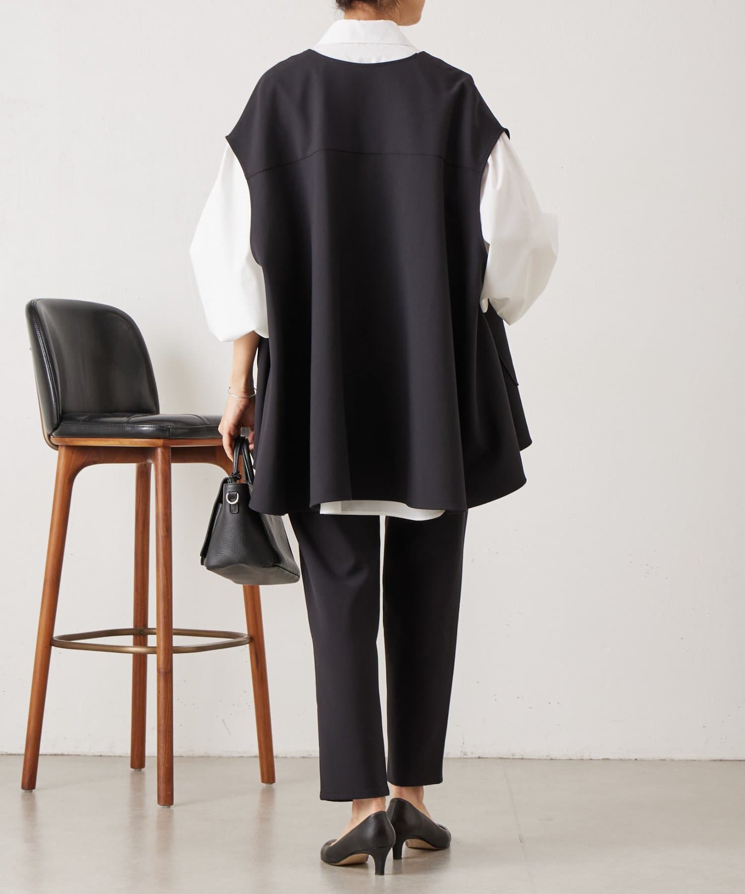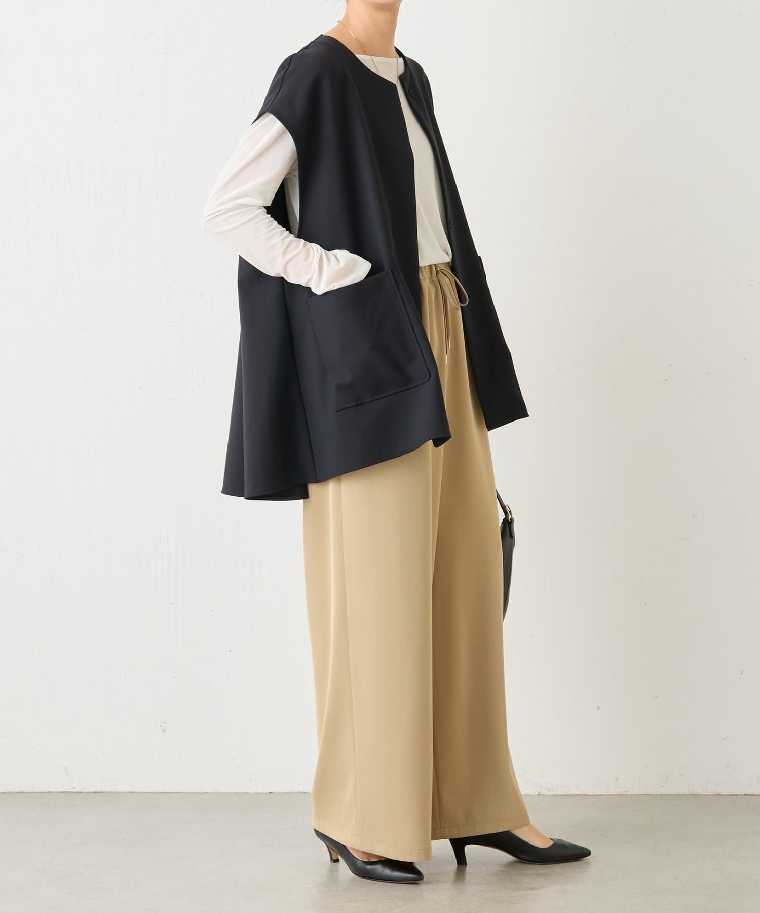 また、デニムやカジュアルなボトムと合わせた抜け感のあるスタイリングも楽しめ、ワードローブに一枚あると頼れる主役ジレです。